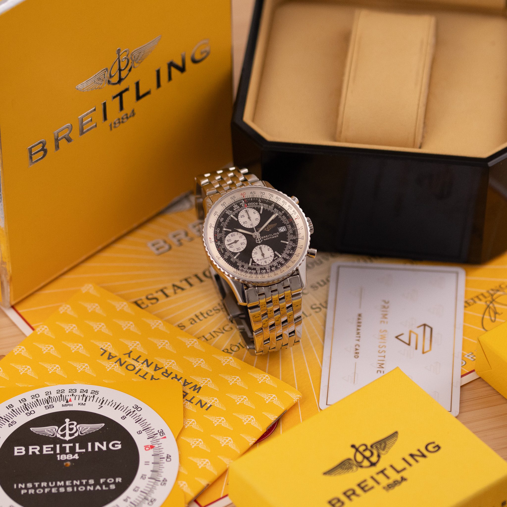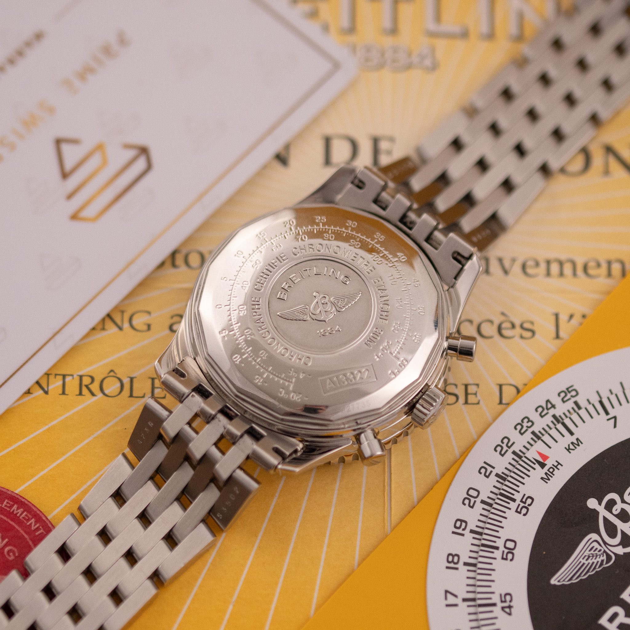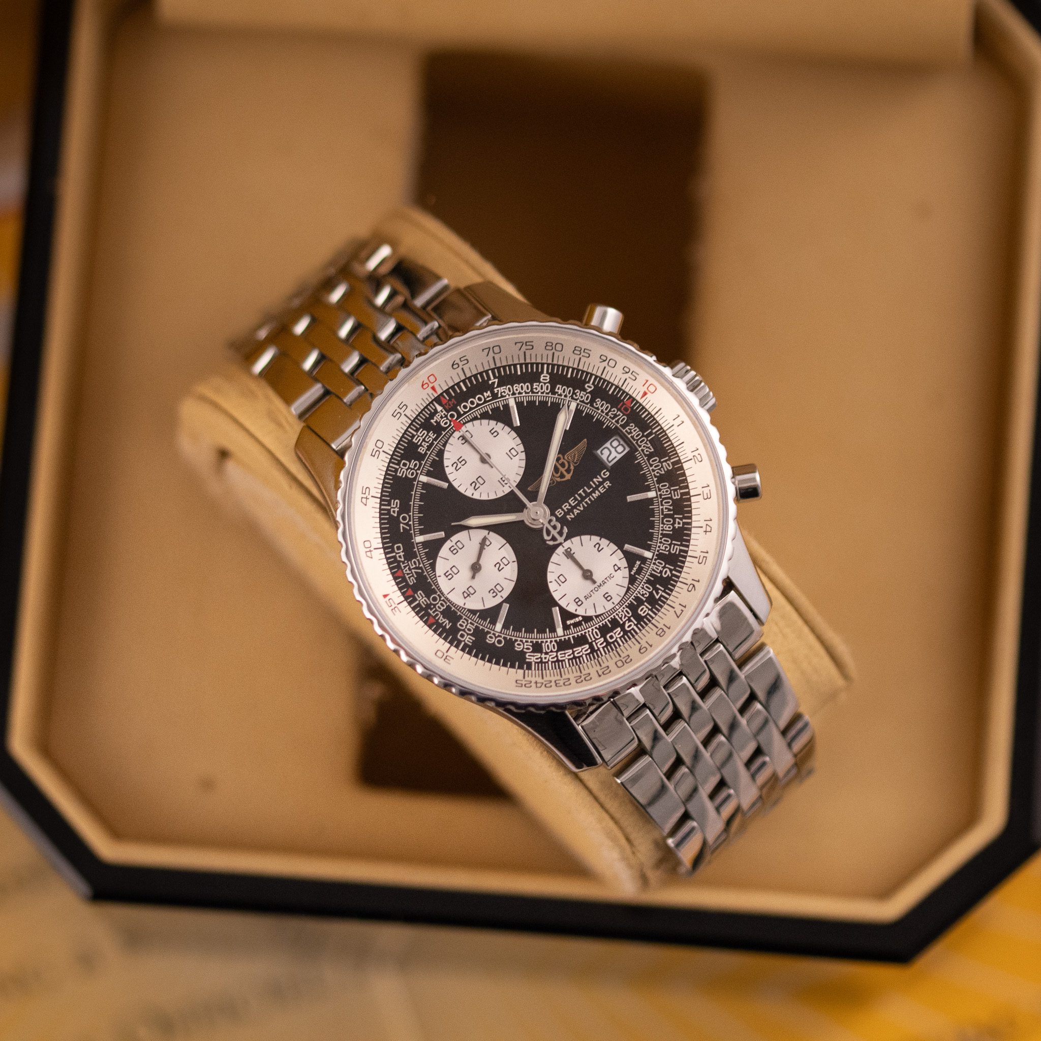 Powered by the automatic Breitling Calibre 13, this watch offers reliable chronograph performance based on the proven Valjoux 7750 architecture. Originally sold in 2003, this example is presented in very good condition and comes as a full set with its original box and papers. A standout choice for collectors and enthusiasts seeking a legendary aviation timepiece with enduring appeal.