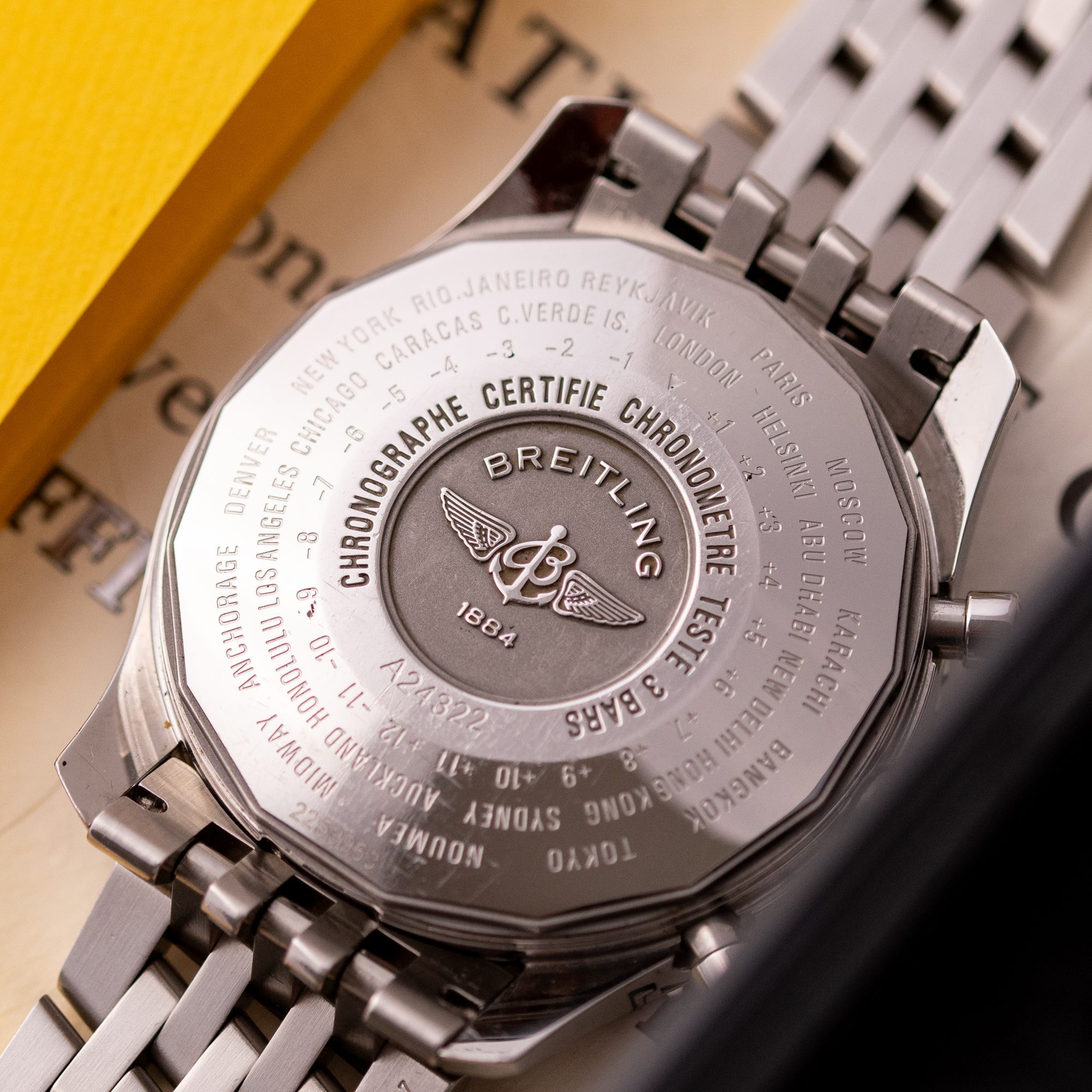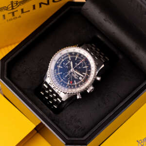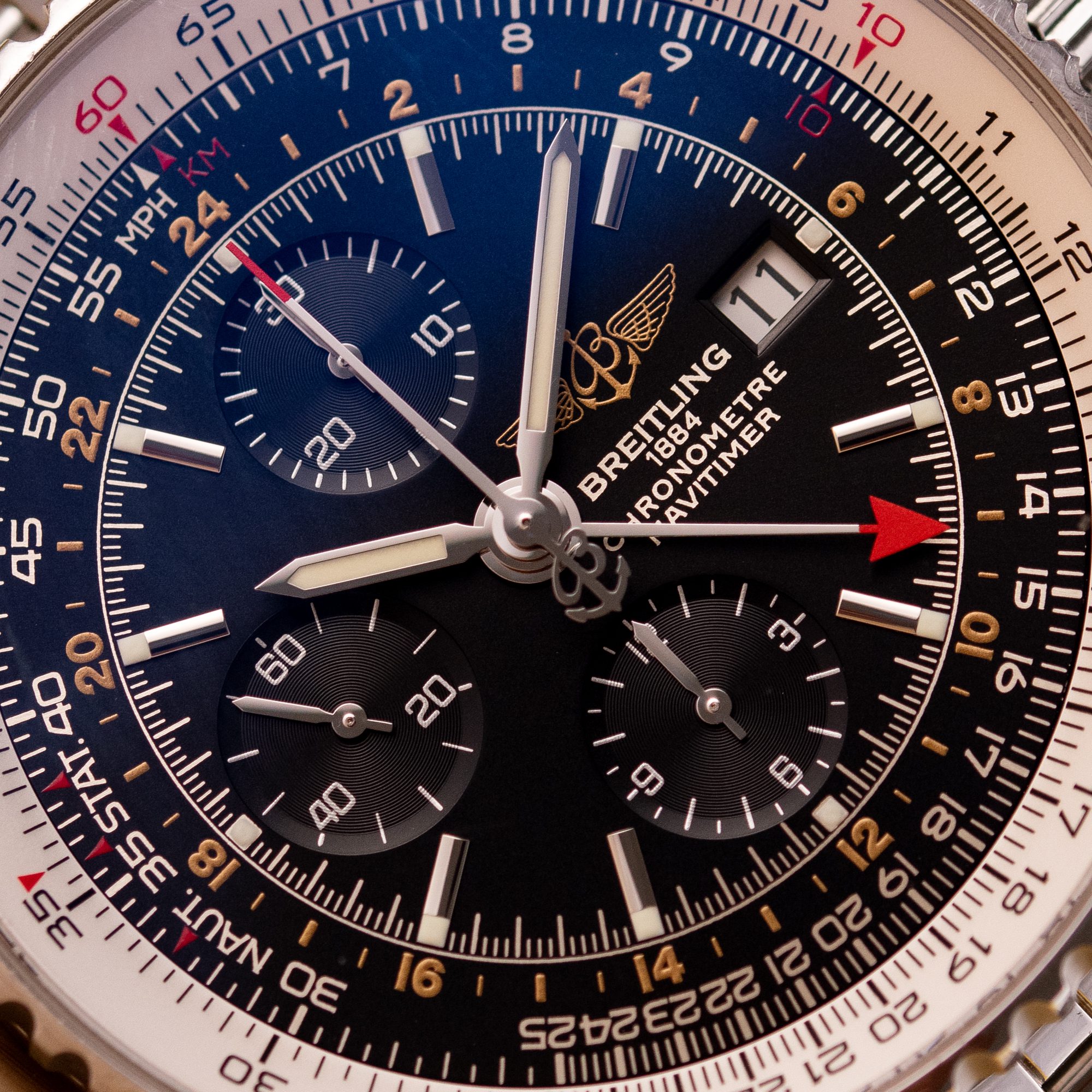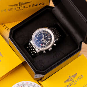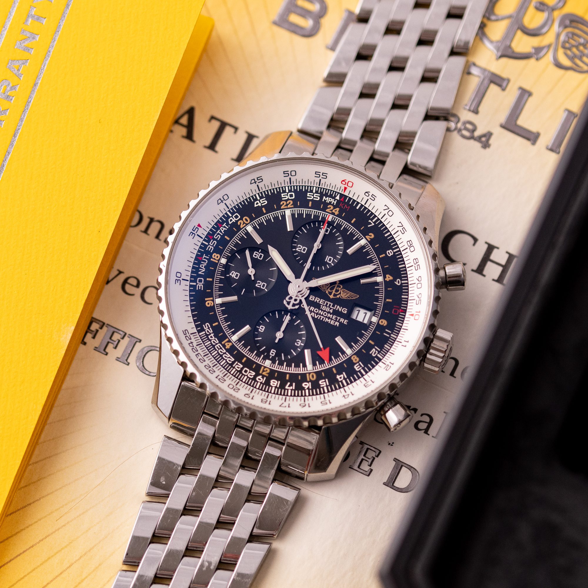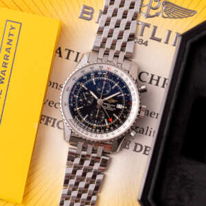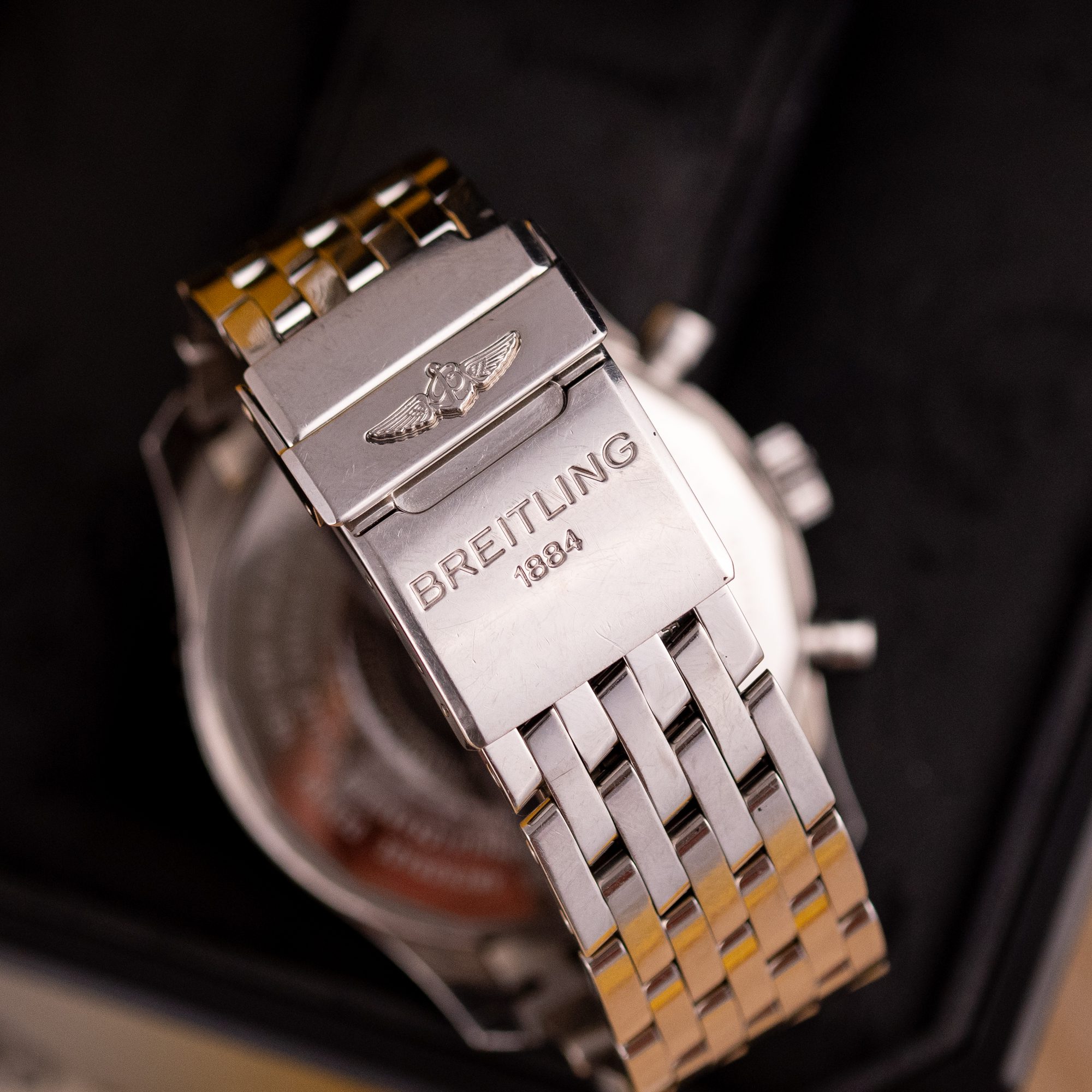 This particular piece was originally sold in 2007 and is in very good condition, with a mechanically fully functional movement. The bracelet is sized for wrists up to 19 cm, ensuring a comfortable fit. Presented as a full set with the original Breitling box and papers, this watch is an ideal addition for collectors or enthusiasts seeking a versatile, high-performance timepiece with a storied legacy.