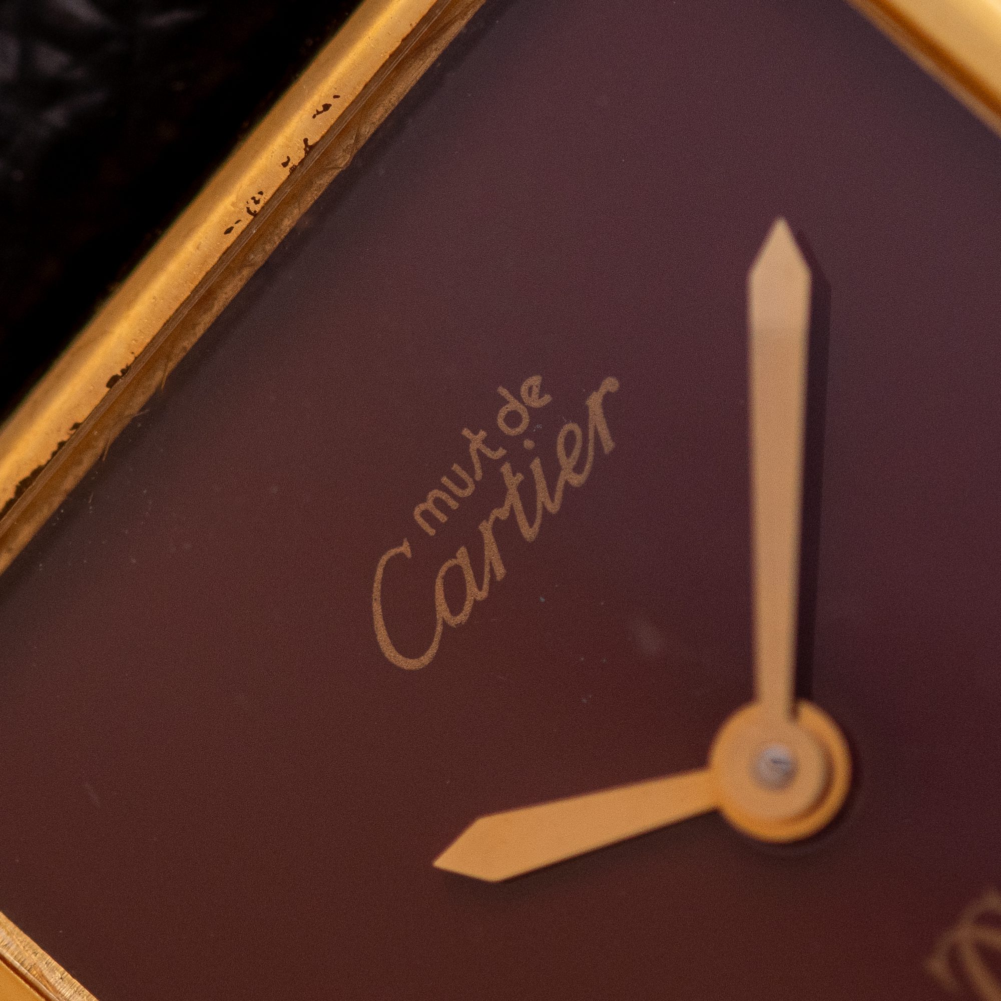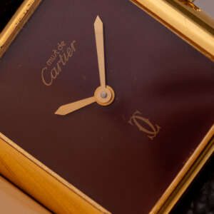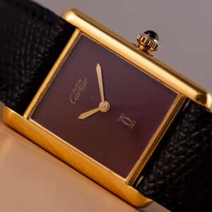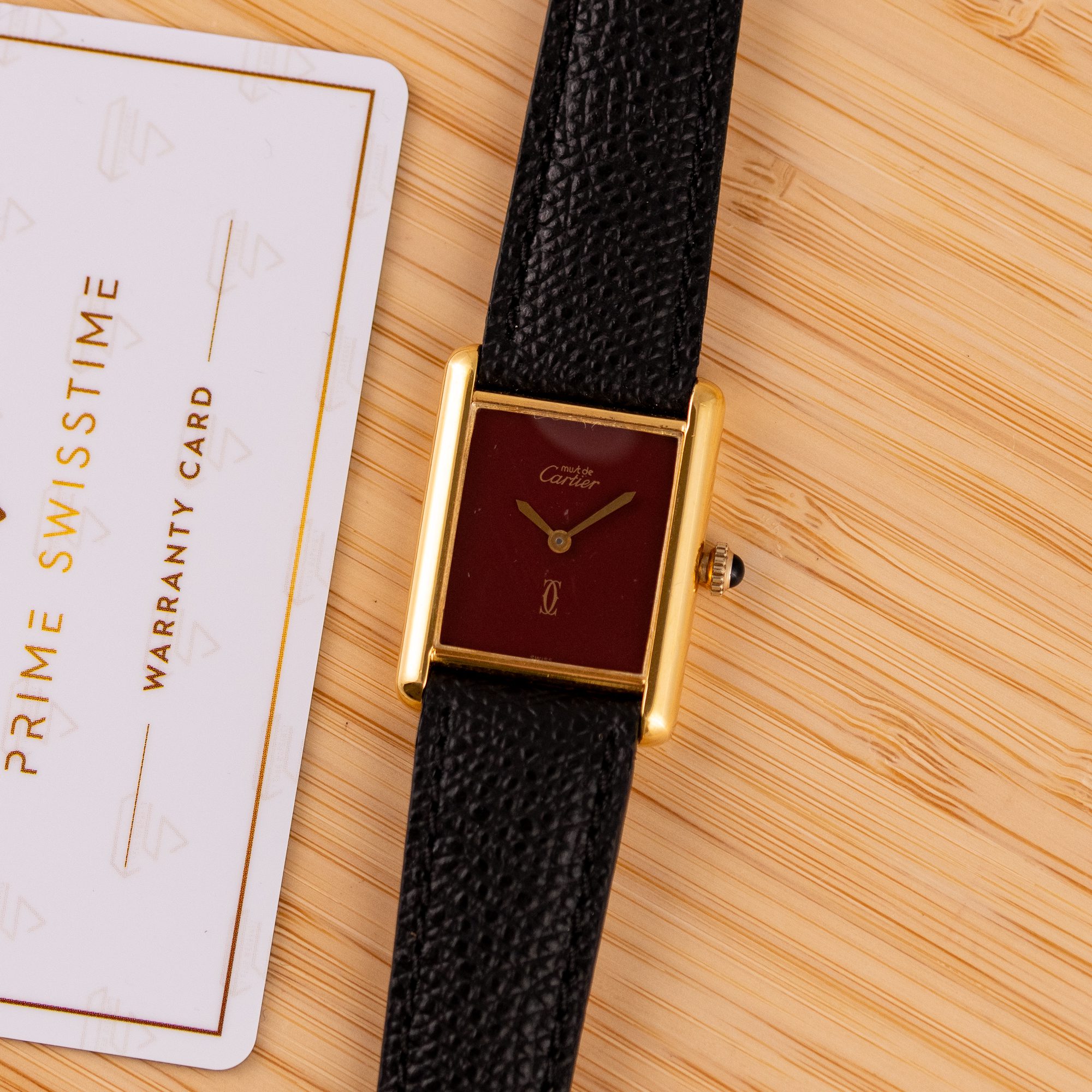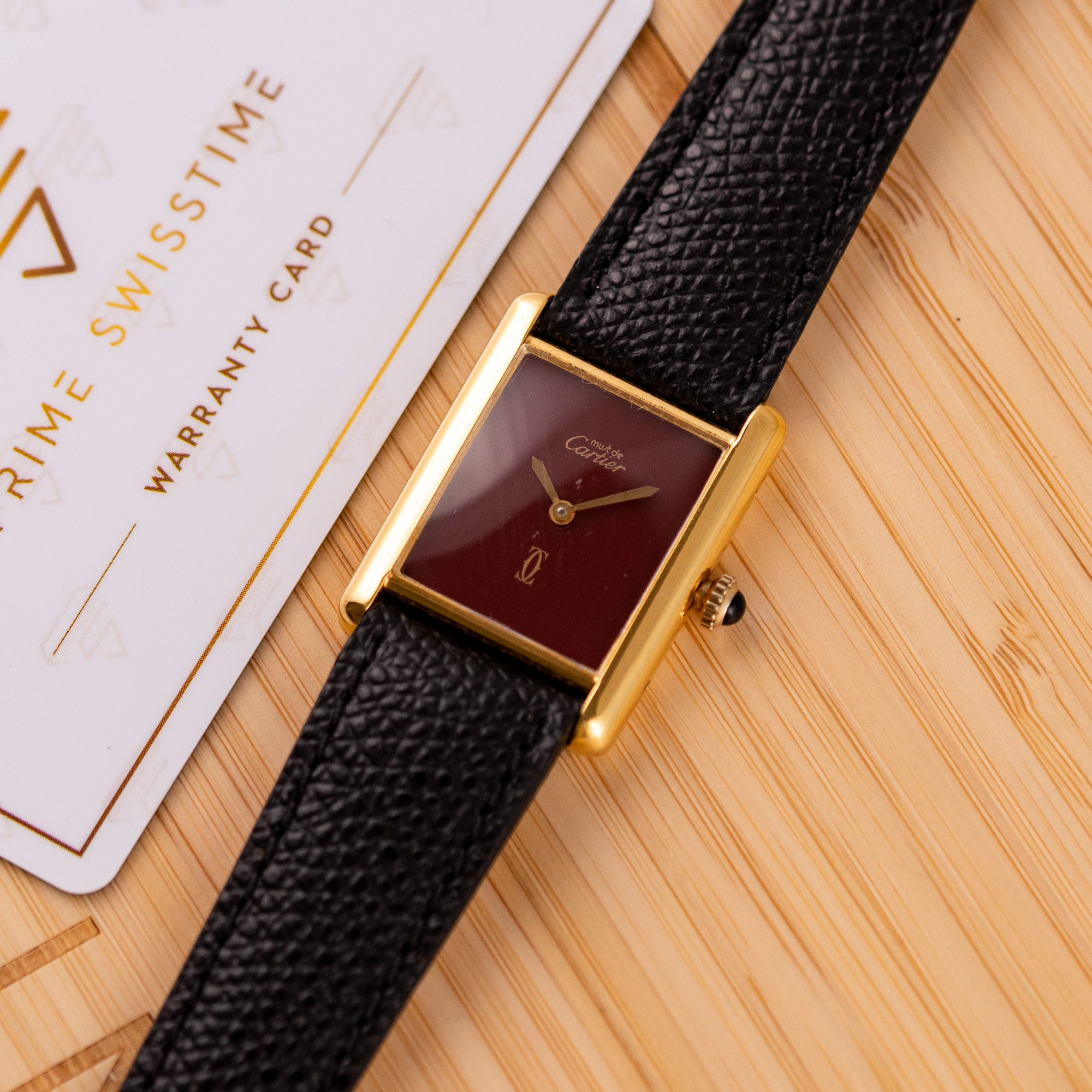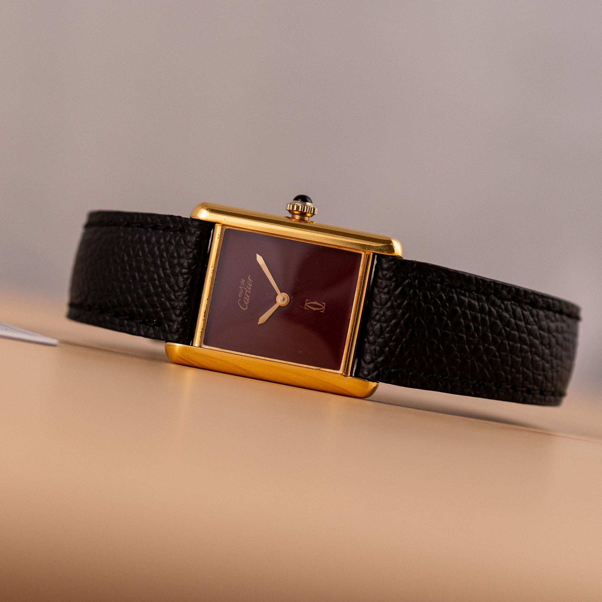 Originating from the 1980s, this example showcases a rare Burgundy dial, adding a distinctive and refined character, paired with an uncommon manual-wind movement, a rarity for this model. The watch is in very good condition, with a fully functional mechanism ensuring reliable performance. Sold as watch only, this Must De Cartier Tank is a compelling choice for collectors or those seeking a unique vintage timepiece with a touch of exclusivity.
