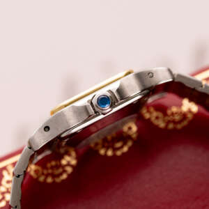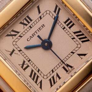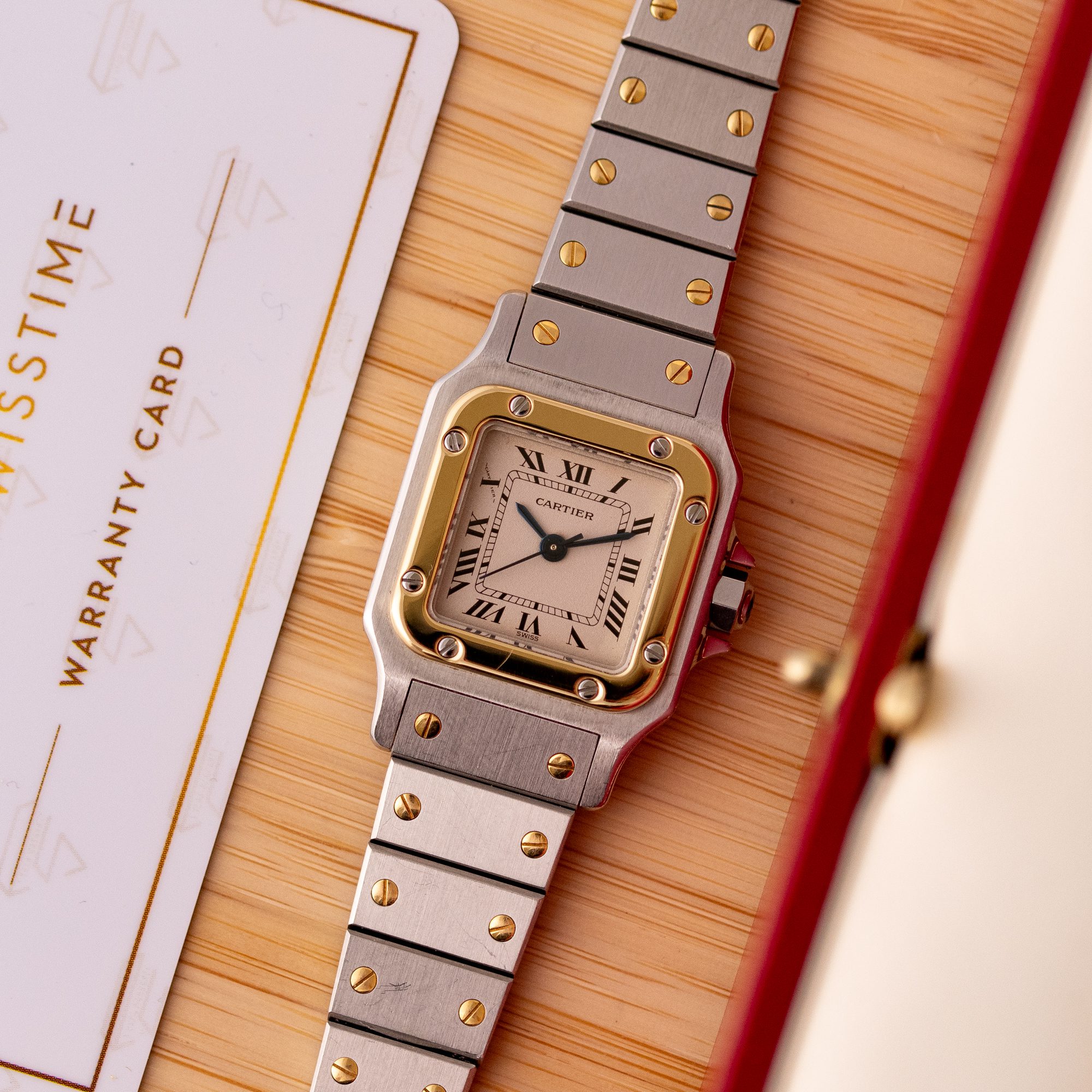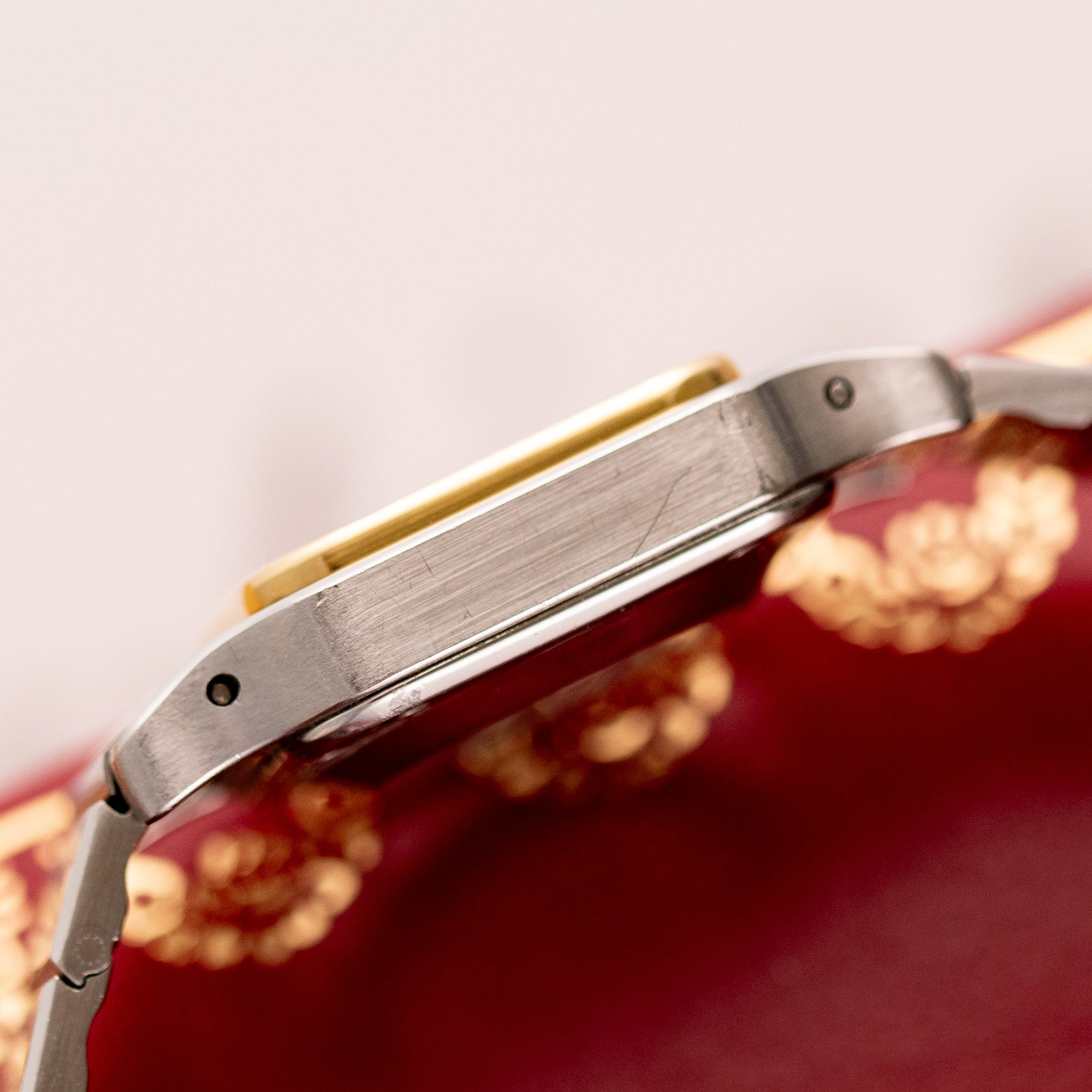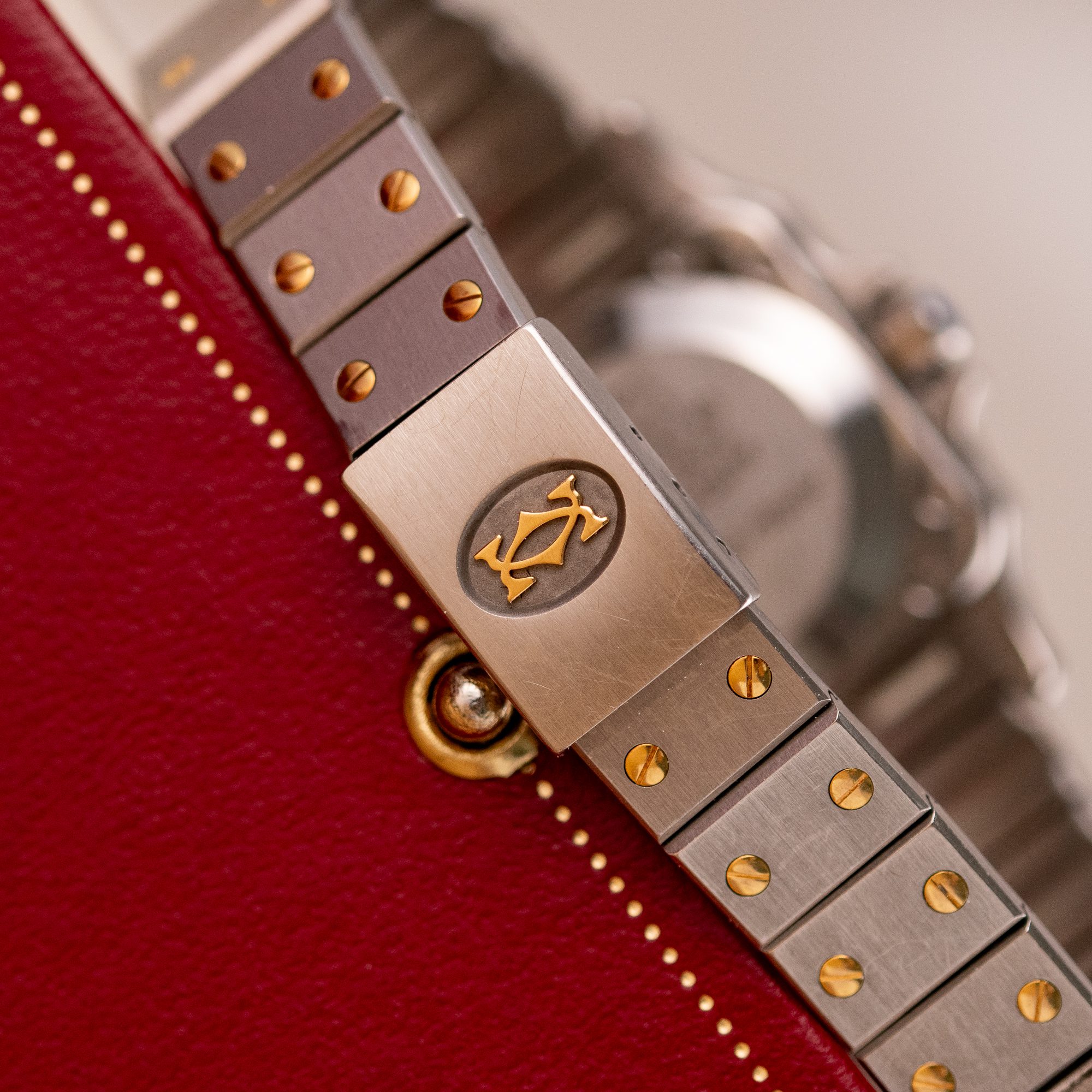 This particular piece features a white dial that, due to natural aging, has developed a warm ivory tone, adding unique vintage character. The watch is in very good condition, has undergone a full service, and comes with a Cartier box. The bracelet has been repaired and two links are joined together (as visible in photo no. 15). A beautiful choice for those who appreciate classic Cartier design with a touch of patina.