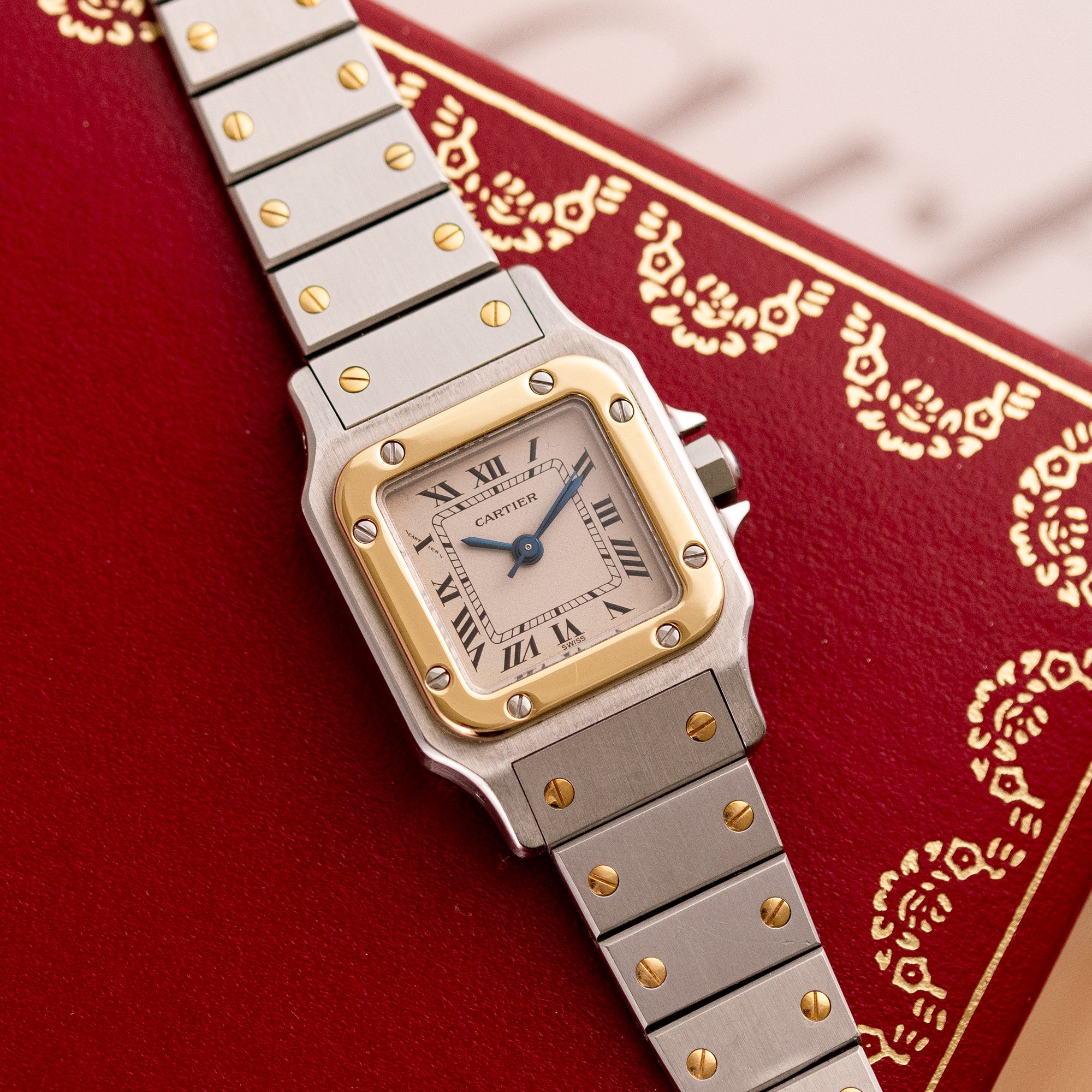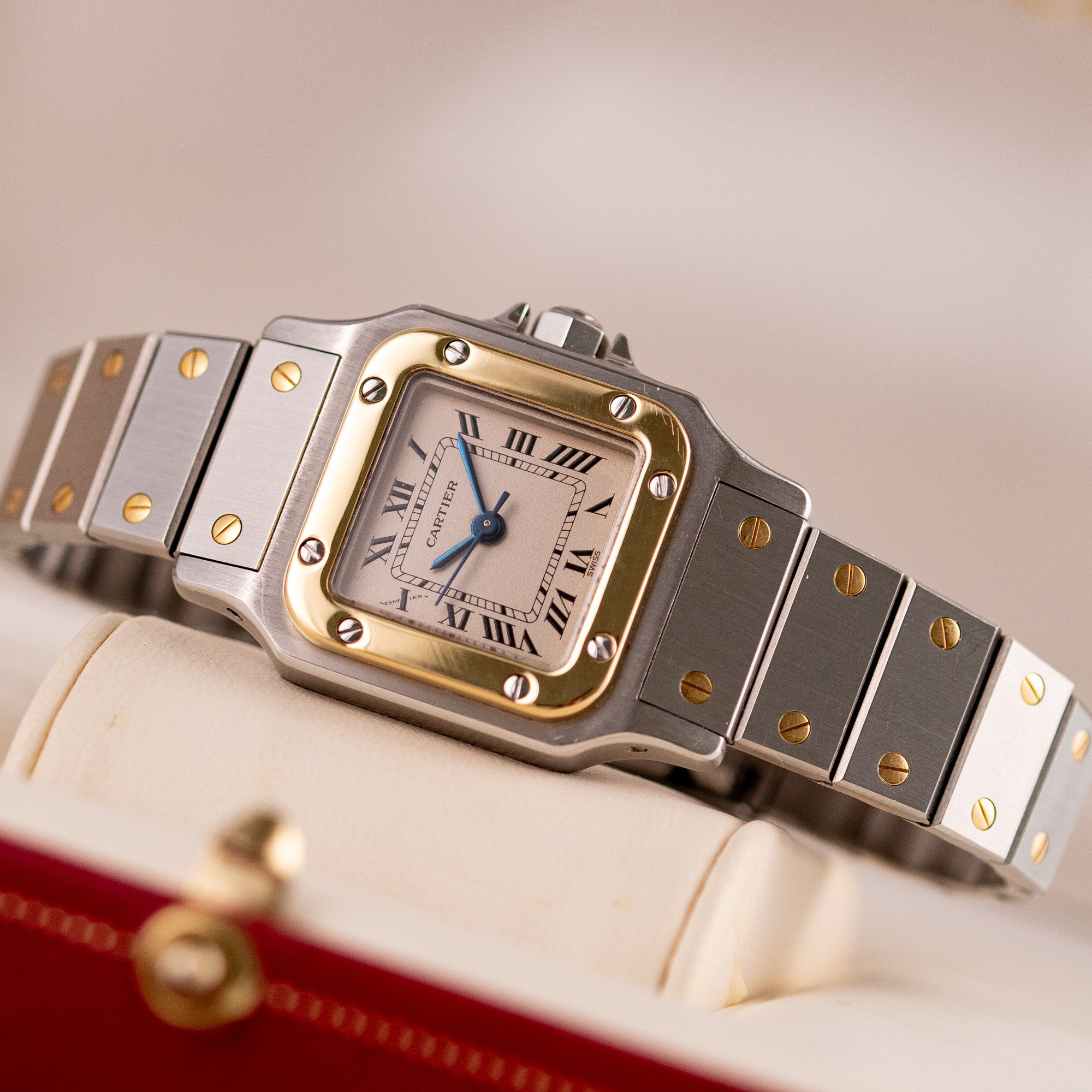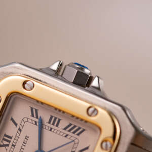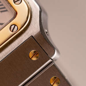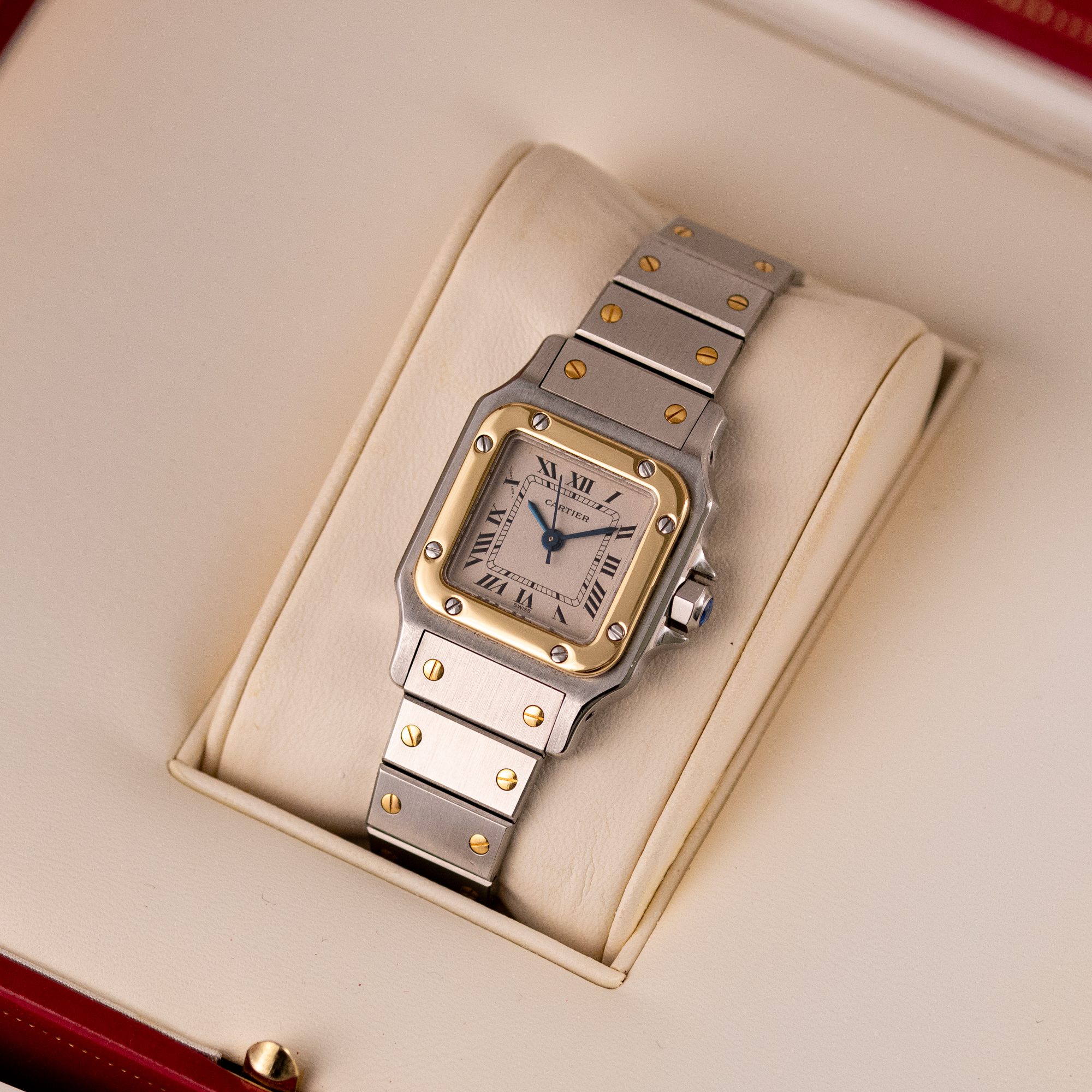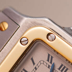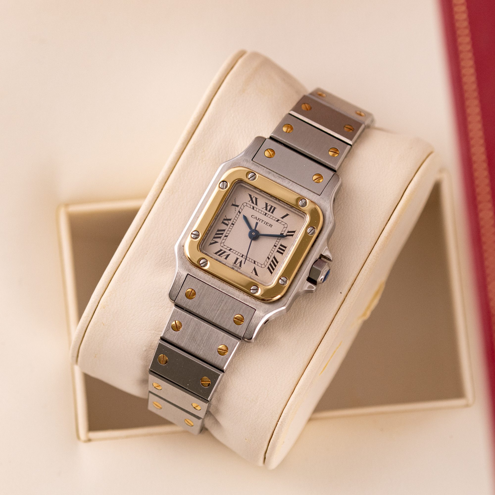 This particular piece features a white dial that, due to natural aging, has developed a warm ivory tone, adding unique vintage character. The watch is in very good condition, has undergone a full service, and comes with a Cartier box. The bracelet has been repaired and two links are joined together (as visible in photo no. 15). A beautiful choice for those who appreciate classic Cartier design with a touch of patina.