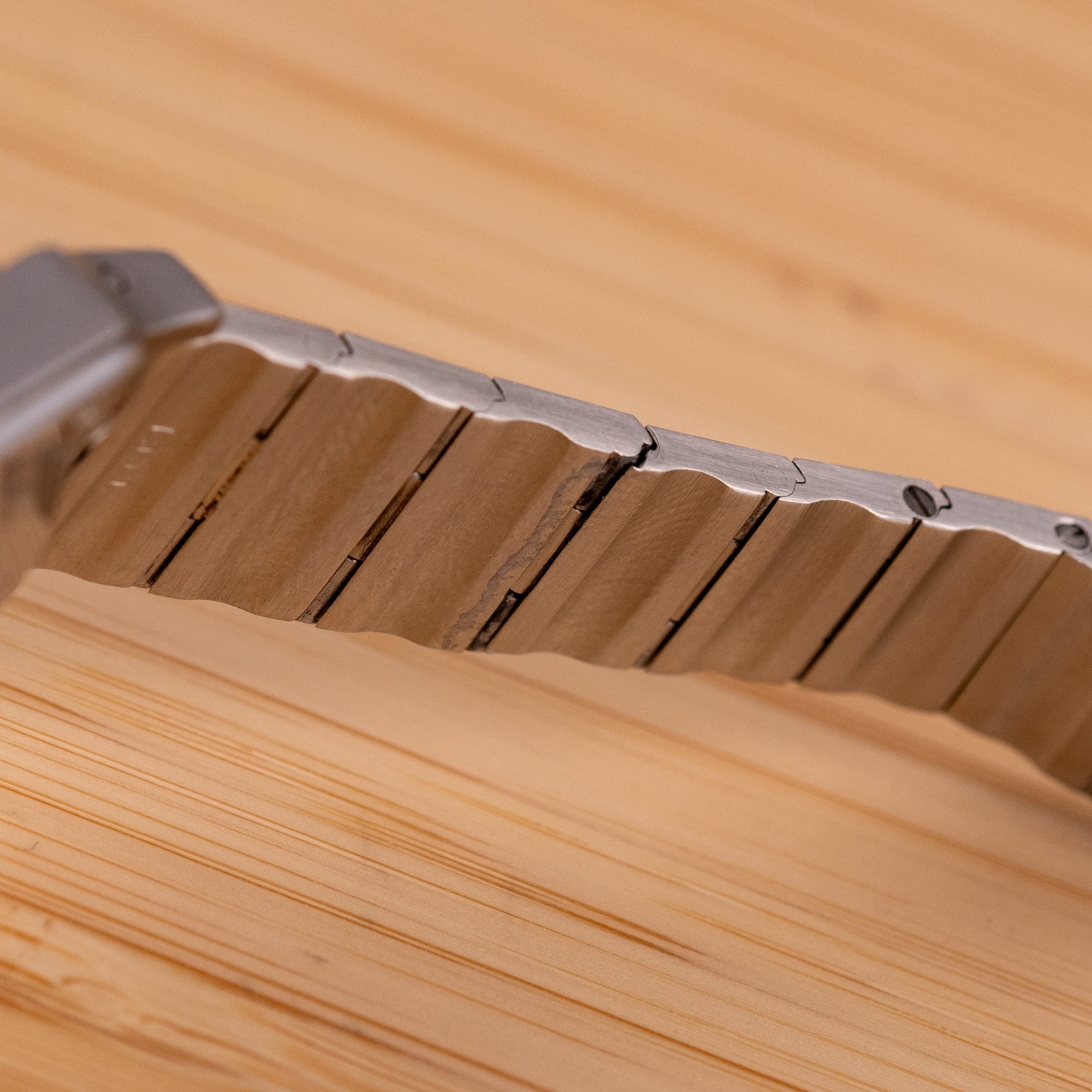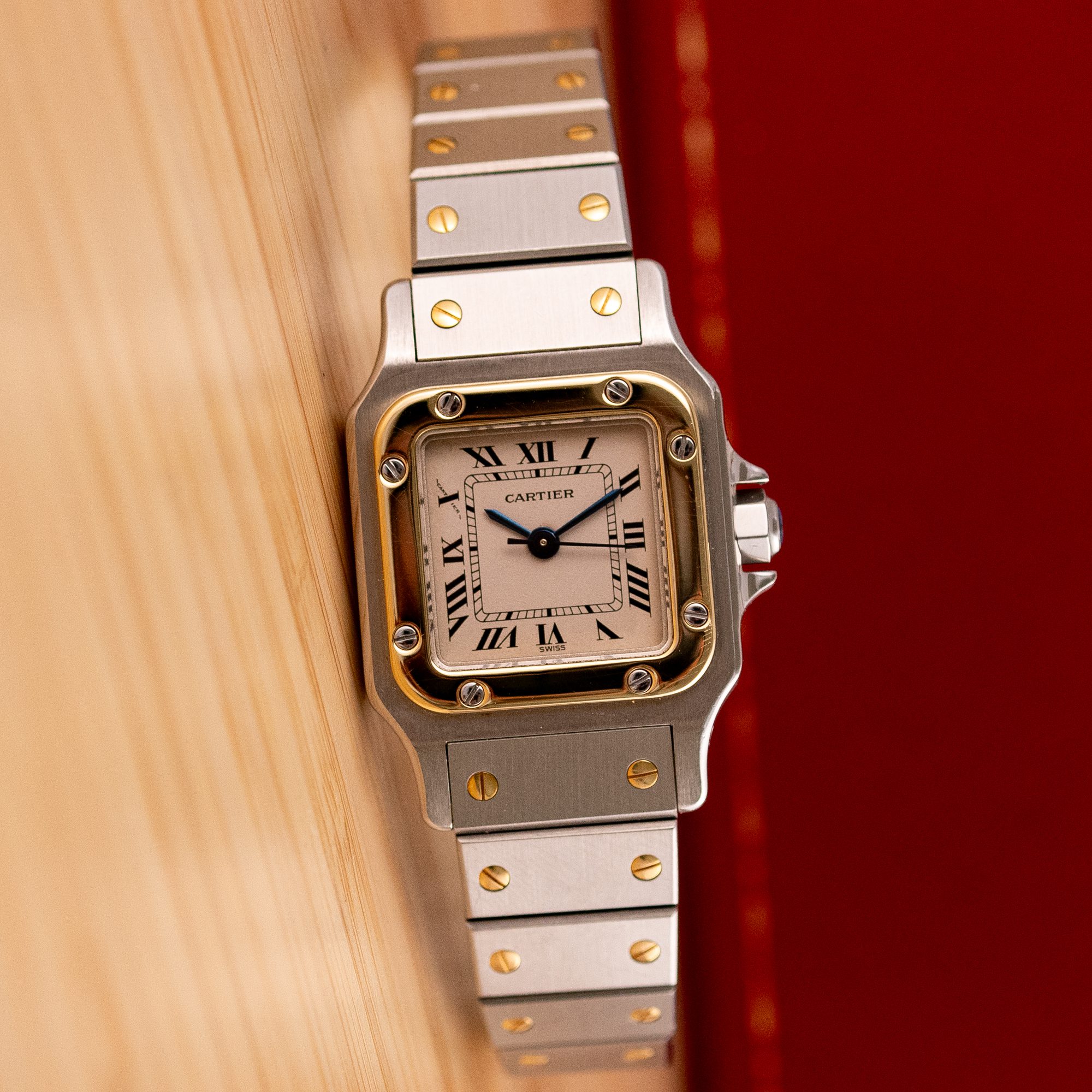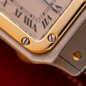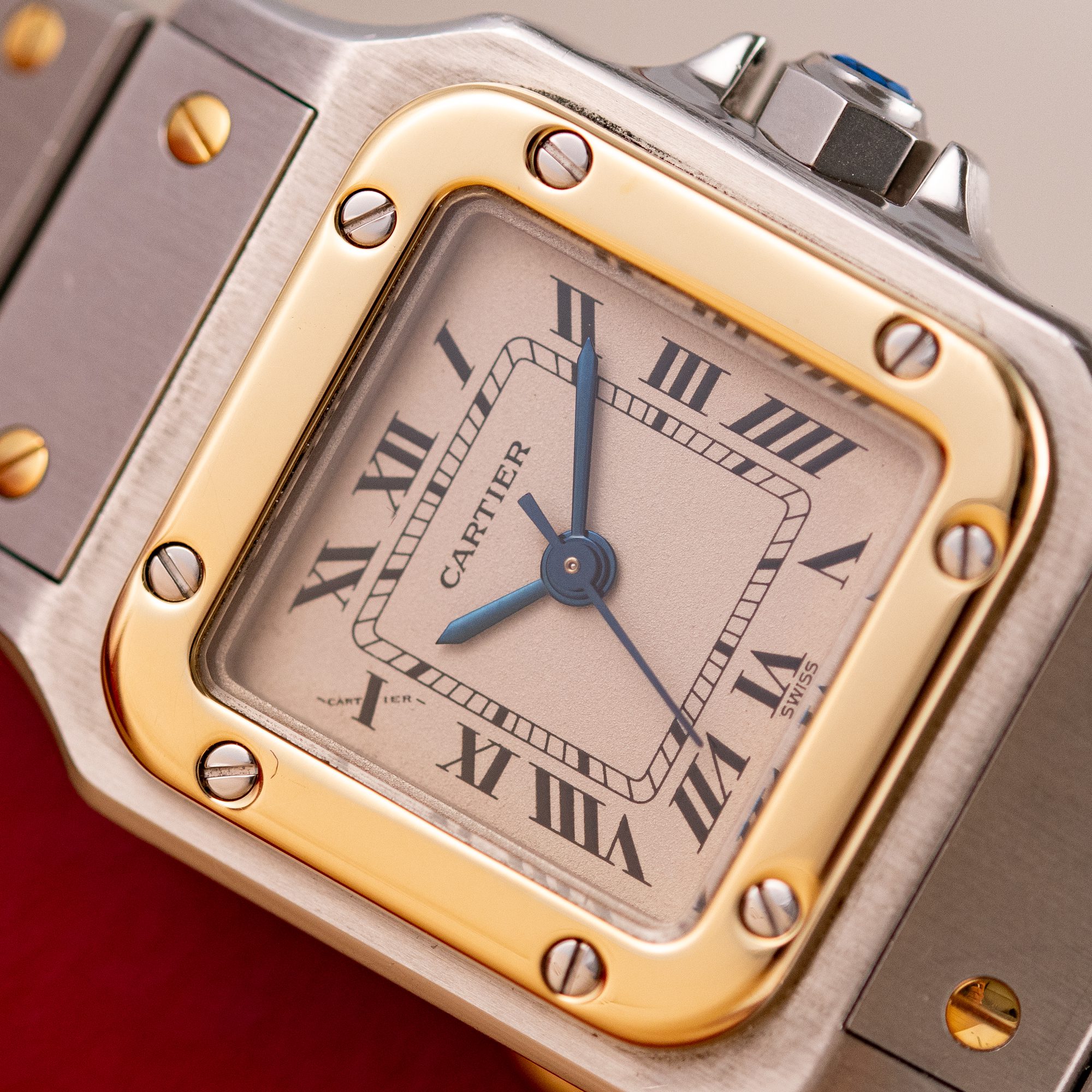 This particular piece features a white dial that, due to natural aging, has developed a warm ivory tone, adding unique vintage character. The watch is in very good condition, has undergone a full service, and comes with a Cartier box. The bracelet has been repaired and two links are joined together (as visible in photo no. 15). A beautiful choice for those who appreciate classic Cartier design with a touch of patina.