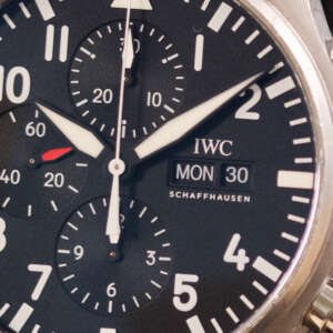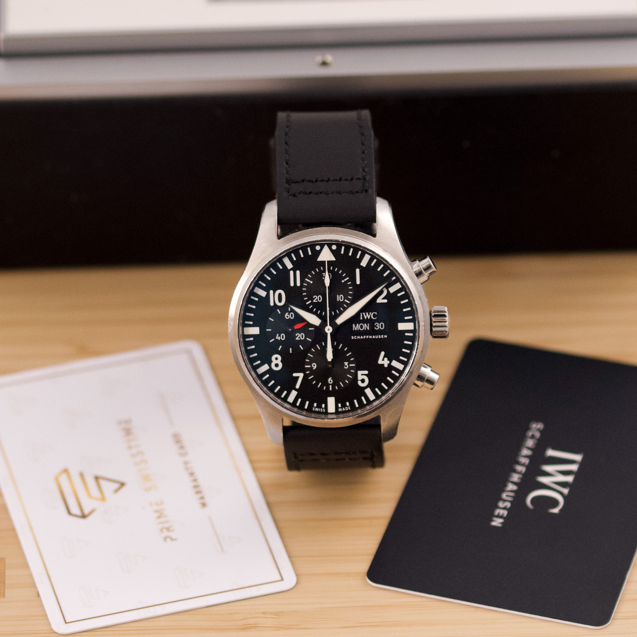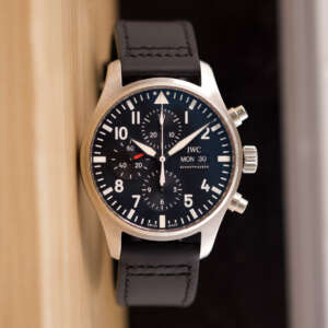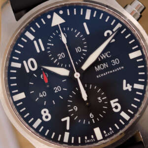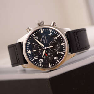 The IWC Pilot Chronograph, ref. IW377709, crafted in stainless steel, features a 43mm case with a clean black dial and luminous markers, designed for optimal legibility and functionality, reflecting the brand’s aviation heritage with a modern, robust aesthetic suitable for any setting.