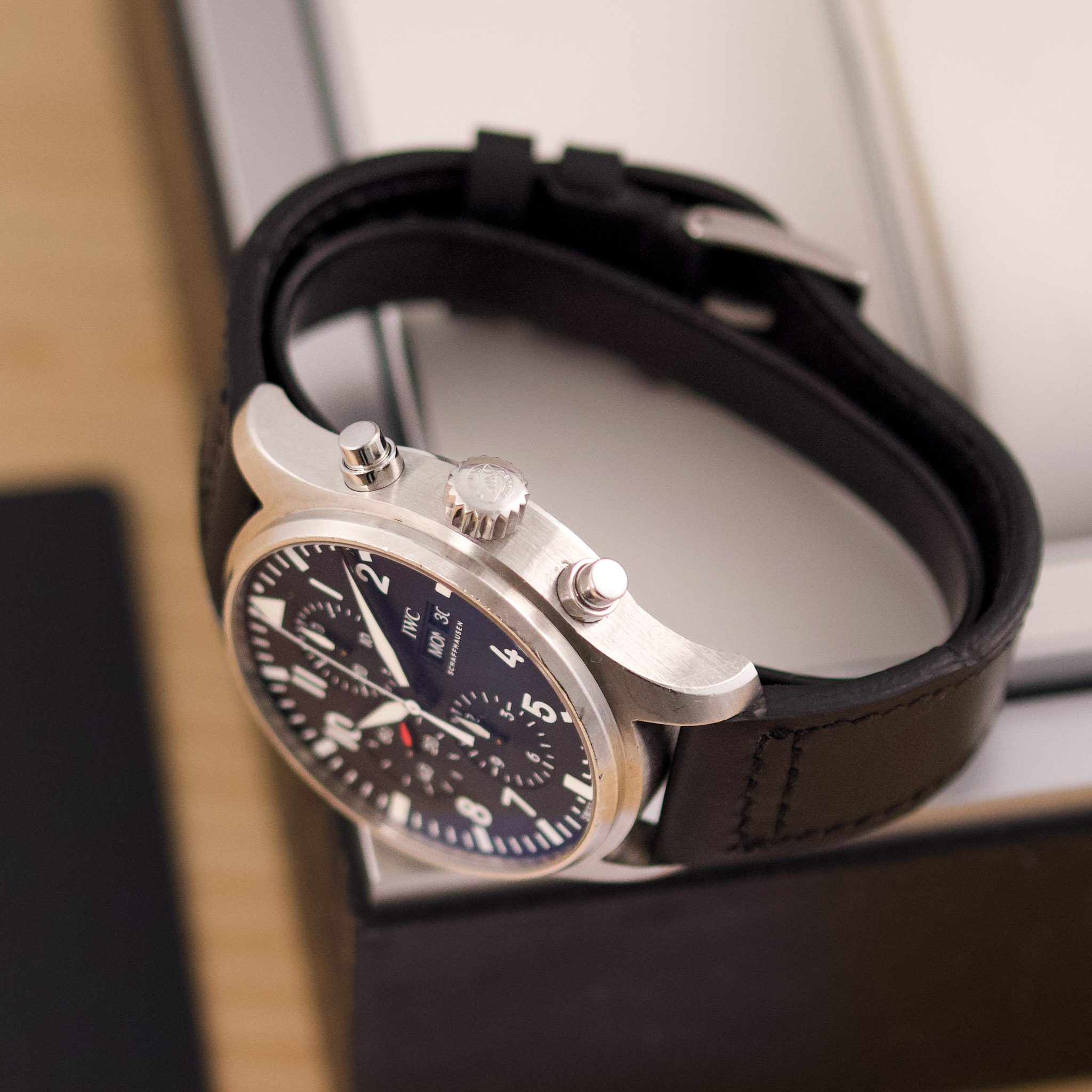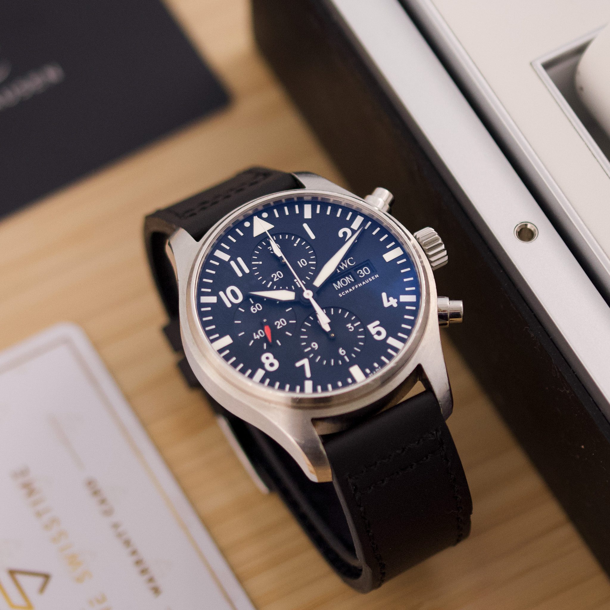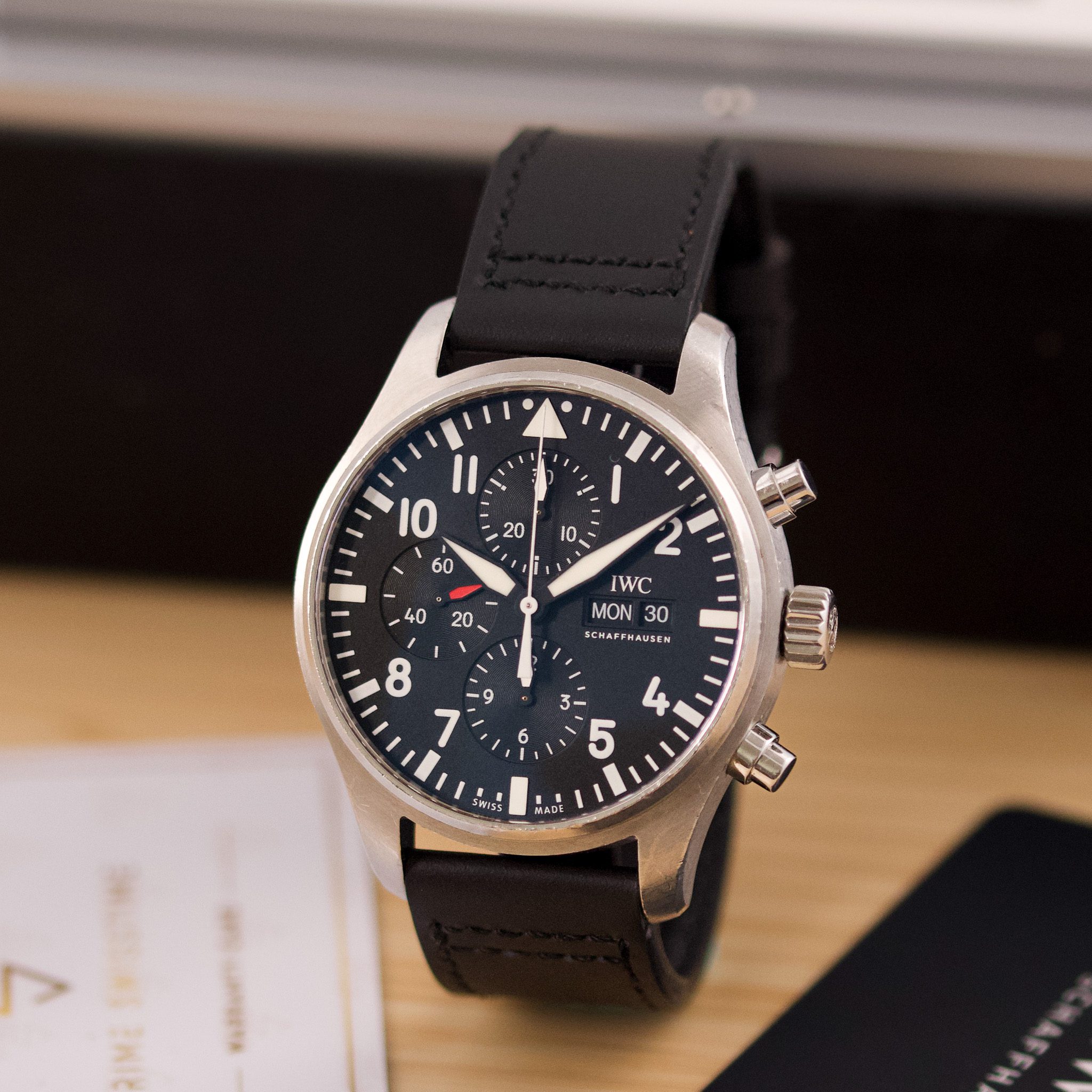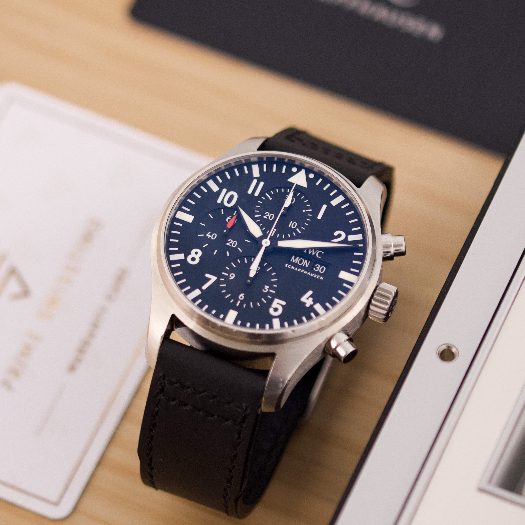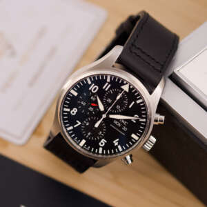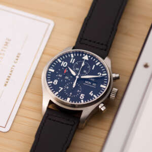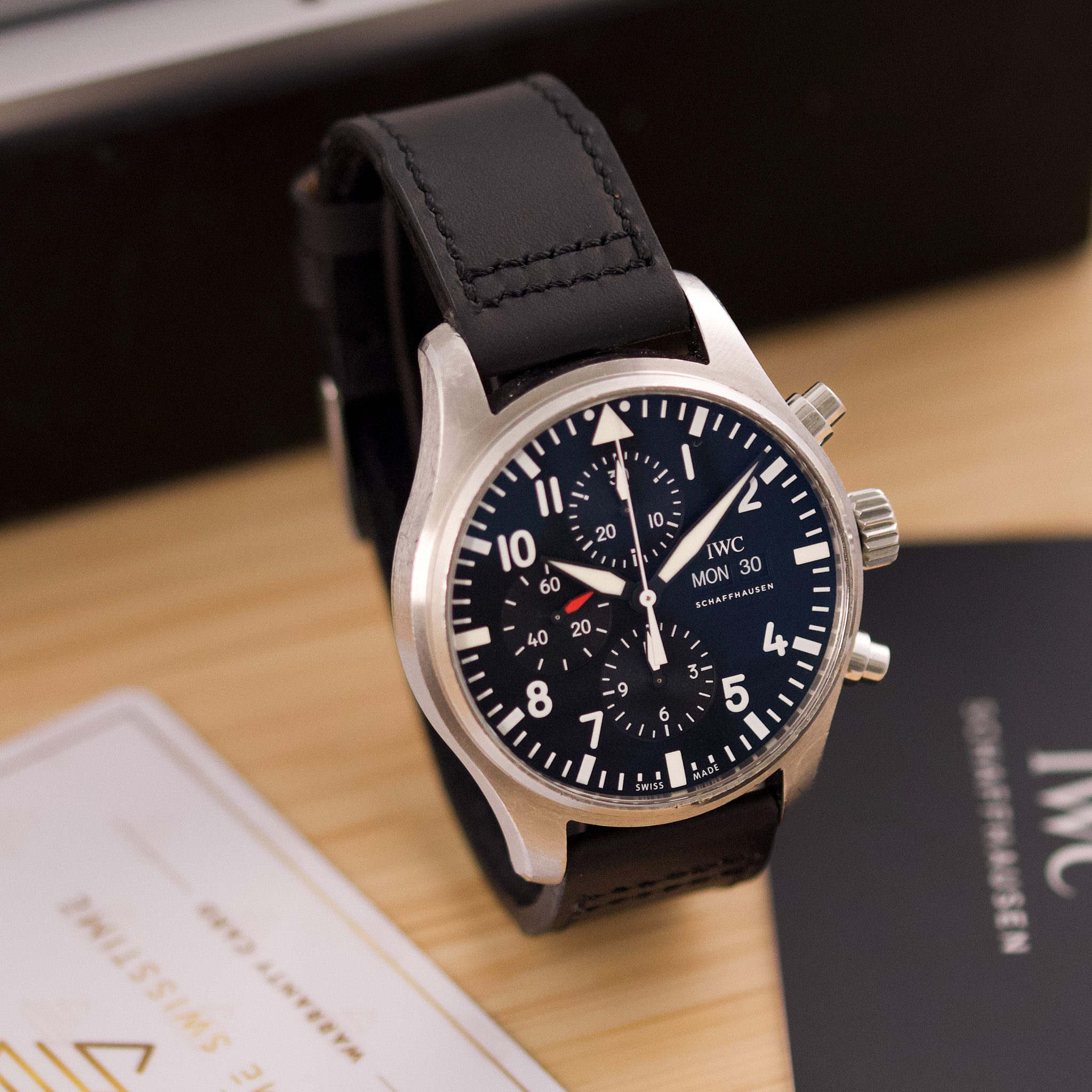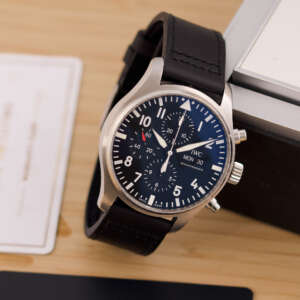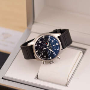 Originally sold in 2018, this example remains in good condition, with a fully functional automatic chronograph movement ensuring precise timekeeping and reliable performance. It is fitted with a calb leather strap, adding a more classic and refined touch to the overall look. Presented as a full set with its original IWC box and papers, this Pilot Chronograph is an excellent choice for collectors or those seeking a versatile, high-performance timepiece for daily wear.