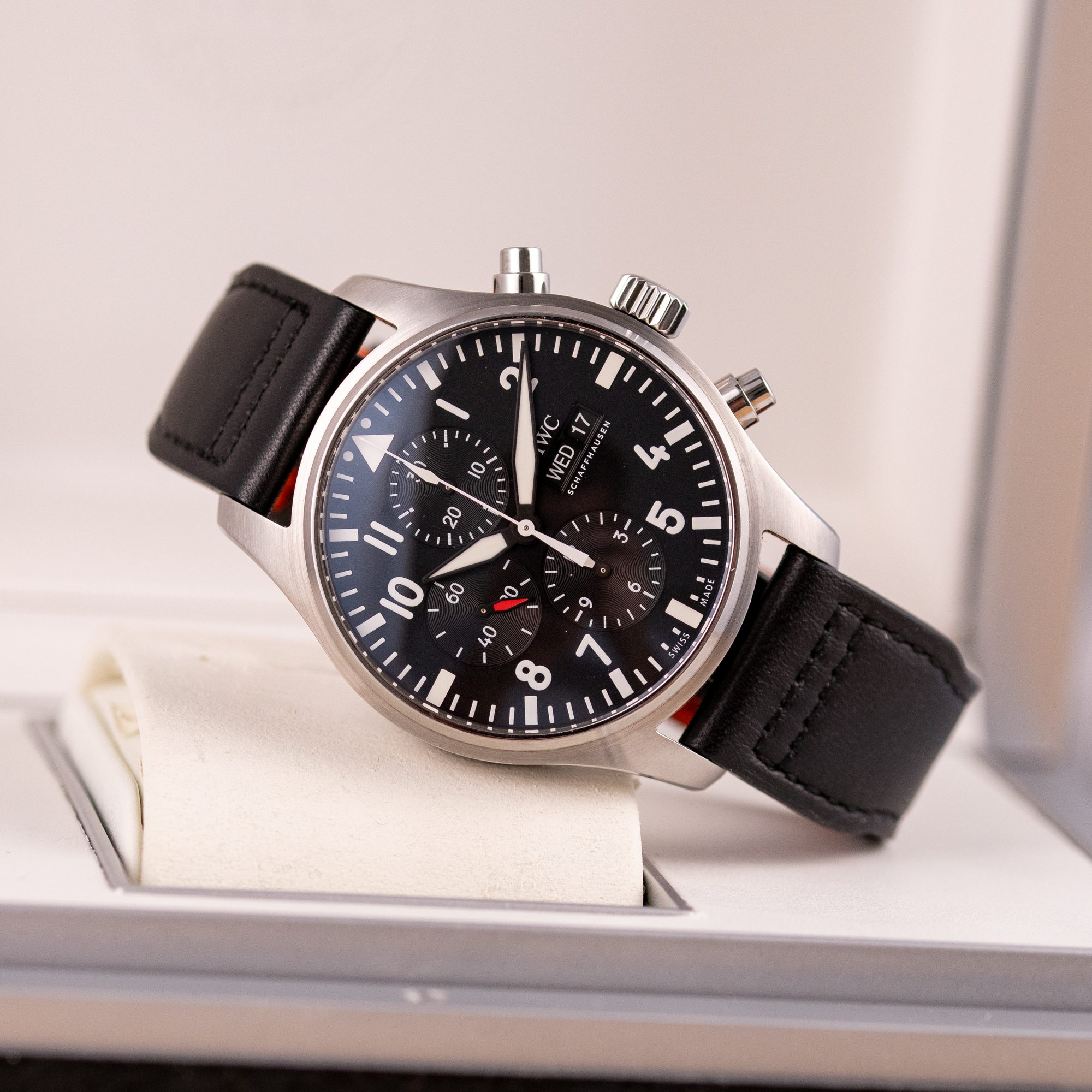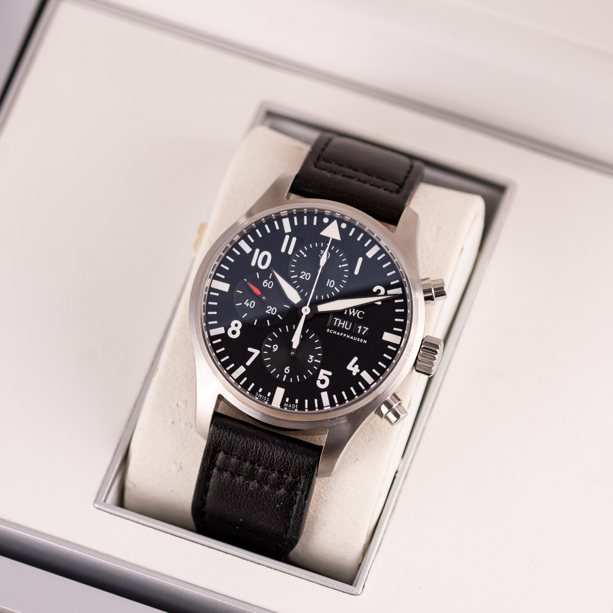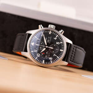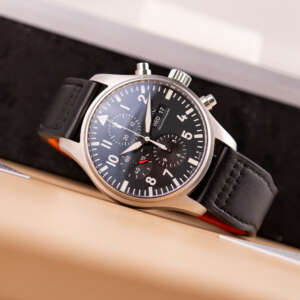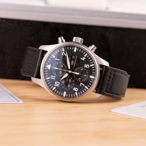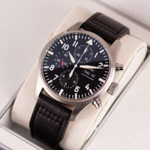Originally sold in 2017, this example remains in very good condition, with a fully functional automatic chronograph movement ensuring precise timekeeping and reliable performance. The stainless steel bracelet, sized for wrists up to 18 cm, shows minimal wear and maintains its sturdy construction. Presented as a full set with its original IWC box and papers, this Pilot Chronograph is an excellent choice for collectors or those seeking a versatile, high-performance timepiece for daily wear.