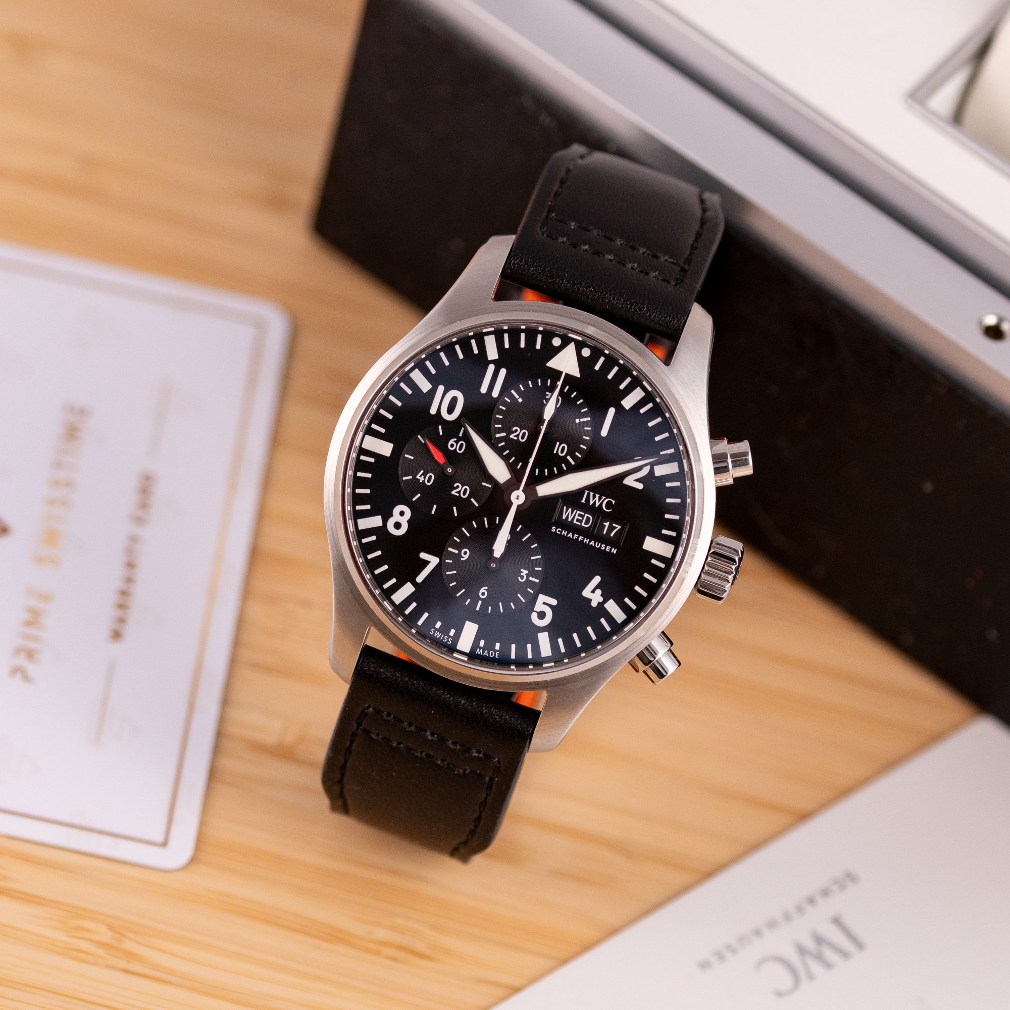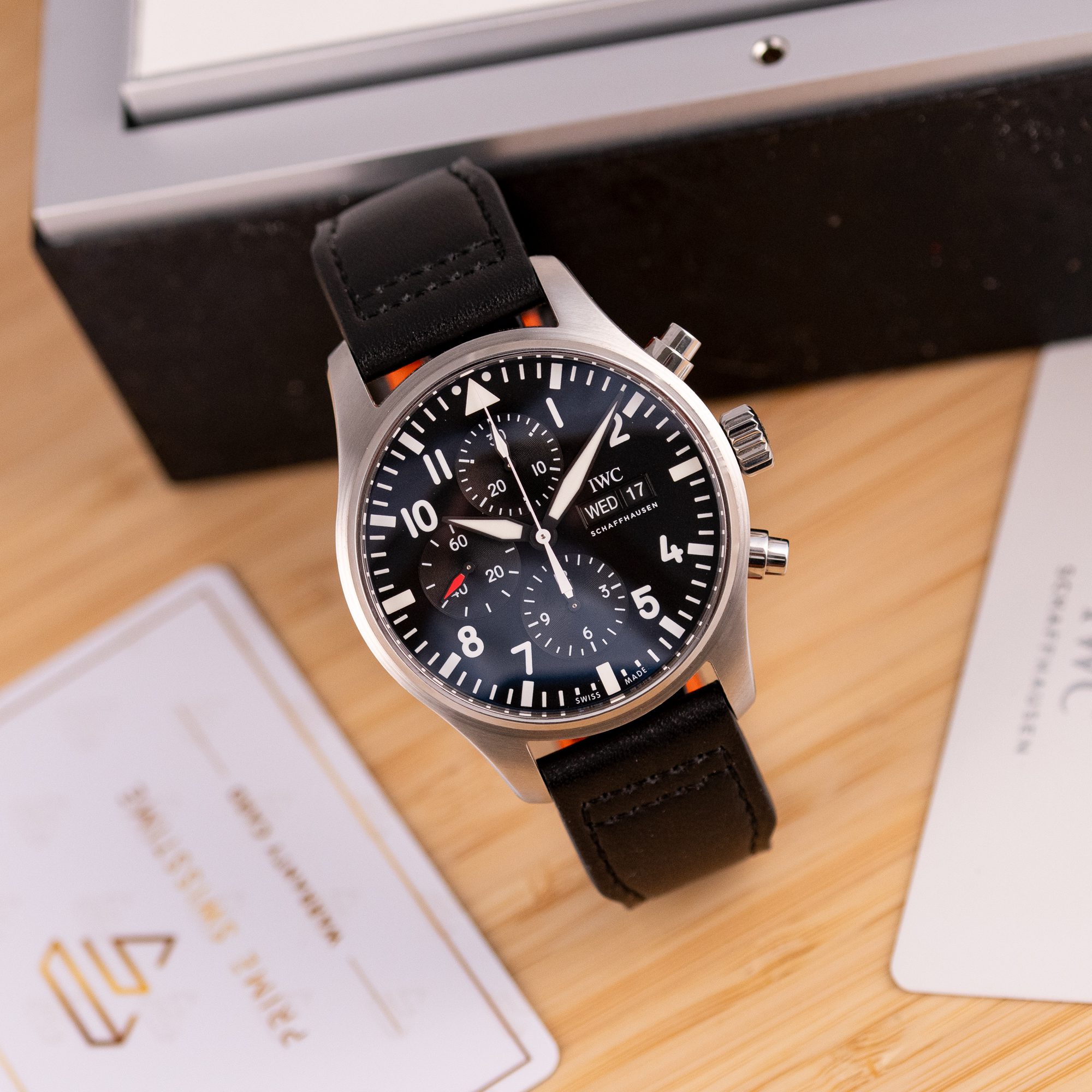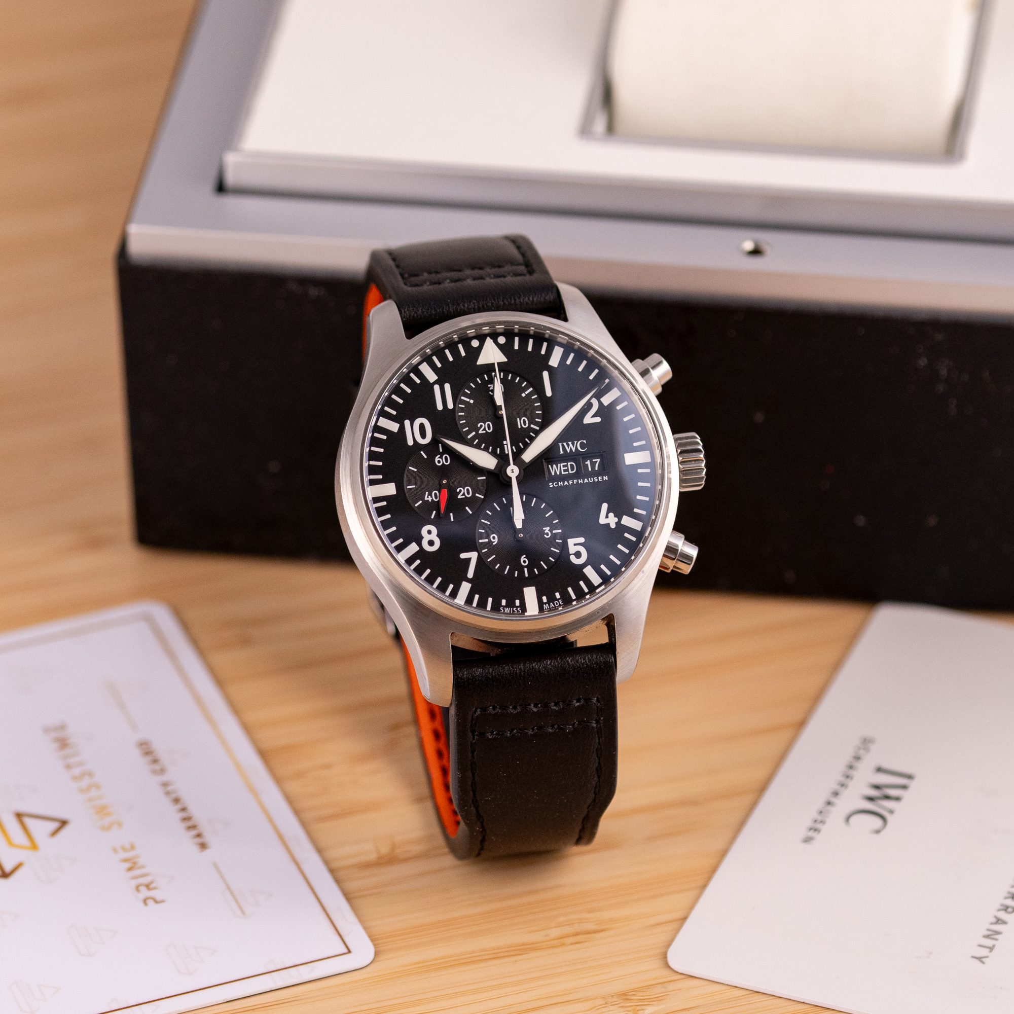 Originally sold in 2017, this example remains in very good condition, with a fully functional automatic chronograph movement ensuring precise timekeeping and reliable performance. The stainless steel bracelet, sized for wrists up to 18 cm, shows minimal wear and maintains its sturdy construction. Presented as a full set with its original IWC box and papers, this Pilot Chronograph is an excellent choice for collectors or those seeking a versatile, high-performance timepiece for daily wear.