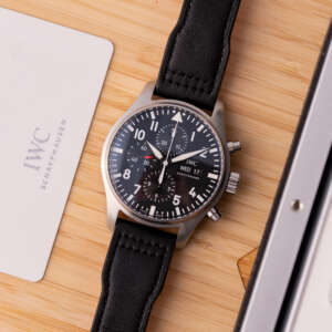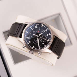 The IWC Pilot Chronograph, ref. IW377709, crafted in stainless steel, features a 43mm case with a clean black dial and luminous markers, designed for optimal legibility and functionality, reflecting the brand’s aviation heritage with a modern, robust aesthetic suitable for any setting.