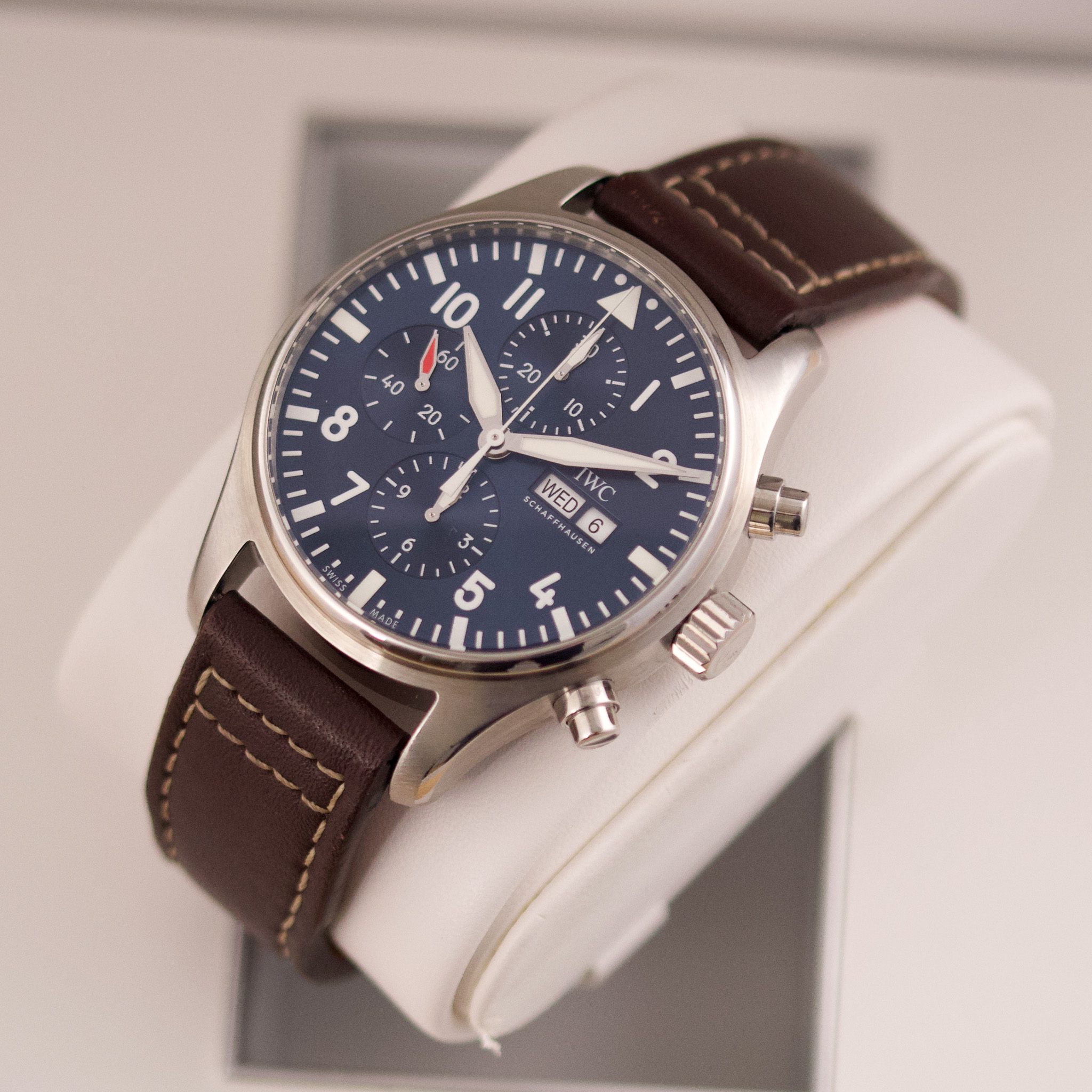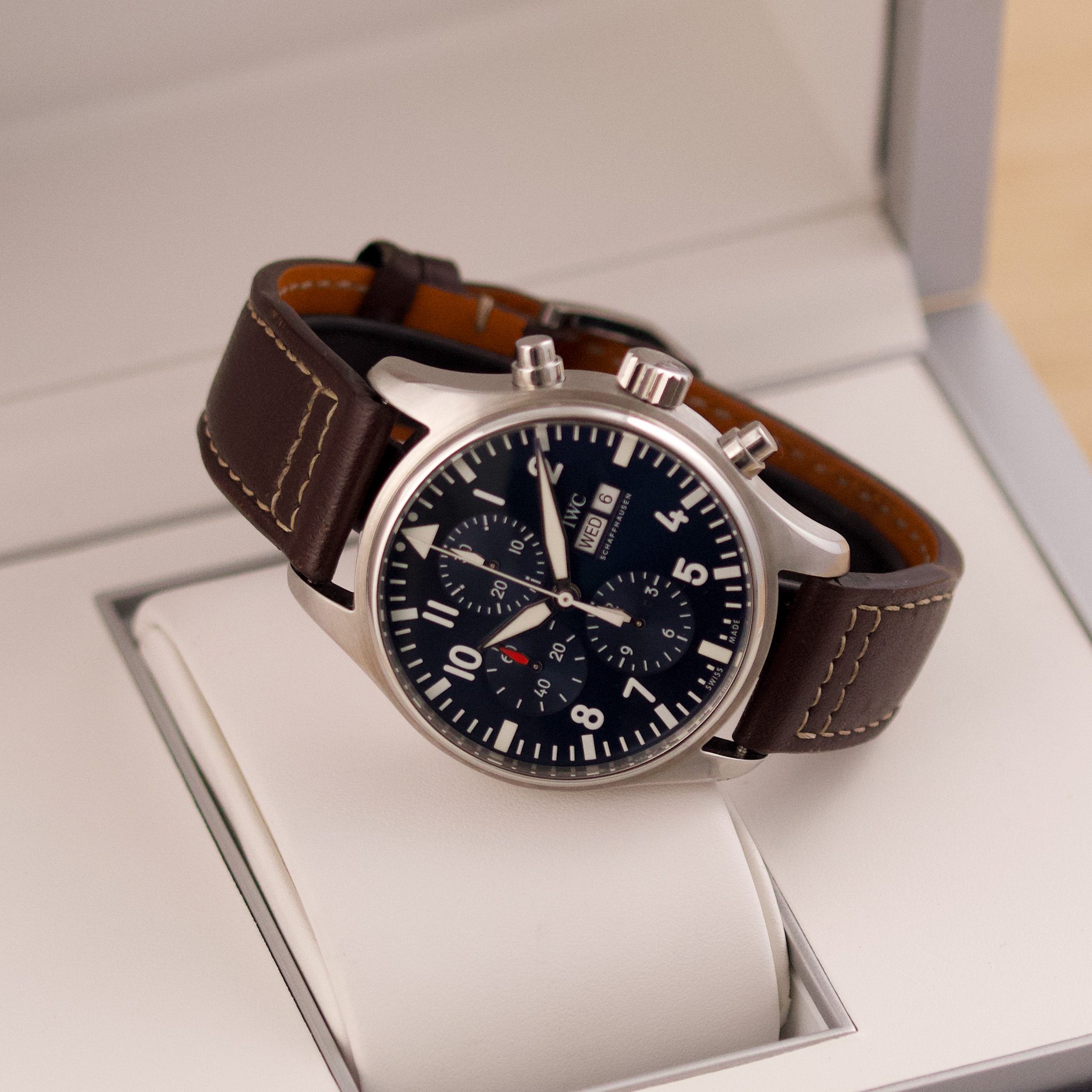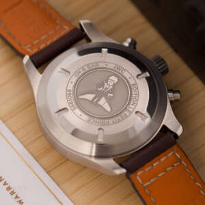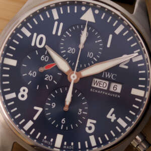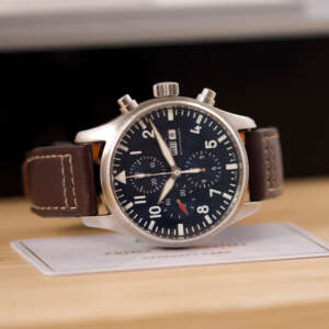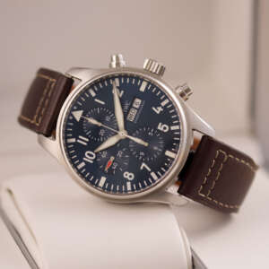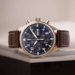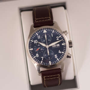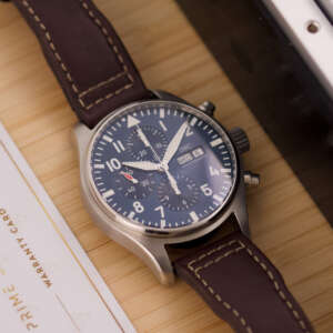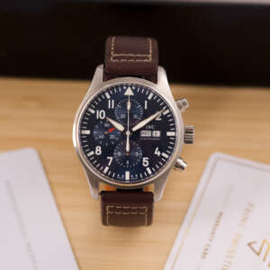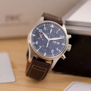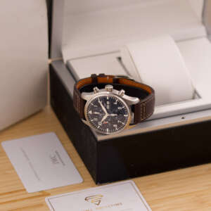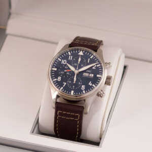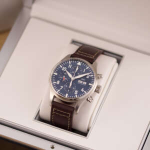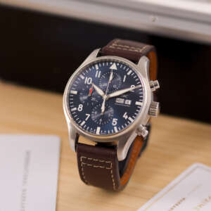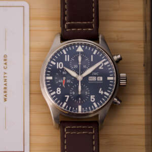 Originally sold in 2017, this watch is in very good condition, with a fully functional automatic chronograph movement ensuring precision and reliability. It is fitted with a calb leather strap, adding a more classic and refined touch to the overall look. Presented as a full set with its original IWC box and papers, this Le Petit Prince edition is a distinguished choice for collectors or those seeking a unique pilot’s watch for daily wear.