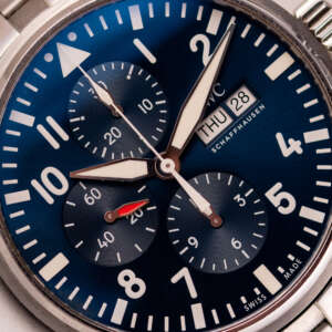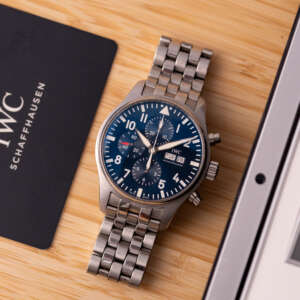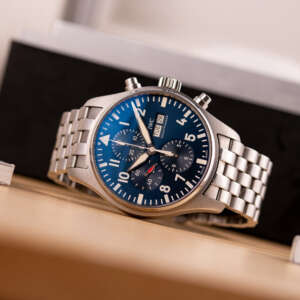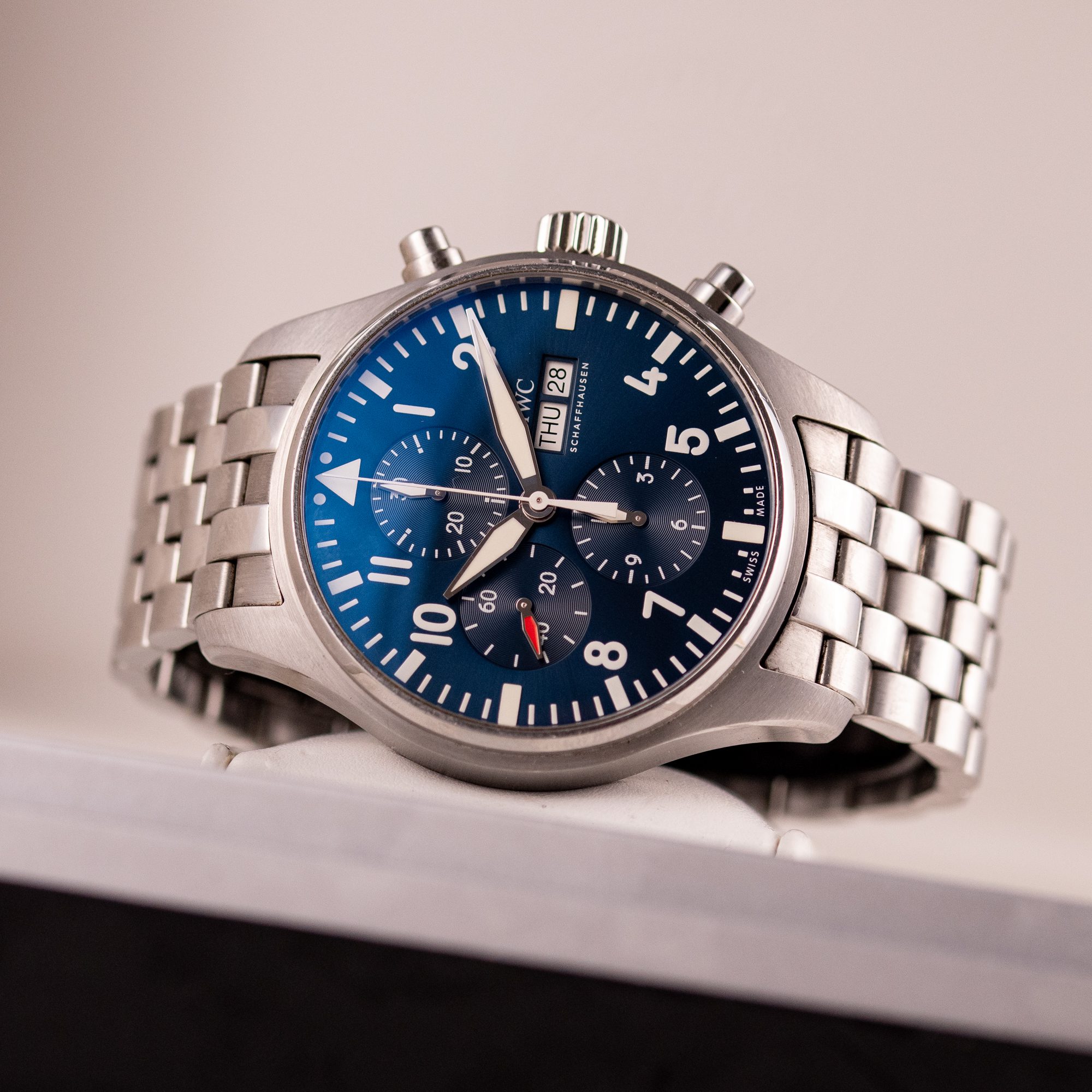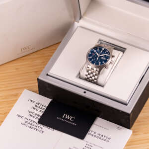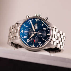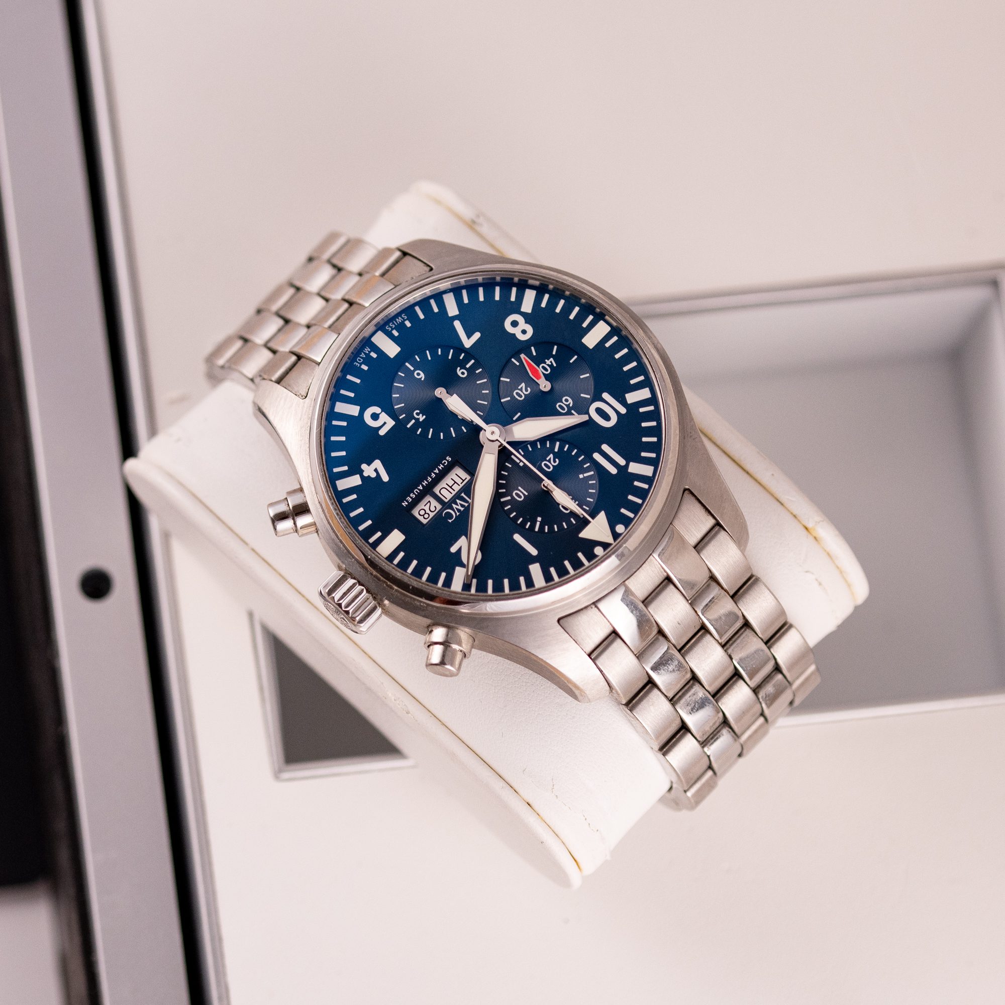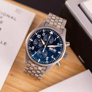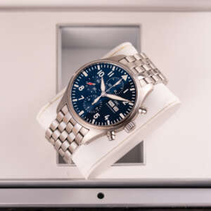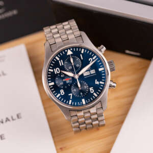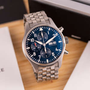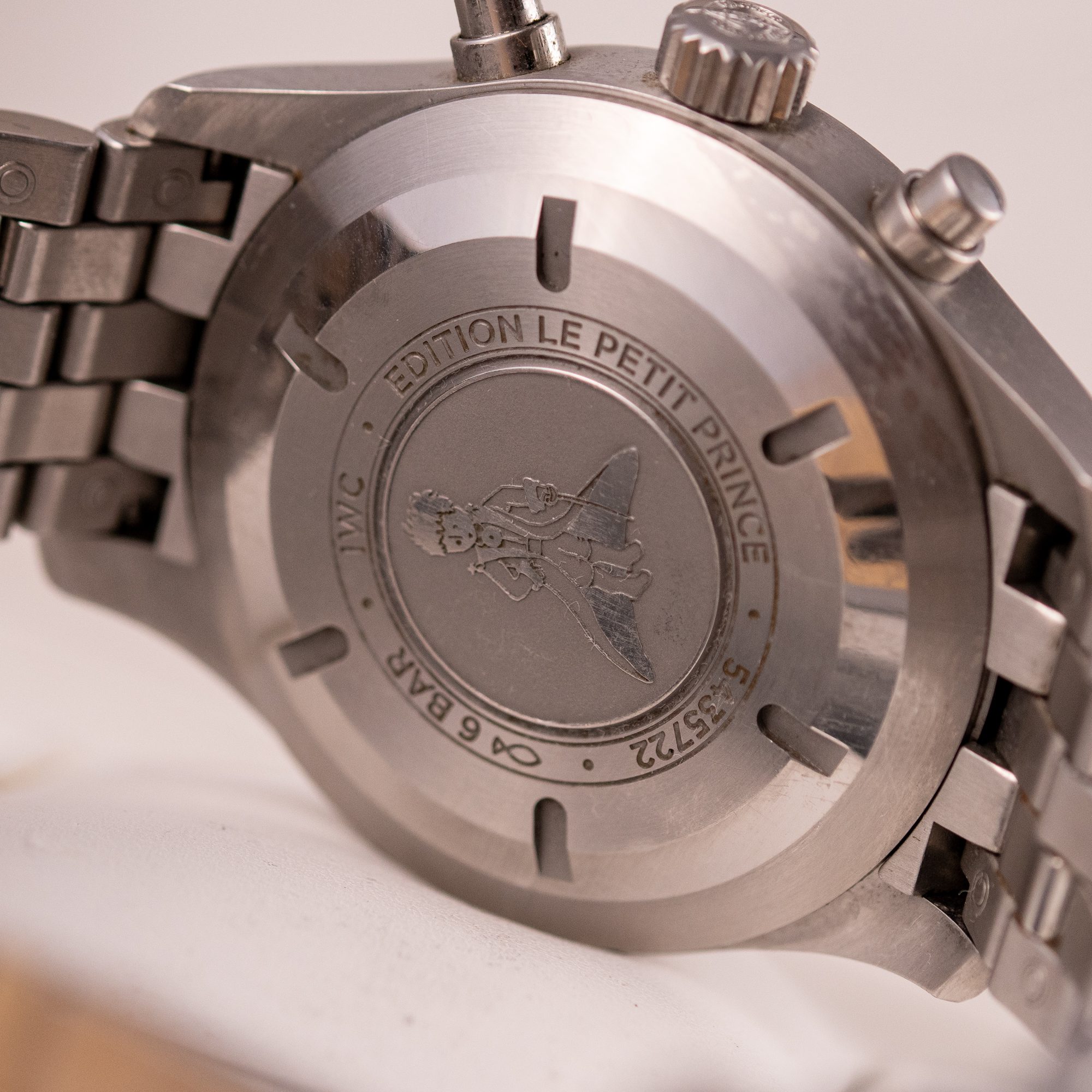 Originally sold in 2018, this watch is in very good condition, with a fully functional automatic chronograph movement ensuring precision and reliability. The stainless steel bracelet, sized for wrists up to 17.5 cm, exhibits minimal wear. Presented as a full set with its original IWC box and papers, this Le Petit Prince edition is a distinguished choice for collectors or those seeking a unique pilot’s watch for daily wear.