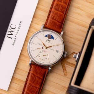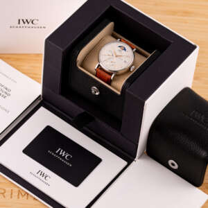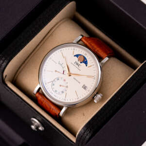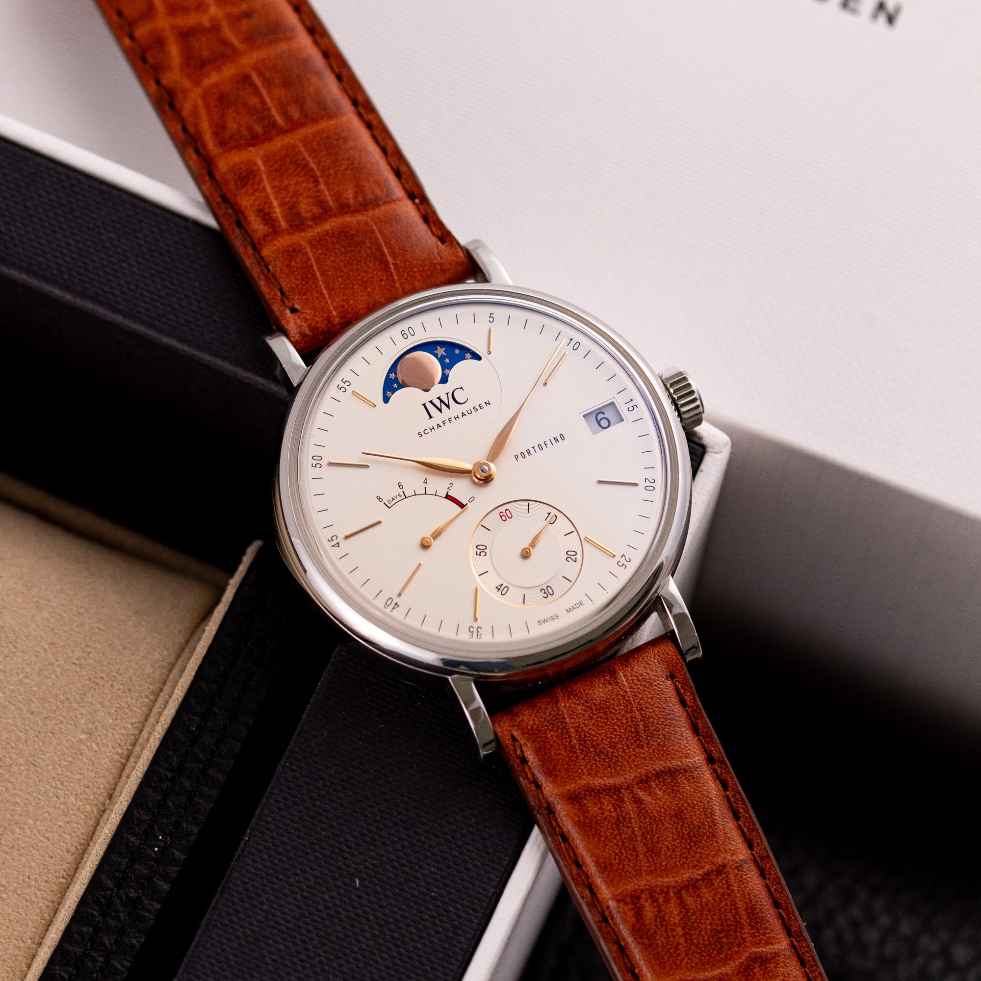 The IWC Portofino Hand Wound is a refined example of classic watchmaking that blends elegant lines with impressive mechanical prowess. An eight-day power reserve and a moon-phase display showcase the manually wound calibre, while the 45 mm case delivers a confident wrist presence.