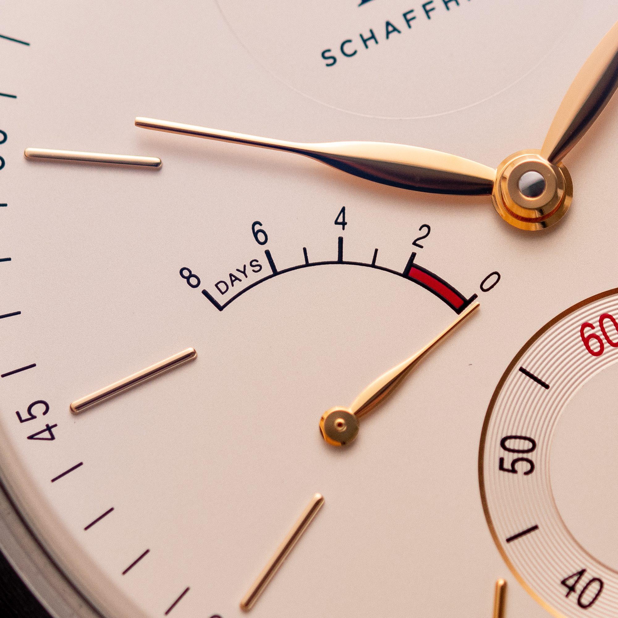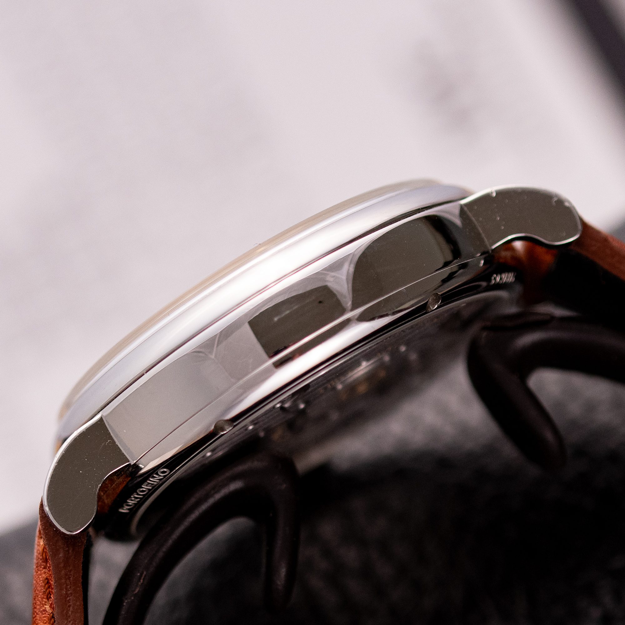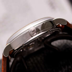 This particular piece, sold in 2022, features a clean silver dial and a new leather strap. The watch is in very good condition, runs flawlessly, and comes as a full set with the original box and papers.