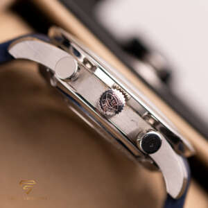 This particular piece, originally sold in 2019, features a white dial with blue hour markers, creating a striking and refined look. The watch is in very good condition and comes as a full set with the original box and papers, making it an excellent choice for collectors and enthusiasts alike.
