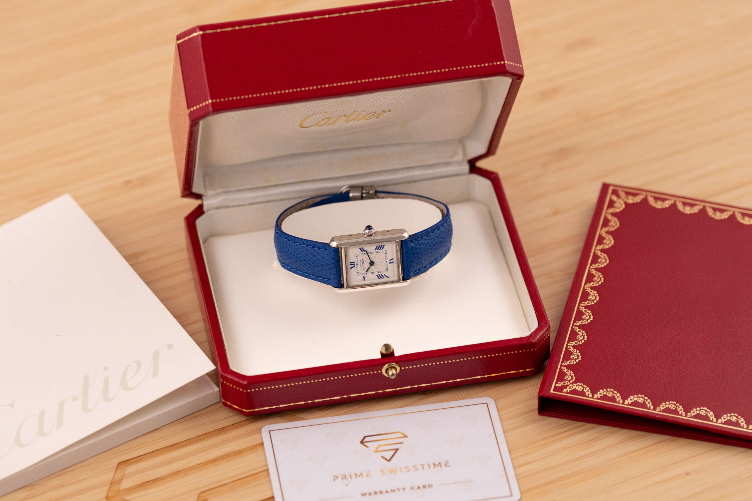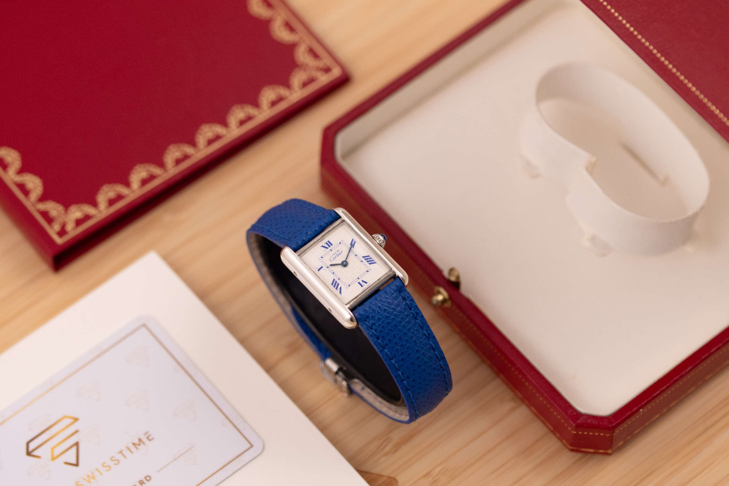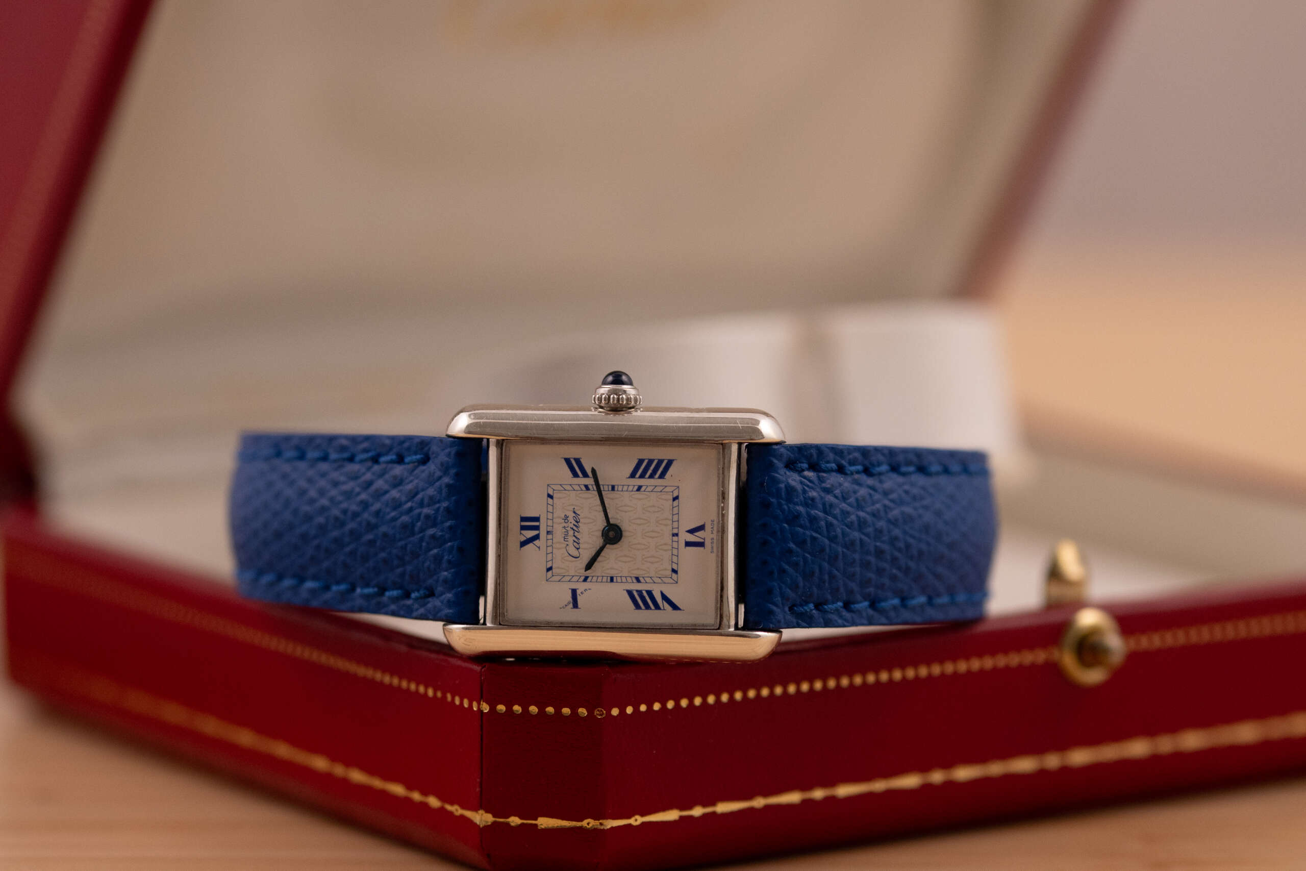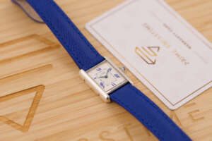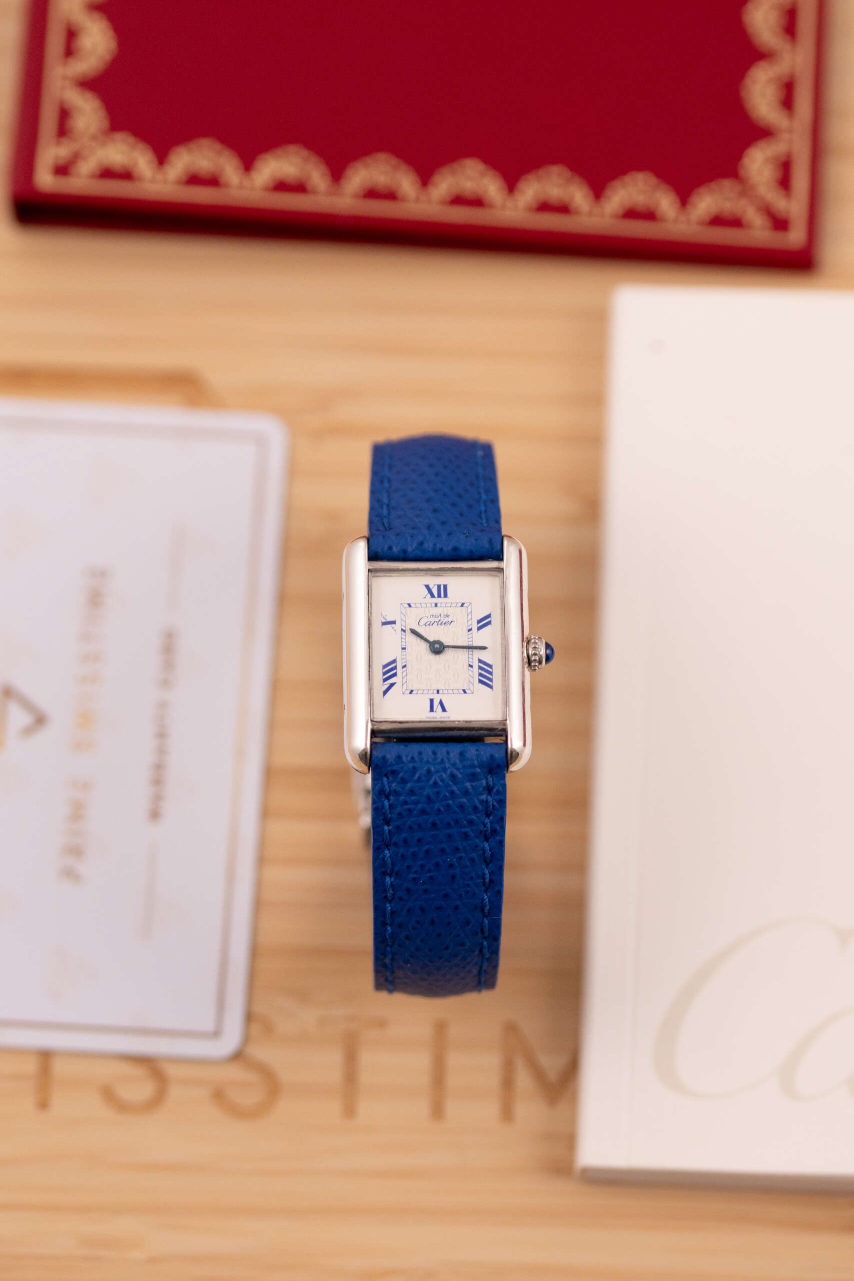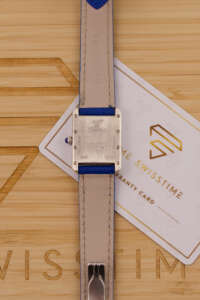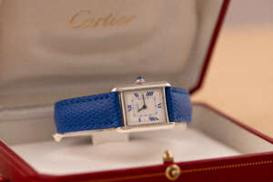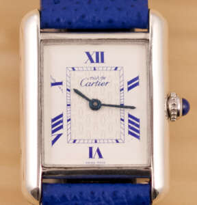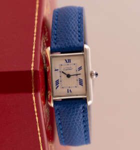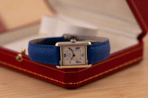 This particular piece features the classic white dial with blue Roman numerals and matching blued hands, complemented by a striking blue leather strap that enhances its elegant character. The watch is in very good condition and runs flawlessly. It comes complete with the original Cartier box and booklet, making it a beautiful and collectible example of this iconic model.