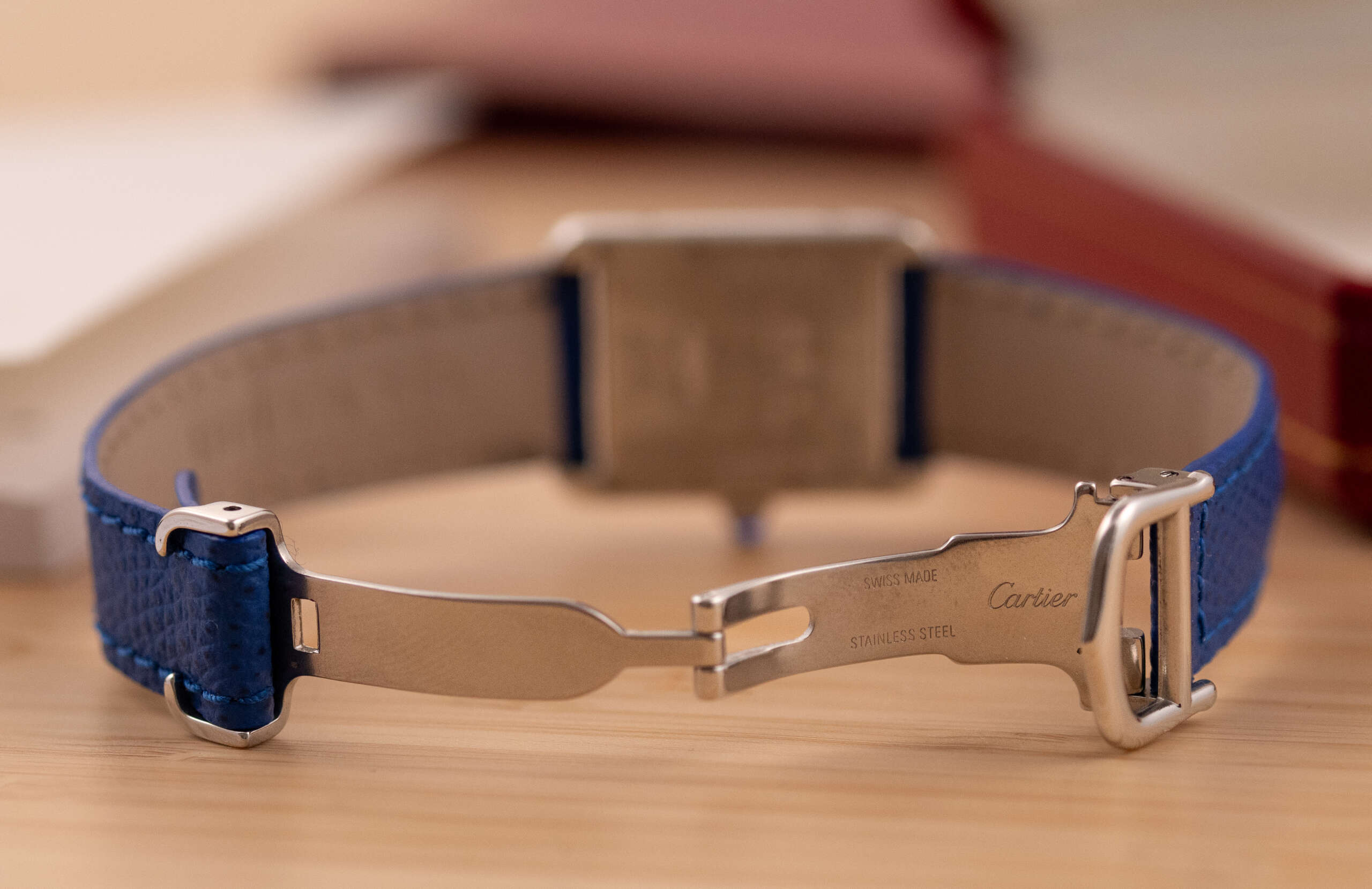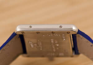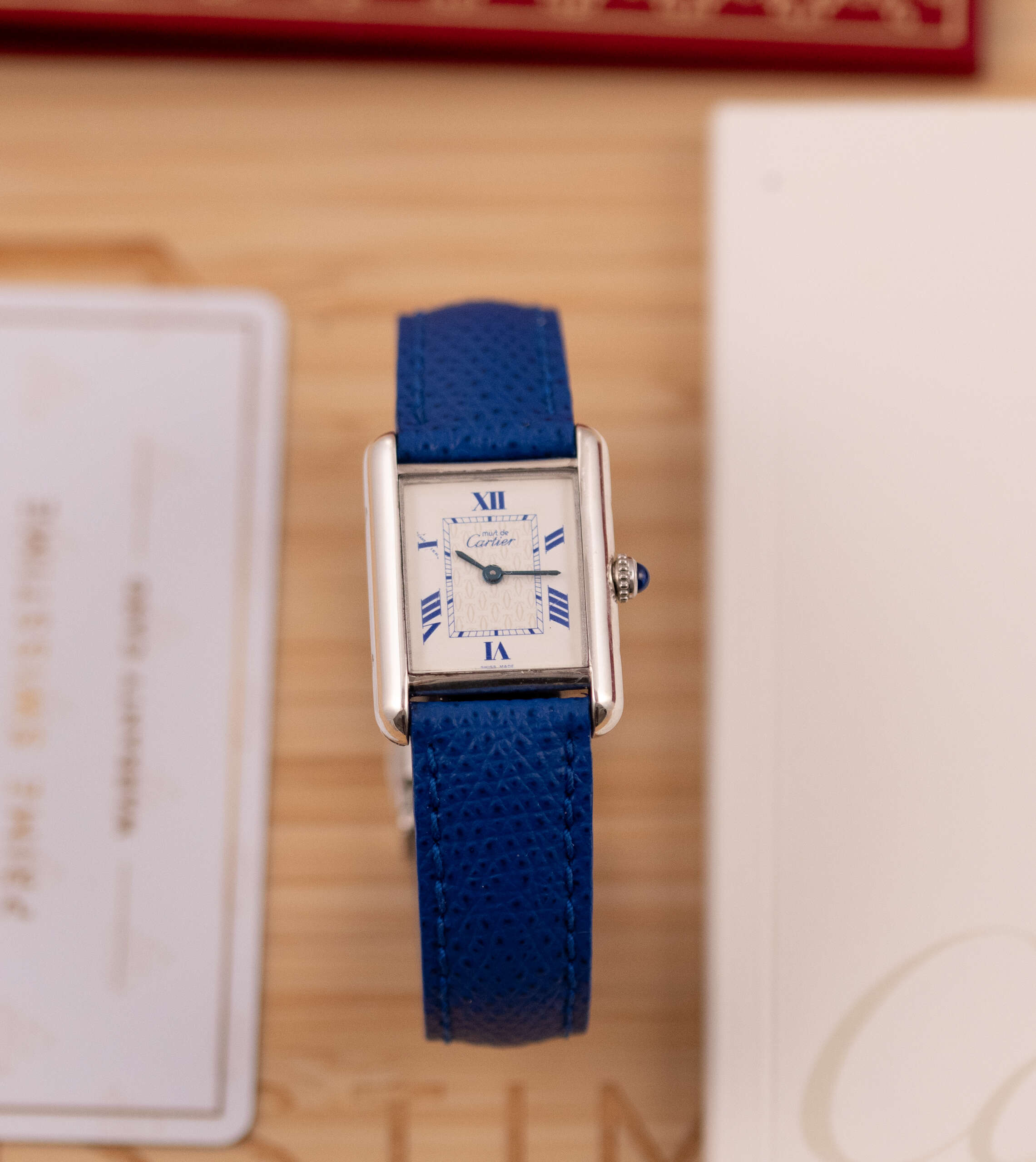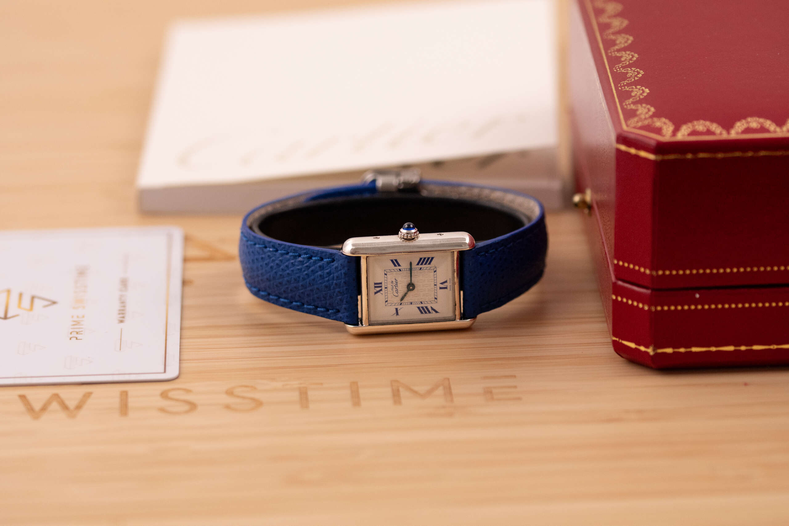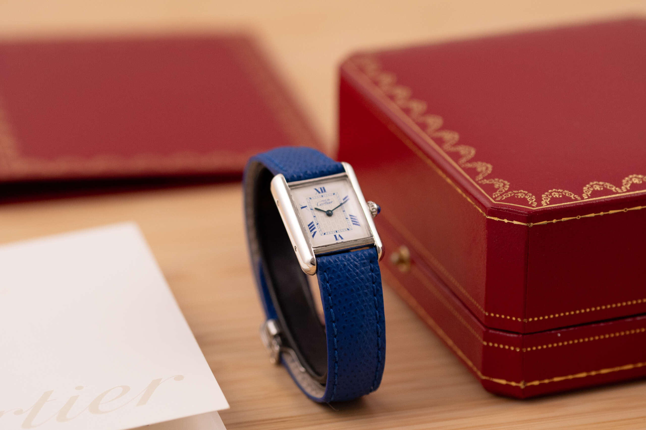 This particular piece features the classic white dial with blue Roman numerals and matching blued hands, complemented by a striking blue leather strap that enhances its elegant character. The watch is in very good condition and runs flawlessly. It comes complete with the original Cartier box and booklet, making it a beautiful and collectible example of this iconic model.