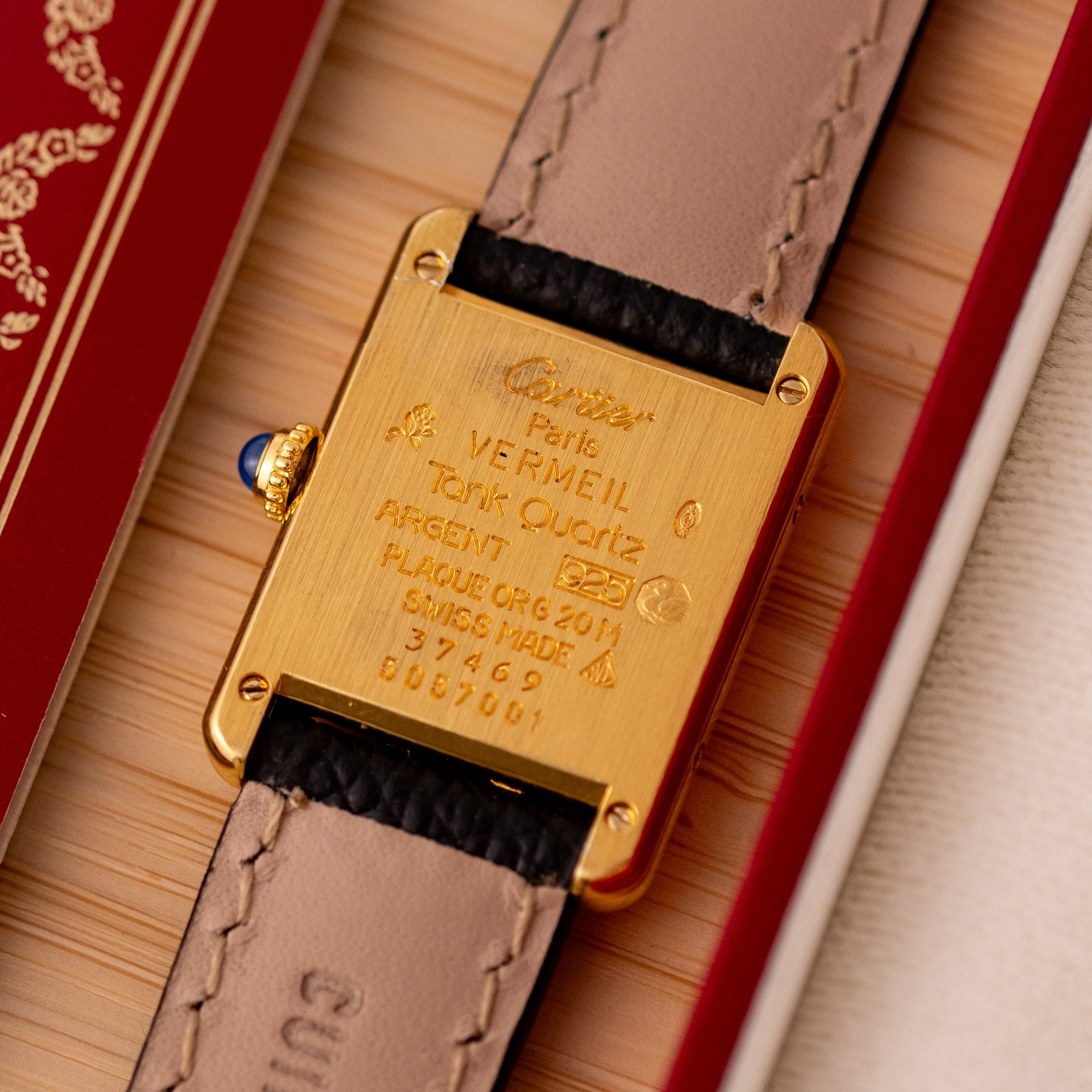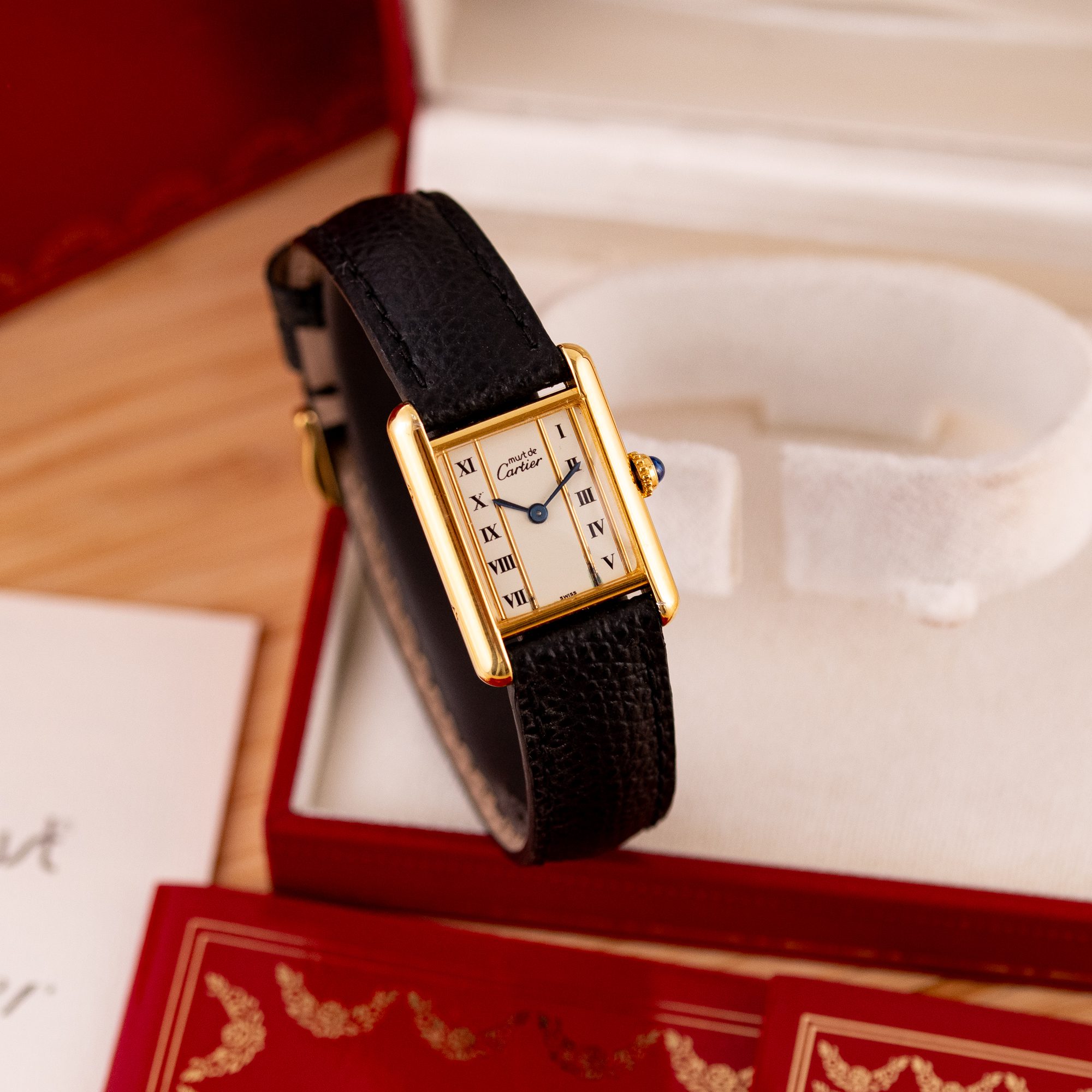 This particular piece features a white Roman dial, adding a crisp and elegant touch to the watch. It is in very good condition, fitted with a new leather strap, and comes as a full set with the original box and papers. A beautiful choice for enthusiasts of classic Cartier timepieces.