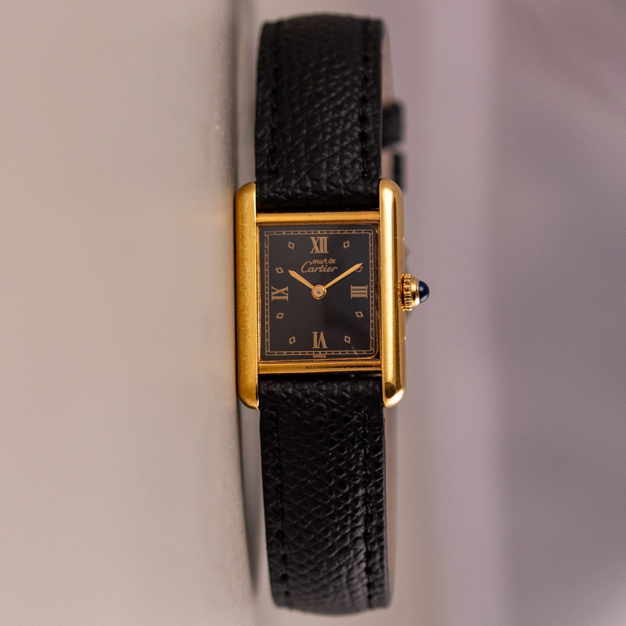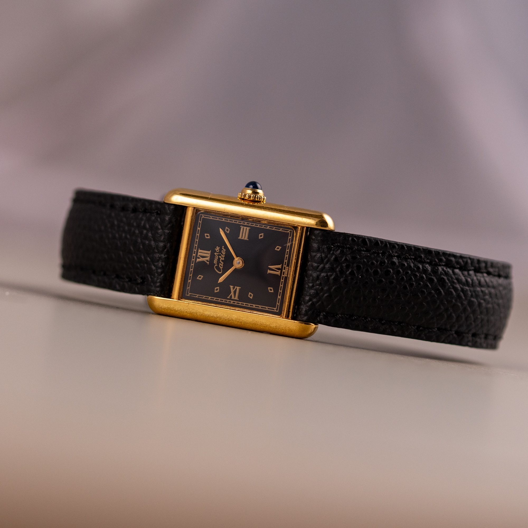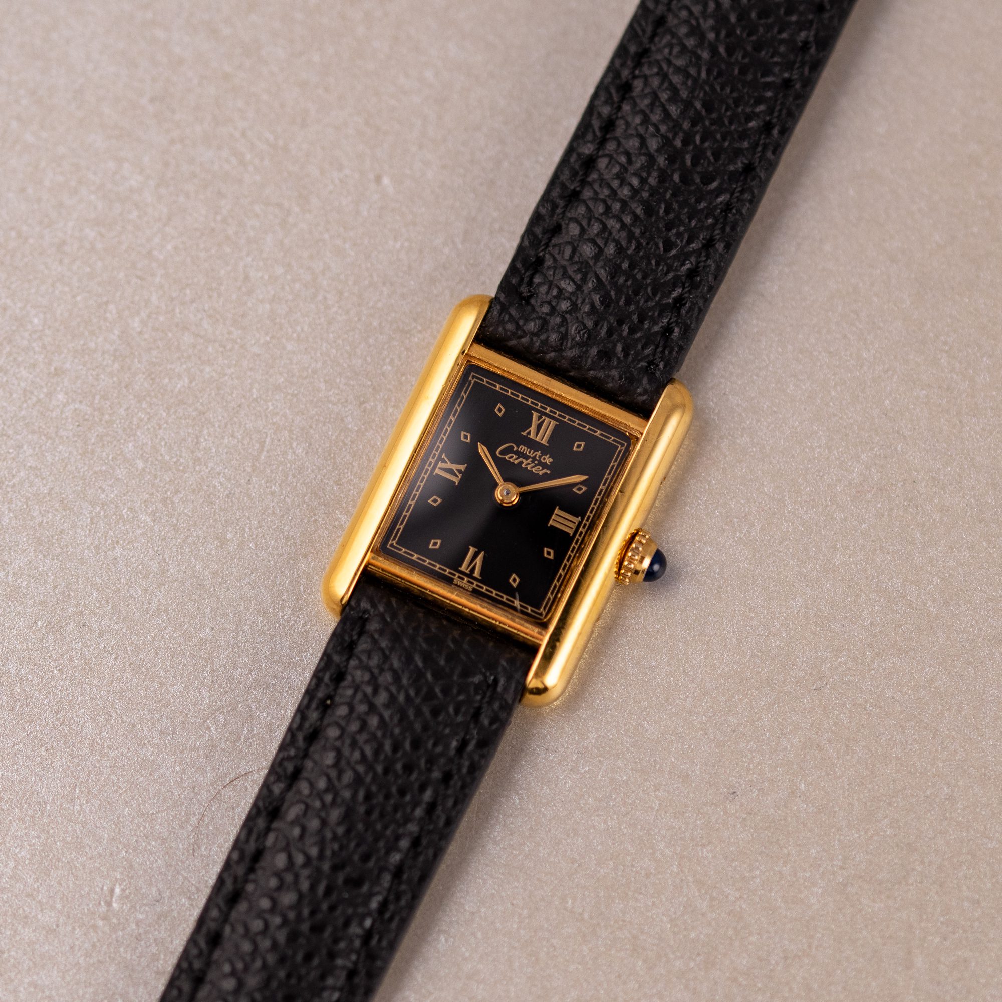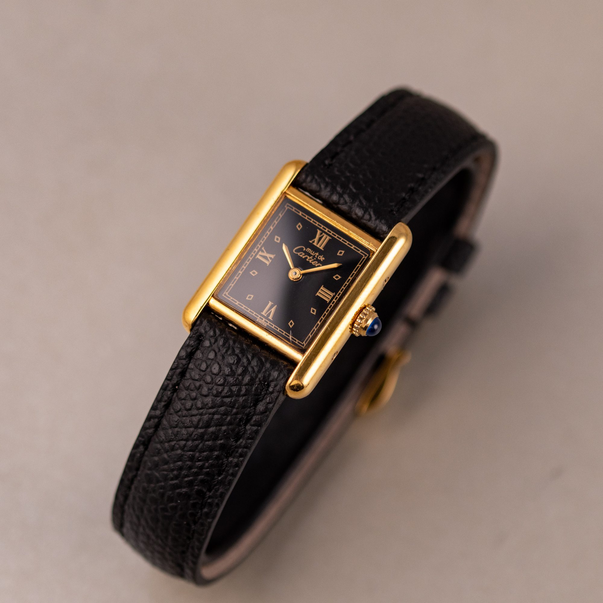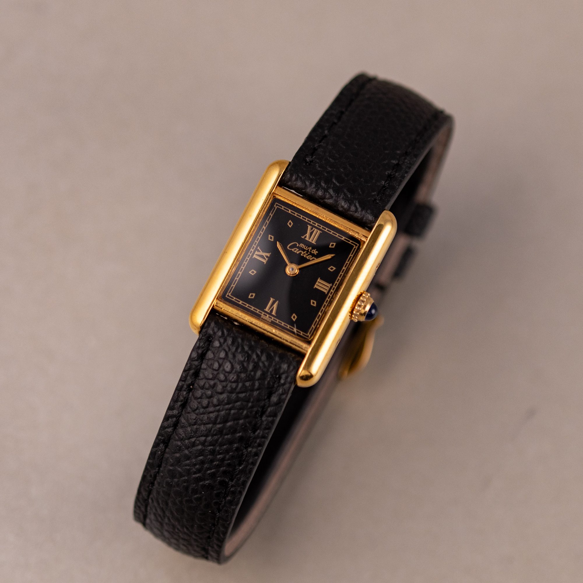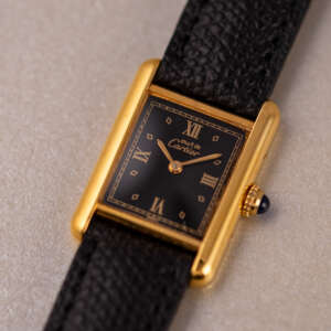 This example features a refined Black dial, sophisticated aesthetic to its classic profile. The watch is in very good condition, with a fully functional quartz movement ensuring reliable timekeeping. Fitted with a new leather strap for enhanced comfort and style, it is sold as watch only, making this Must de Cartier Tank an appealing choice for collectors or those seeking a distinguished, minimalist timepiece.