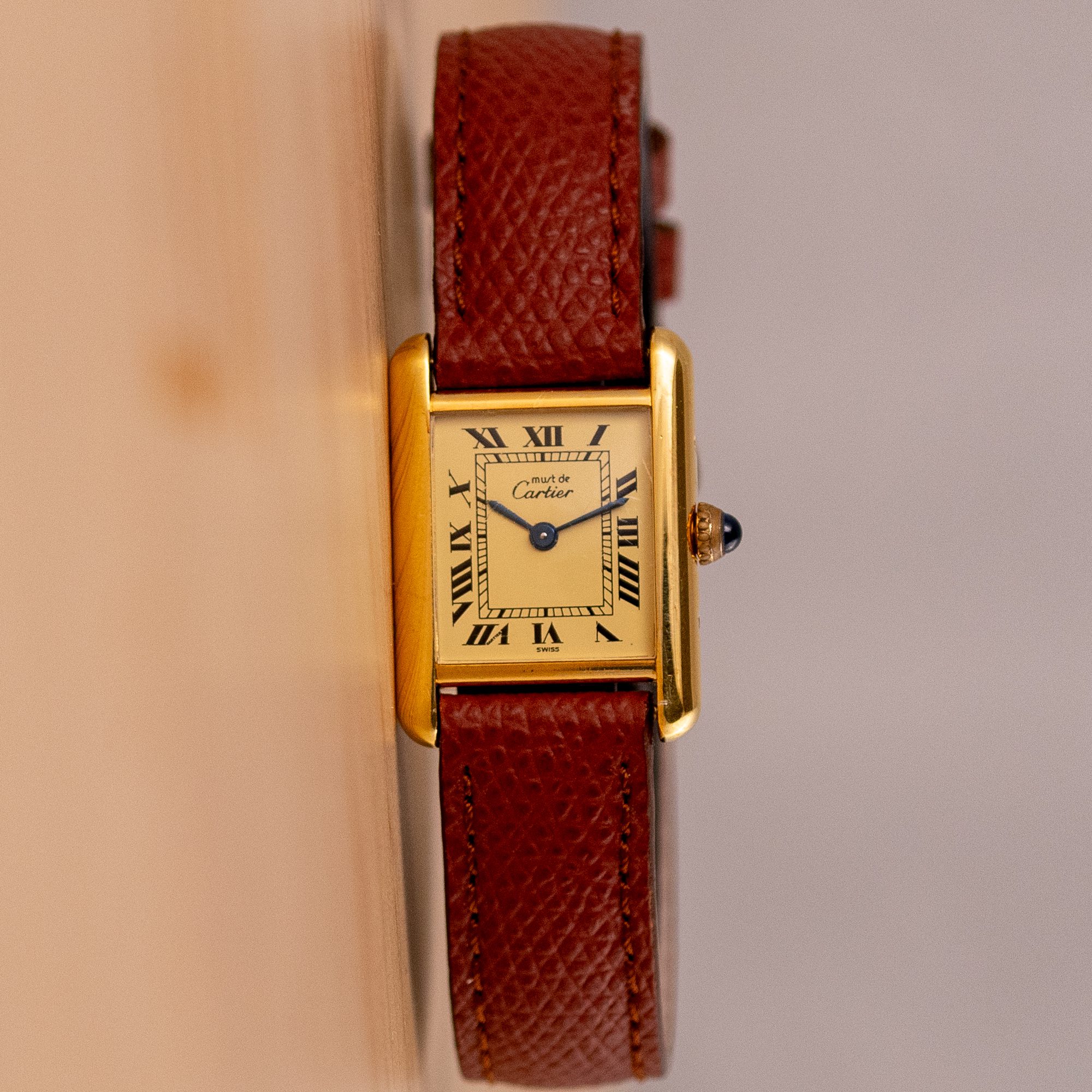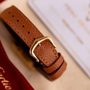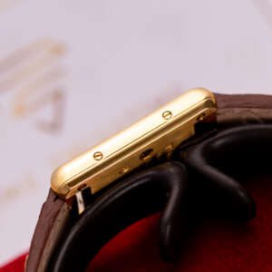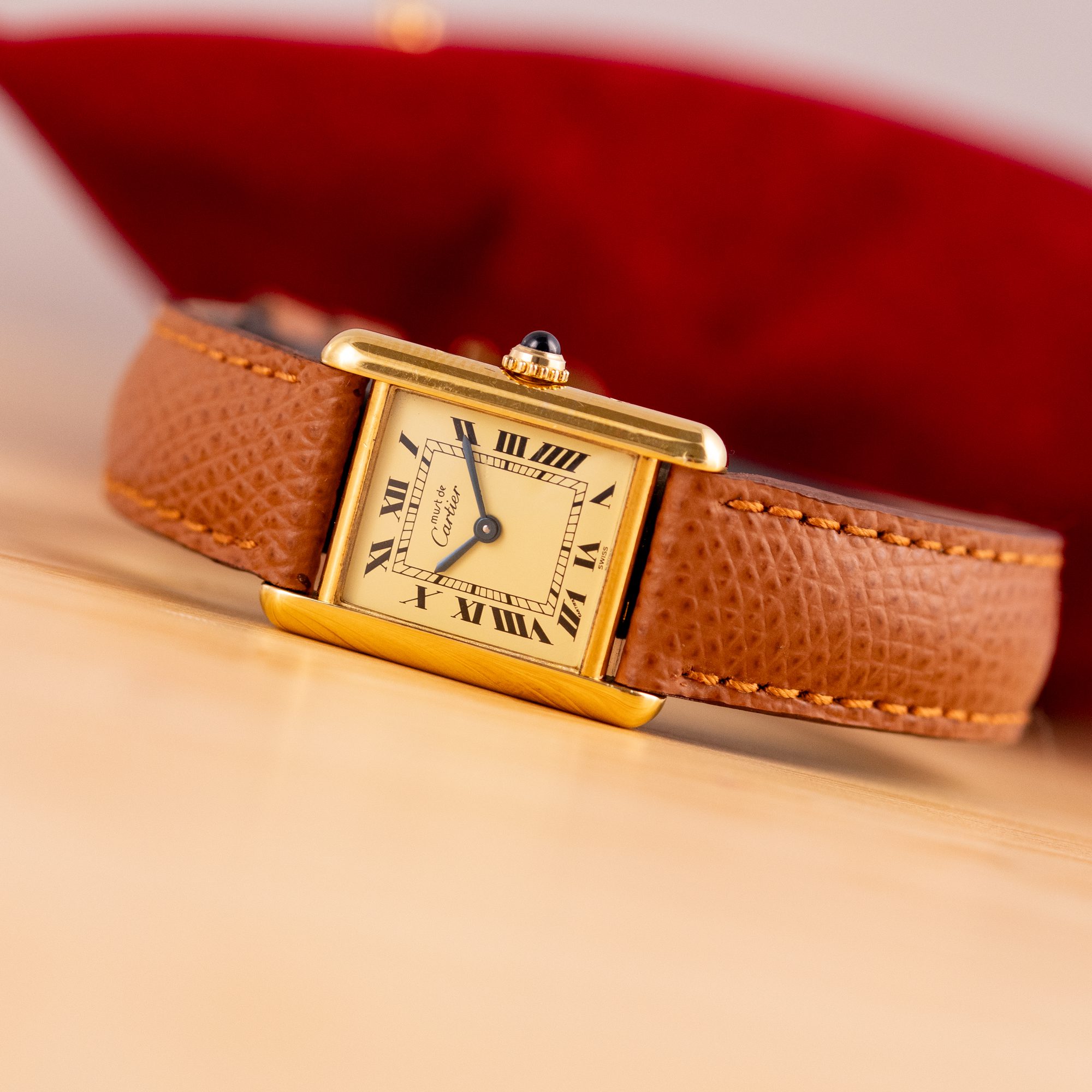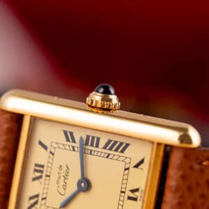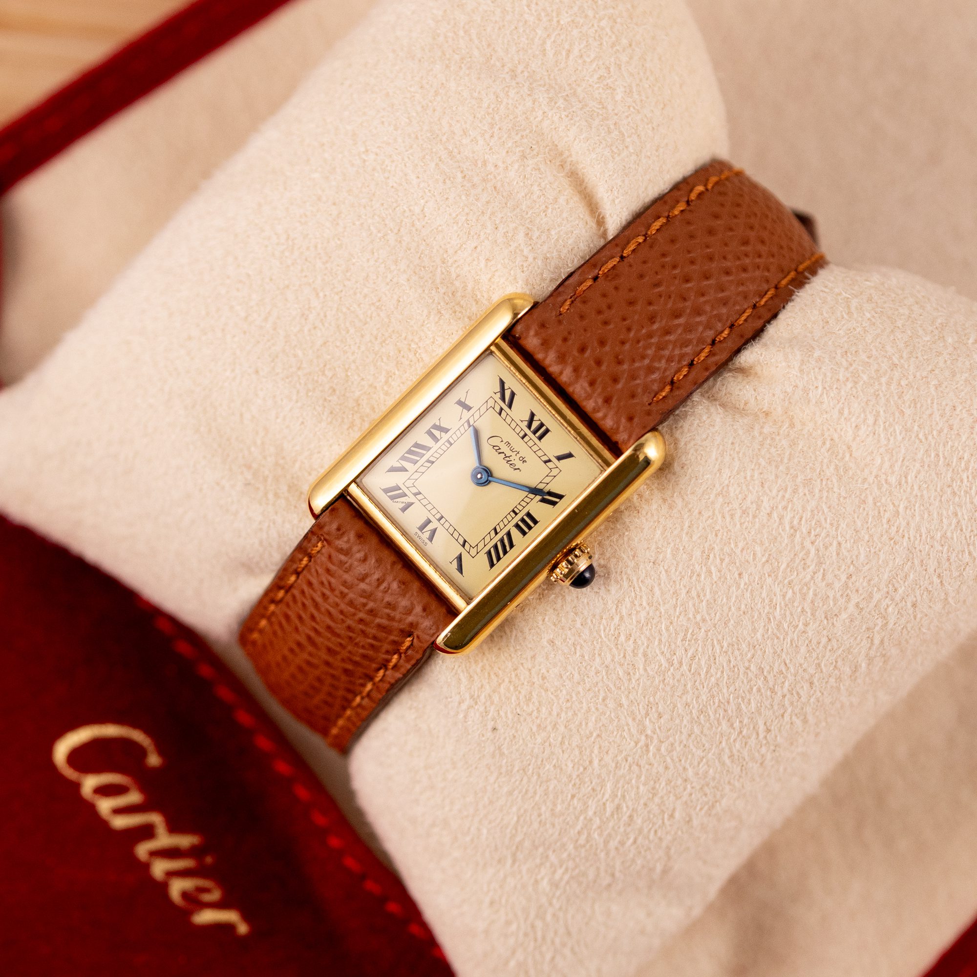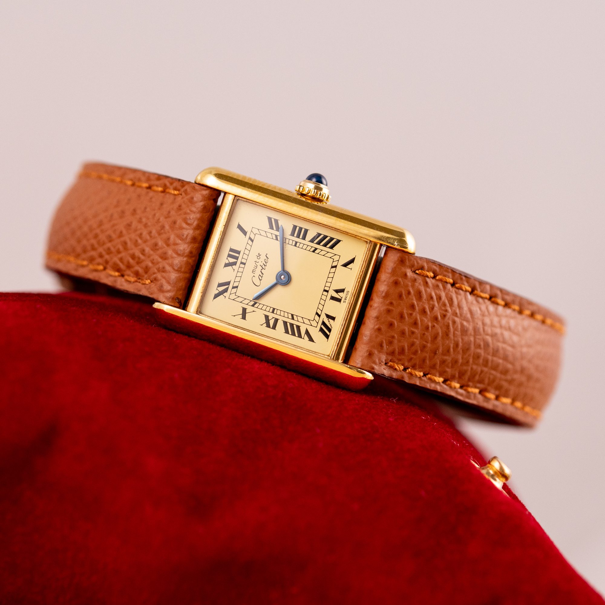 The Must de Cartier Tank, ref. 5057001, epitomizes understated luxury with its rectangular vermeil case, Roman numerals, and signature cabochon crown, offering a timeless design that seamlessly blends elegance and versatility for both formal occasions and everyday wear.