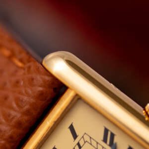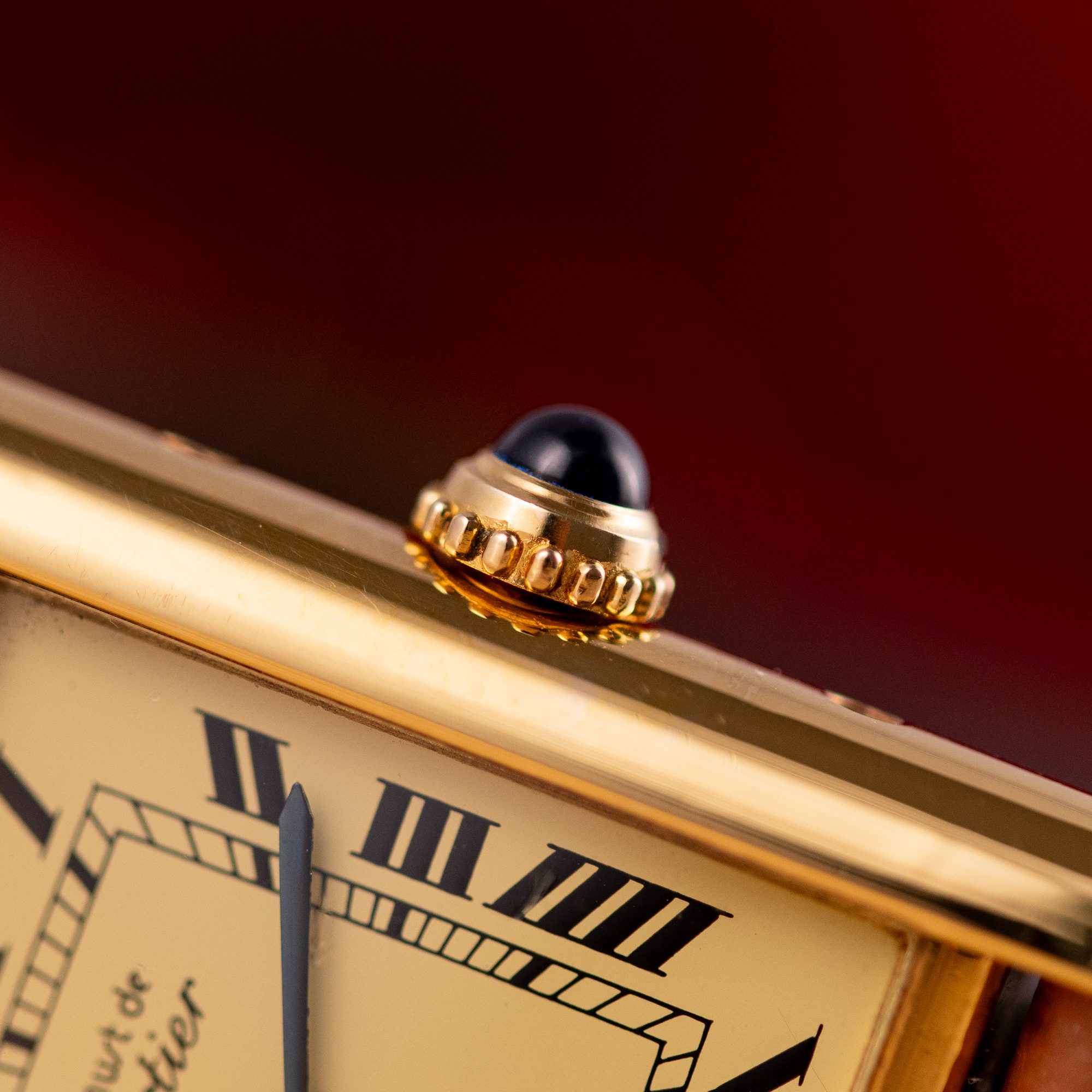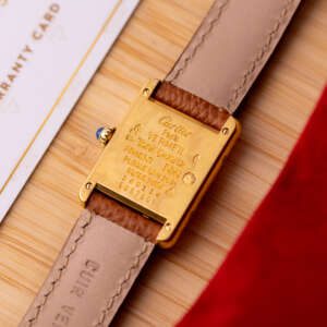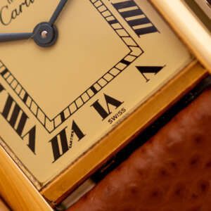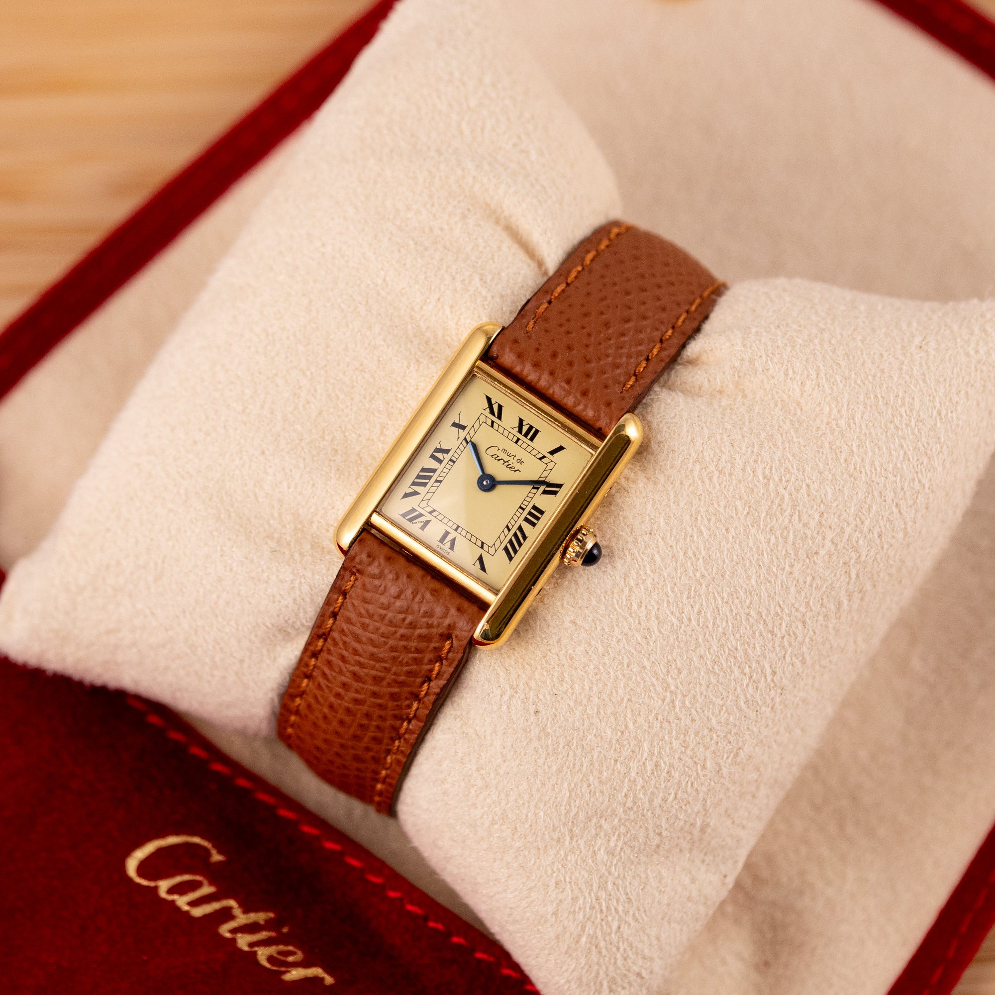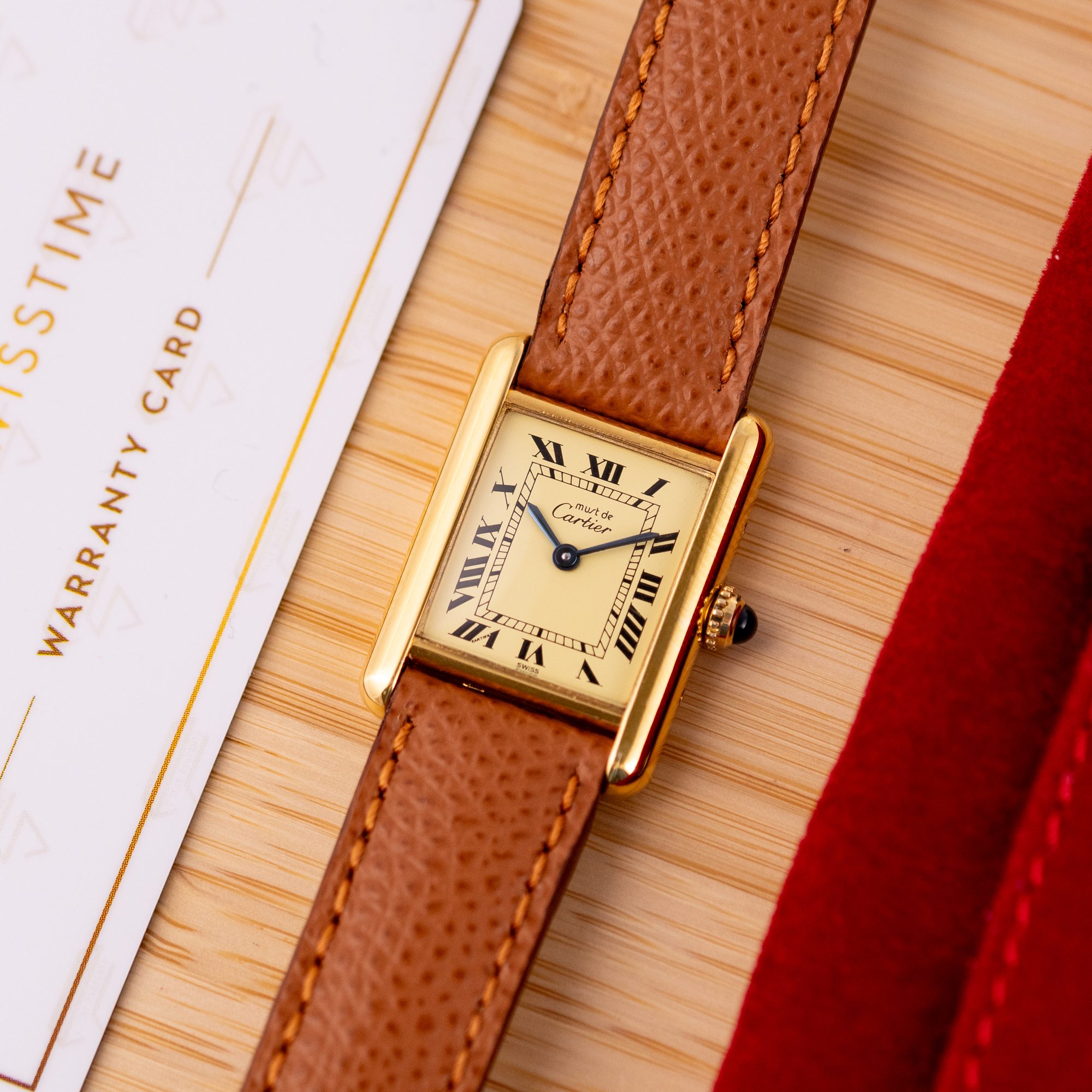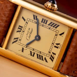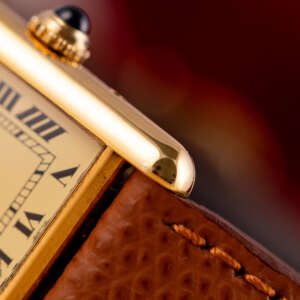 The Must de Cartier Tank, ref. 5057001, epitomizes understated luxury with its rectangular vermeil case, Roman numerals, and signature cabochon crown, offering a timeless design that seamlessly blends elegance and versatility for both formal occasions and everyday wear.
