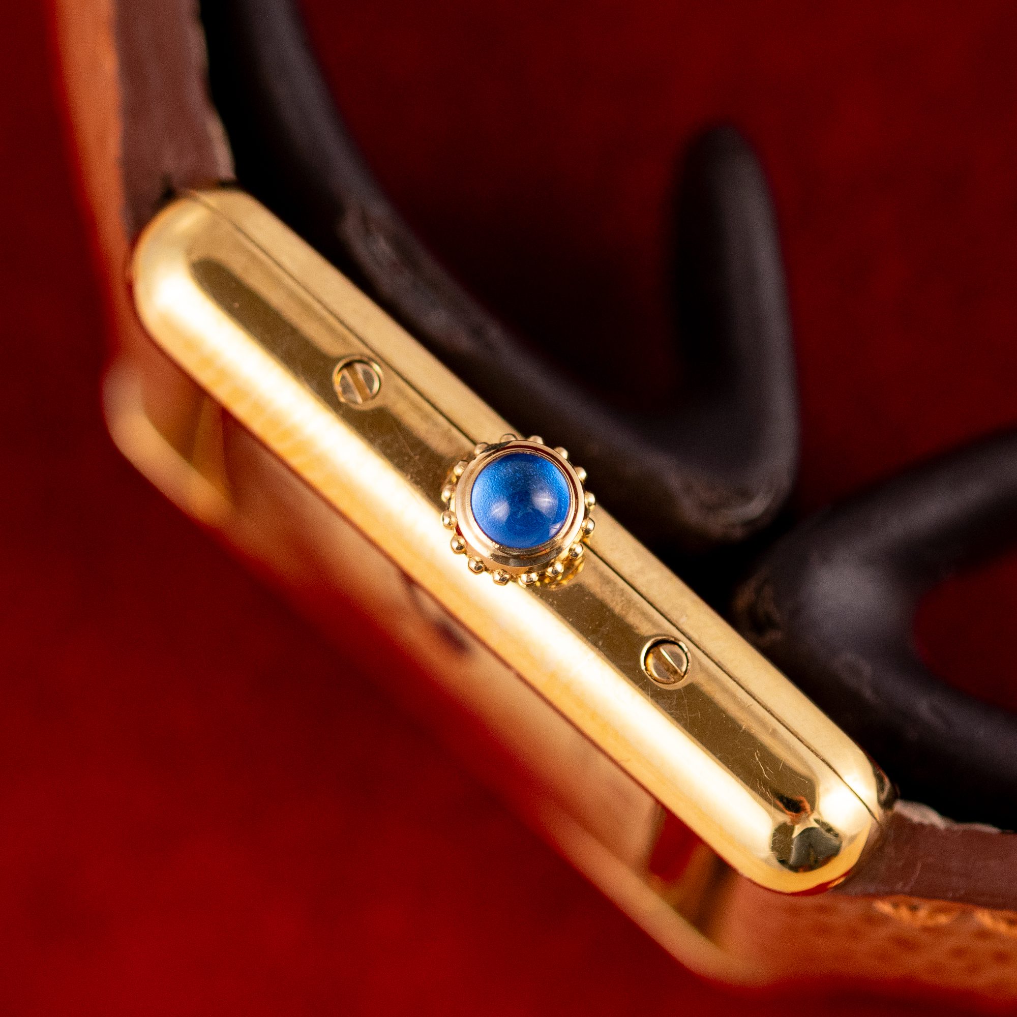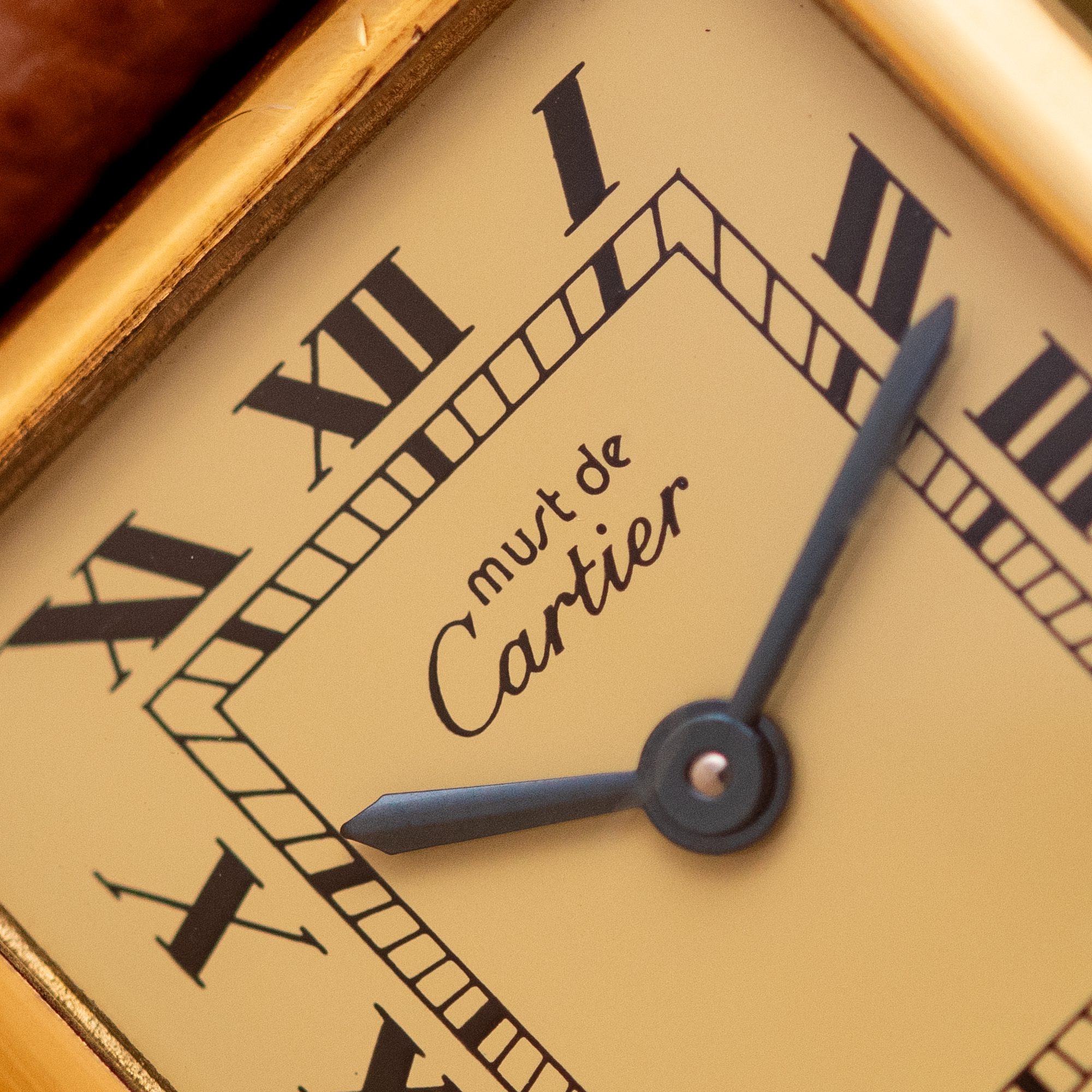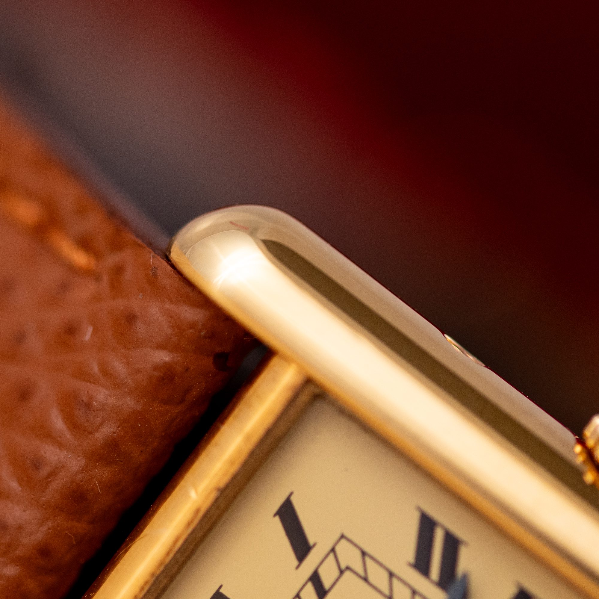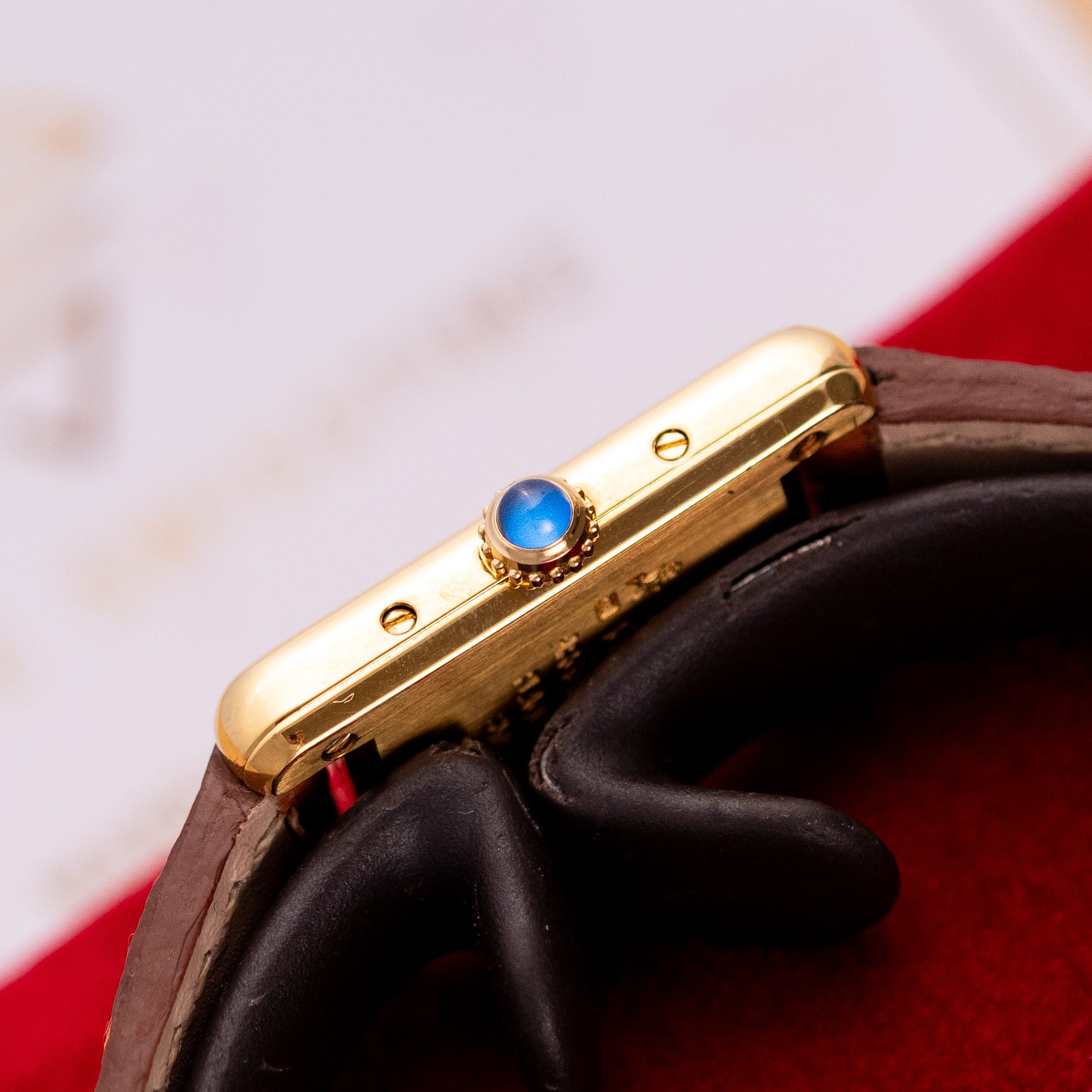 The Must de Cartier Tank, ref. 5057001, epitomizes understated luxury with its rectangular vermeil case, Roman numerals, and signature cabochon crown, offering a timeless design that seamlessly blends elegance and versatility for both formal occasions and everyday wear.