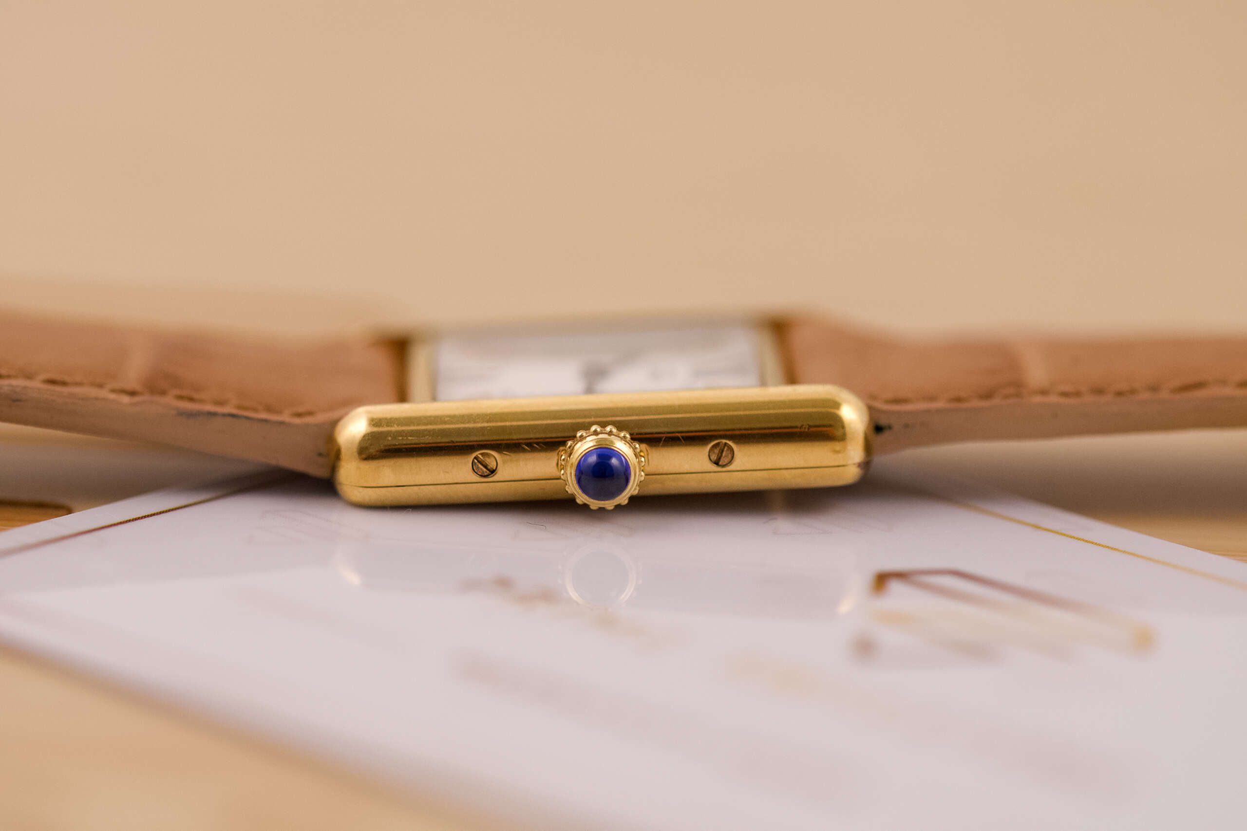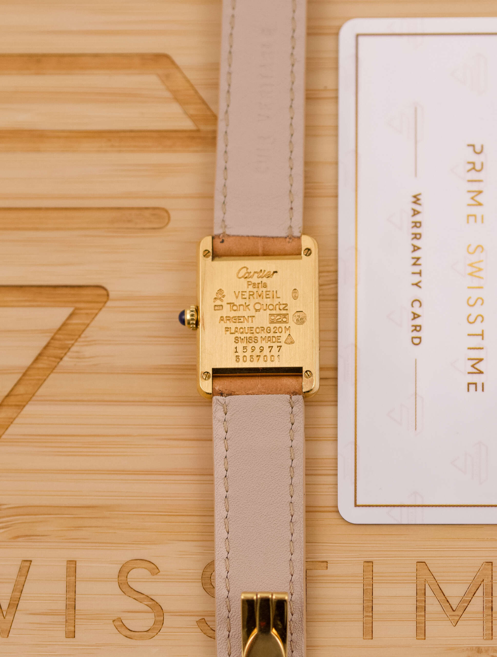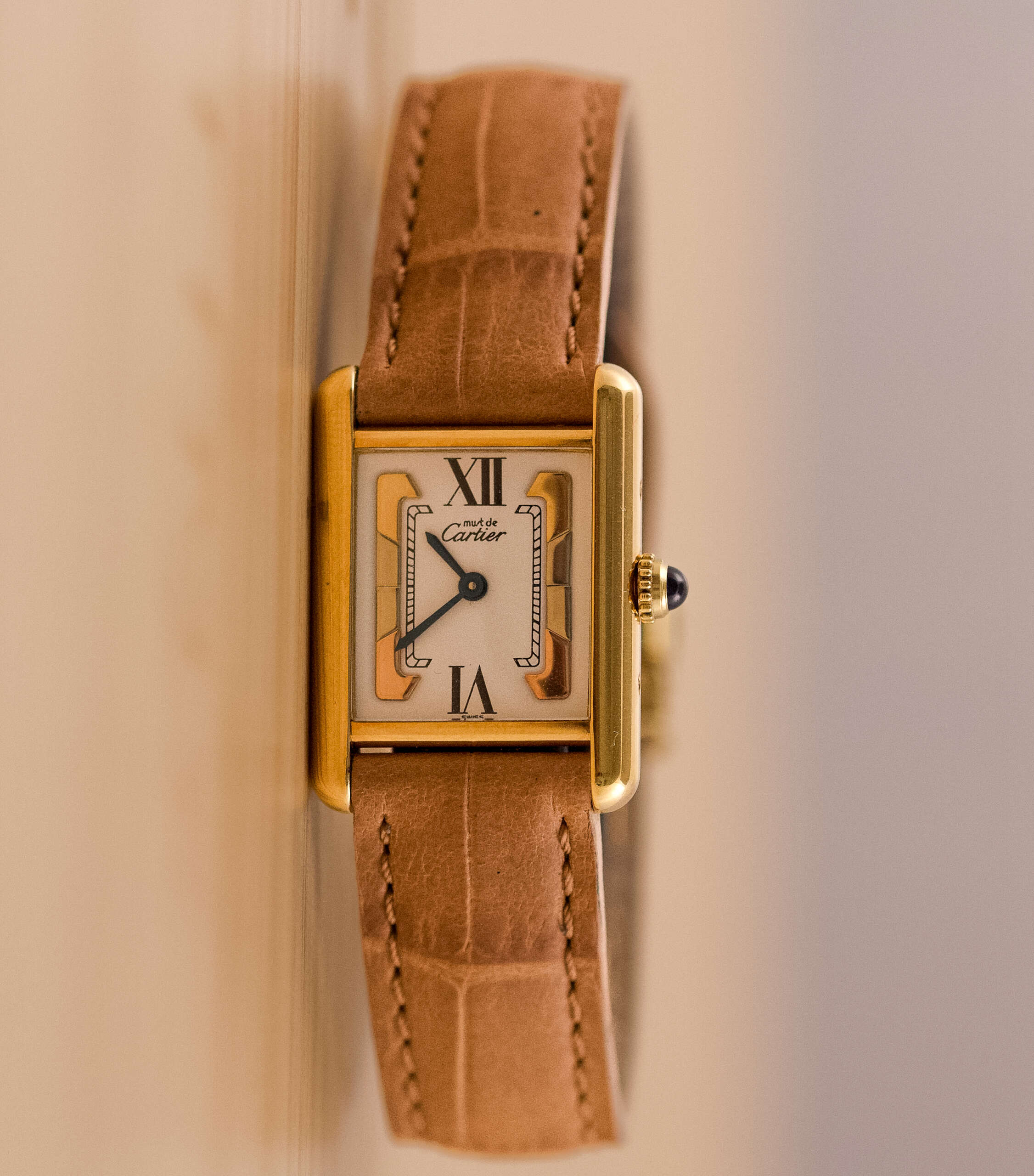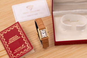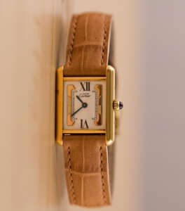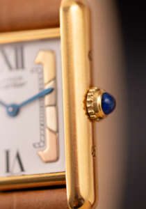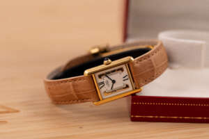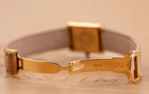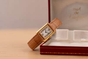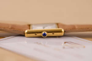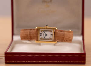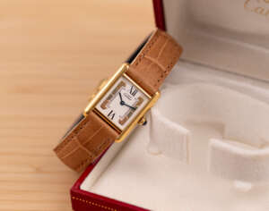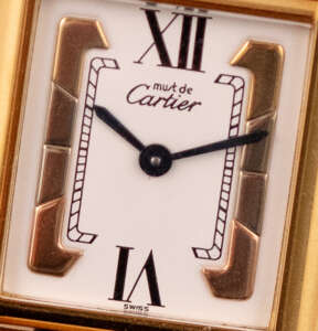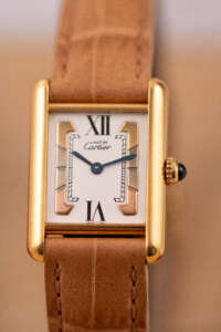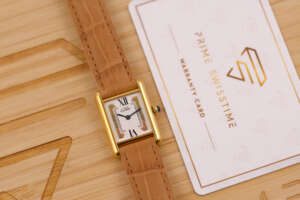 The Cartier Must de Cartier Tank Ref. 5057001 features a rectangular vermeil case with elegant Roman numerals and the signature blue cabochon crown, embodying Cartier’s iconic minimalist design that blends refined elegance with timeless wearability, suitable for both formal occasions and everyday sophistication.
