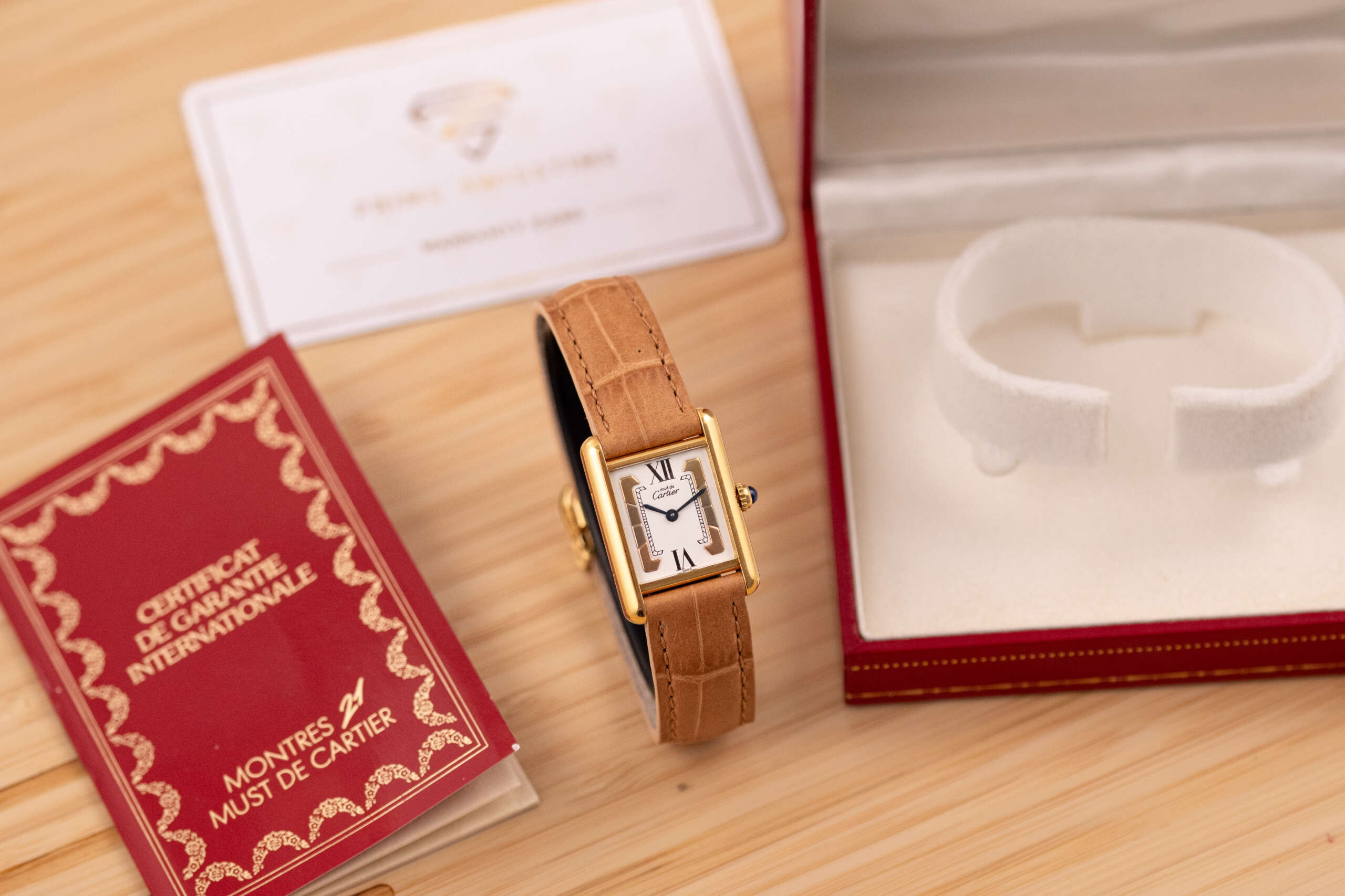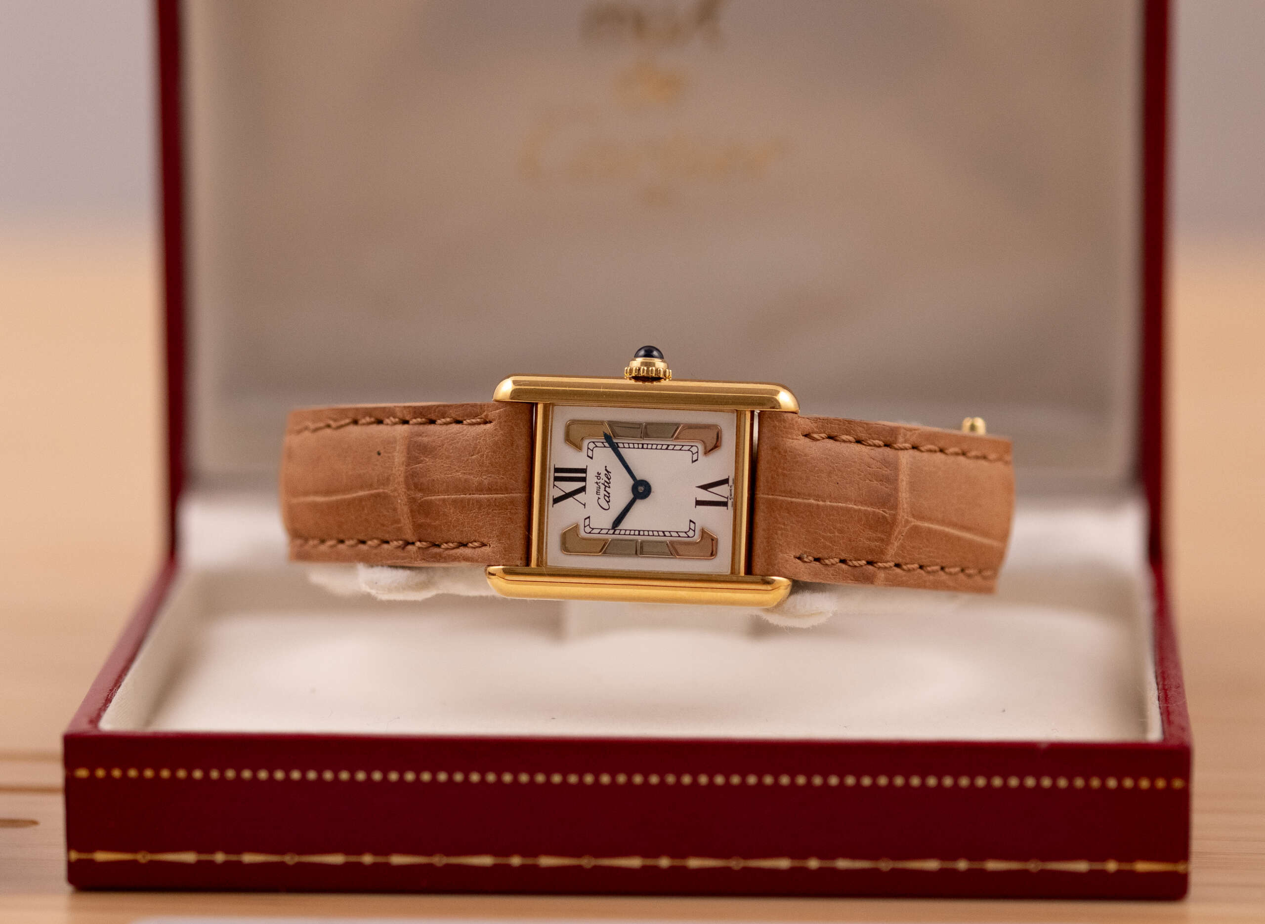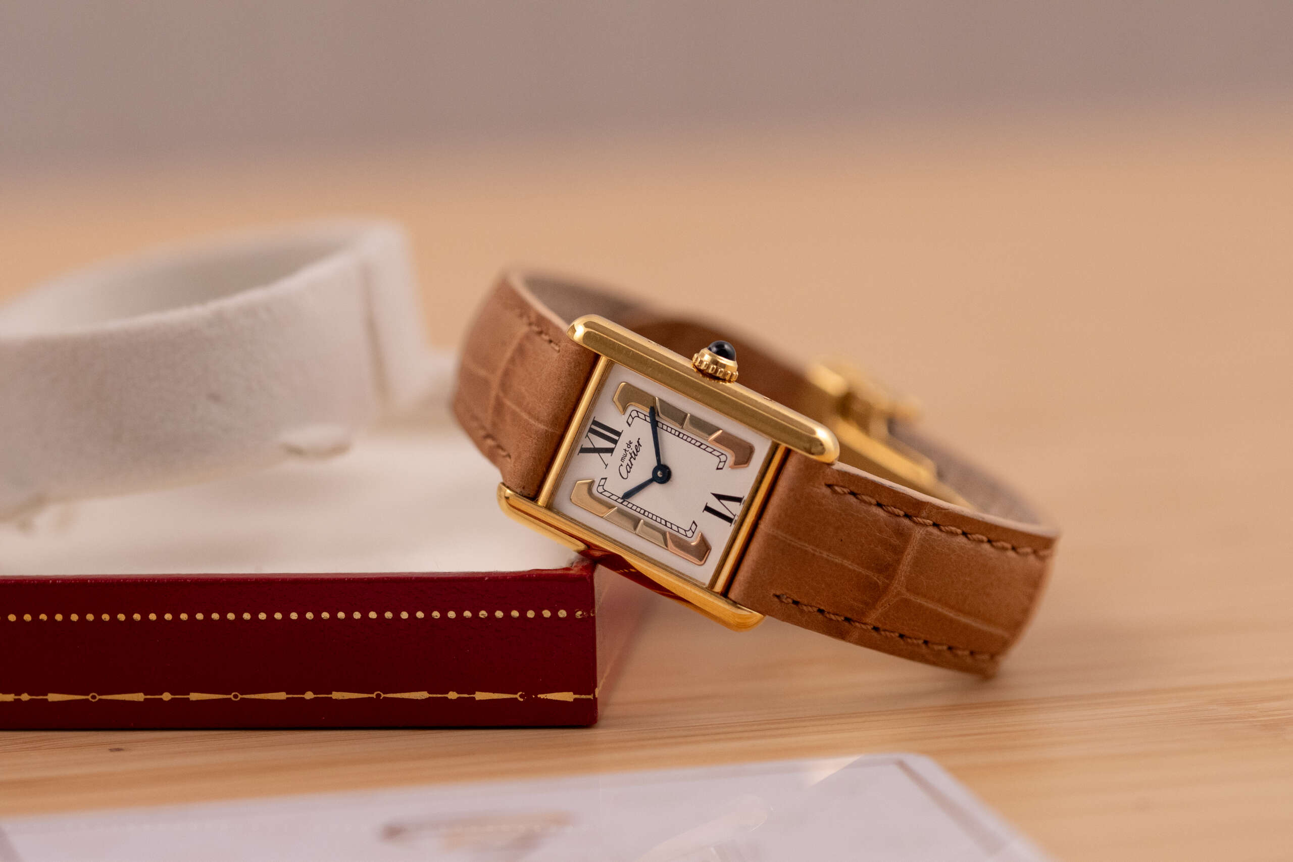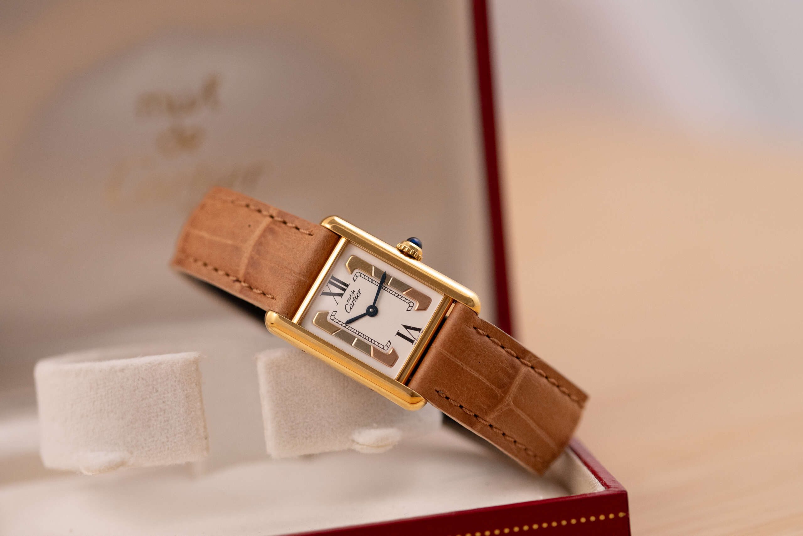 This particular example showcases the distinctive Trinity-style dial with its elegant three-tone design, creating a subtle yet striking visual character that sets it apart from the classic Must Tank variations. The watch is in very good condition and runs flawlessly. It is fitted with a leather strap that complements the warm tones of the vermeil case. Accompanied by its original box and papers, this Must de Cartier Tank represents a charming and collectible vintage timepiece for those who appreciate classic Cartier design.