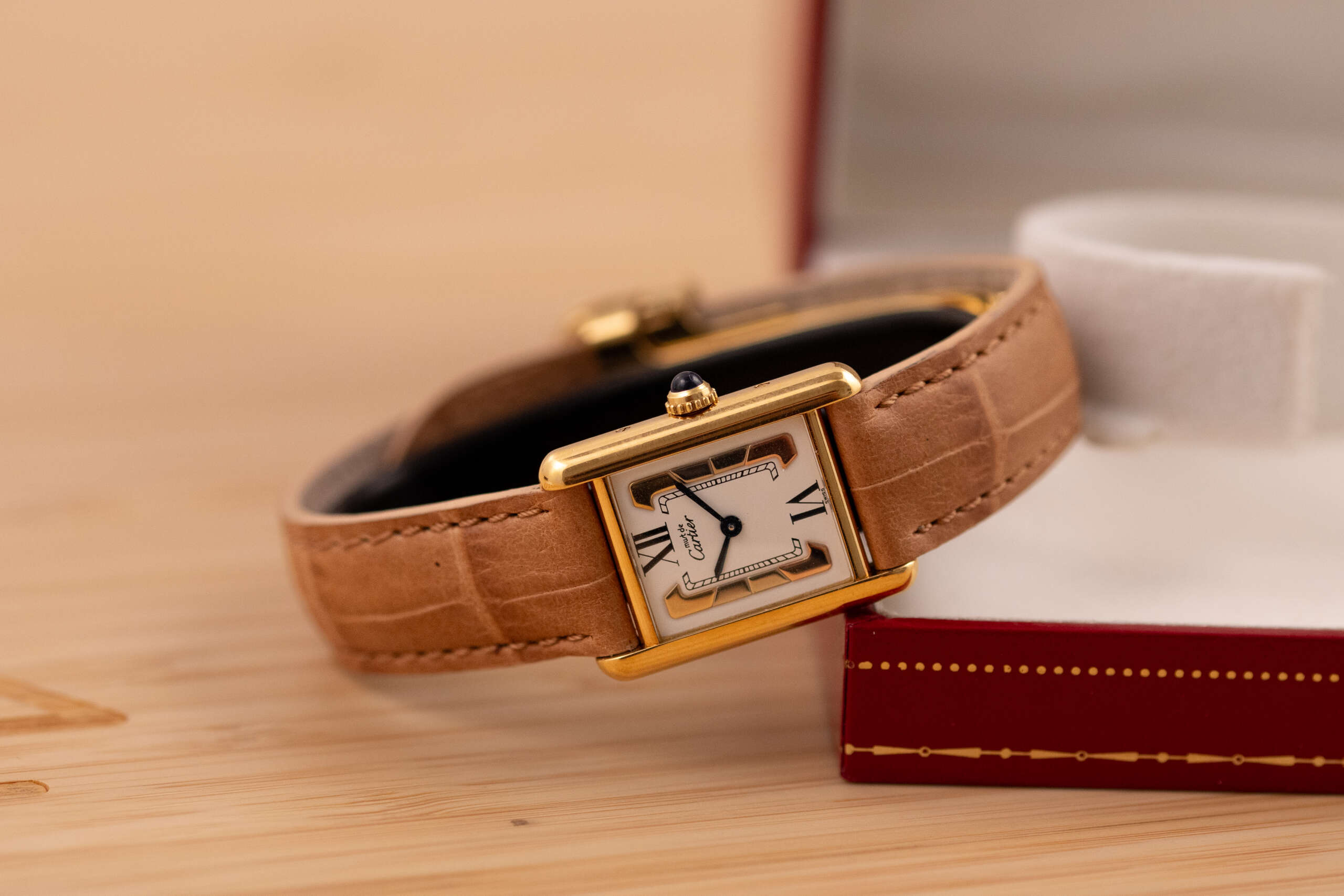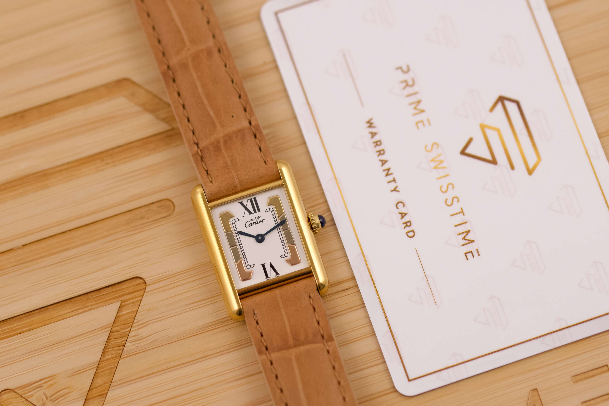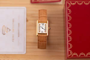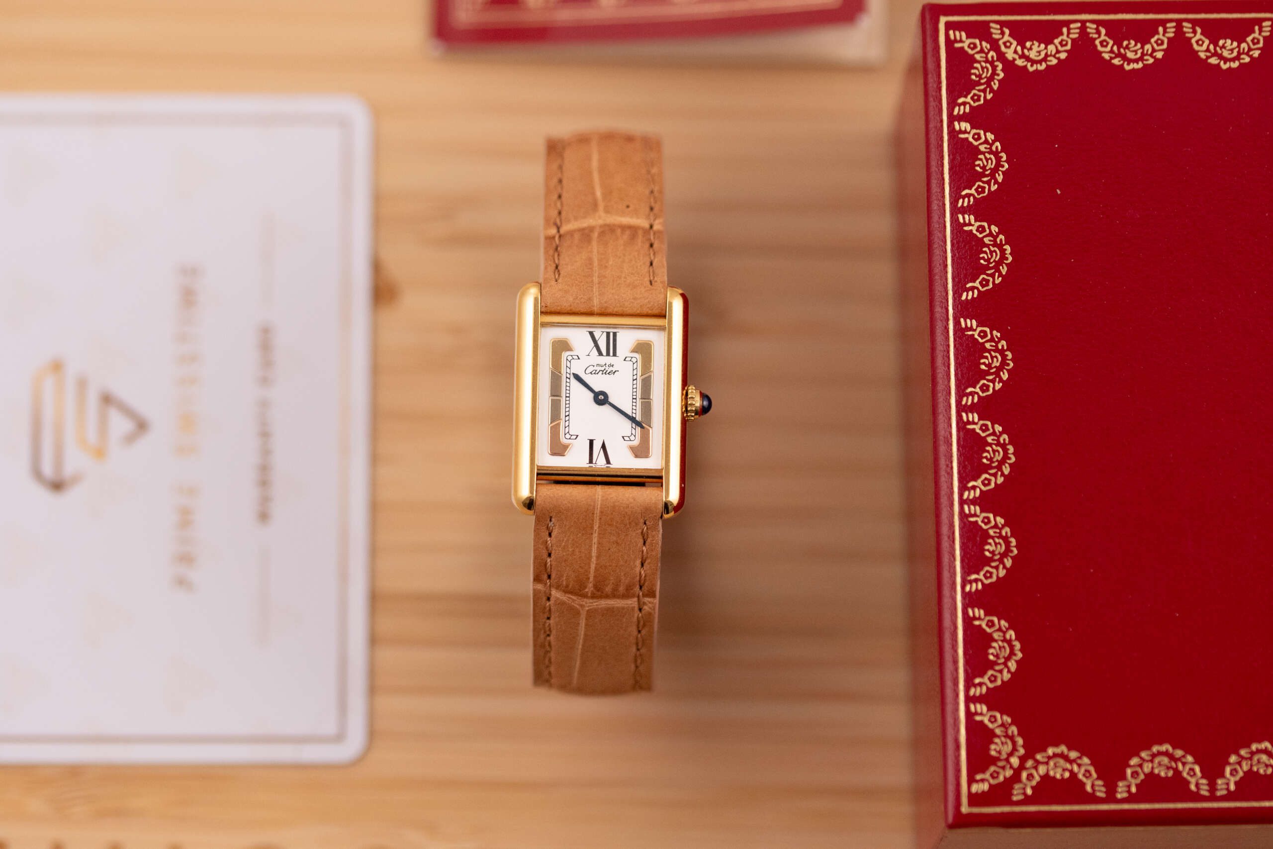 This particular example showcases the distinctive Trinity-style dial with its elegant three-tone design, creating a subtle yet striking visual character that sets it apart from the classic Must Tank variations. The watch is in very good condition and runs flawlessly. It is fitted with a leather strap that complements the warm tones of the vermeil case. Accompanied by its original box and papers, this Must de Cartier Tank represents a charming and collectible vintage timepiece for those who appreciate classic Cartier design.