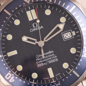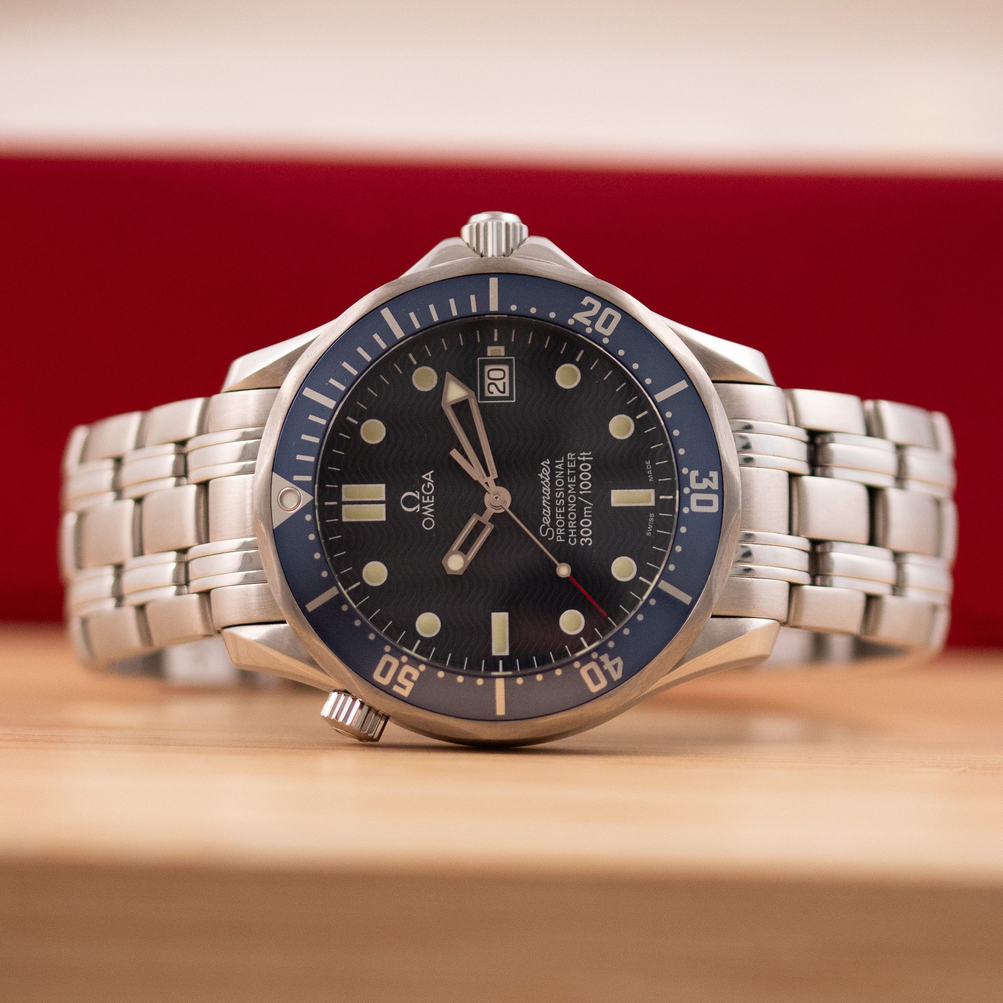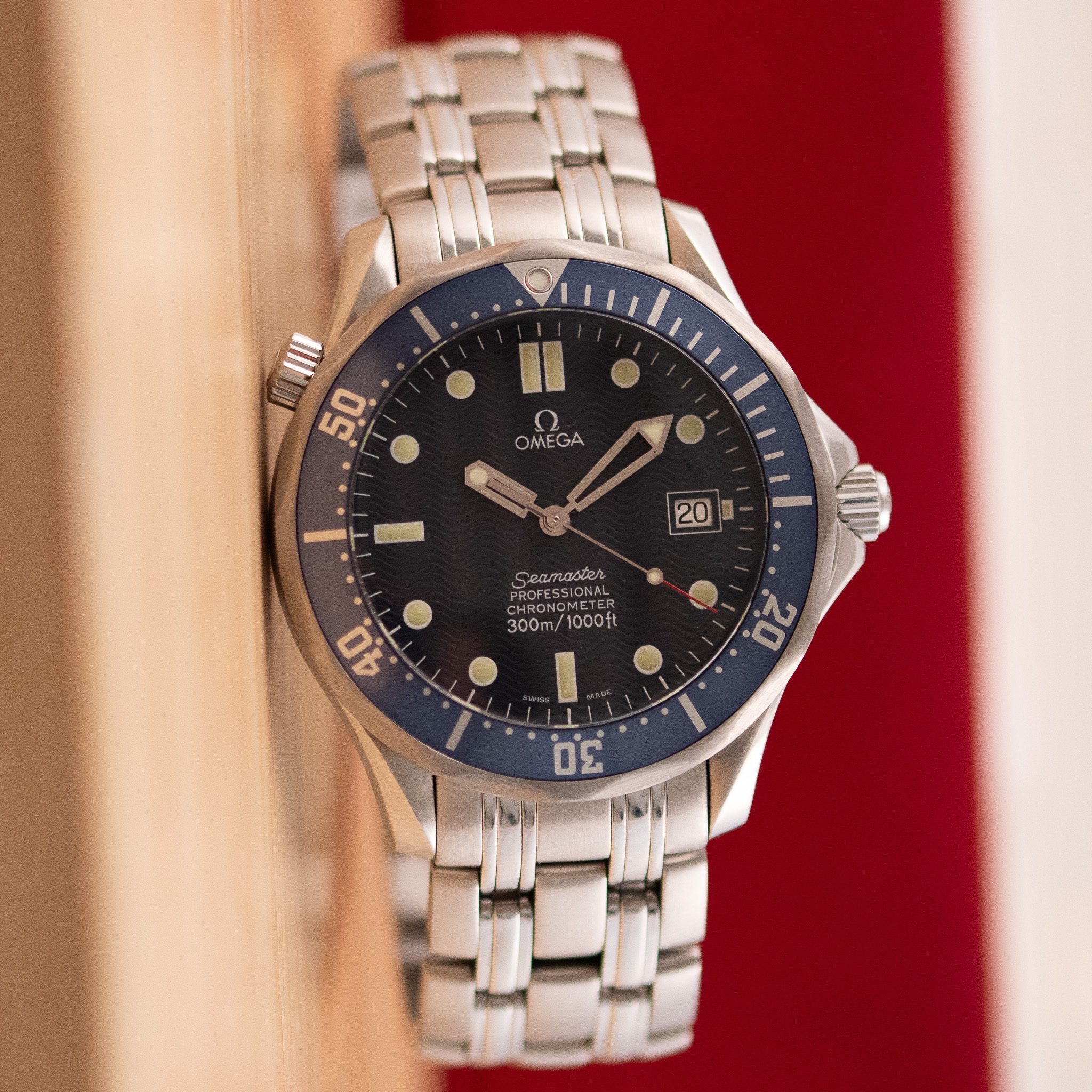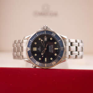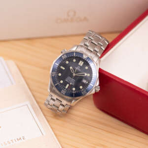 The Omega Seamaster Diver 300M 2531.80, crafted in stainless steel, features a 41mm case and a distinctive blue wave-pattern dial, embodying the iconic design made famous by its association with the James Bond franchise. With its robust construction and professional dive specifications, it represents a perfect blend of sportiness and everyday versatility.