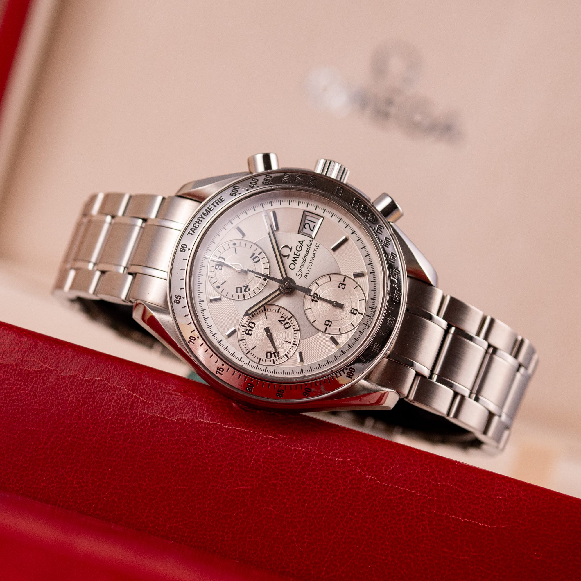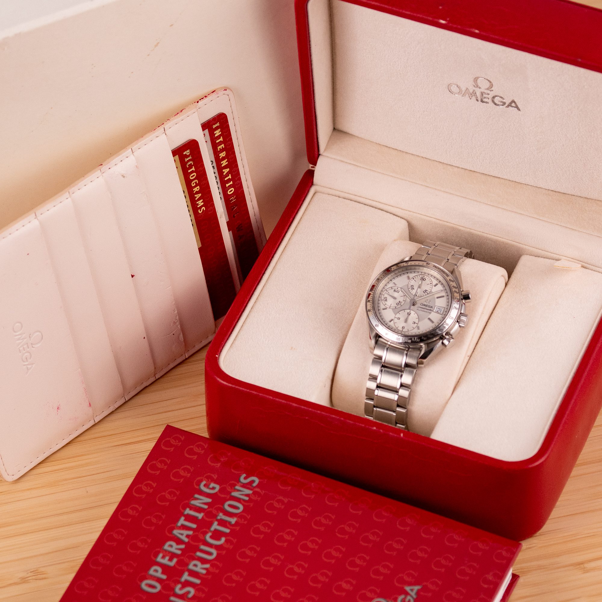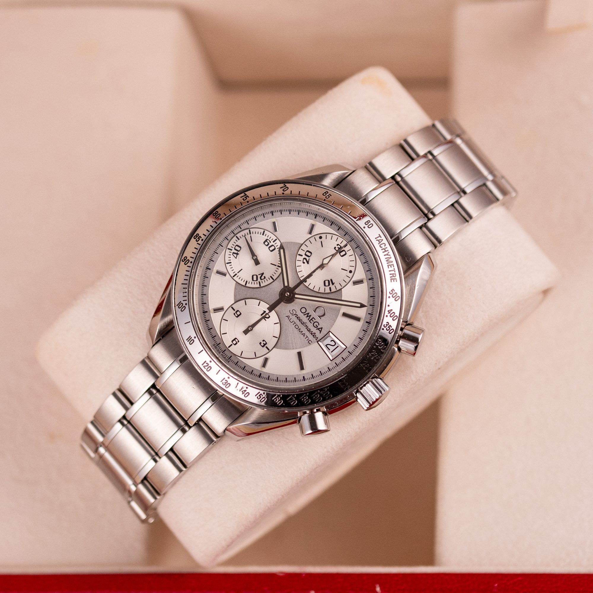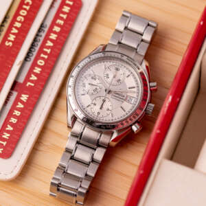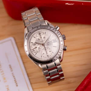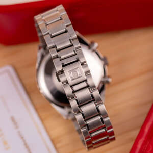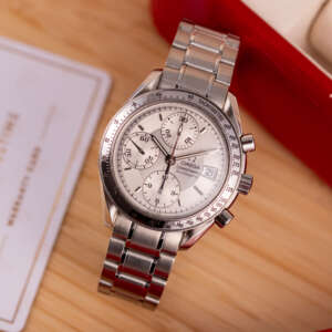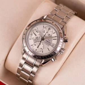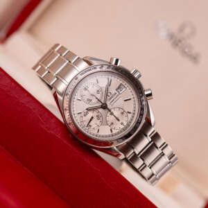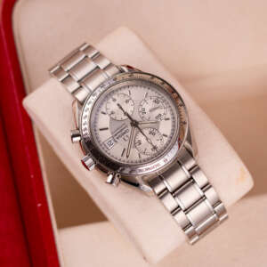Dating from approximately 2002, this example is in very good condition, with a recently serviced automatic chronograph movement ensuring reliable performance and precision. The stainless steel bracelet, sized for wrists up to 18 cm, exhibits minimal wear and retains its structural integrity. Presented as a full set with its original Omega box and papers, this Speedmaster Date is a superb choice for collectors or those seeking a versatile, historically inspired timepiece.