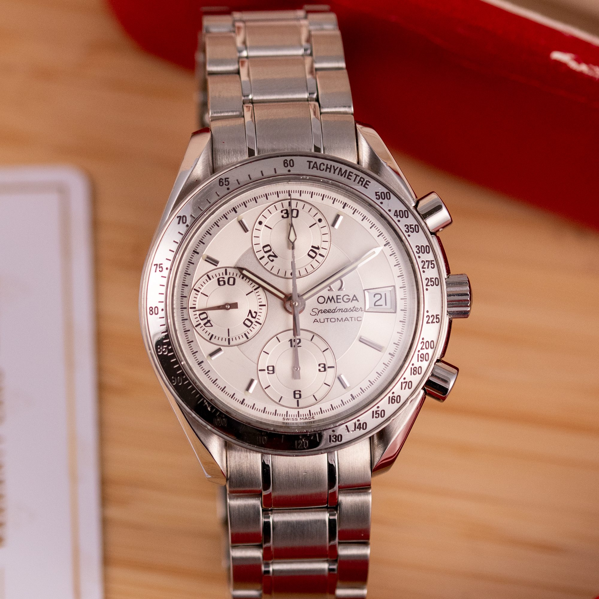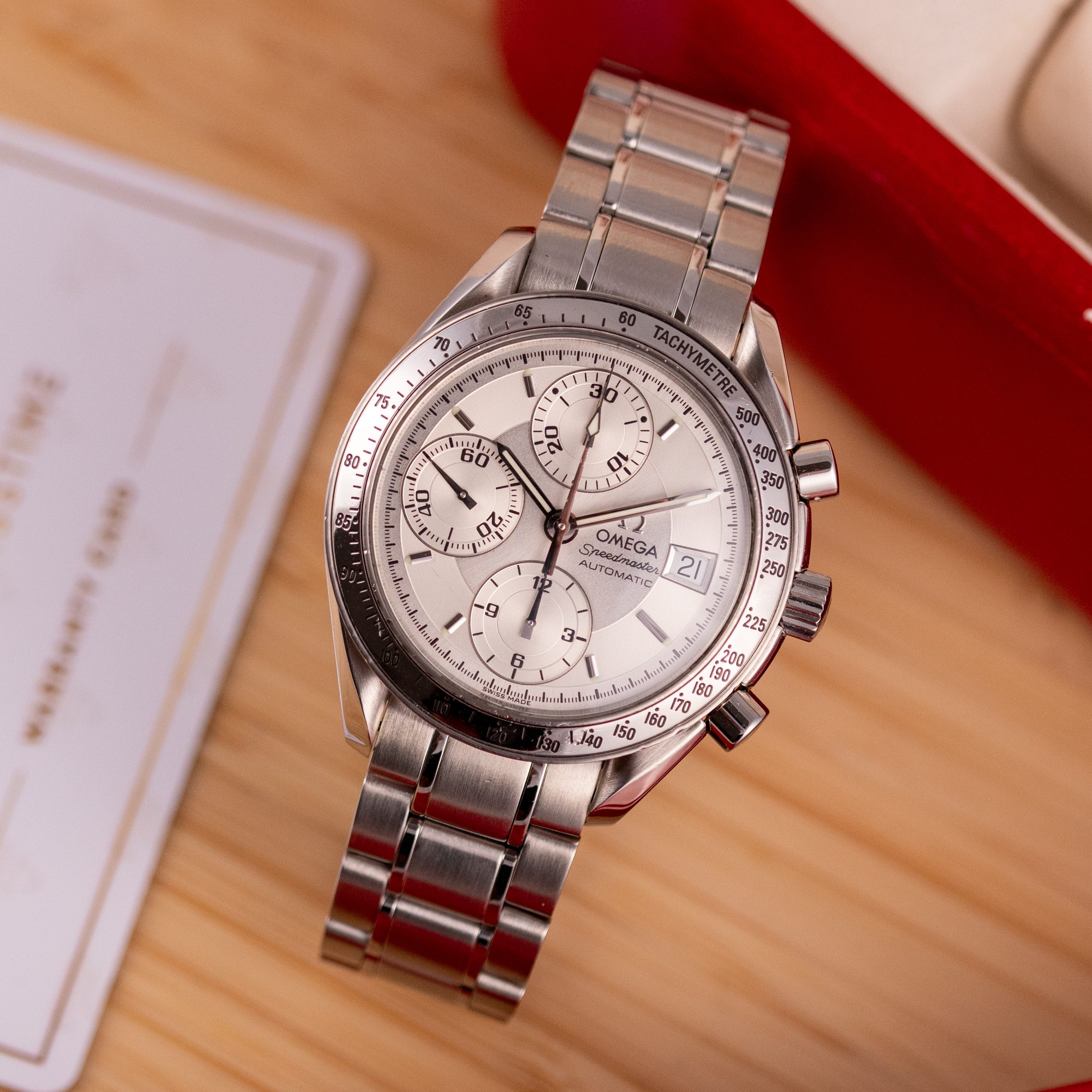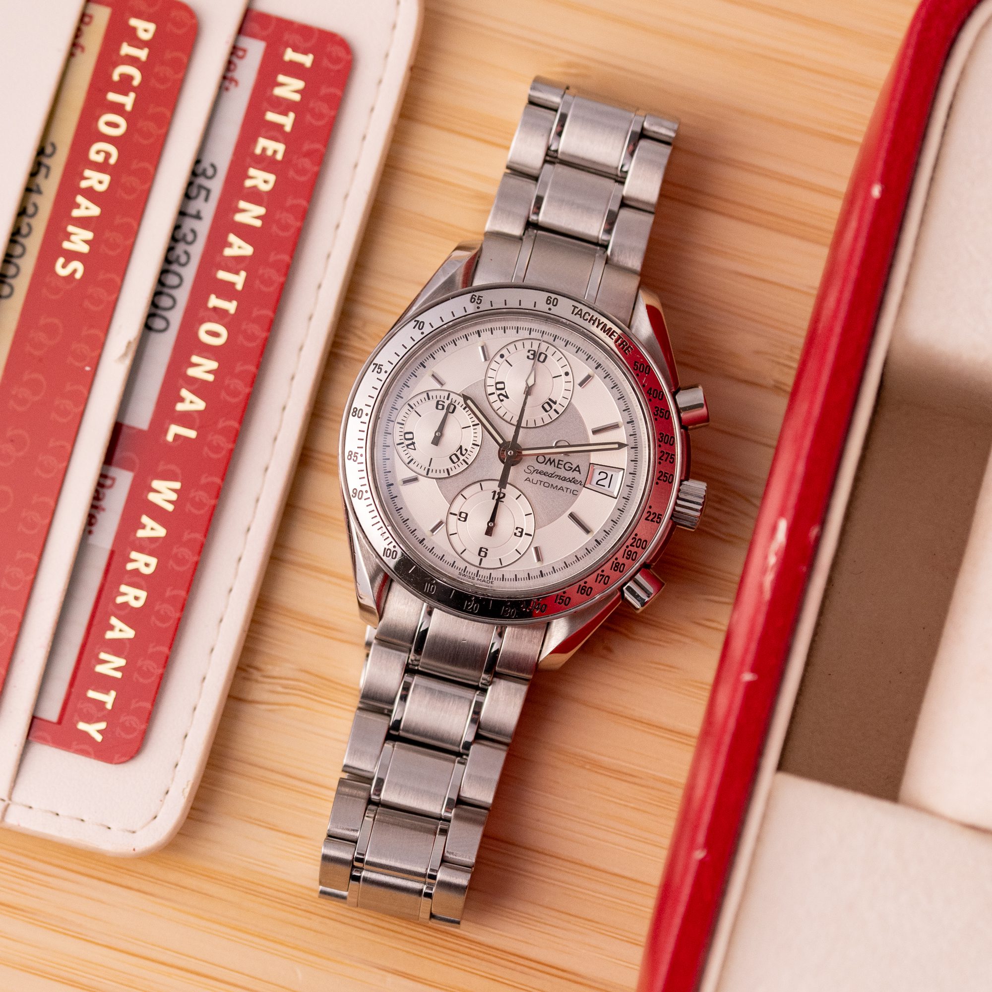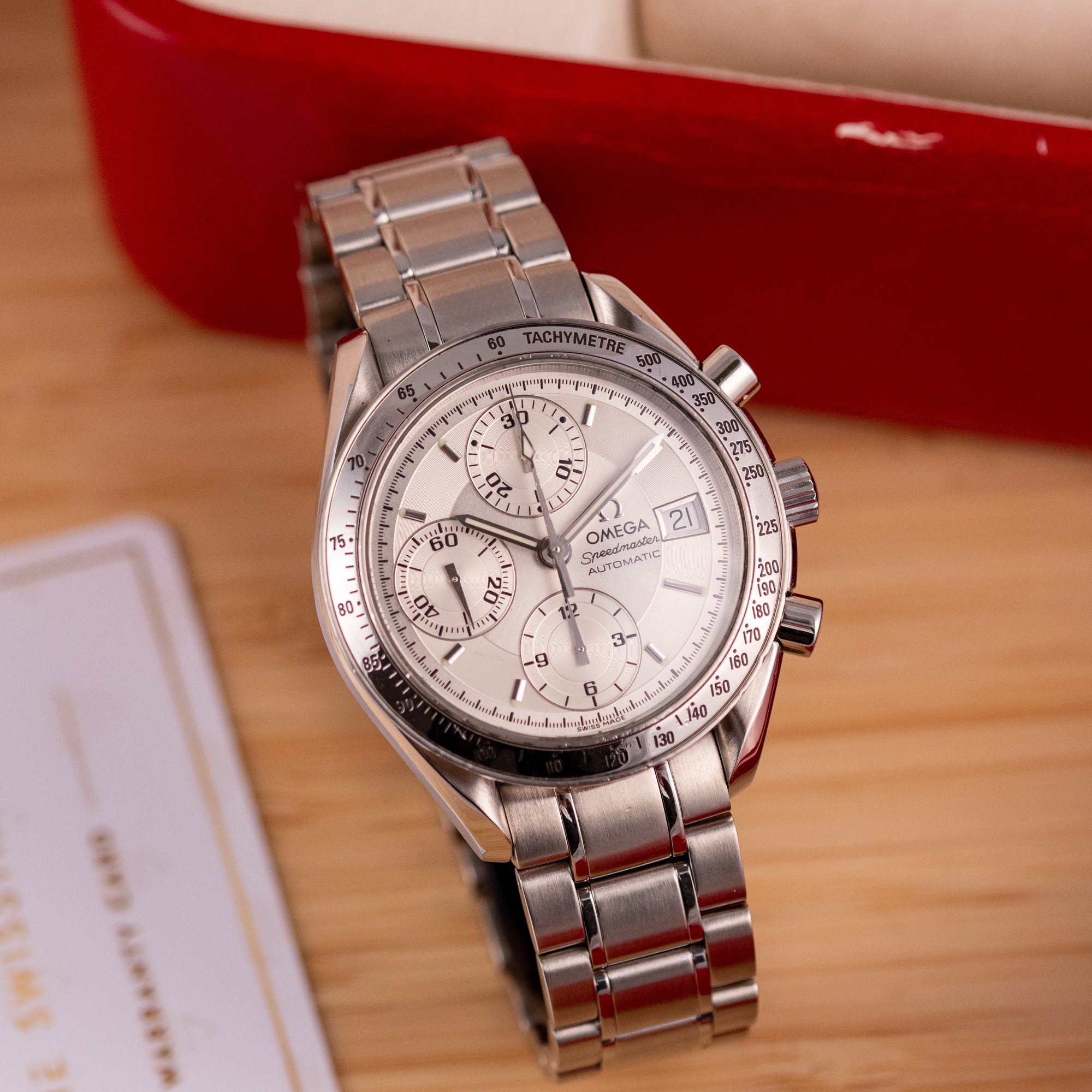 Dating from approximately 2002, this example is in very good condition, with a recently serviced automatic chronograph movement ensuring reliable performance and precision. The stainless steel bracelet, sized for wrists up to 18 cm, exhibits minimal wear and retains its structural integrity. Presented as a full set with its original Omega box and papers, this Speedmaster Date is a superb choice for collectors or those seeking a versatile, historically inspired timepiece.