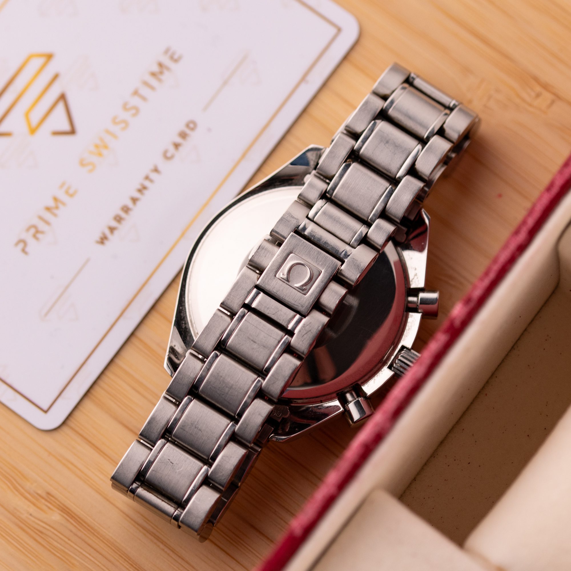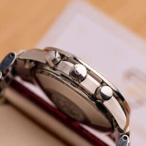 This particular piece, from the 1990s, features a striking blue dial that adds character to the watch. The timepiece is in good, pre-owned condition, has been freshly serviced, and comes with the original box, making it a solid choice for enthusiasts of classic chronographs.