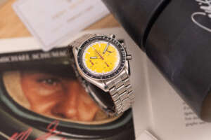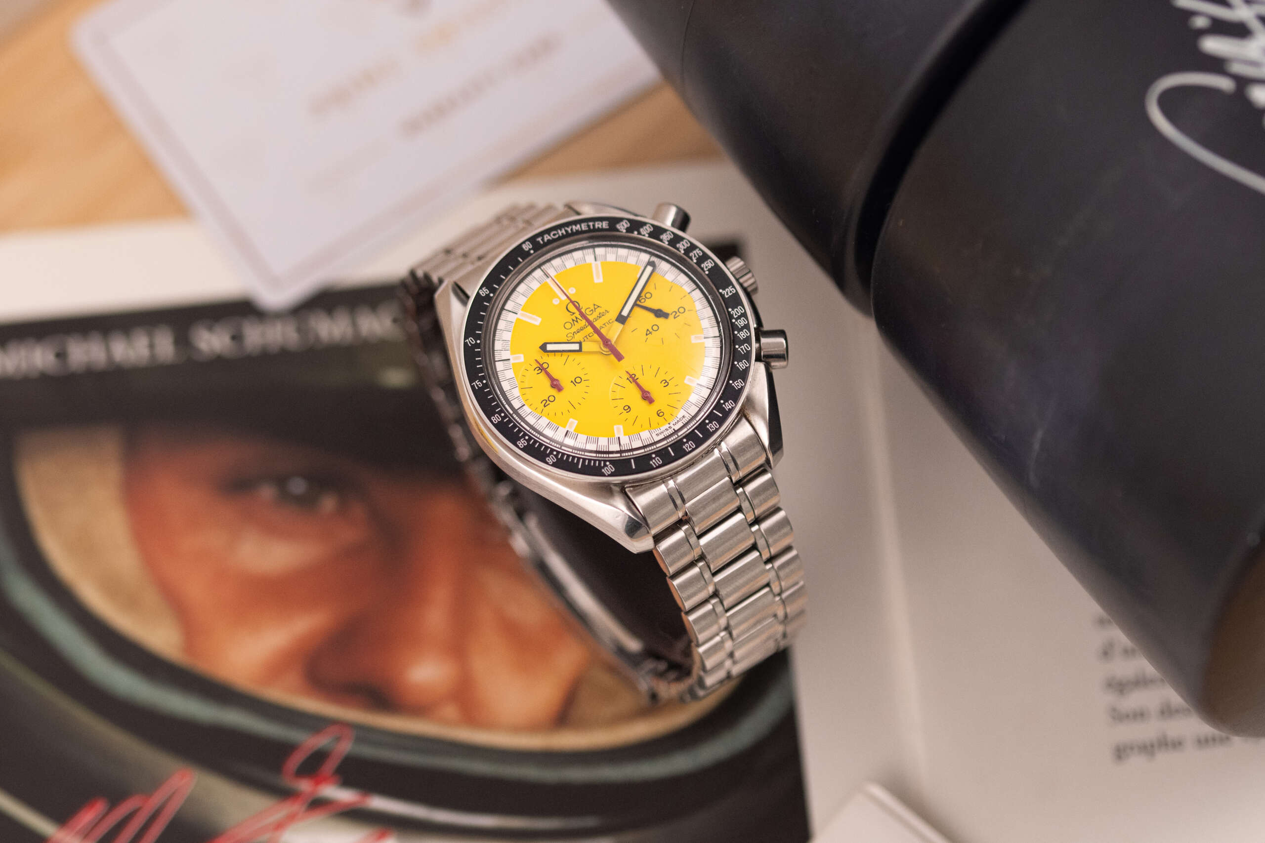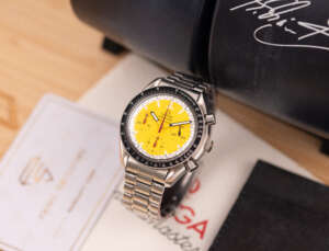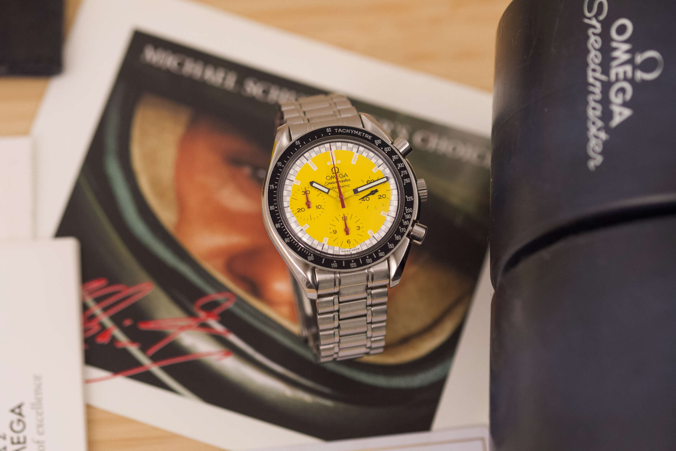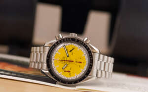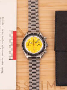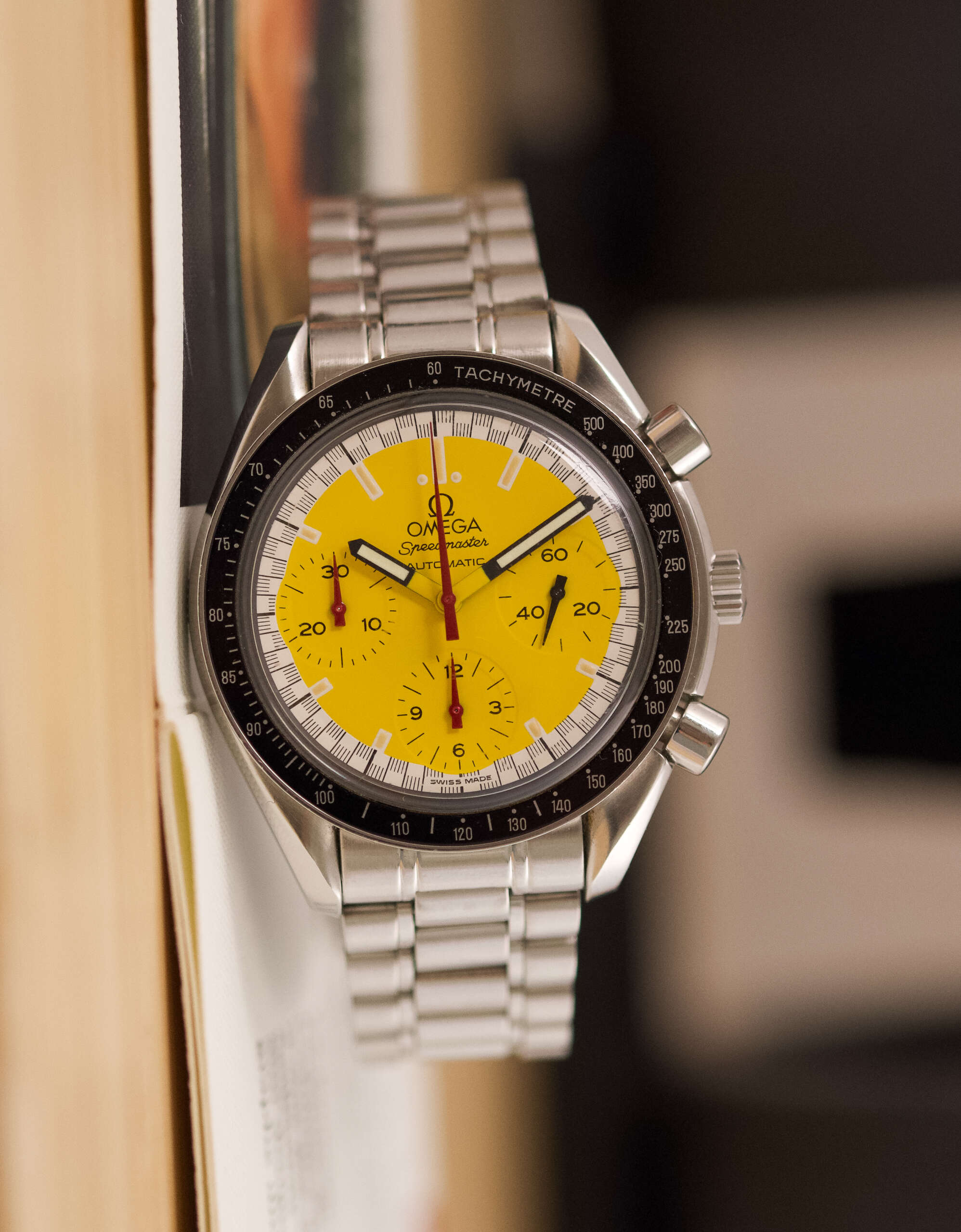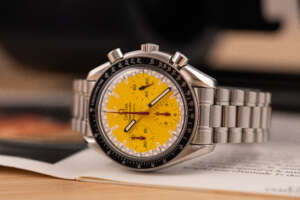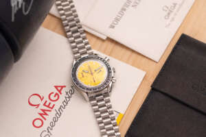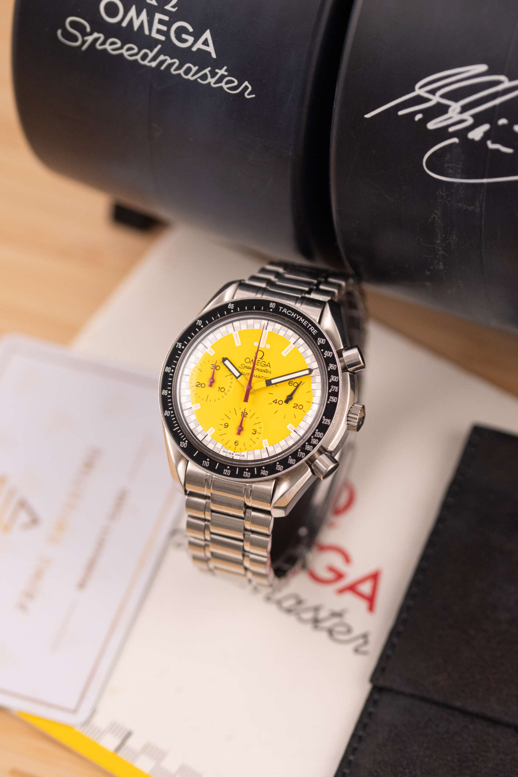 The Omega Speedmaster Reduced “Michael Schumacher” is a compact and automatic chronograph that combines the legendary Speedmaster design with a sporty, racing-inspired aesthetic. Its vibrant yellow dial, tachymeter bezel, and precise automatic movement make it a standout piece for collectors and enthusiasts alike.