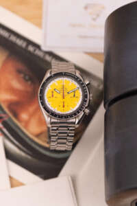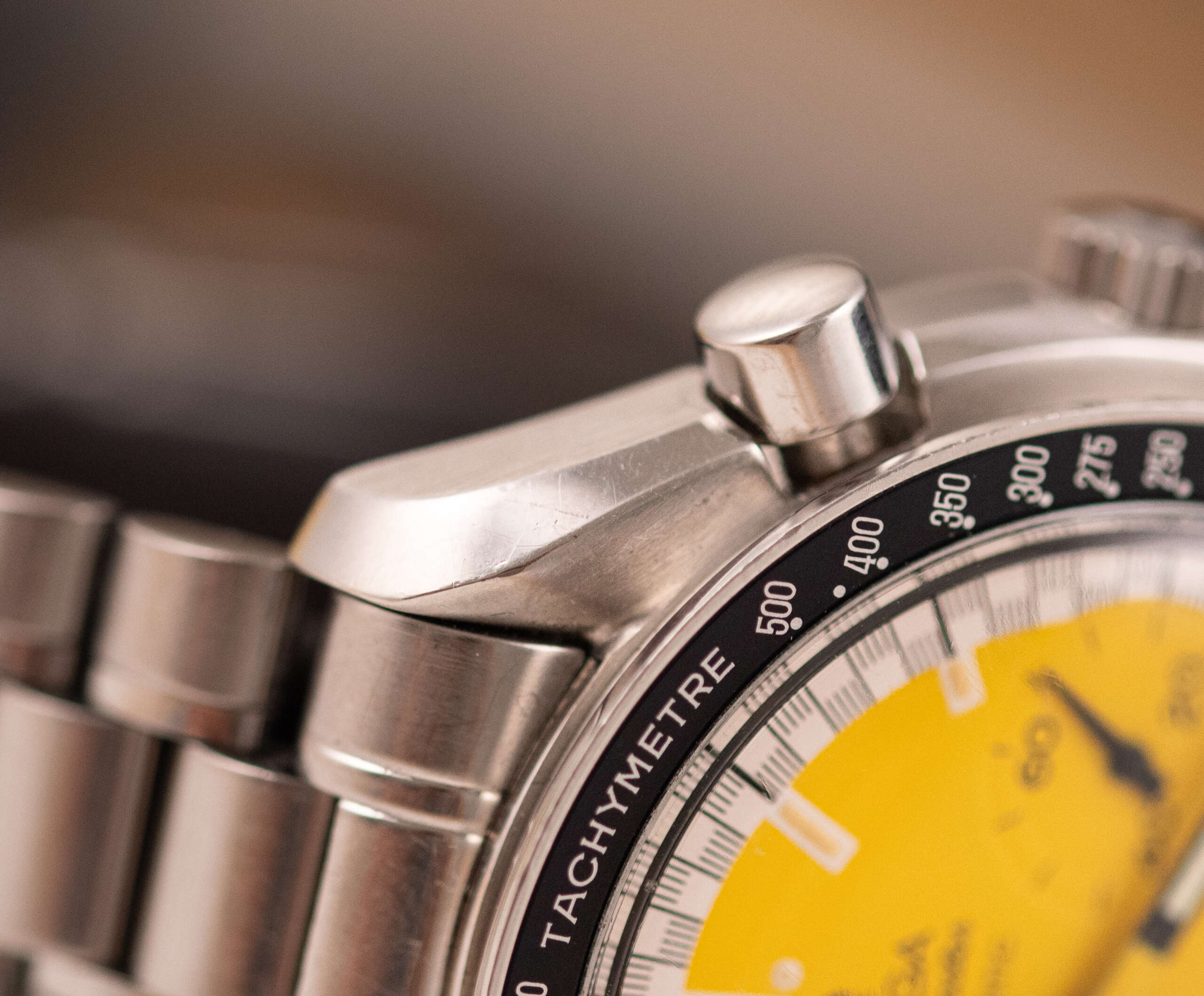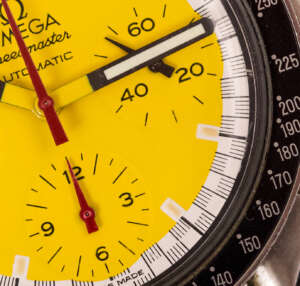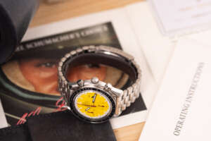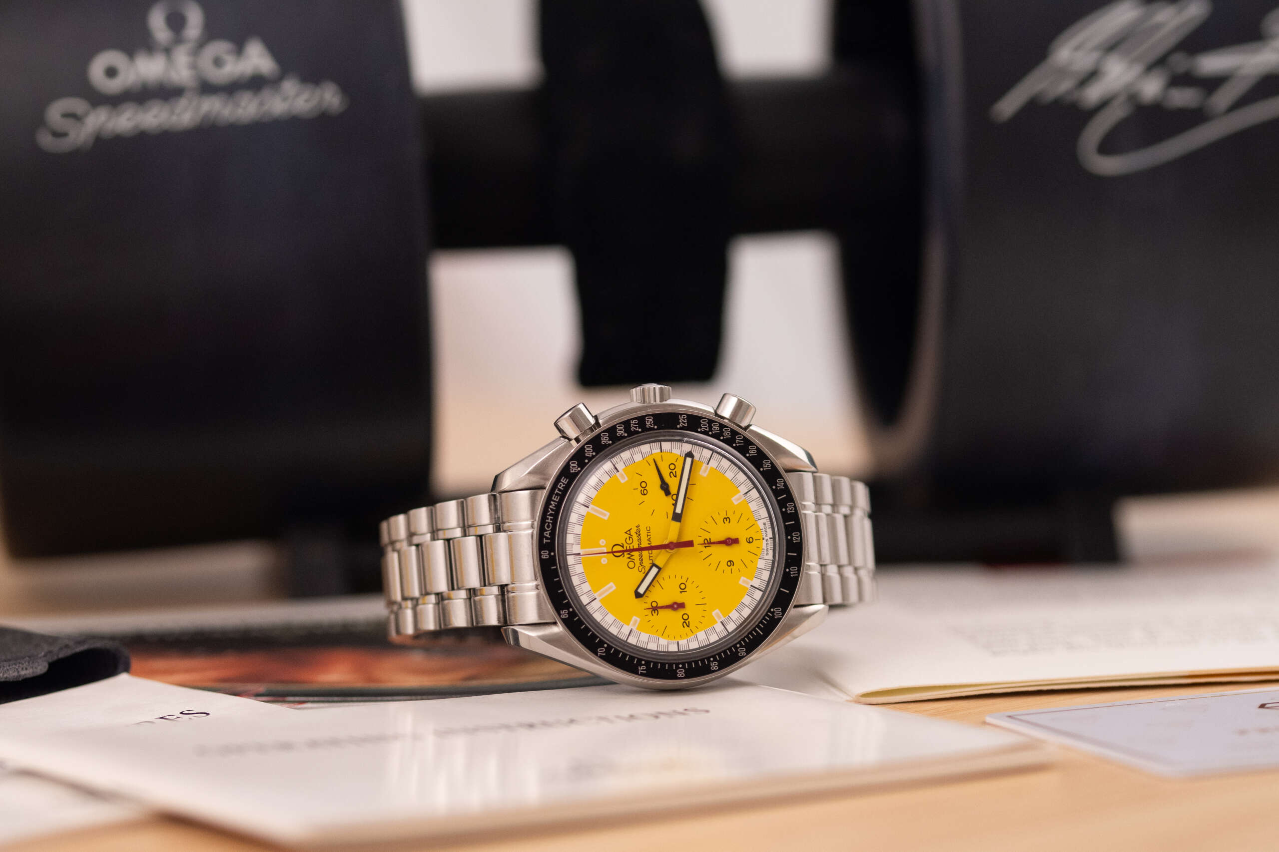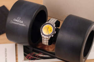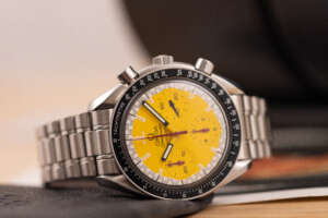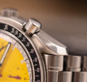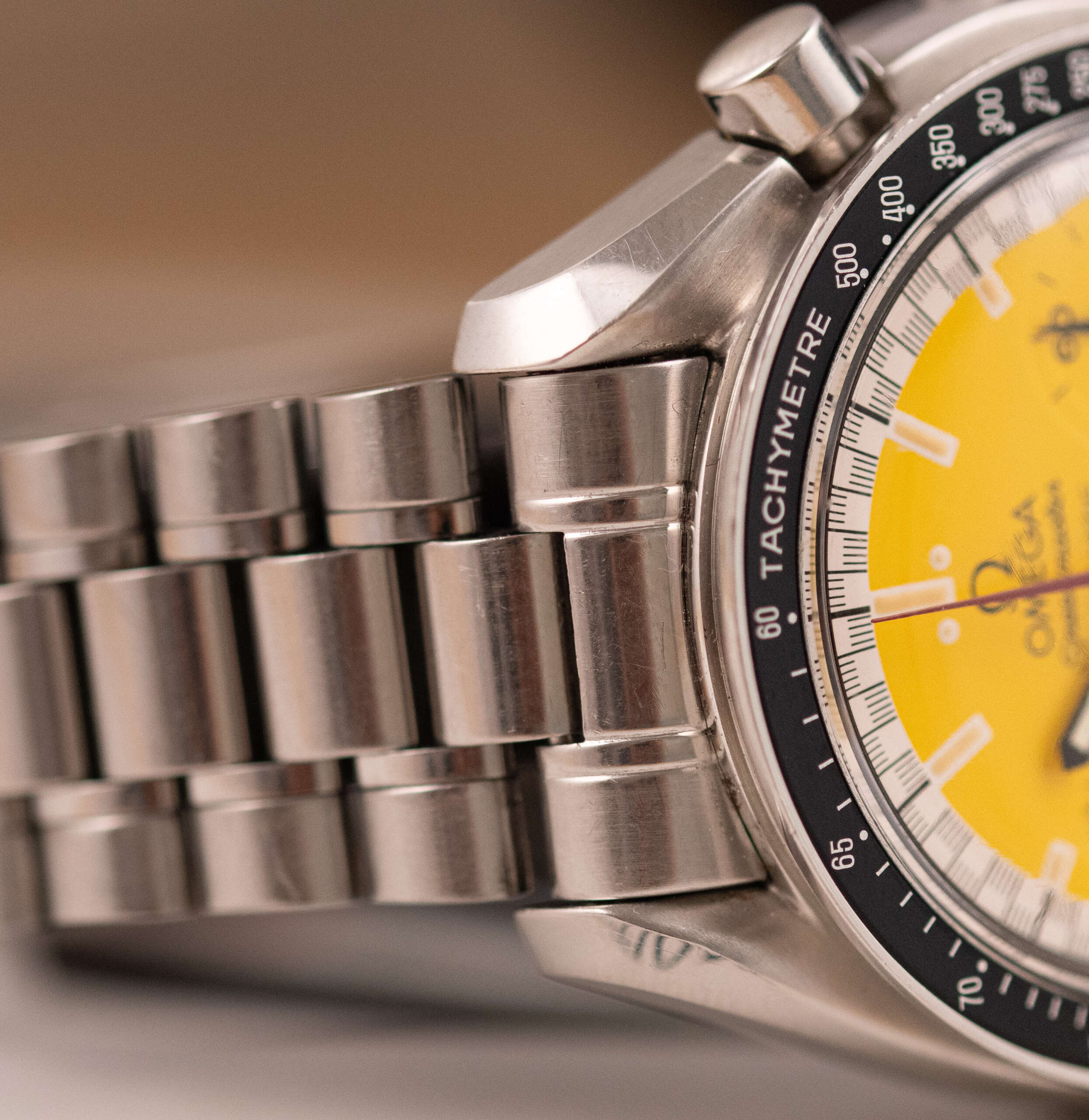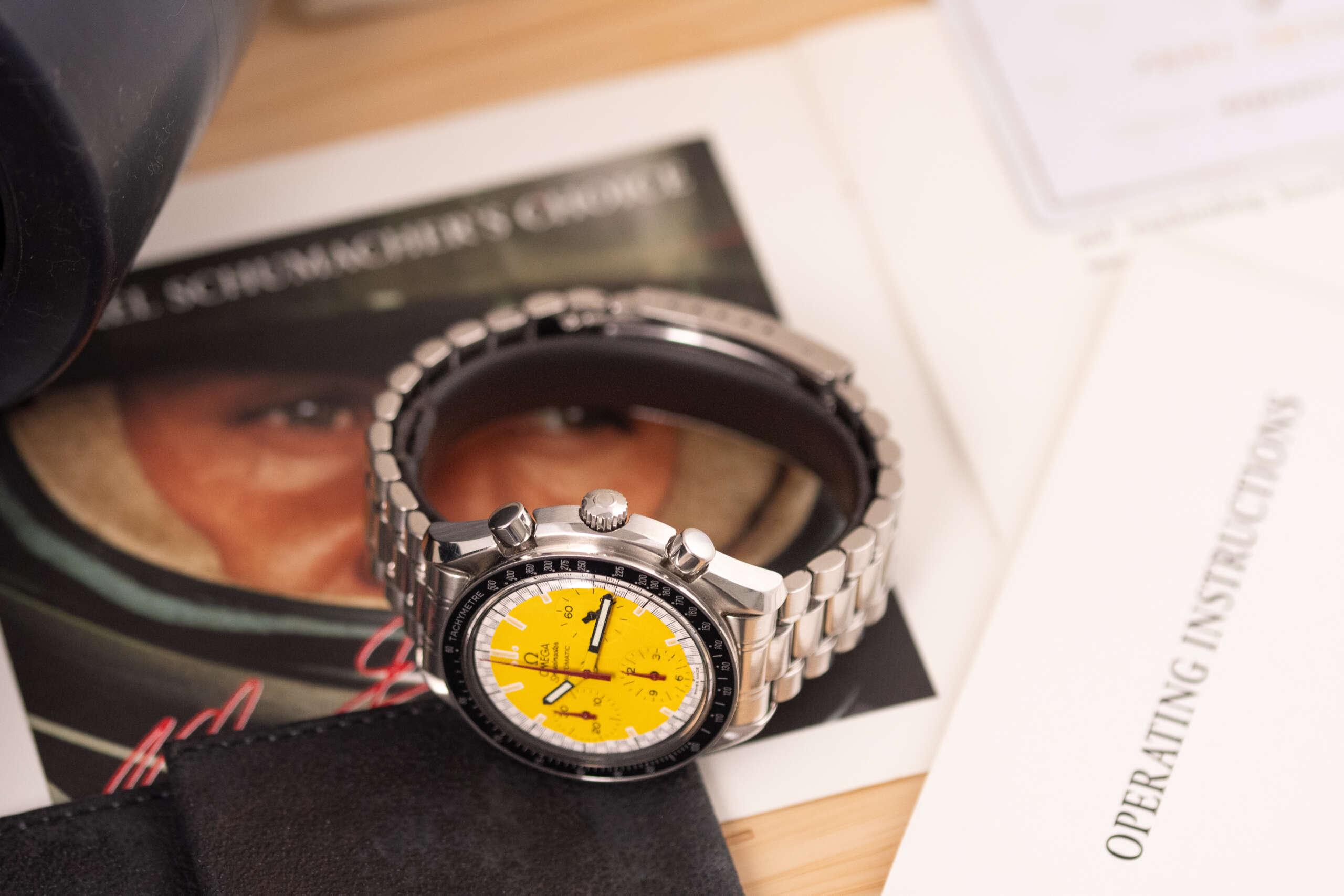 The Omega Speedmaster Reduced “Michael Schumacher” is a compact and automatic chronograph that combines the legendary Speedmaster design with a sporty, racing-inspired aesthetic. Its vibrant yellow dial, tachymeter bezel, and precise automatic movement make it a standout piece for collectors and enthusiasts alike.
