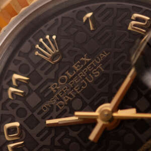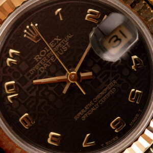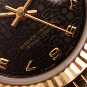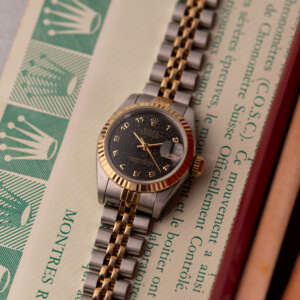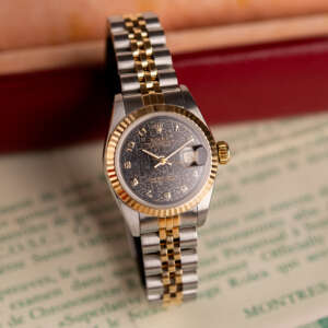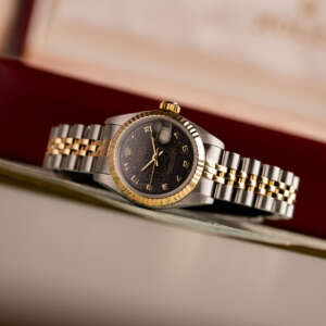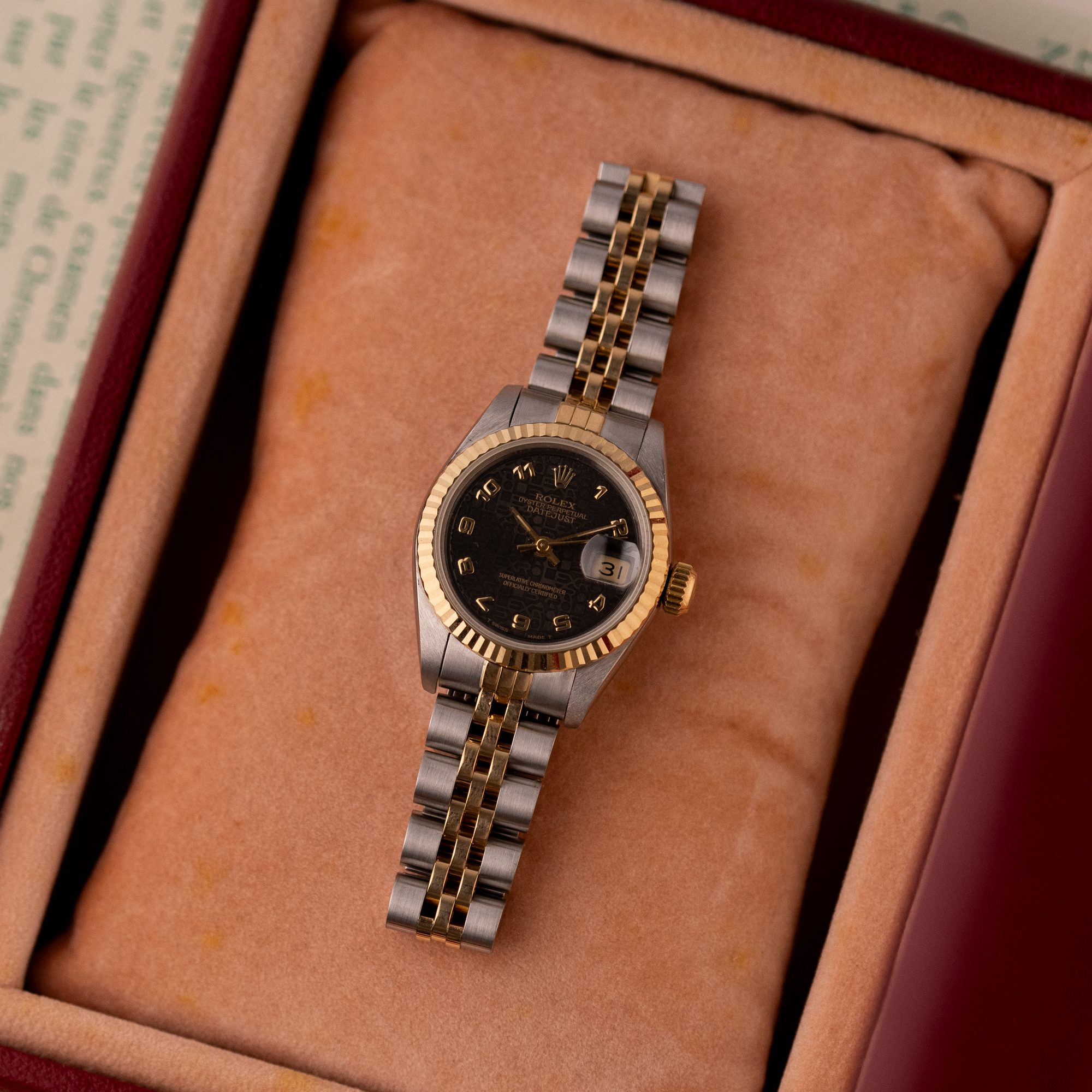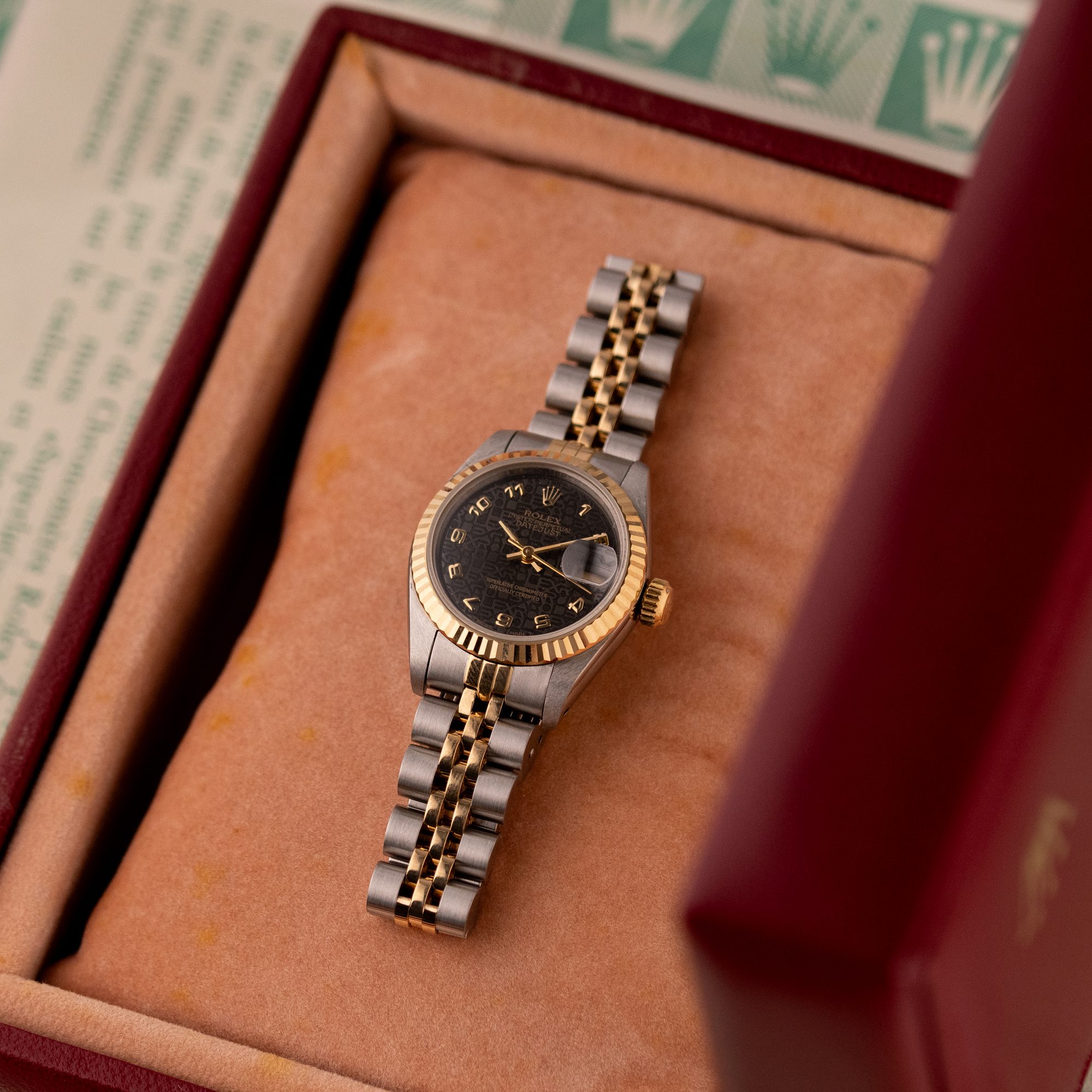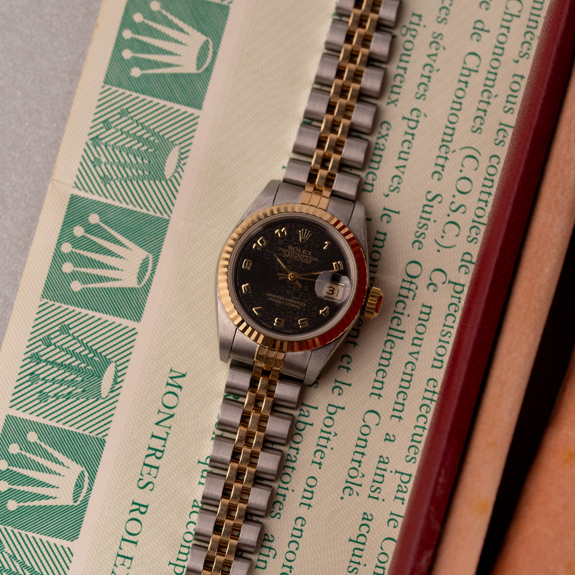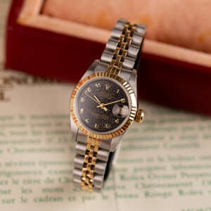 This example, originally sold in 1991, showcases a Black Jubilee dial with a distinctive textured pattern, offering a refined and unique aesthetic. The watch remains in very good condition, with a fully functional automatic movement and a stretch-free Jubilee bracelet sized for wrists up to 16 cm. Accompanied by its original Rolex box and papers, this complete set represents a well-preserved vintage piece suitable for collectors or daily wear.