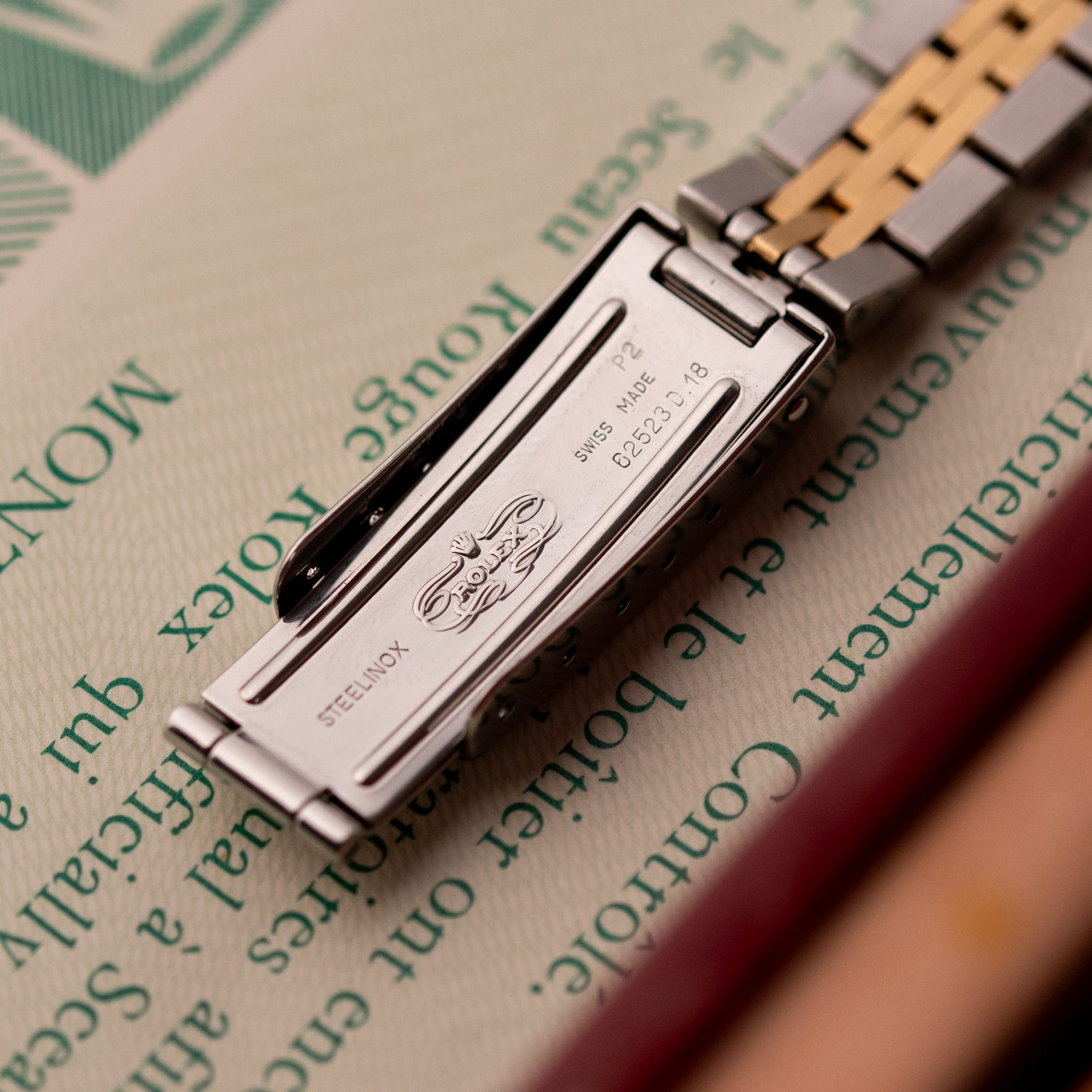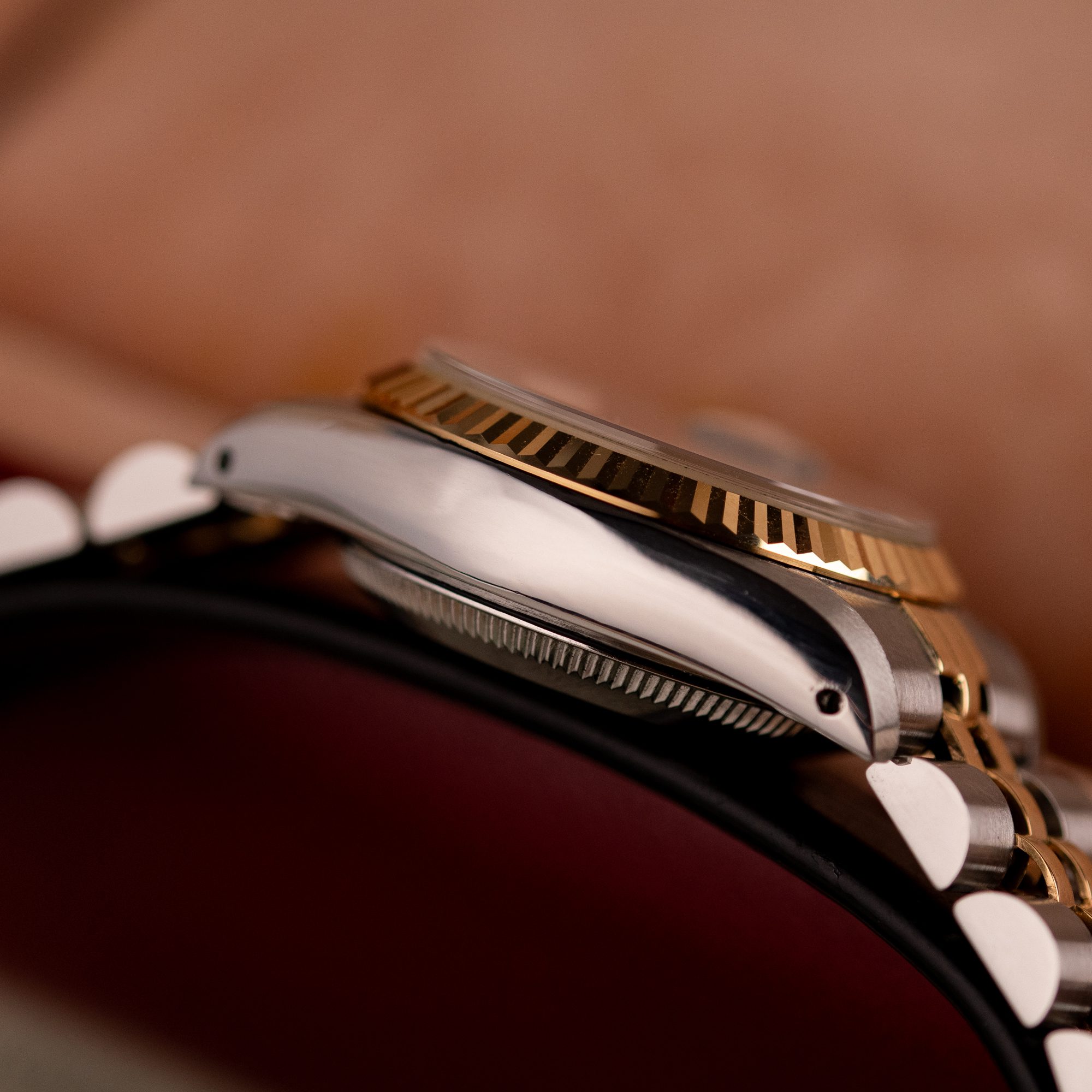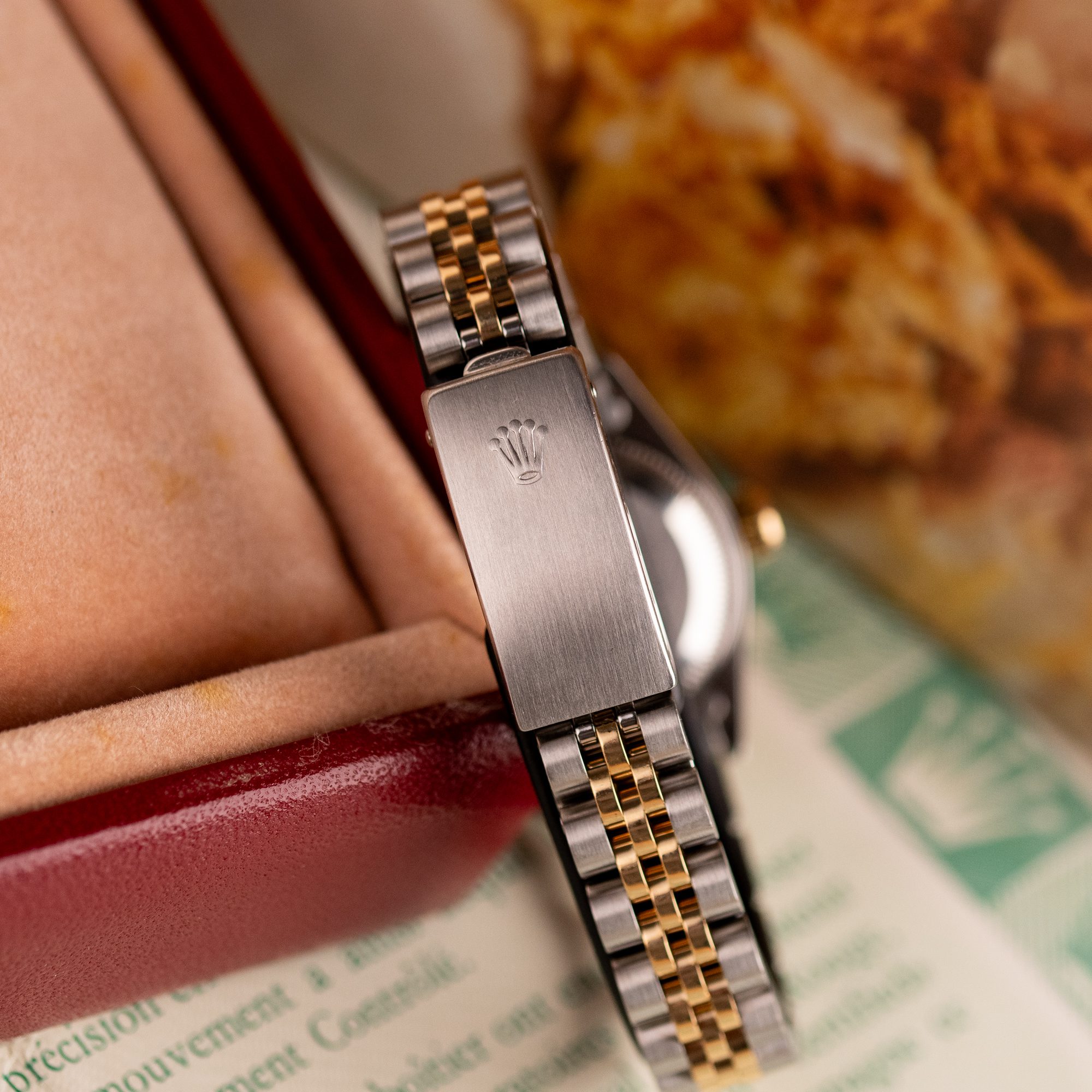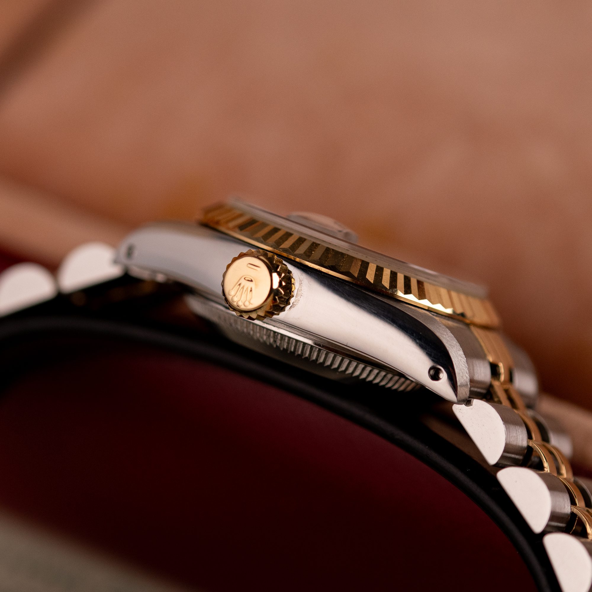 The Rolex Datejust 26, ref. 69173, combines stainless steel and yellow gold in a two-tone construction, featuring a fluted bezel and a compact 26mm case that balances classic proportions with versatile wearability for any occasion.