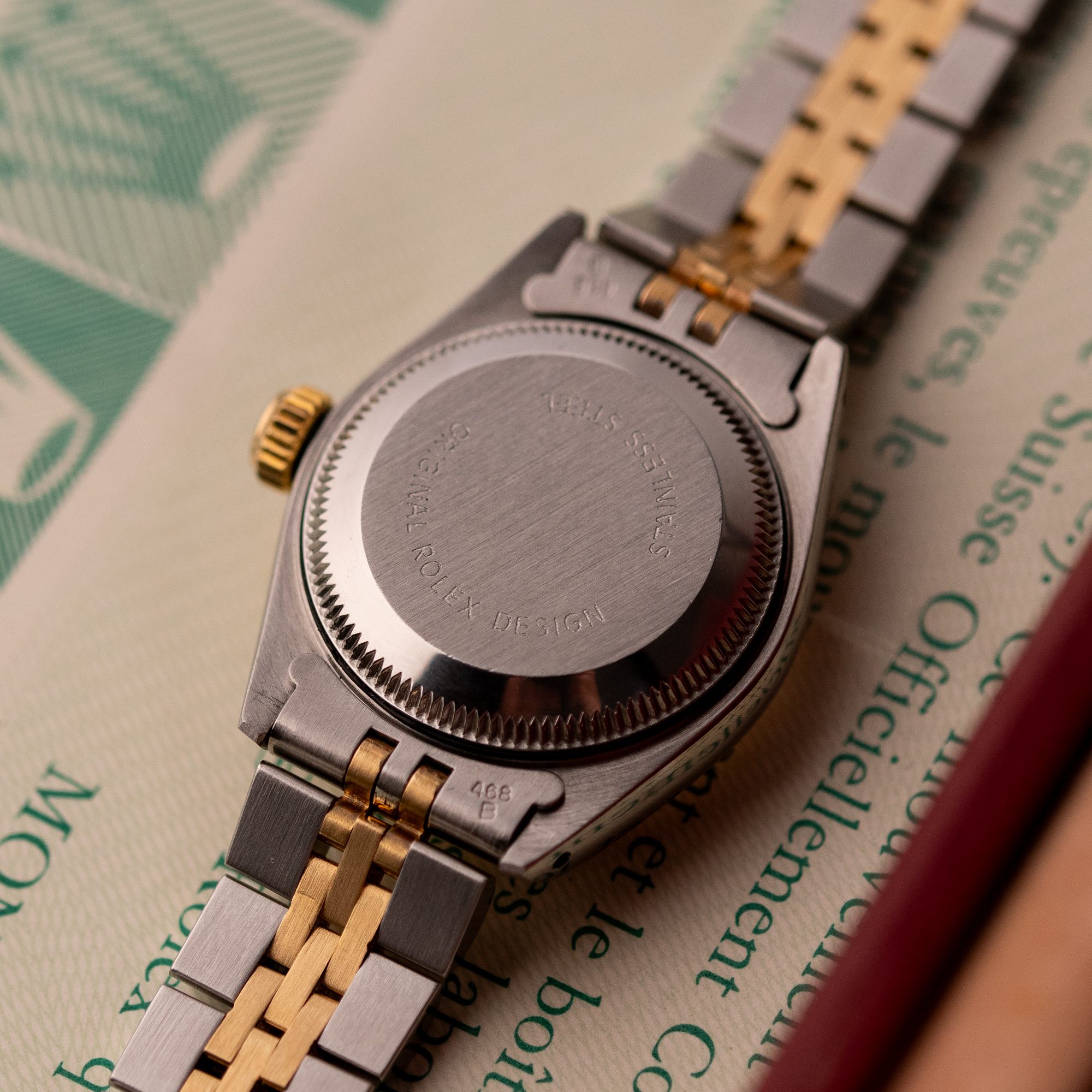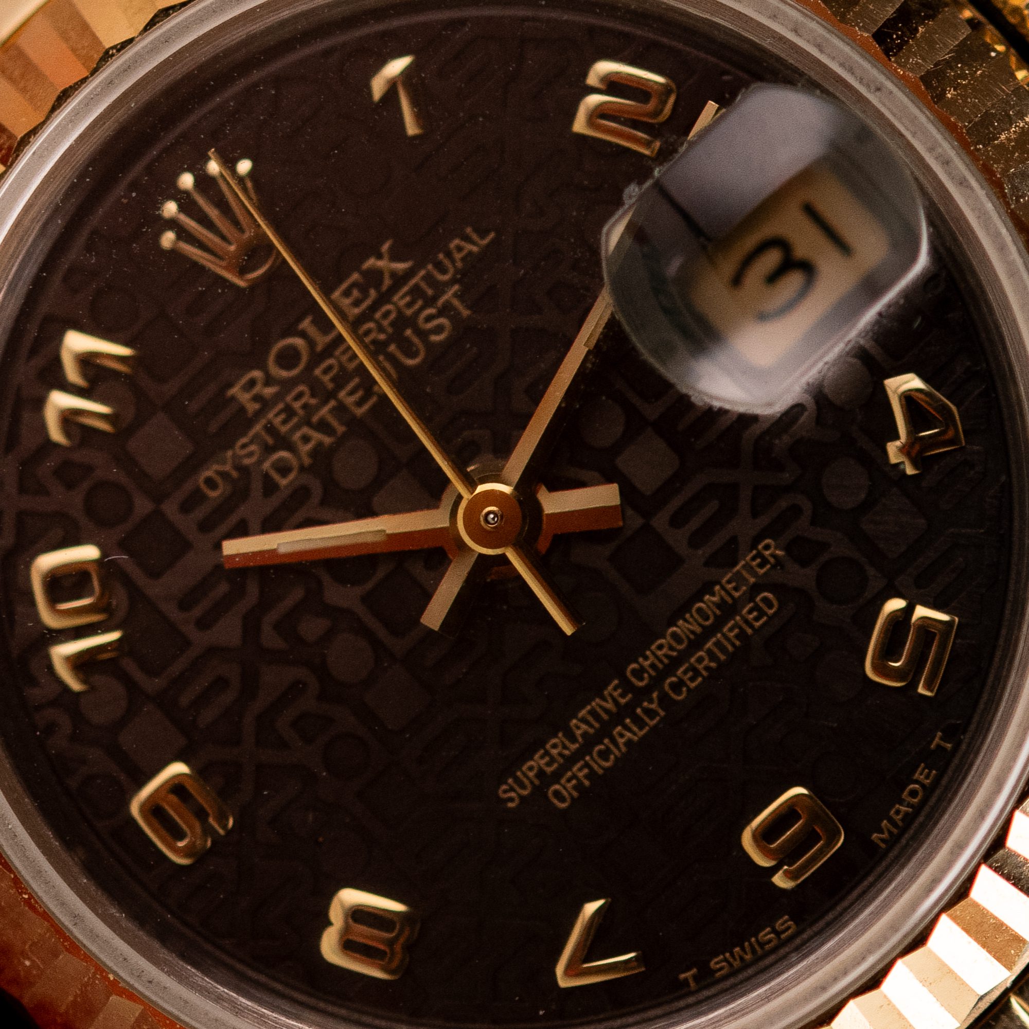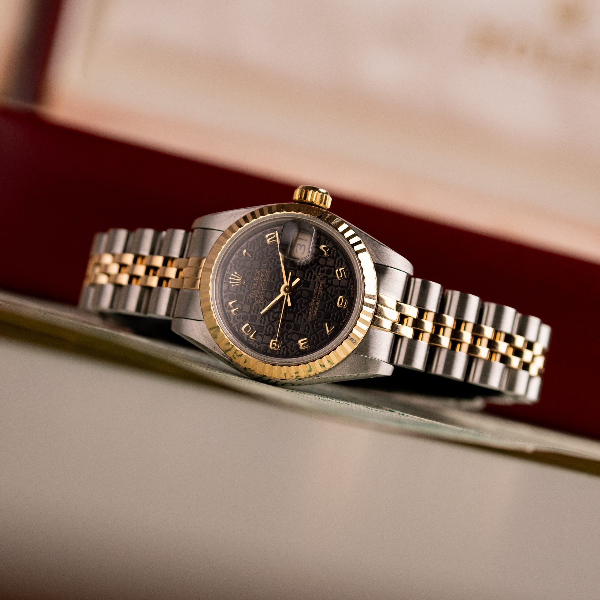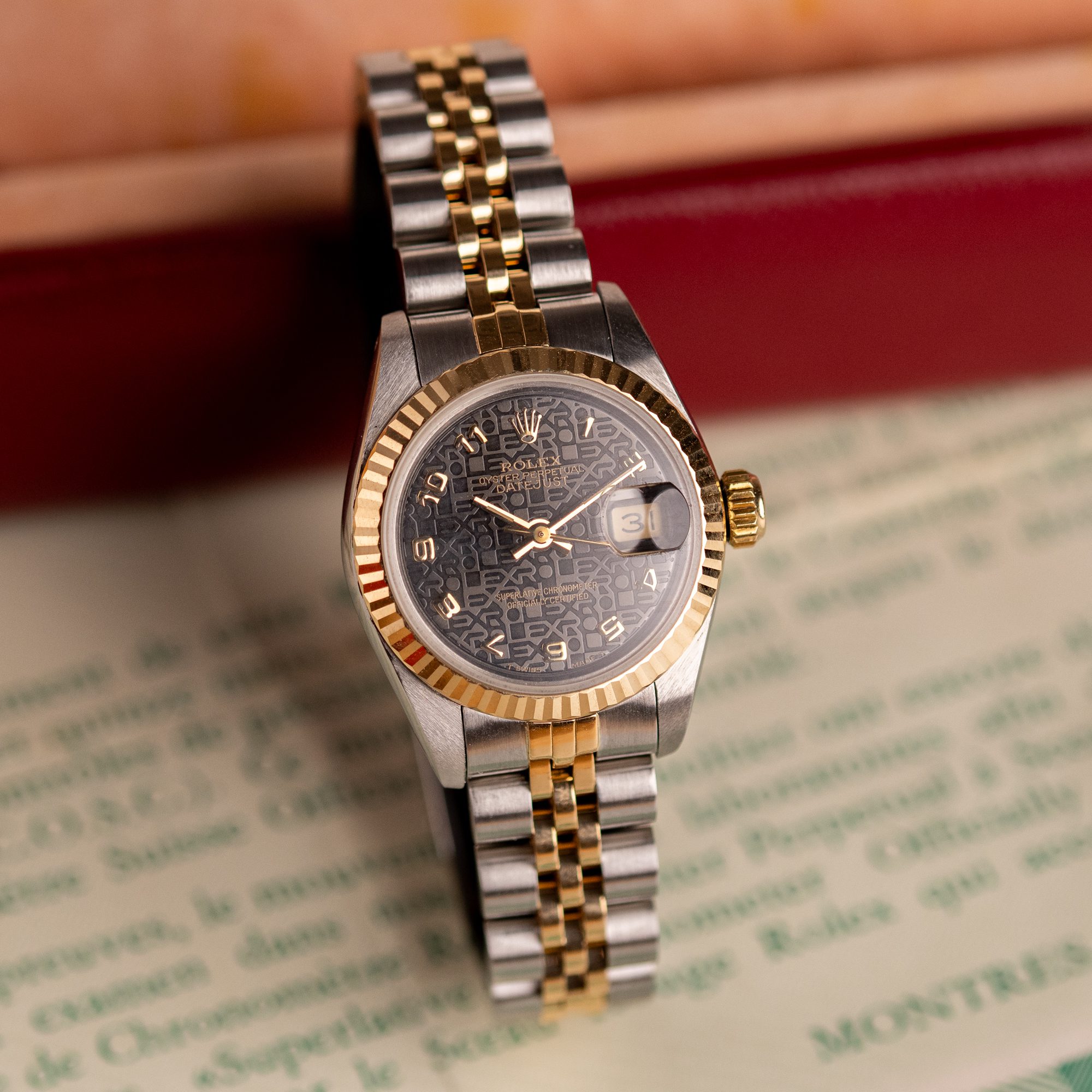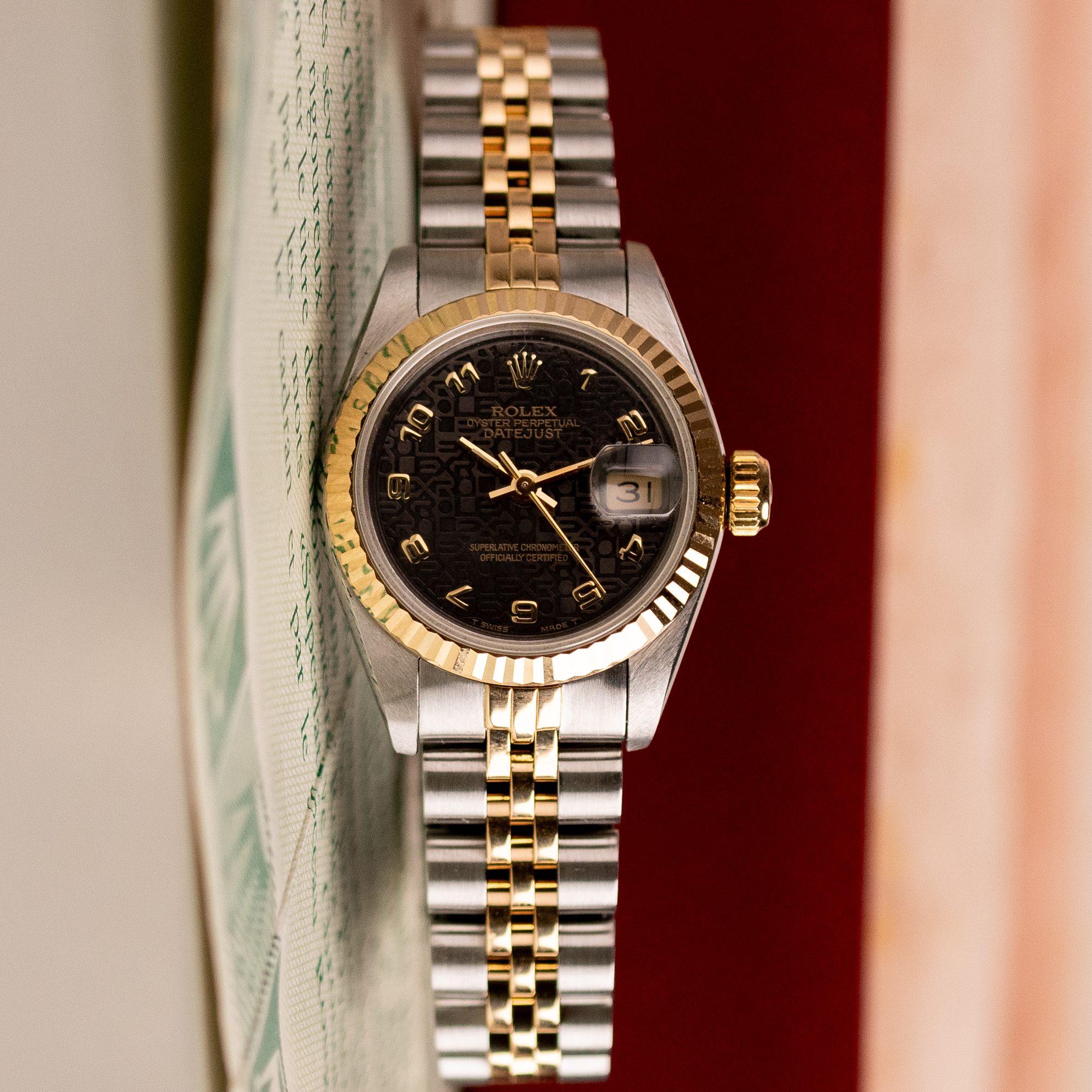 The Rolex Datejust 26, ref. 69173, combines stainless steel and yellow gold in a two-tone construction, featuring a fluted bezel and a compact 26mm case that balances classic proportions with versatile wearability for any occasion.