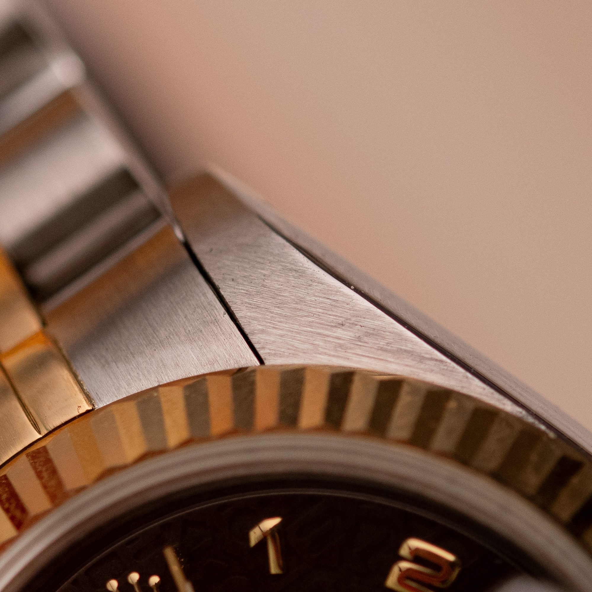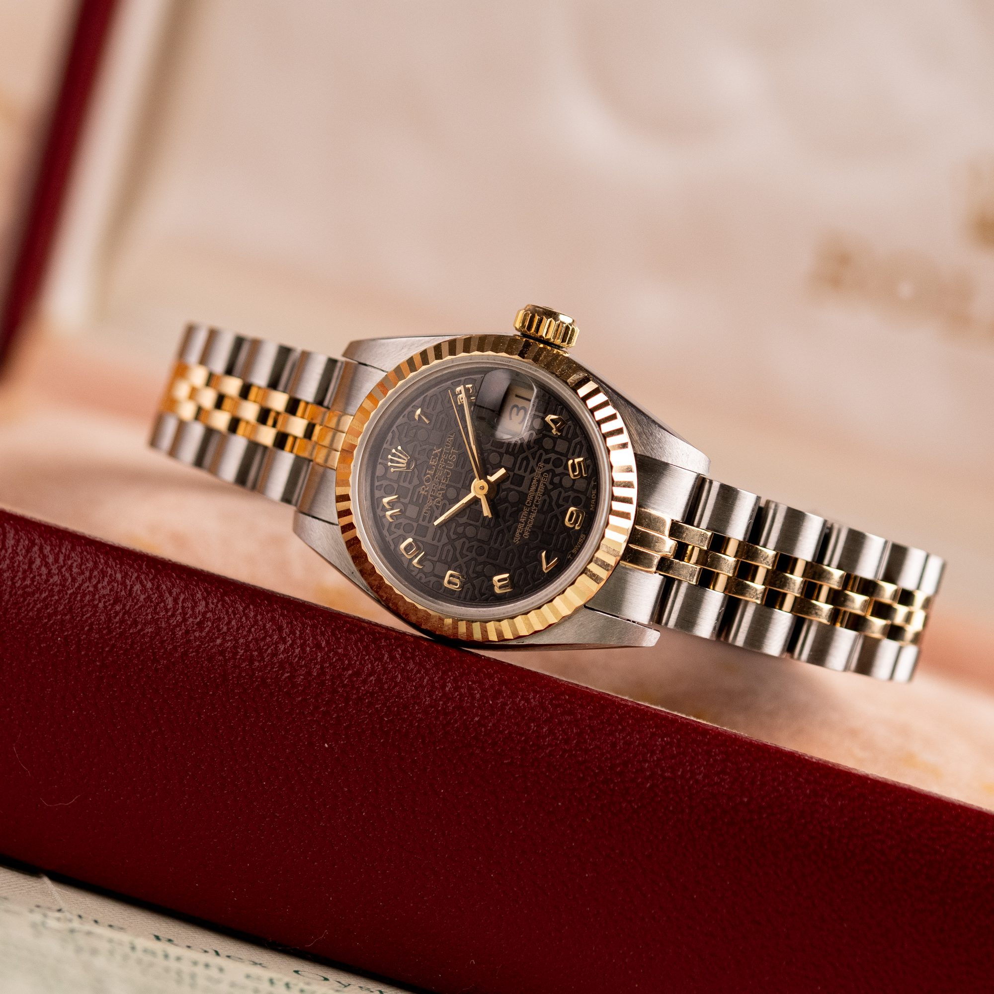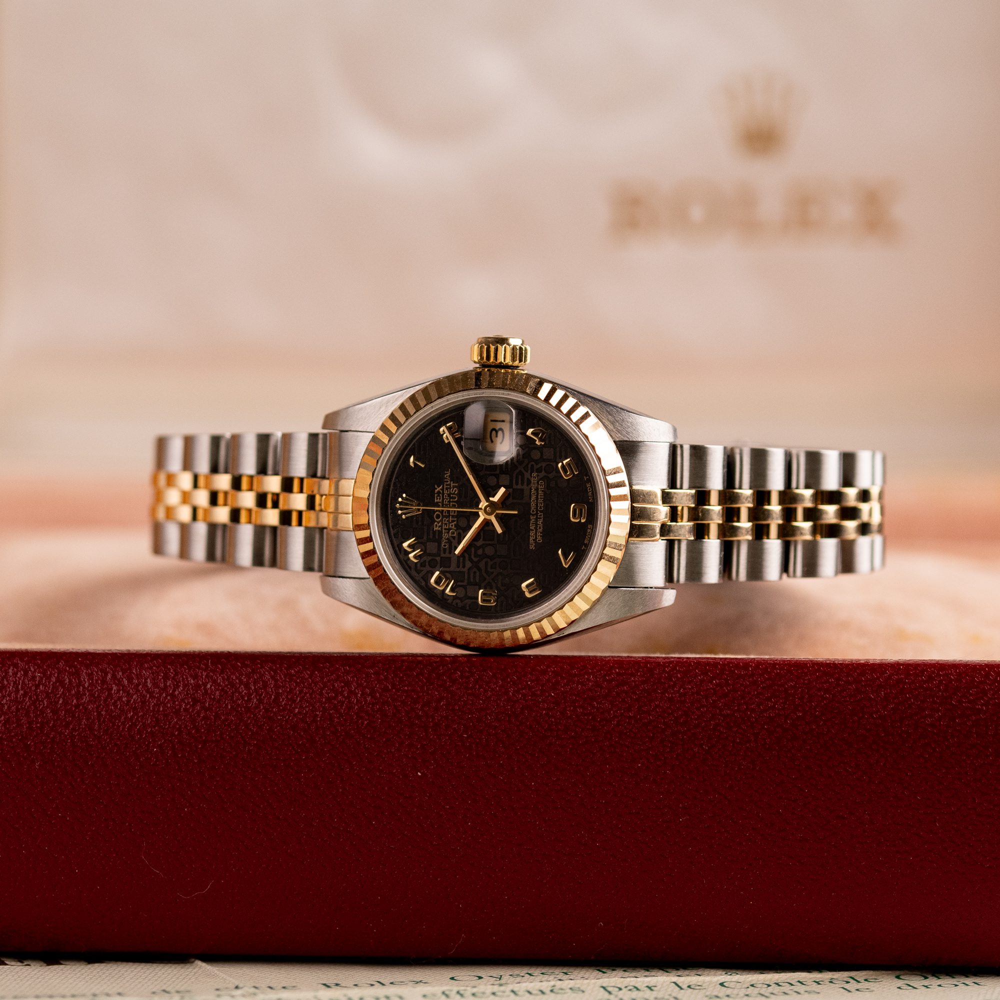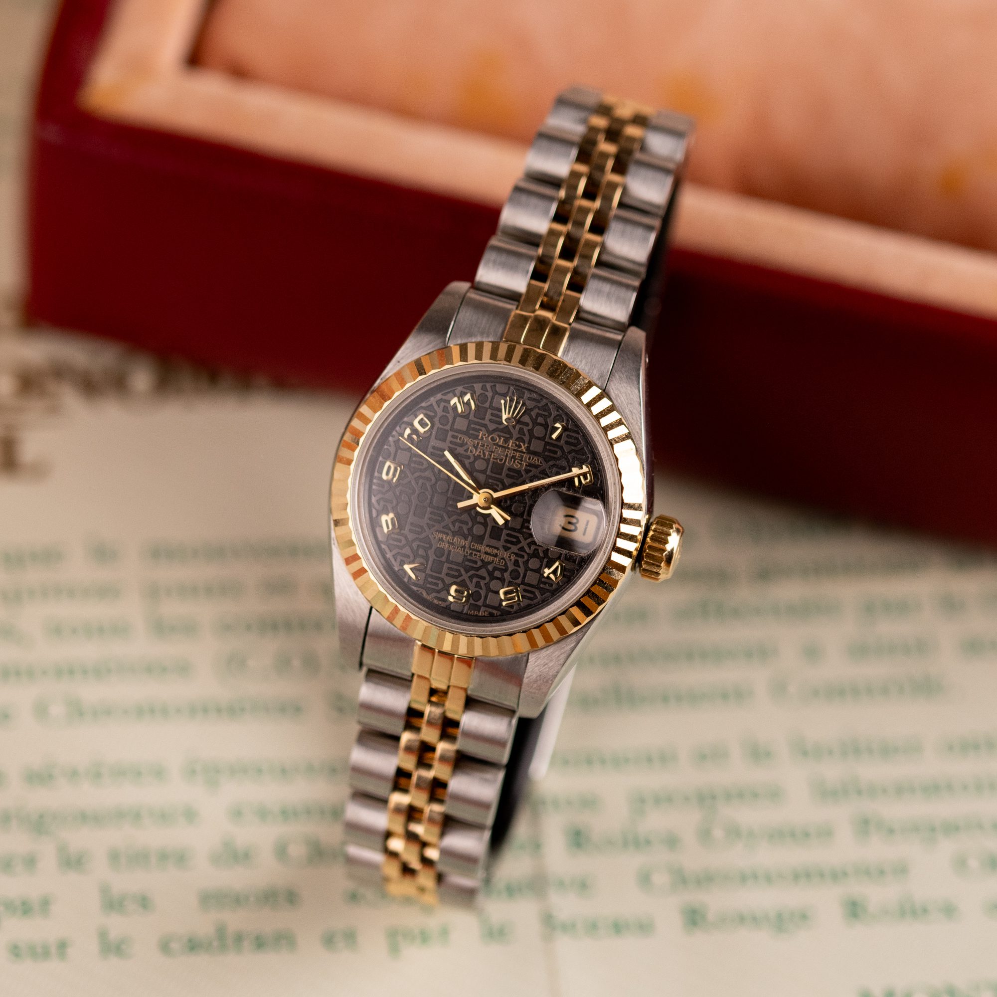 The Rolex Datejust 26, ref. 69173, combines stainless steel and yellow gold in a two-tone construction, featuring a fluted bezel and a compact 26mm case that balances classic proportions with versatile wearability for any occasion.