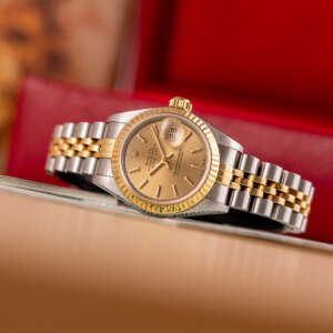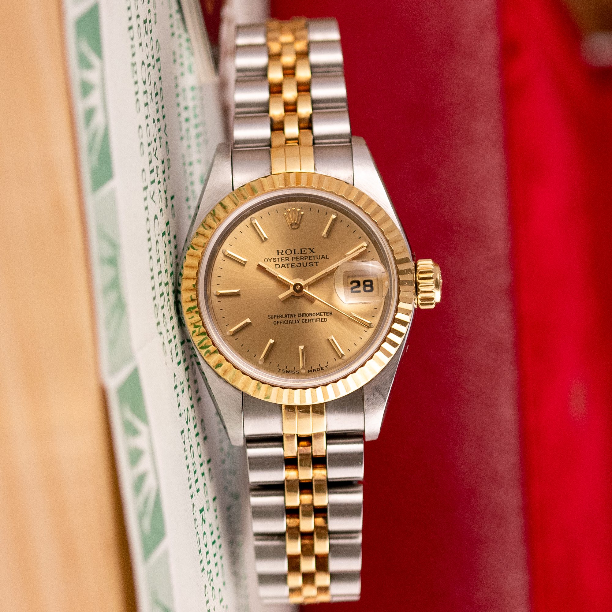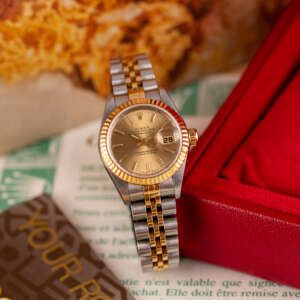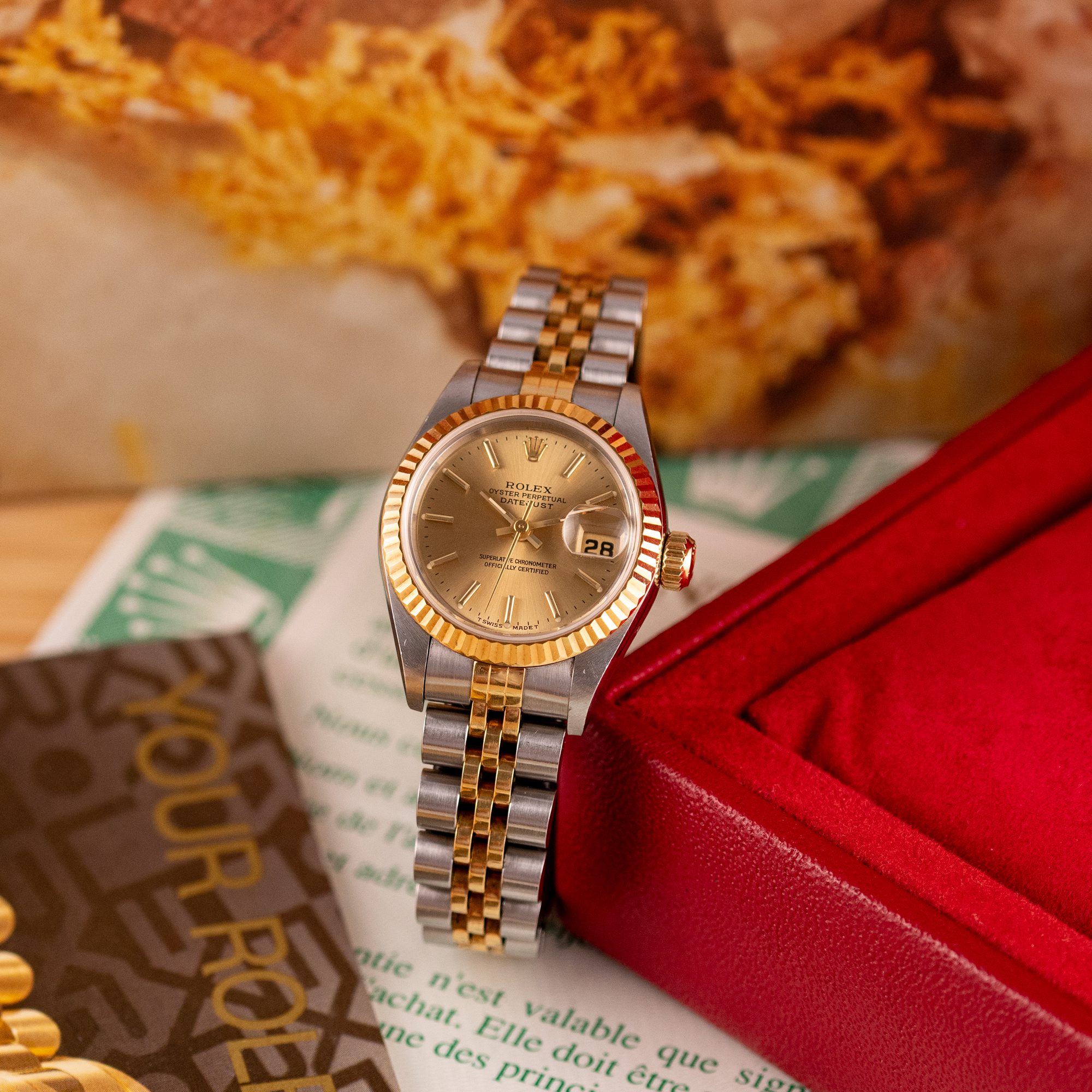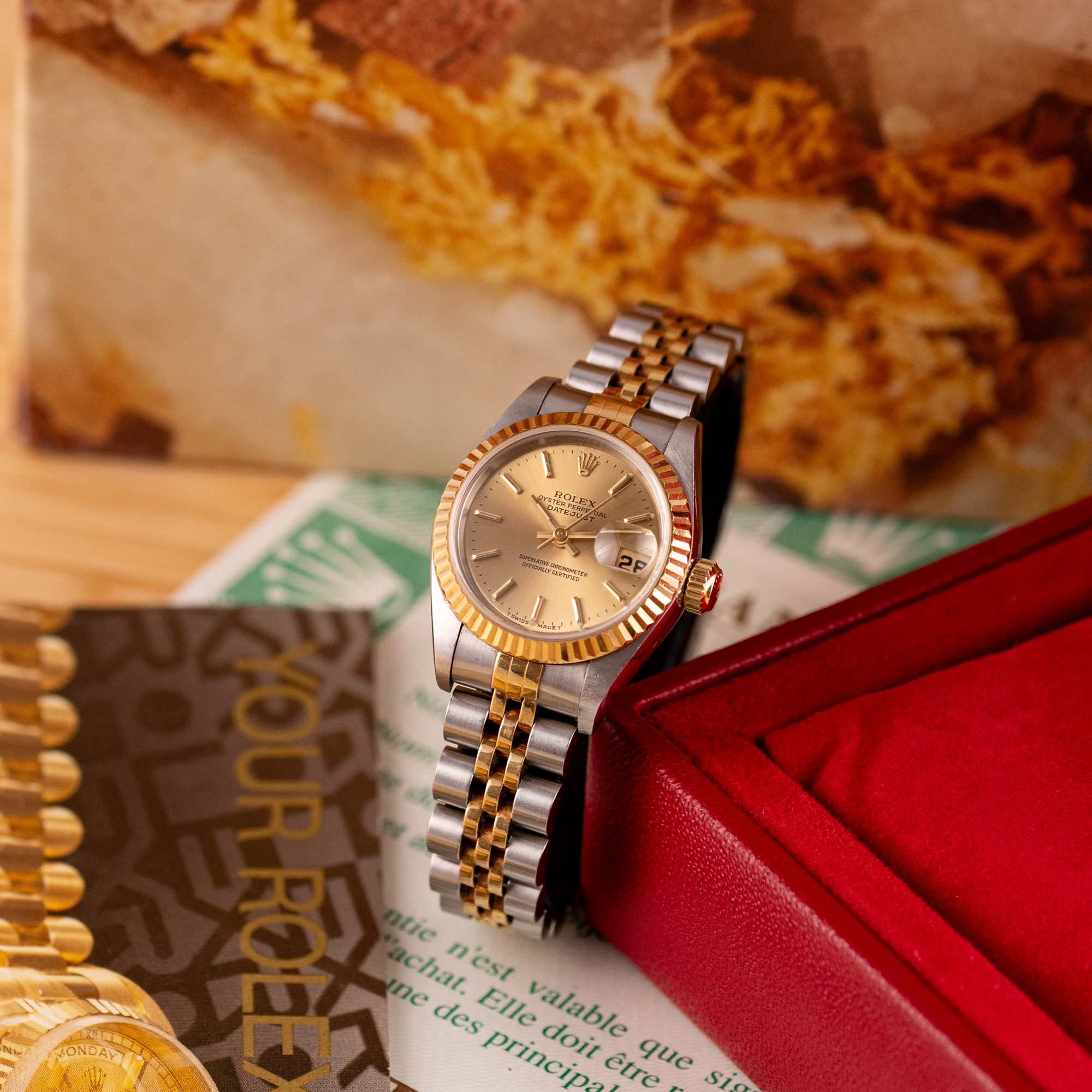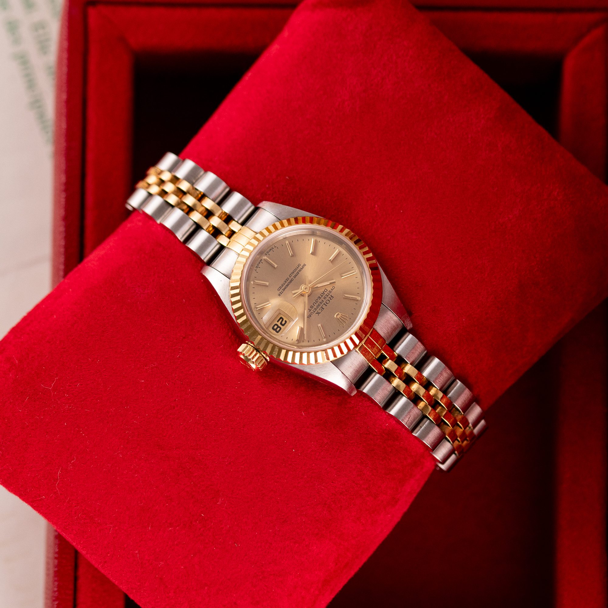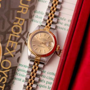 This particular piece, originally sold in 1998, features a beautiful champagne dial that exudes warmth and complements the case and bracelet perfectly. The watch is in very good condition, with a mechanically fully functional movement and a stretch-free bracelet sized for wrists up to 16 cm. Presented as a full set with the original Rolex box and papers, this Datejust is an exceptional option for collectors or those seeking a versatile, vintage timepiece for everyday wear.