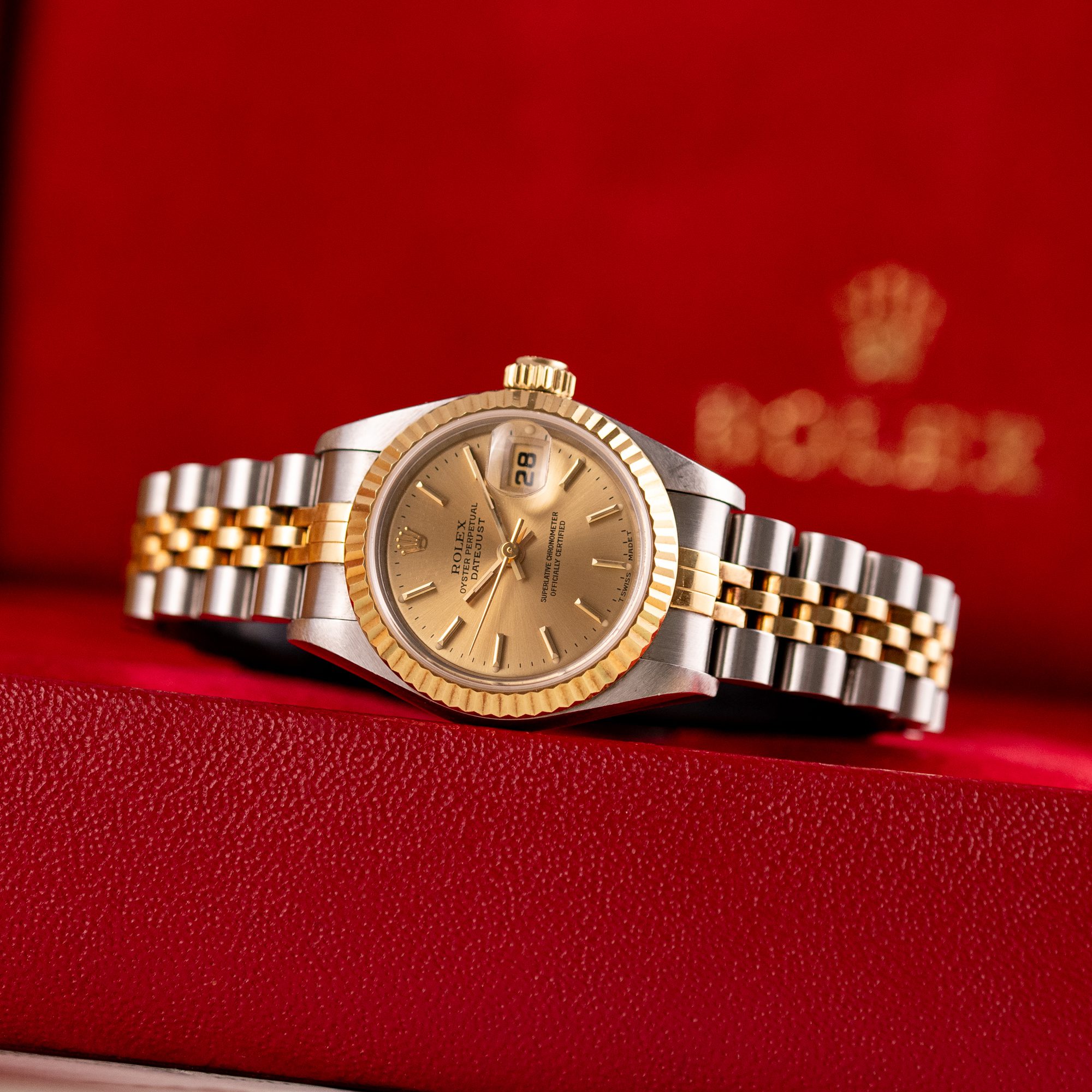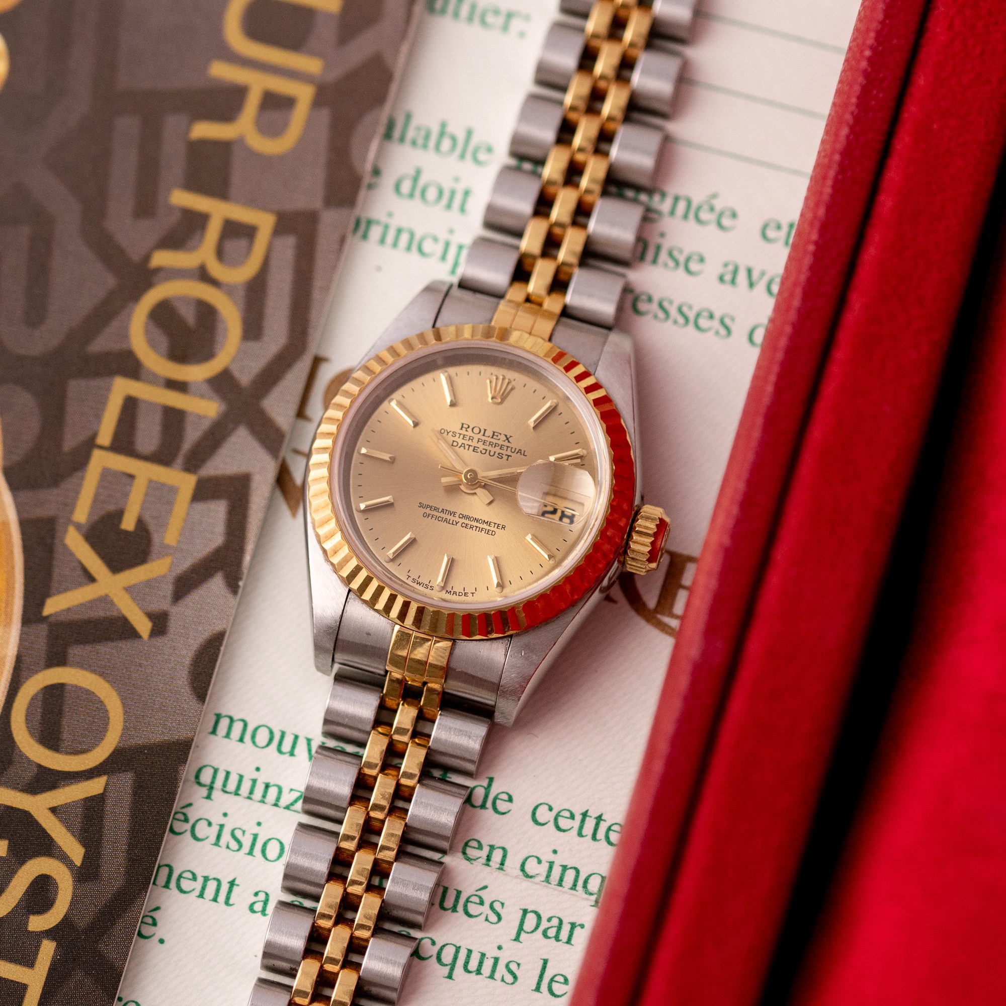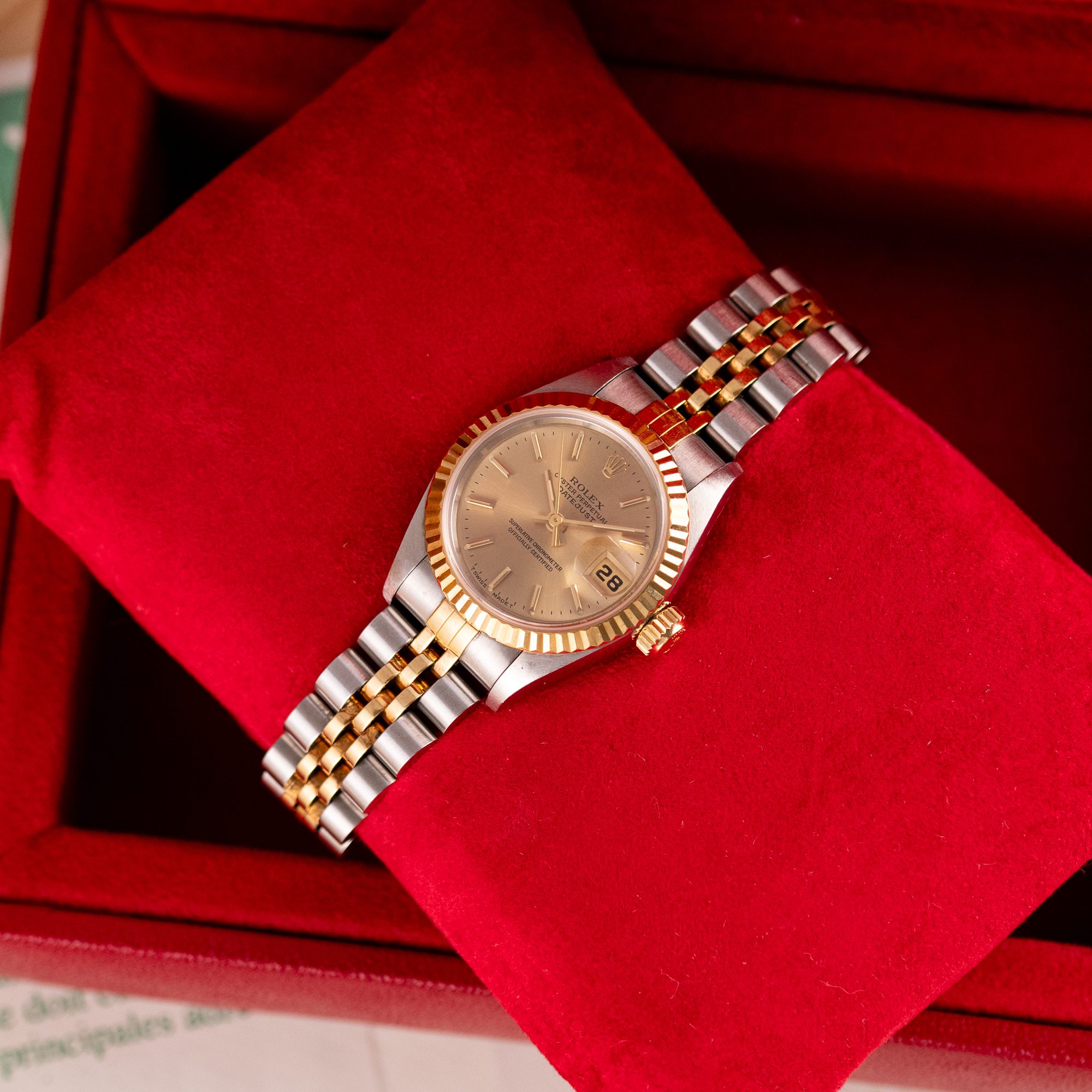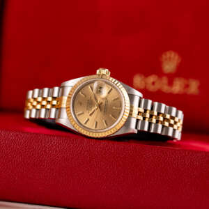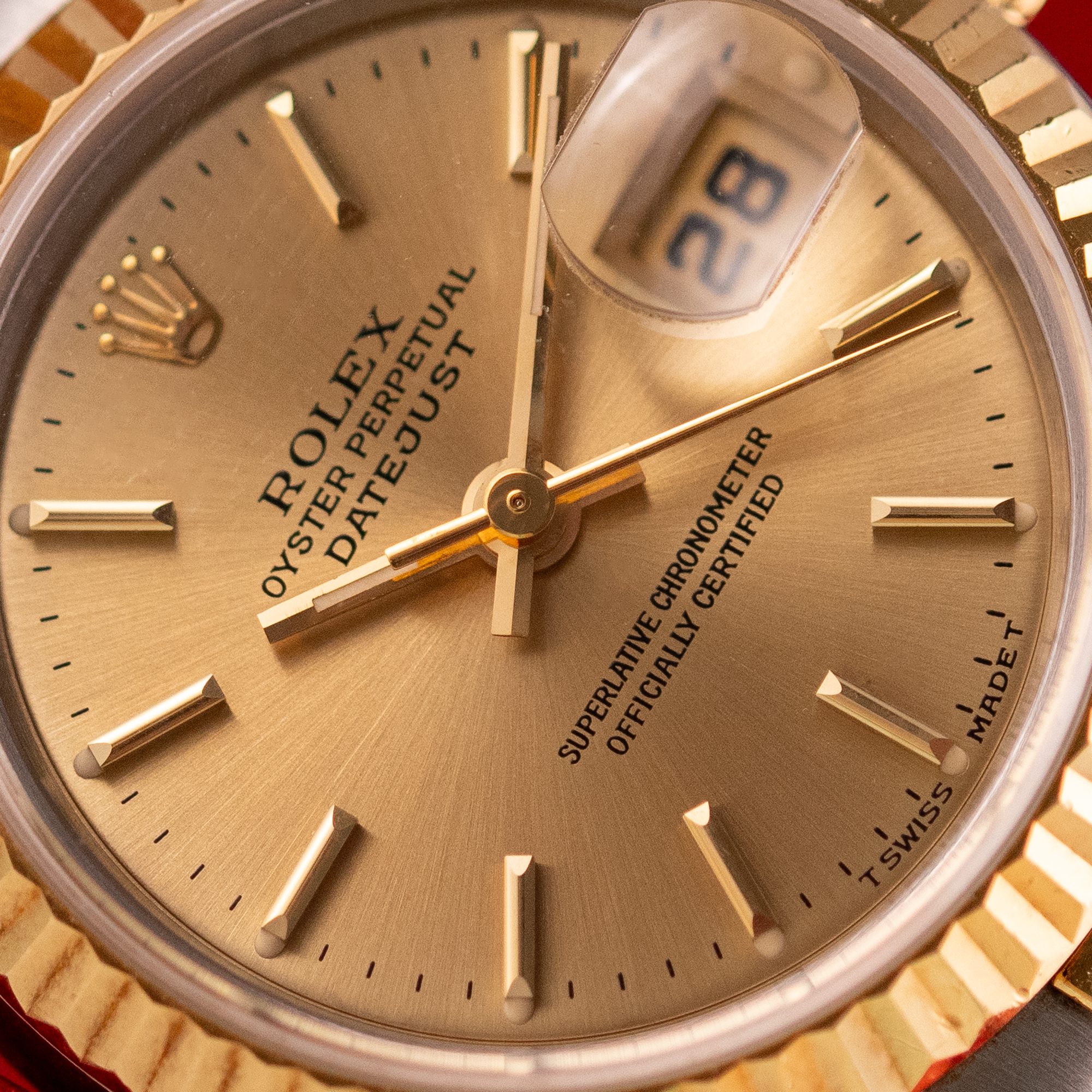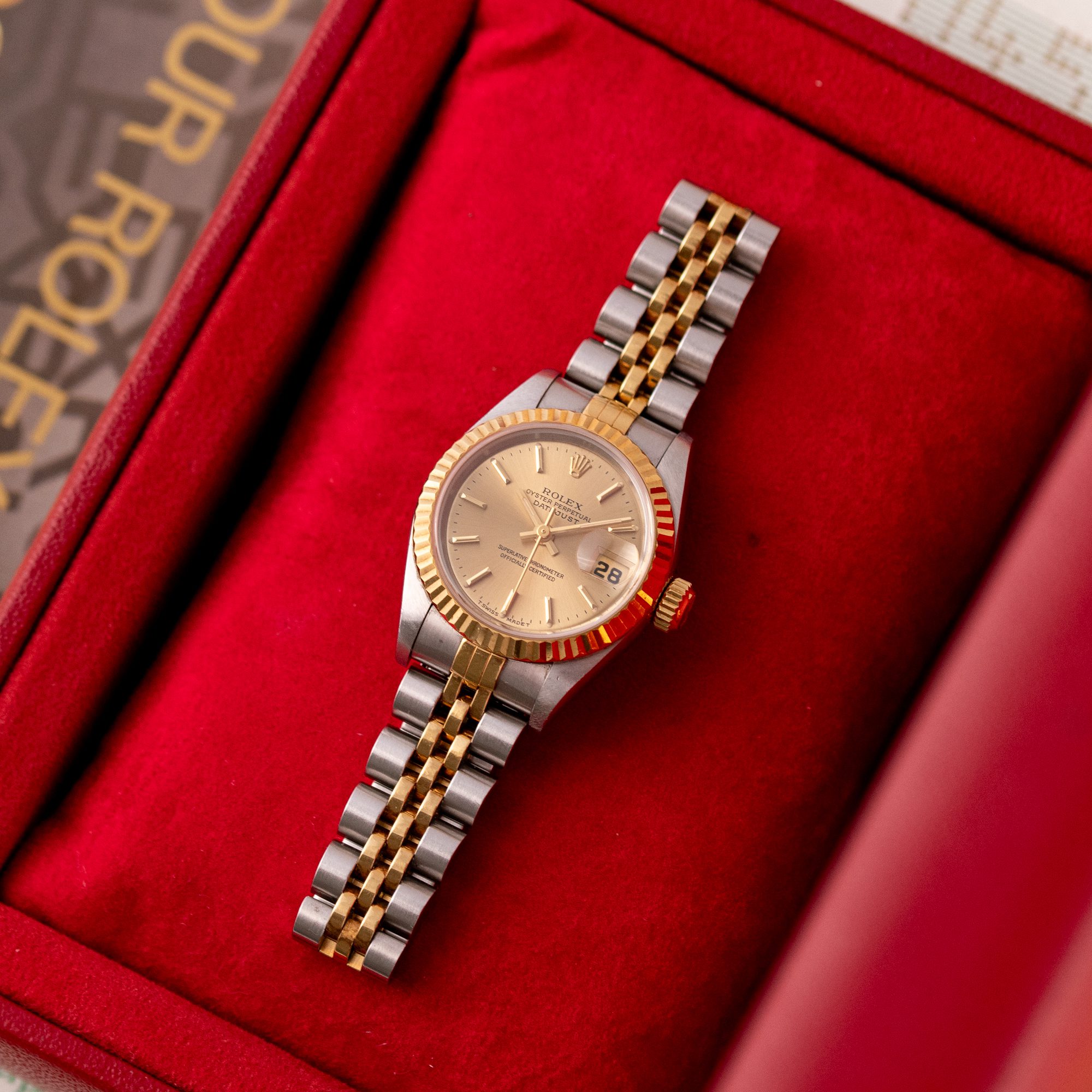 This particular piece, originally sold in 1998, features a beautiful champagne dial that exudes warmth and complements the case and bracelet perfectly. The watch is in very good condition, with a mechanically fully functional movement and a stretch-free bracelet sized for wrists up to 16 cm. Presented as a full set with the original Rolex box and papers, this Datejust is an exceptional option for collectors or those seeking a versatile, vintage timepiece for everyday wear.