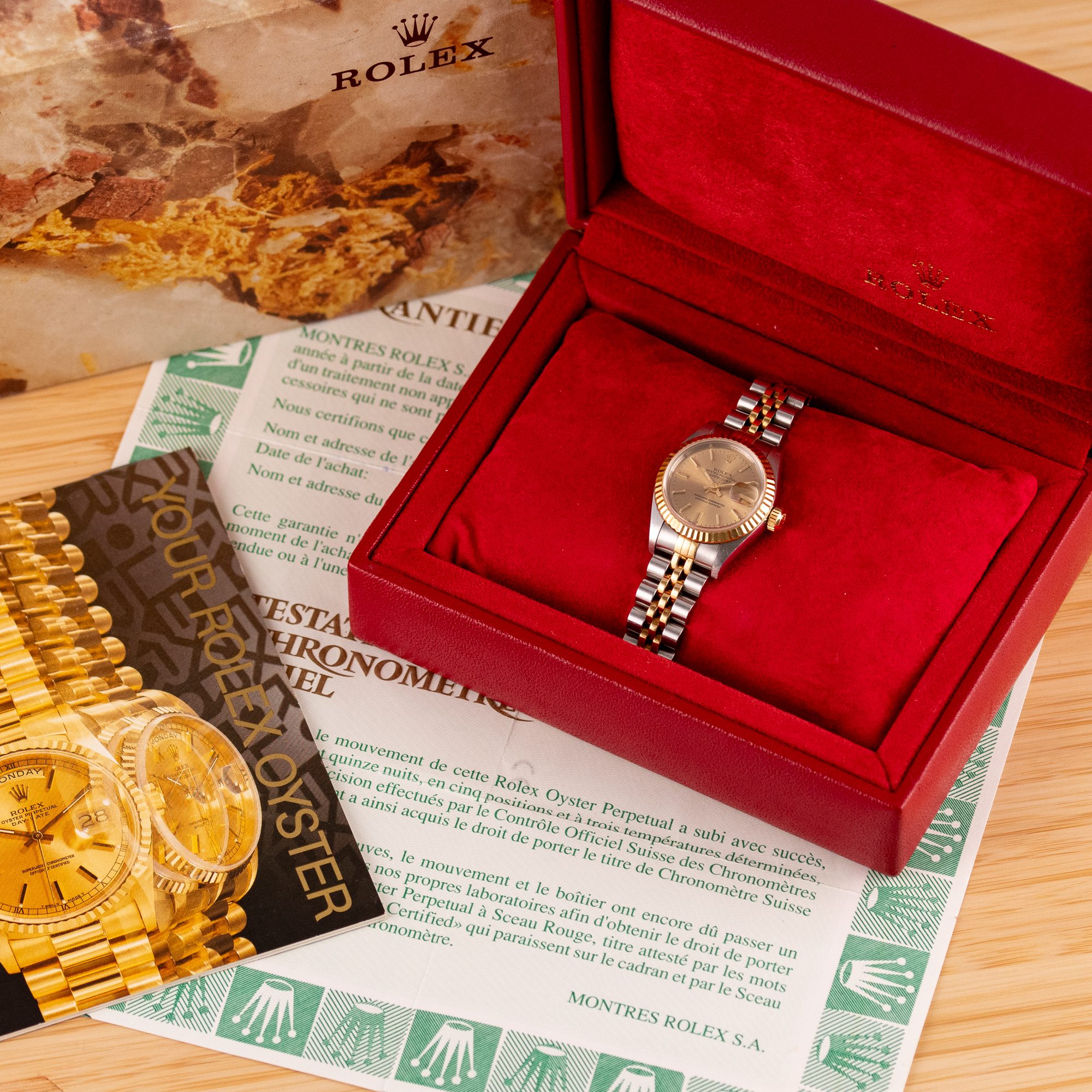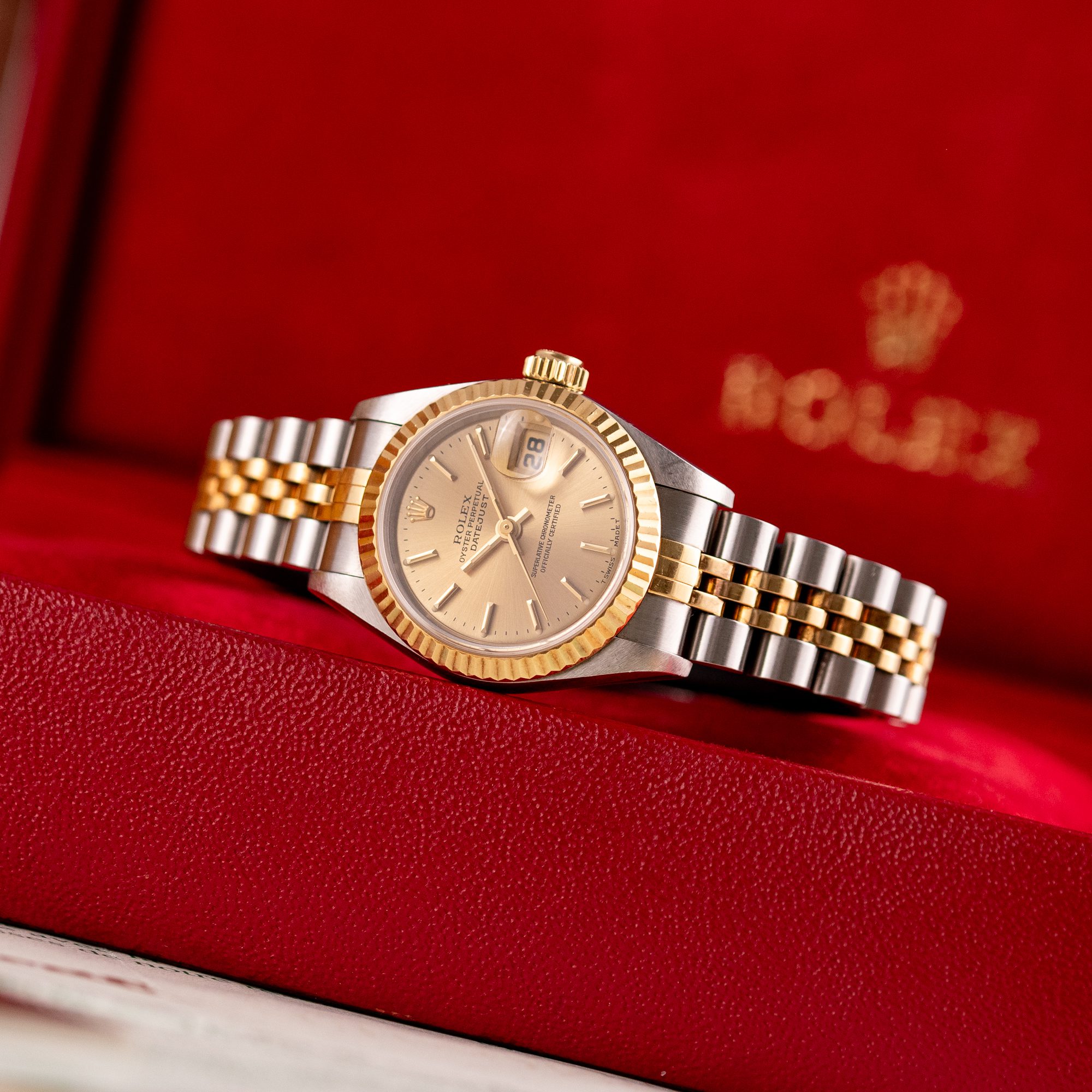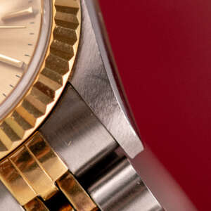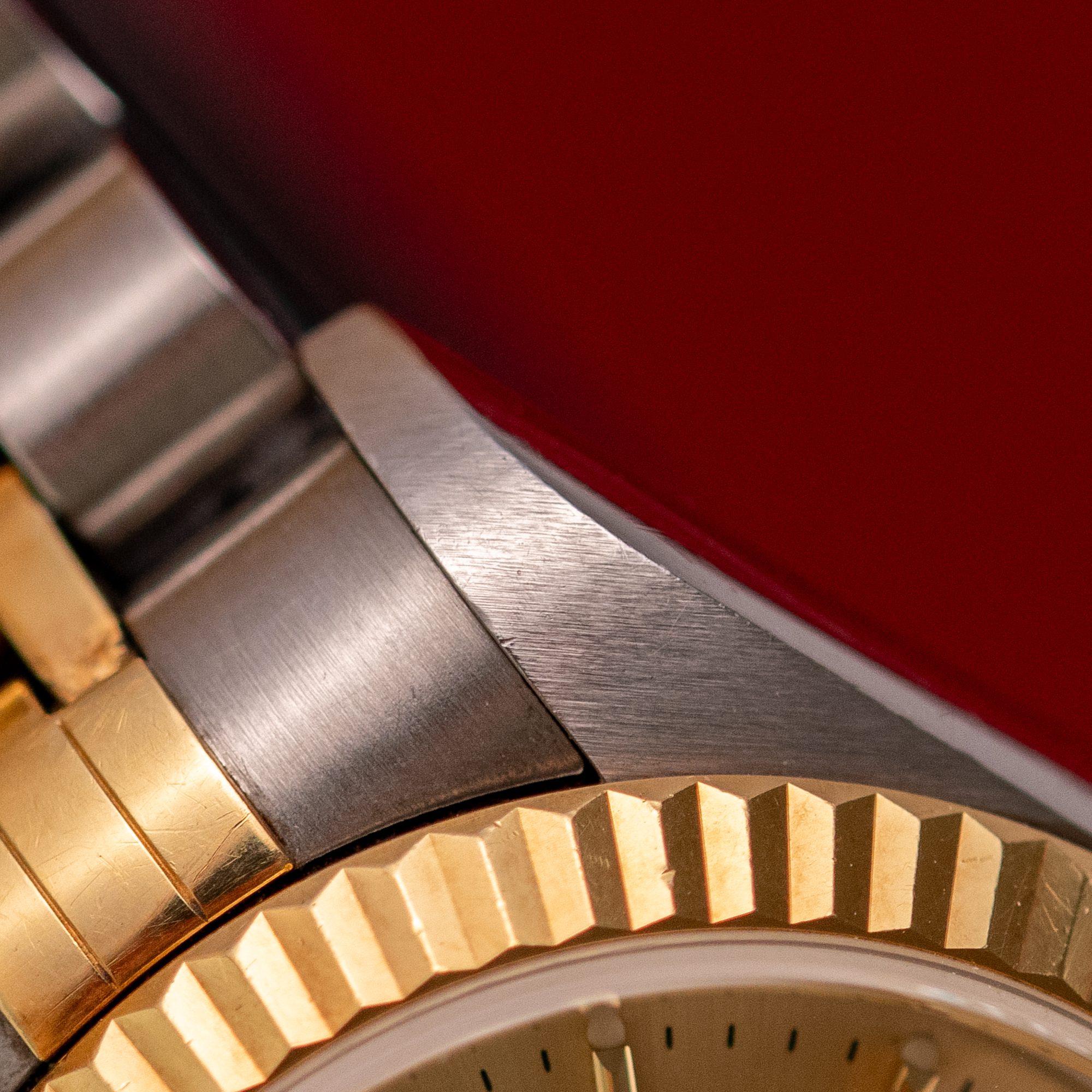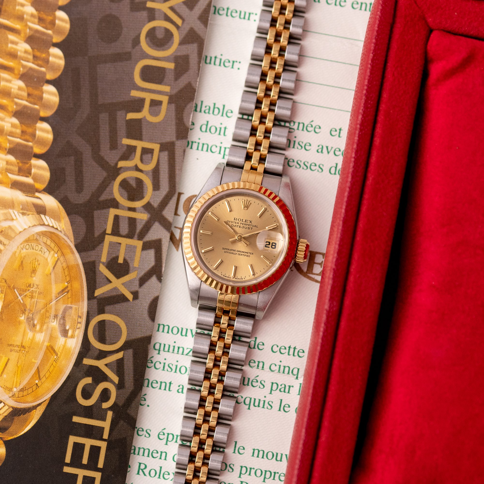 This particular piece, originally sold in 1998, features a beautiful champagne dial that exudes warmth and complements the case and bracelet perfectly. The watch is in very good condition, with a mechanically fully functional movement and a stretch-free bracelet sized for wrists up to 16 cm. Presented as a full set with the original Rolex box and papers, this Datejust is an exceptional option for collectors or those seeking a versatile, vintage timepiece for everyday wear.