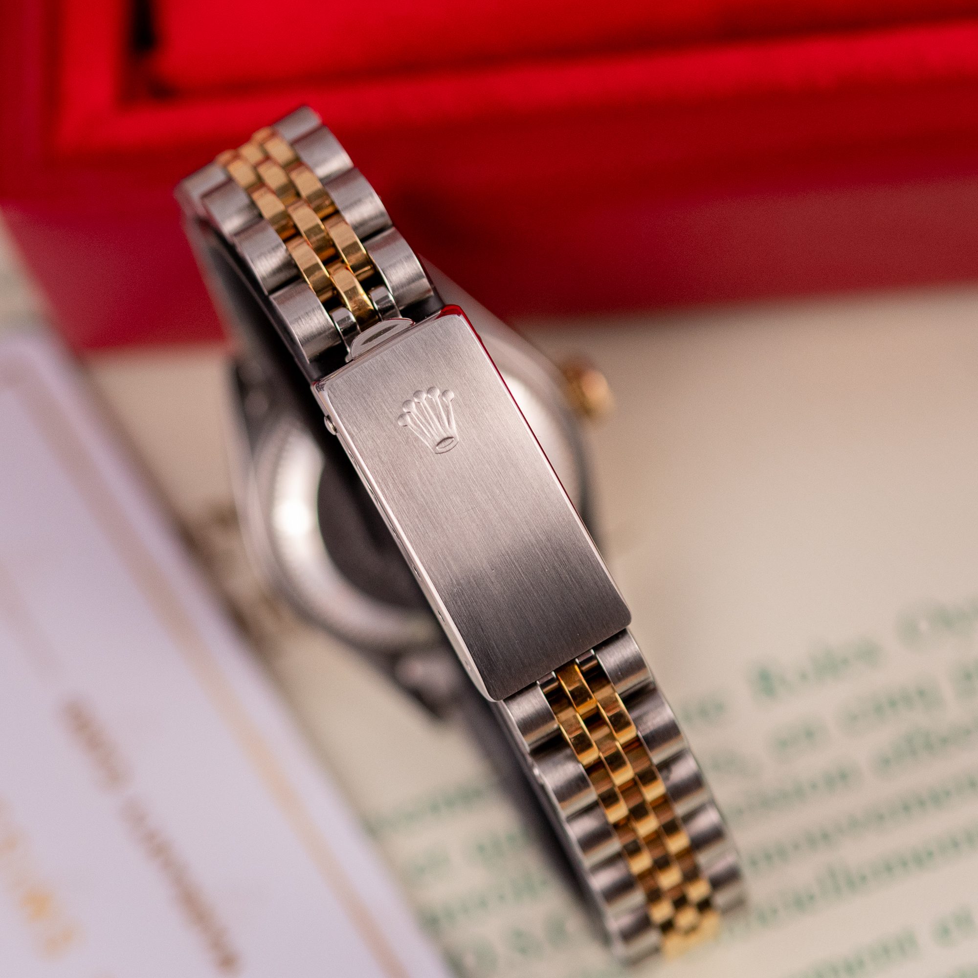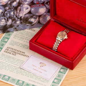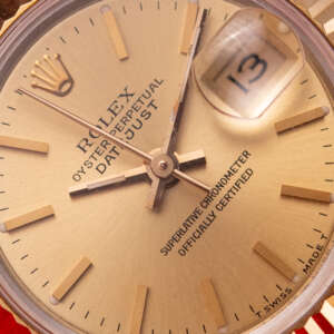 Originally sold in 1990, this example showcases a timeless Champagne dial, offering a warm, sophisticated aesthetic. The watch is in very good condition, with a fully functional automatic movement ensuring reliable performance. The Jubilee bracelet, sized for wrists up to 16 cm, exhibits minimal stretch, maintaining its structural integrity. Presented as a full set with its original Rolex box and papers, this Datejust is an excellent choice for collectors or those seeking a refined vintage timepiece.