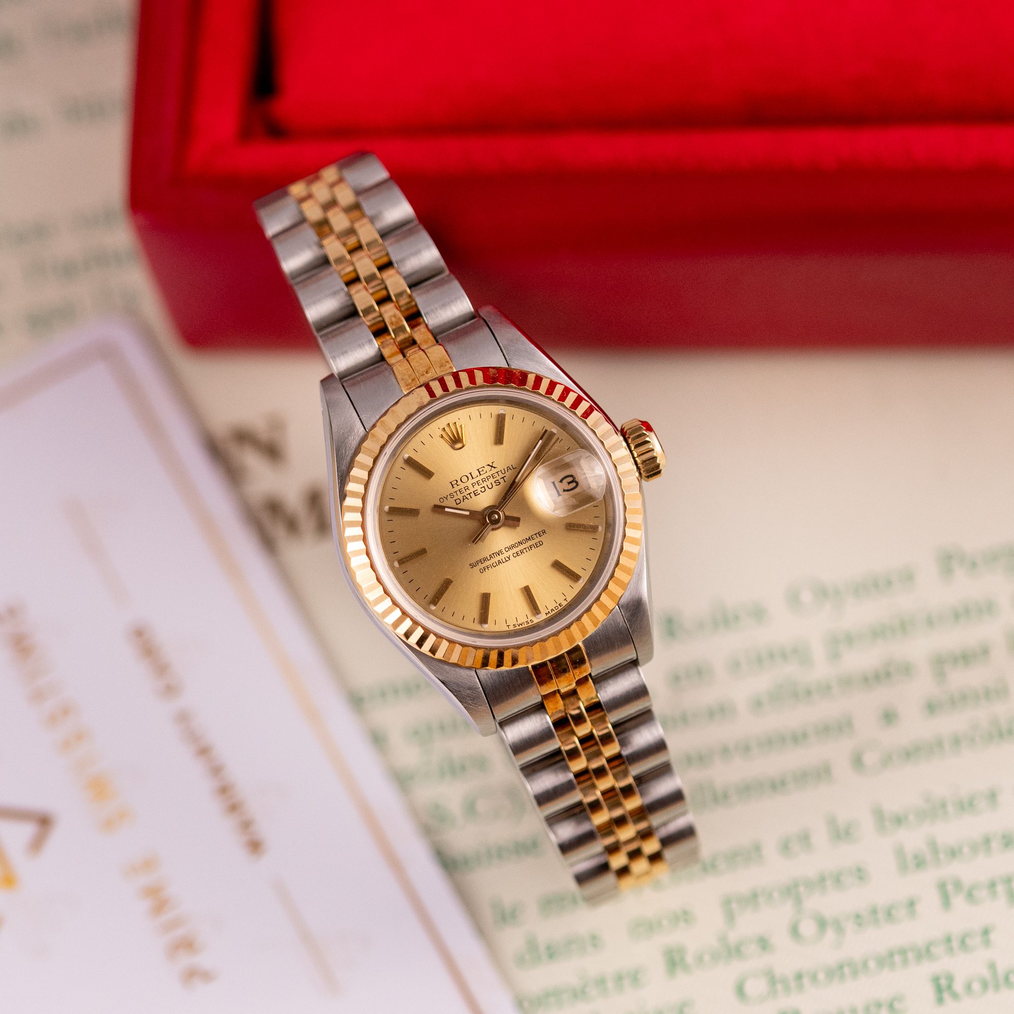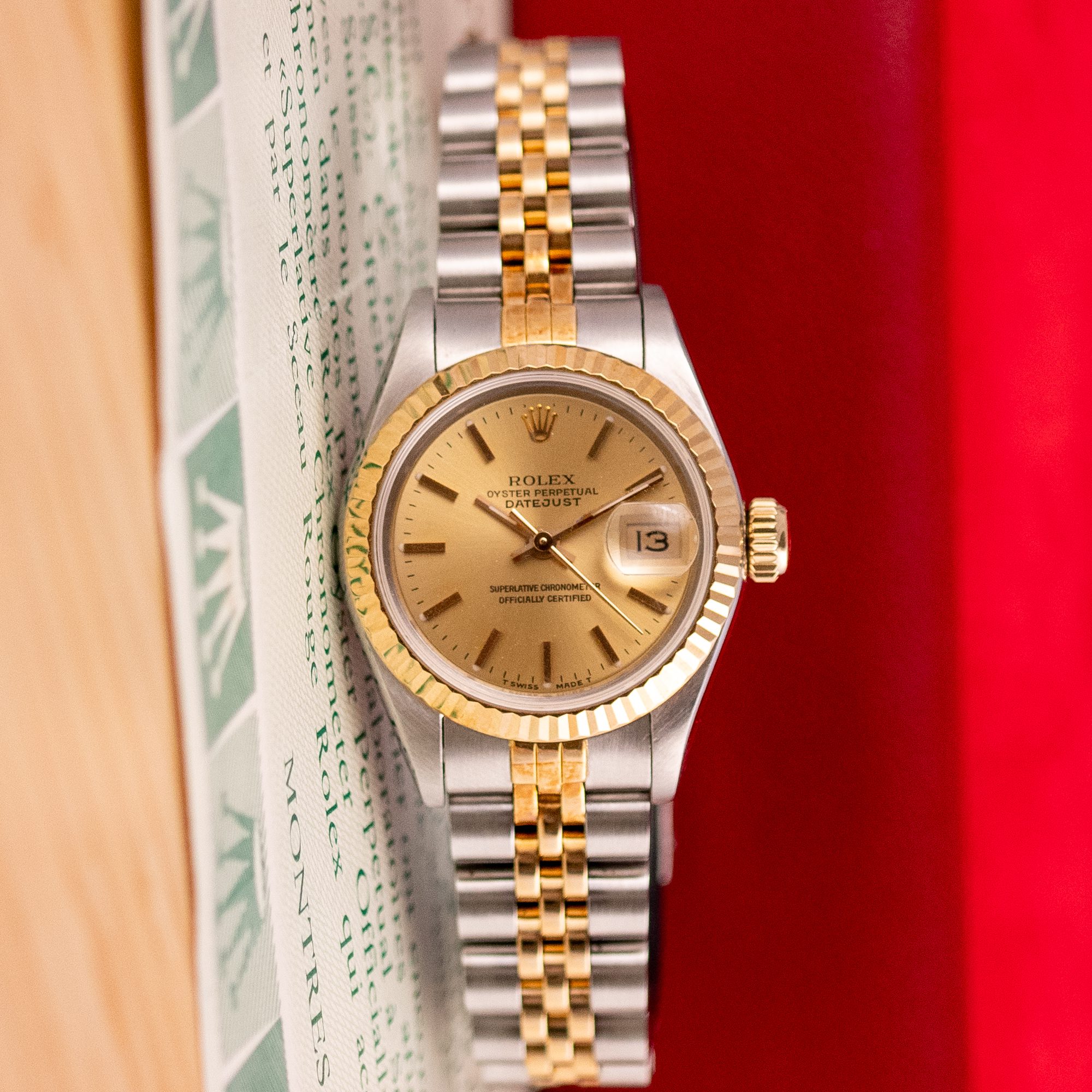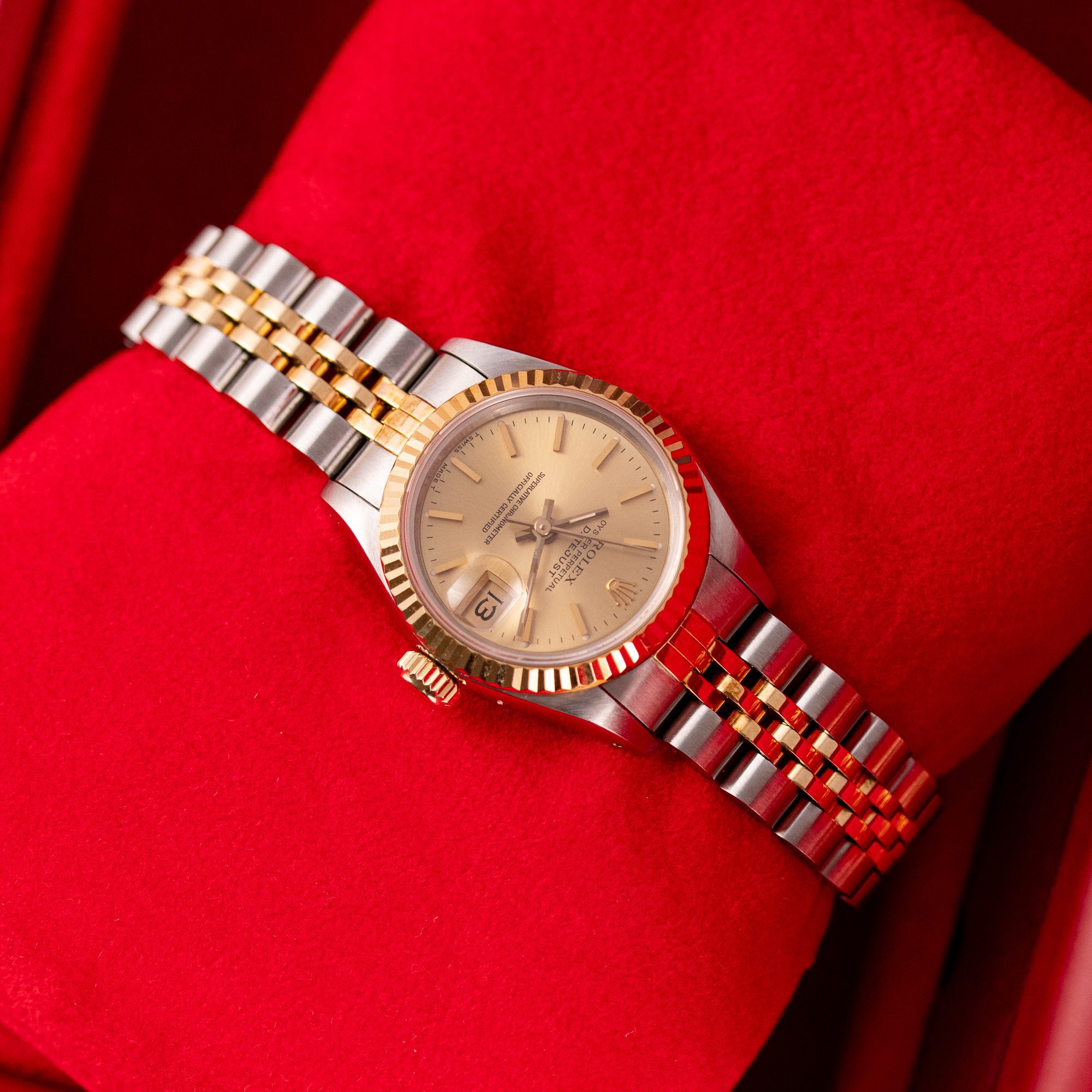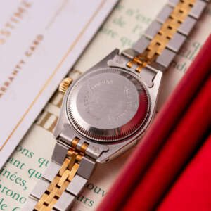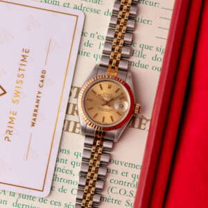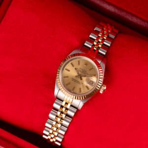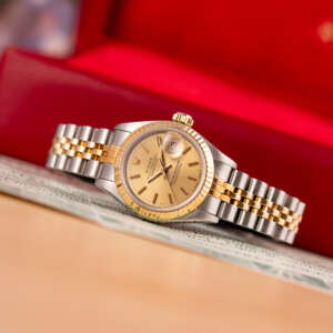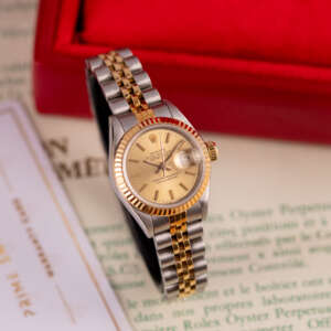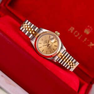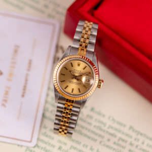 The Rolex Datejust 26, ref. 69173, crafted in stainless steel and yellow gold, features a 26mm case with a fluted bezel, embodying a classic two-tone design that seamlessly blends elegance with versatility, suitable for both formal occasions and daily wear.