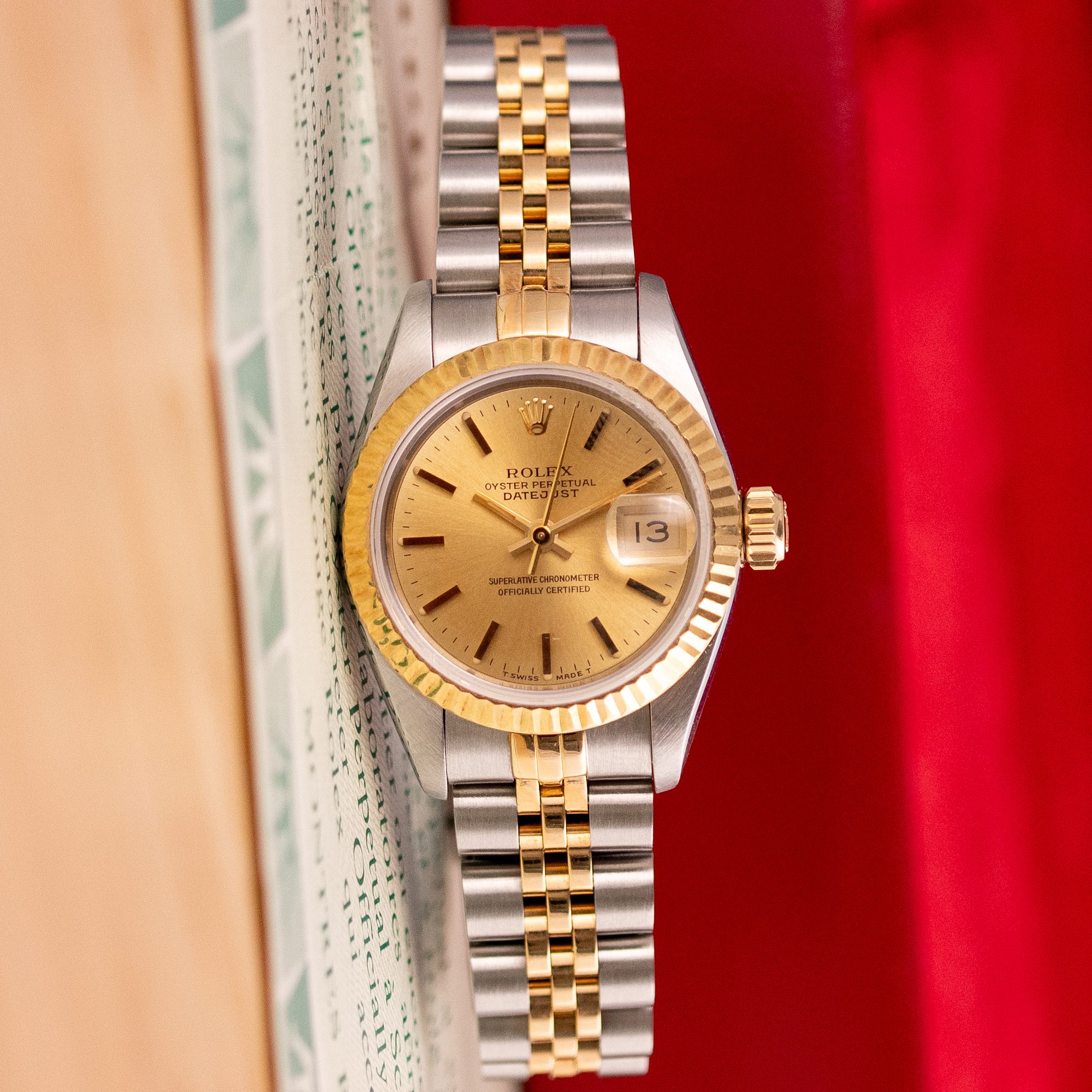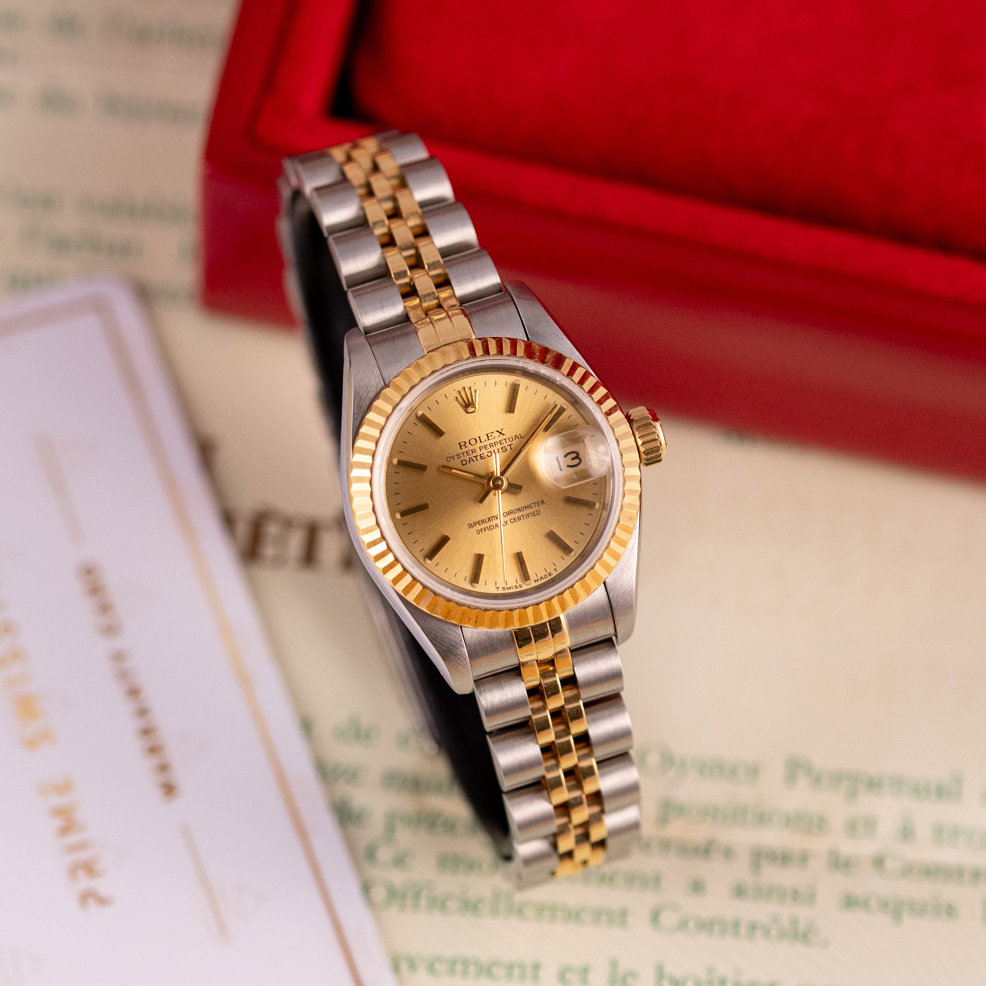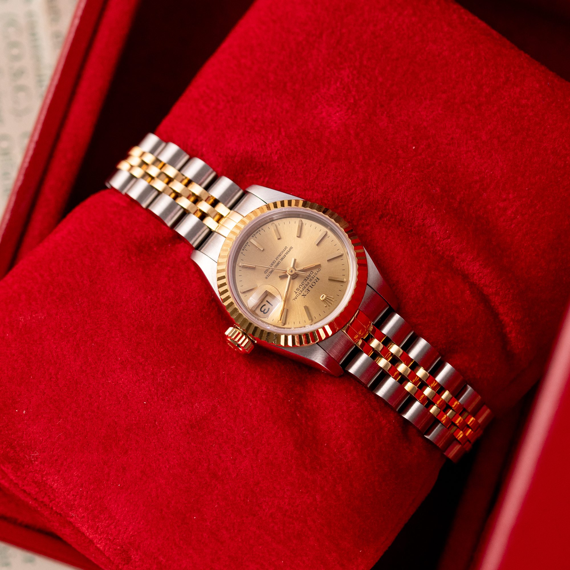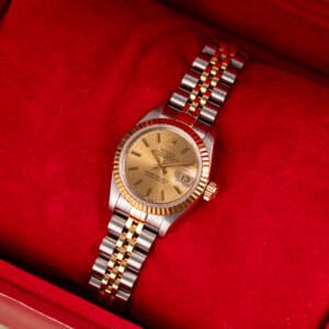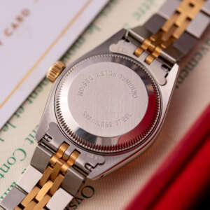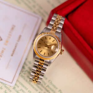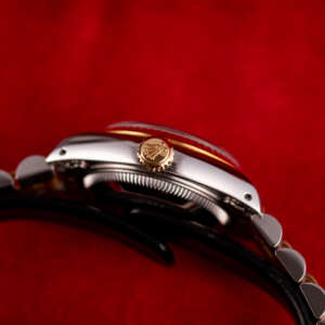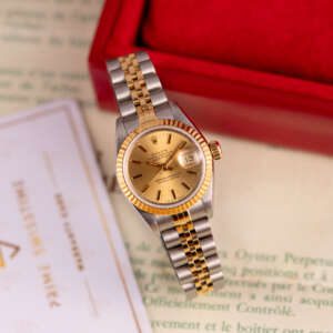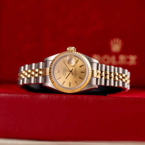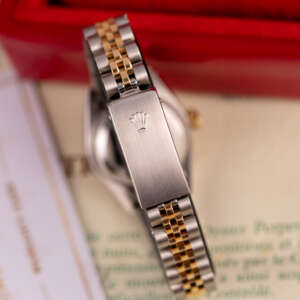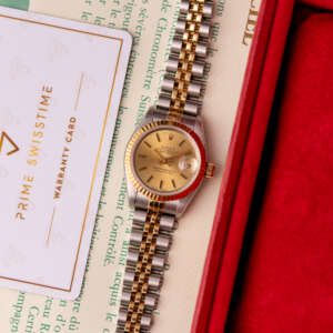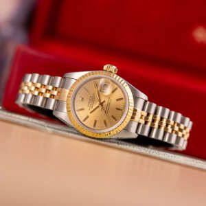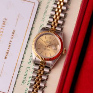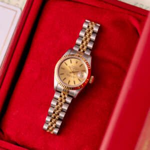 The Rolex Datejust 26, ref. 69173, crafted in stainless steel and yellow gold, features a 26mm case with a fluted bezel, embodying a classic two-tone design that seamlessly blends elegance with versatility, suitable for both formal occasions and daily wear.