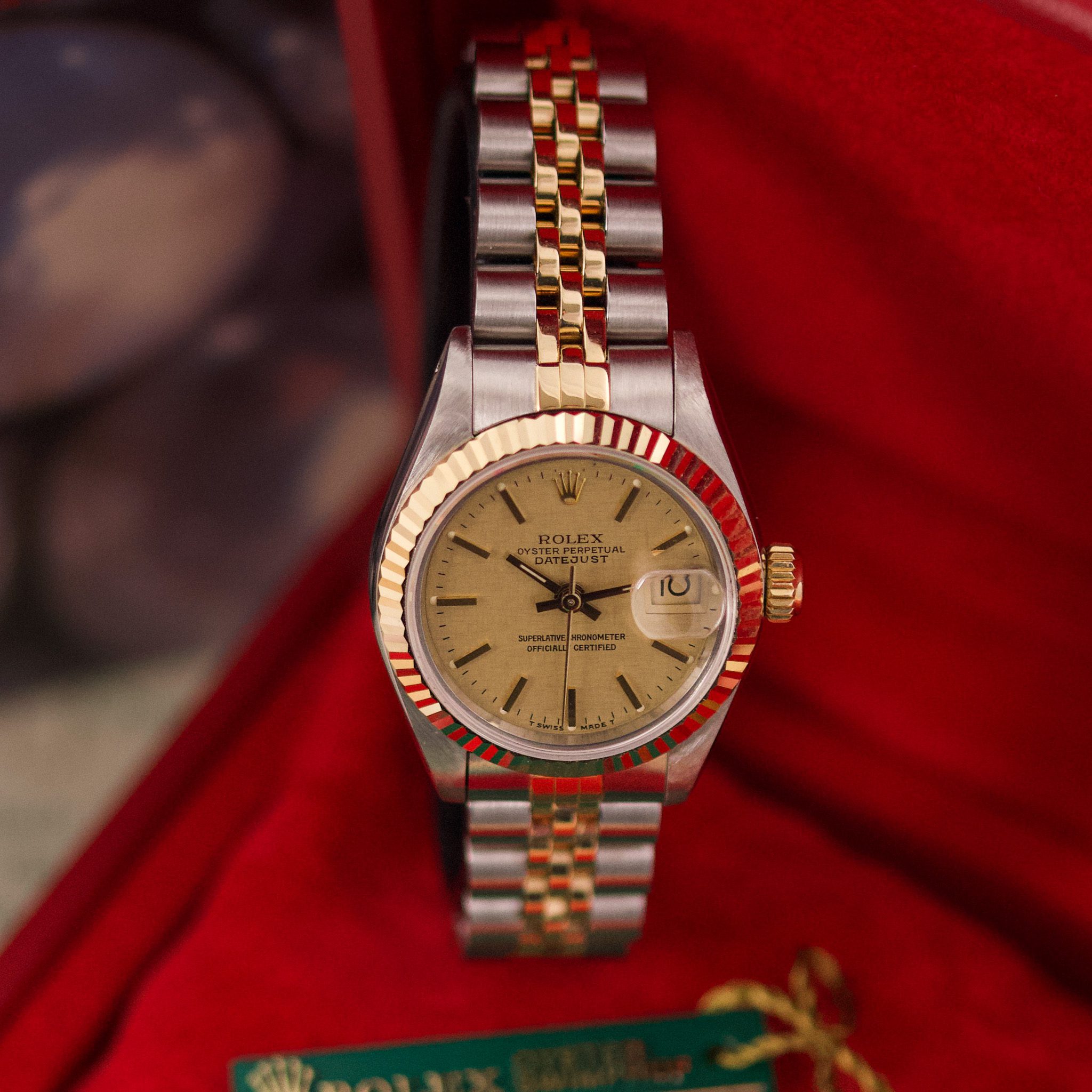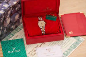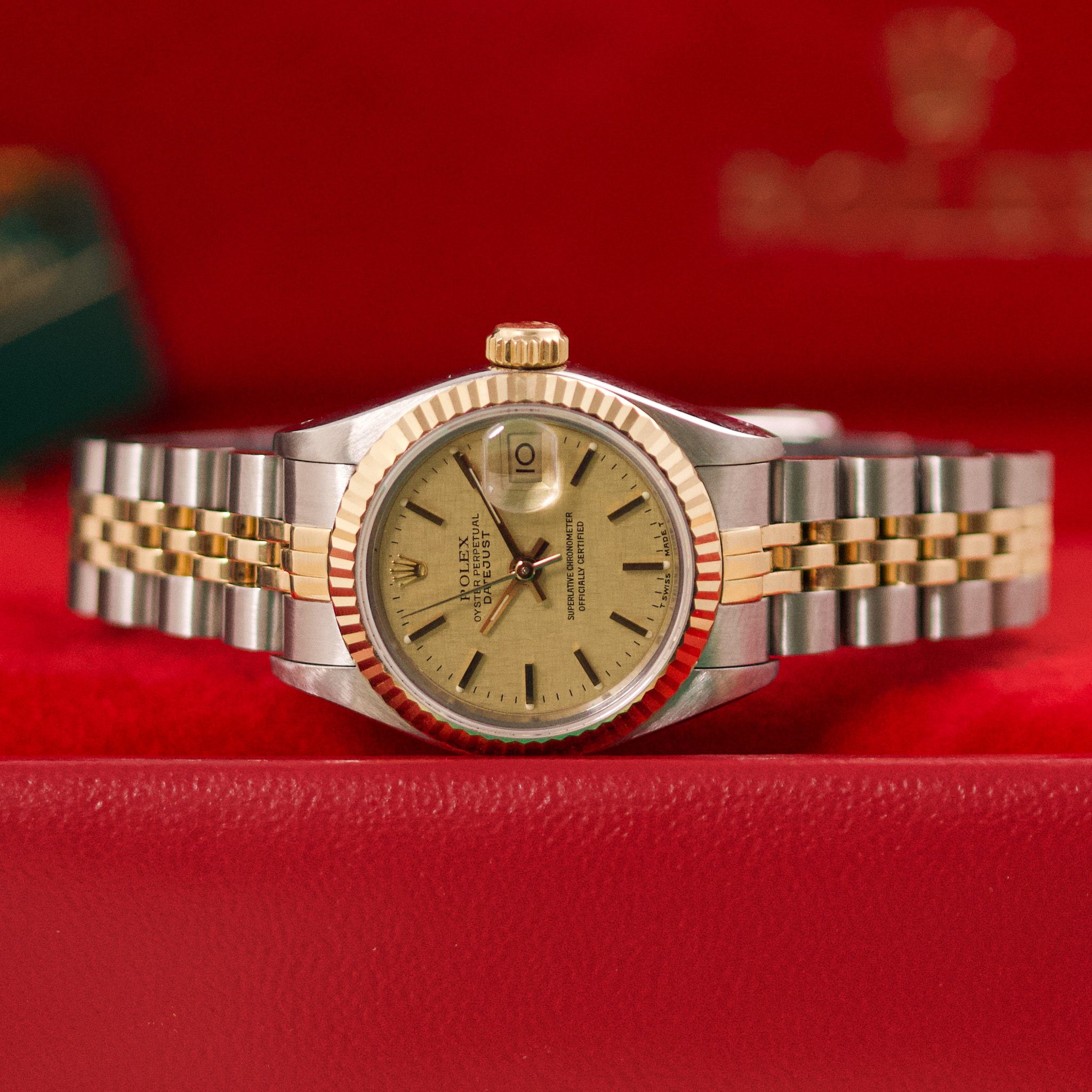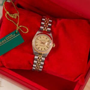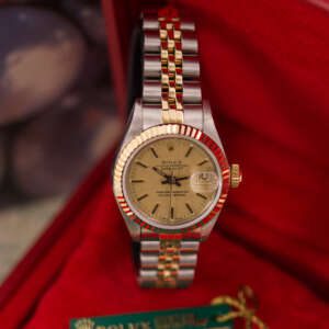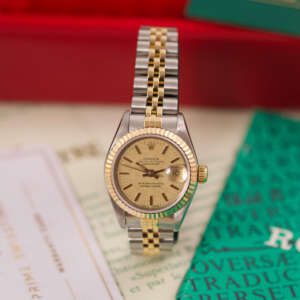 The Rolex Datejust 26, ref. 69173, crafted in stainless steel and yellow gold, features a 26mm case with a fluted bezel, embodying a classic two-tone design that blends refined elegance with versatile wearability, perfect for both formal occasions and daily use.
