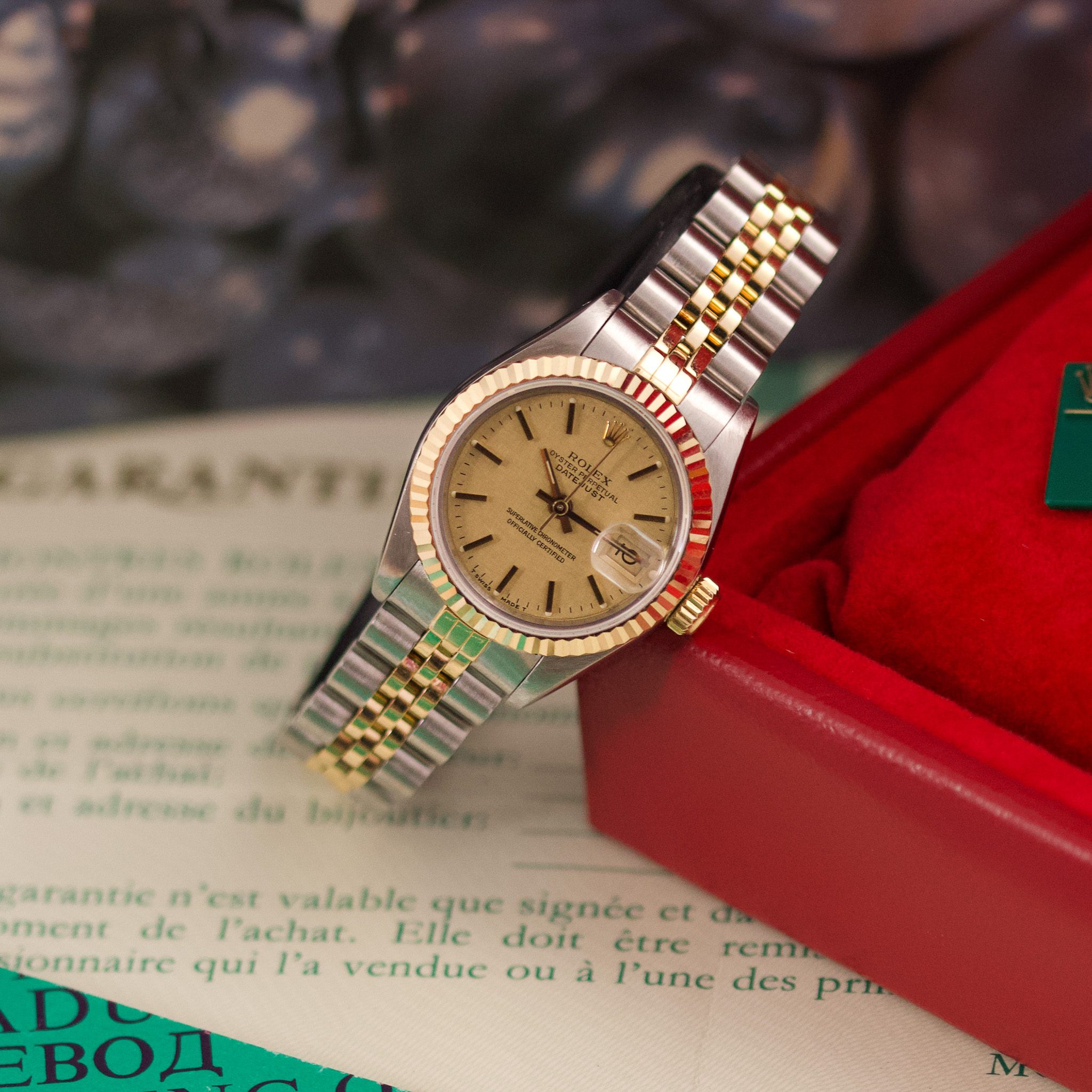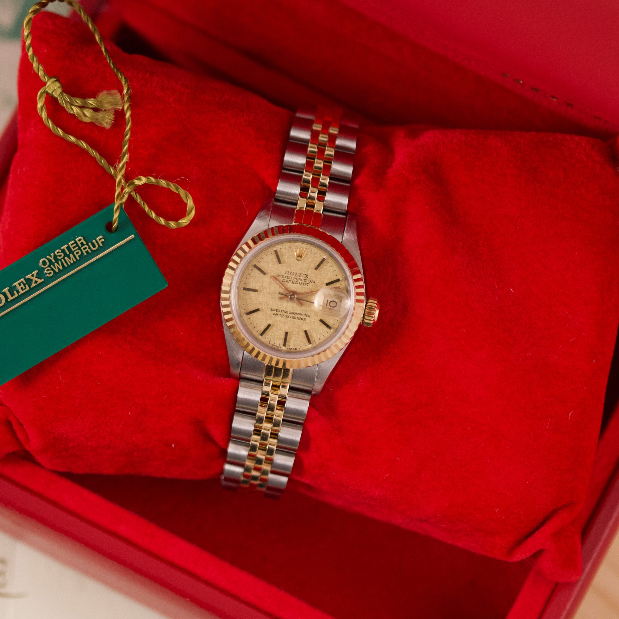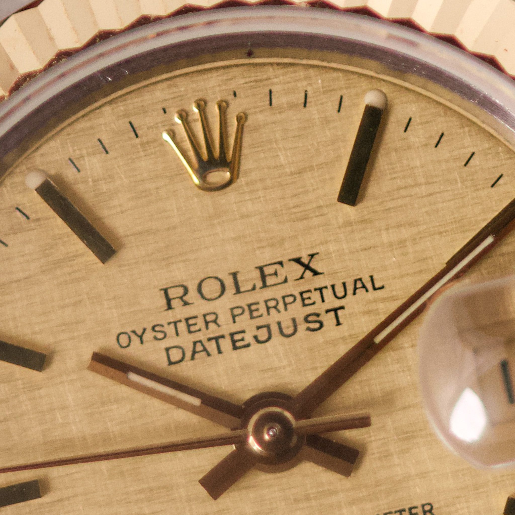 Originally sold in 1990, this example showcases a stunning Champagne Sand dial. The watch has been serviced in 2026 and is in very good condition, with a fully functional automatic movement ensuring precise timekeeping. The Jubilee bracelet, sized for wrists up to 16 cm, shows minimal stretch, preserving its structural integrity. Presented as a full set with its original Rolex box and papers, this Datejust is a distinguished choice for collectors or those seeking a well-maintained vintage timepiece.