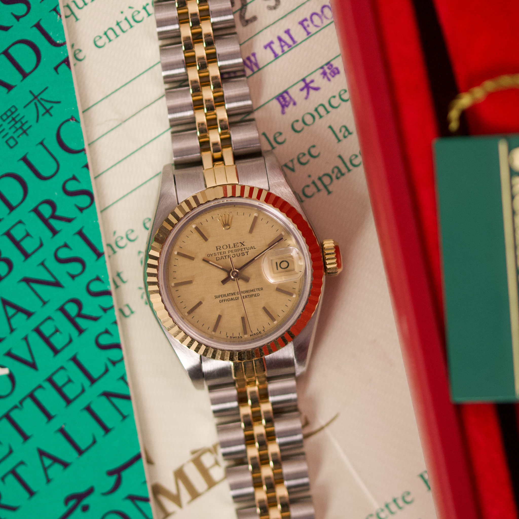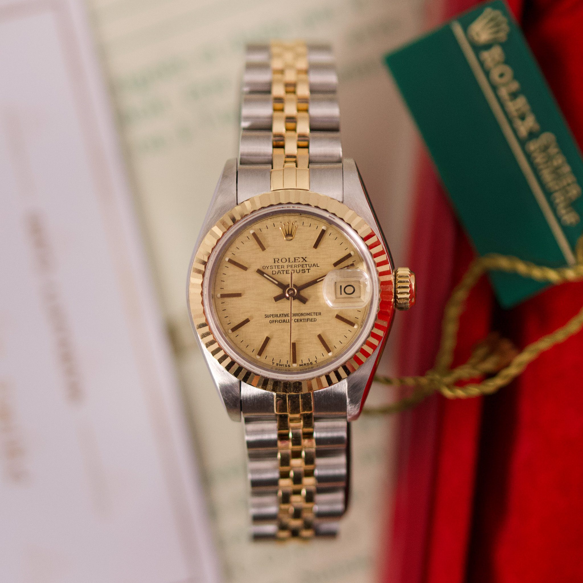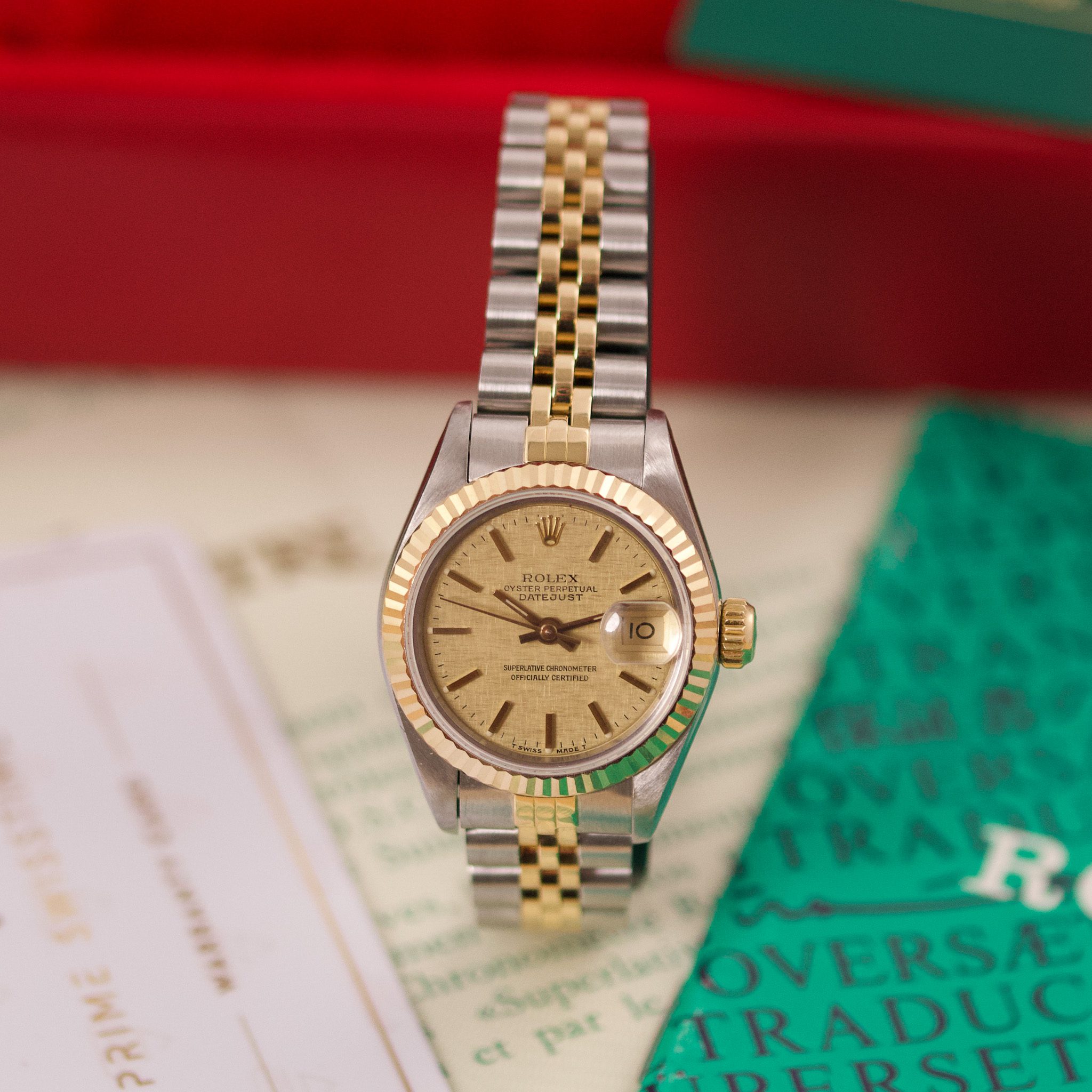 Originally sold in 1990, this example showcases a stunning Champagne Sand dial. The watch has been serviced in 2026 and is in very good condition, with a fully functional automatic movement ensuring precise timekeeping. The Jubilee bracelet, sized for wrists up to 16 cm, shows minimal stretch, preserving its structural integrity. Presented as a full set with its original Rolex box and papers, this Datejust is a distinguished choice for collectors or those seeking a well-maintained vintage timepiece.