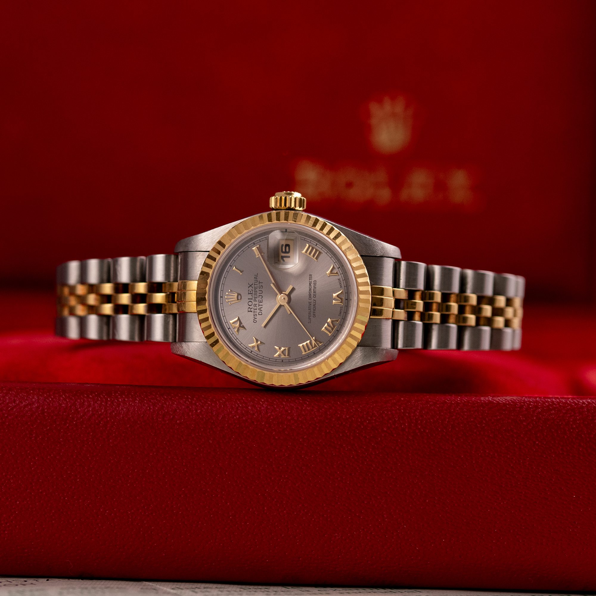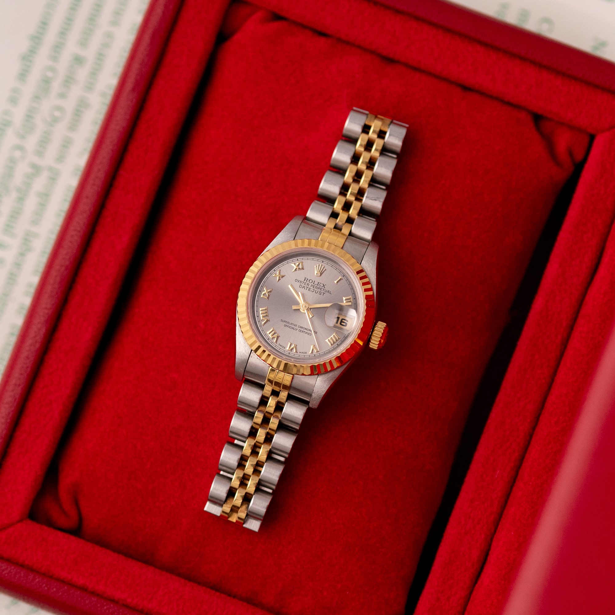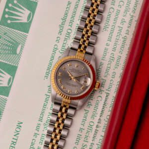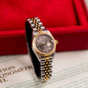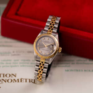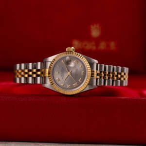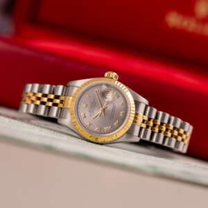 This example, originally sold in 1998, showcases a Grey Roman dial, offering a refined and unique aesthetic. The watch remains in good condition, with a fully functional automatic movement and a stretch-free Jubilee bracelet sized for wrists up to 16 cm. Accompanied by its original Rolex box and papers, this complete set represents a well-preserved vintage piece suitable for collectors or daily wear.