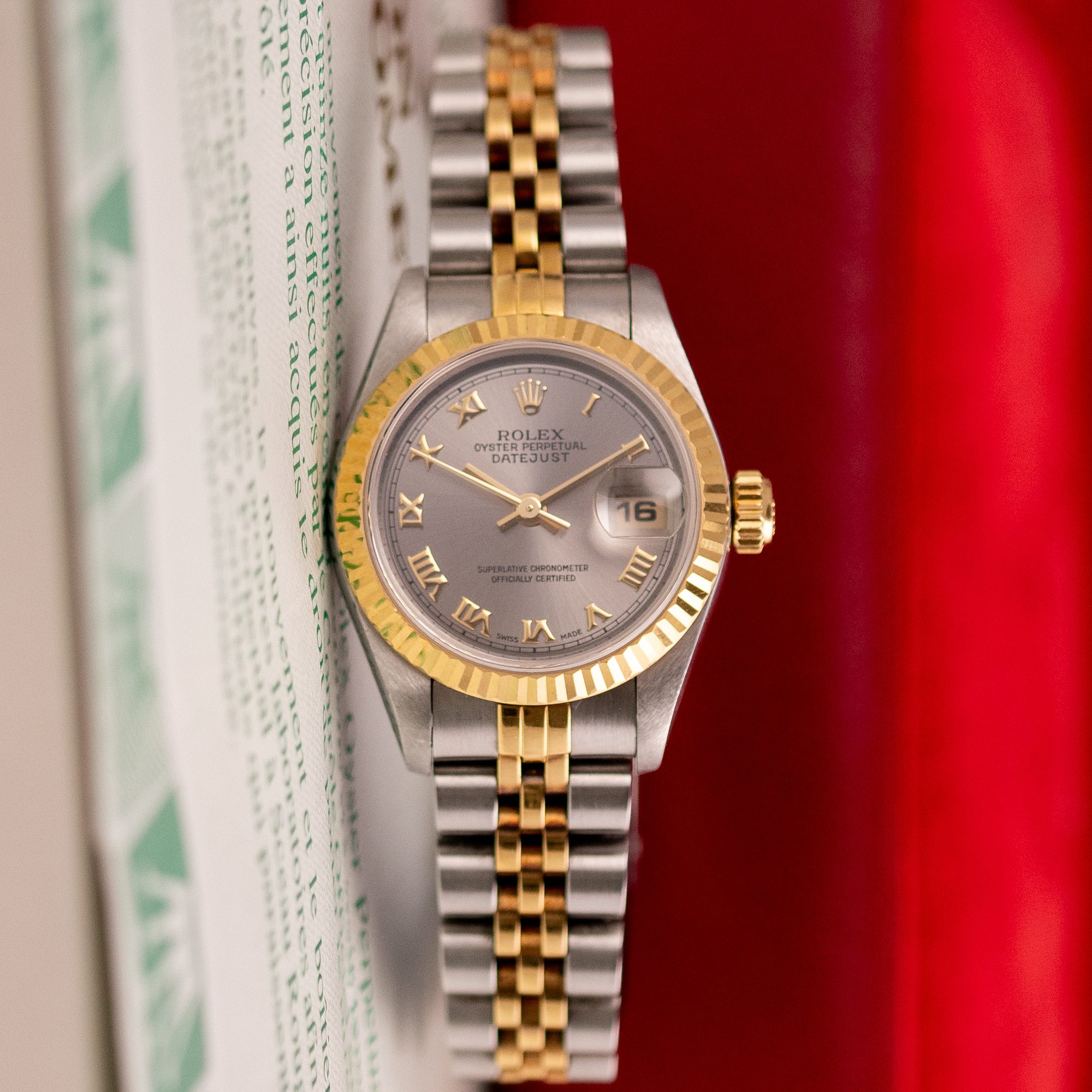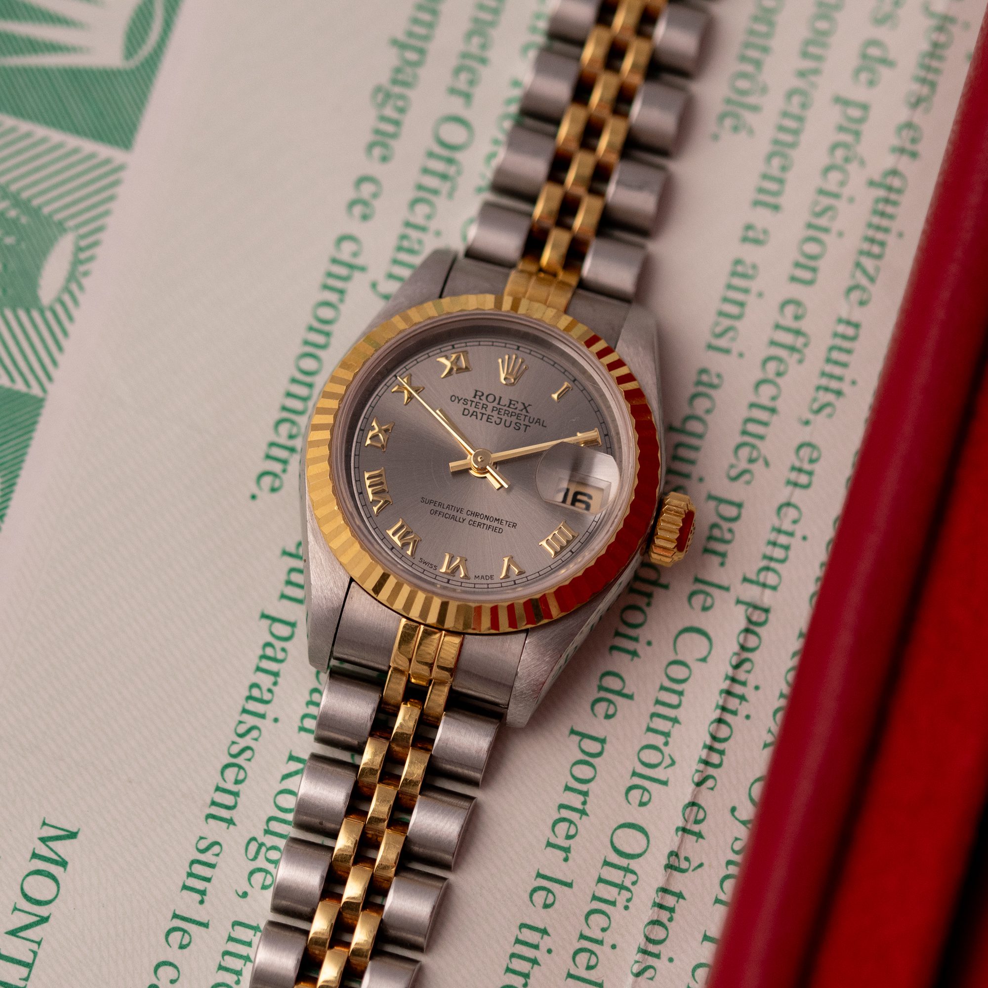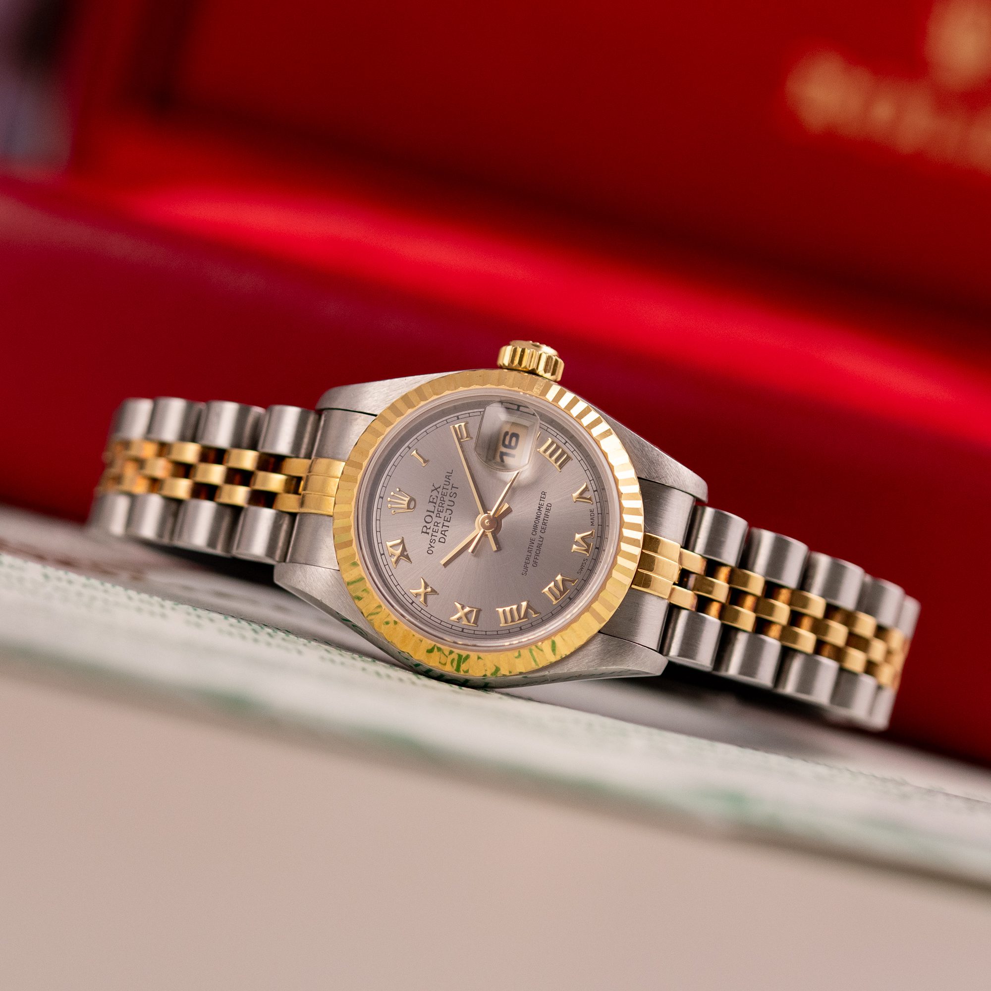 This example, originally sold in 1998, showcases a Grey Roman dial, offering a refined and unique aesthetic. The watch remains in good condition, with a fully functional automatic movement and a stretch-free Jubilee bracelet sized for wrists up to 16 cm. Accompanied by its original Rolex box and papers, this complete set represents a well-preserved vintage piece suitable for collectors or daily wear.
