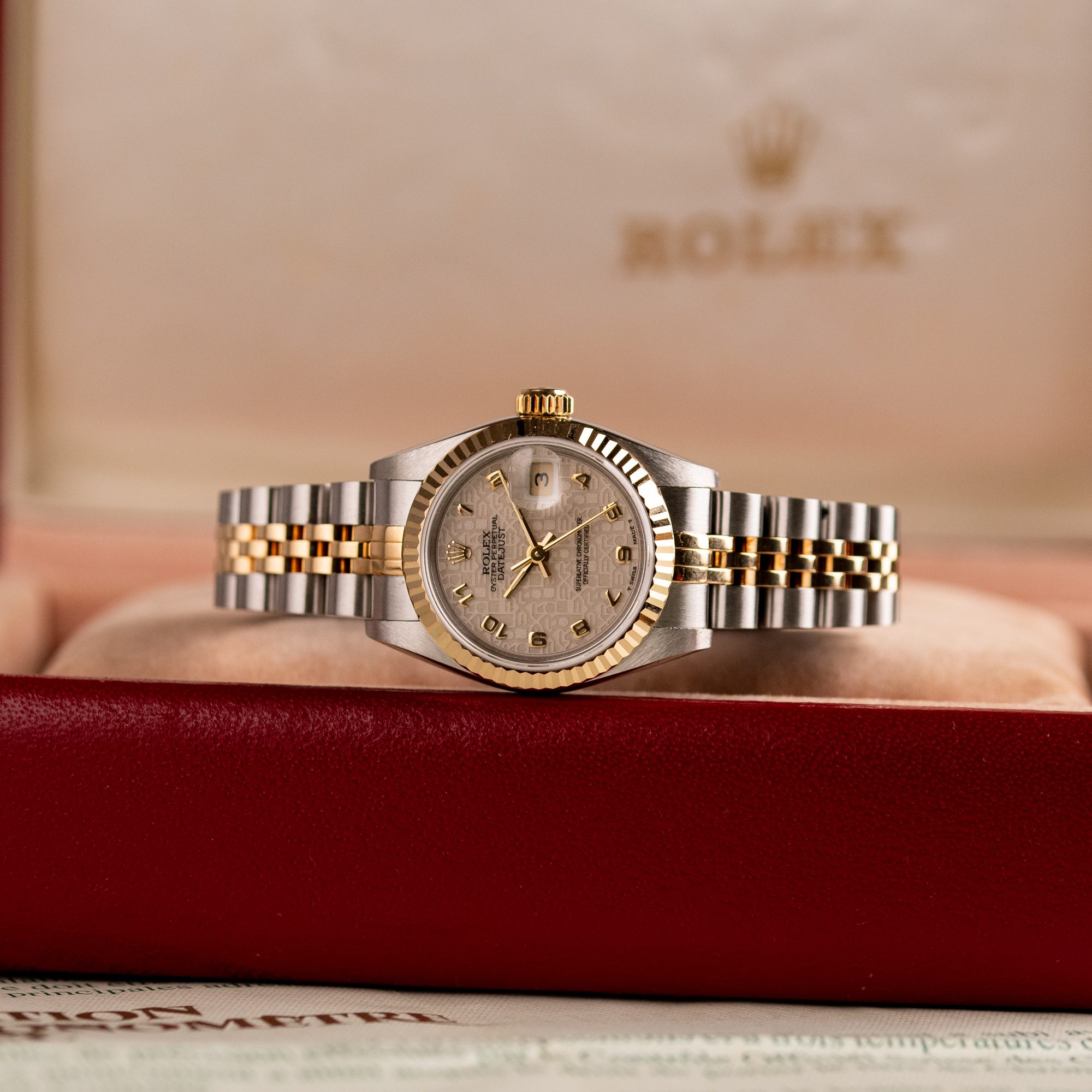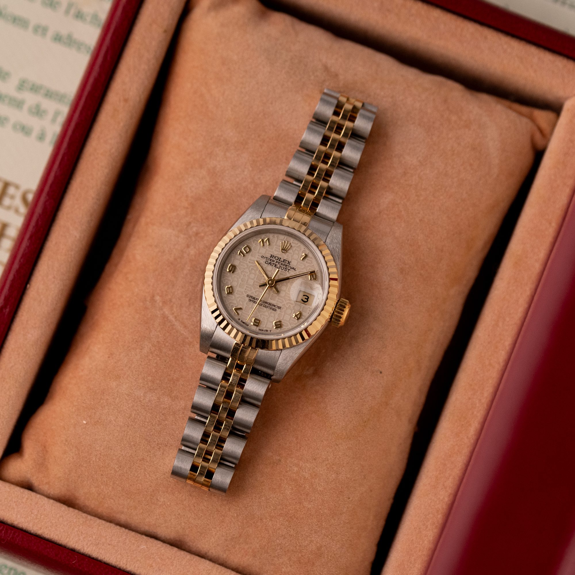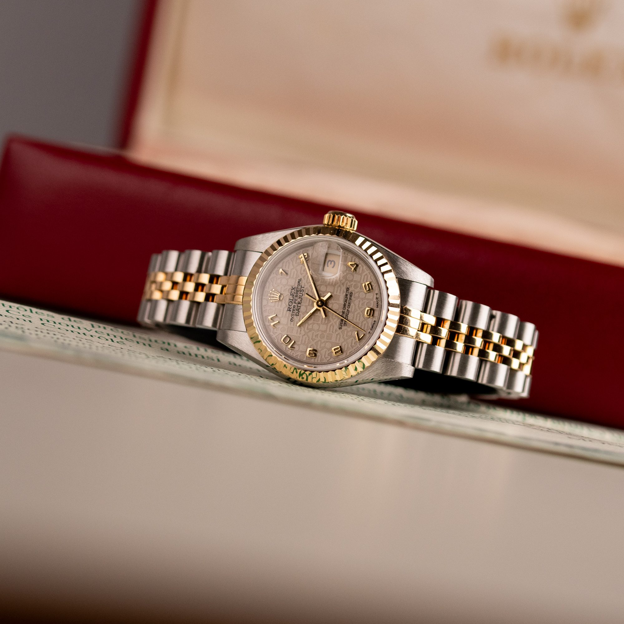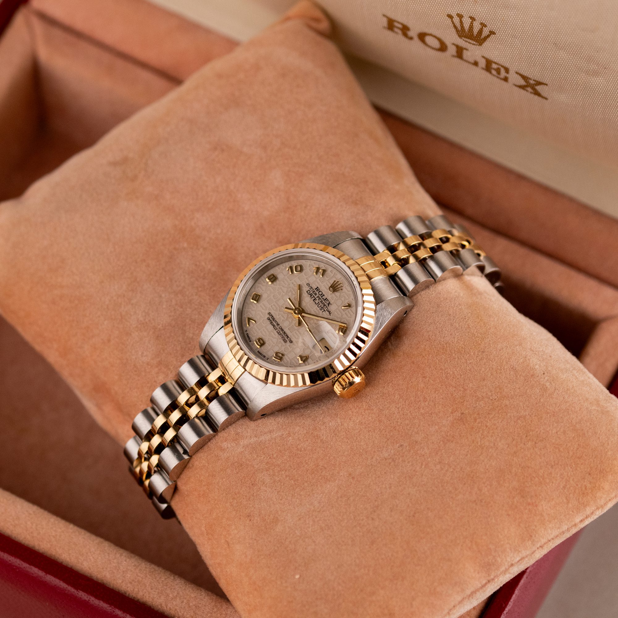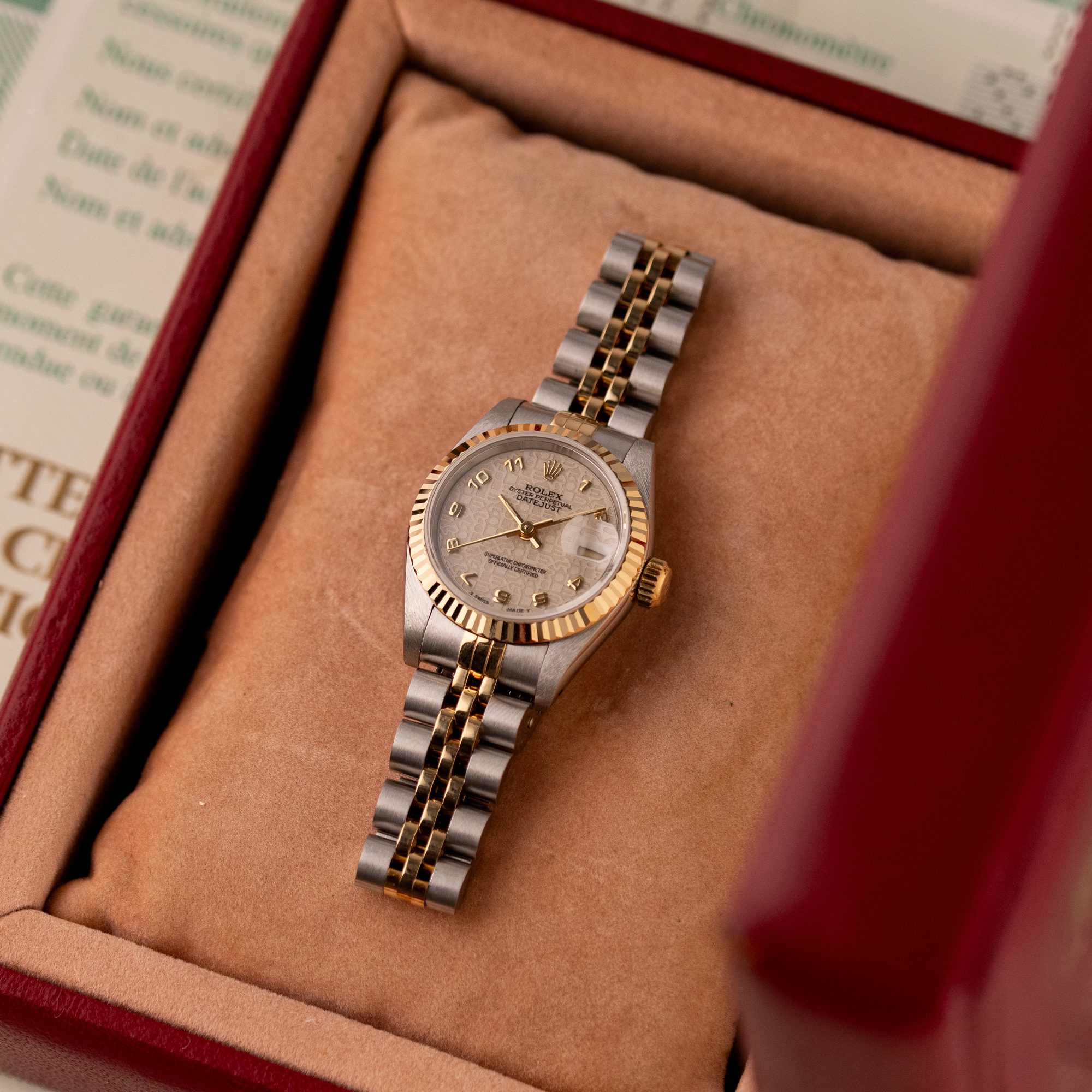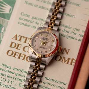 This example, originally sold in 1991, showcases a Ivory Jubilee dial with a distinctive textured pattern, offering a refined and unique aesthetic. The watch remains in very good condition, with a fully functional automatic movement and a stretch-free Jubilee bracelet sized for wrists up to 16 cm. Accompanied by its original Rolex box and papers, this complete set represents a well-preserved vintage piece suitable for collectors or daily wear.