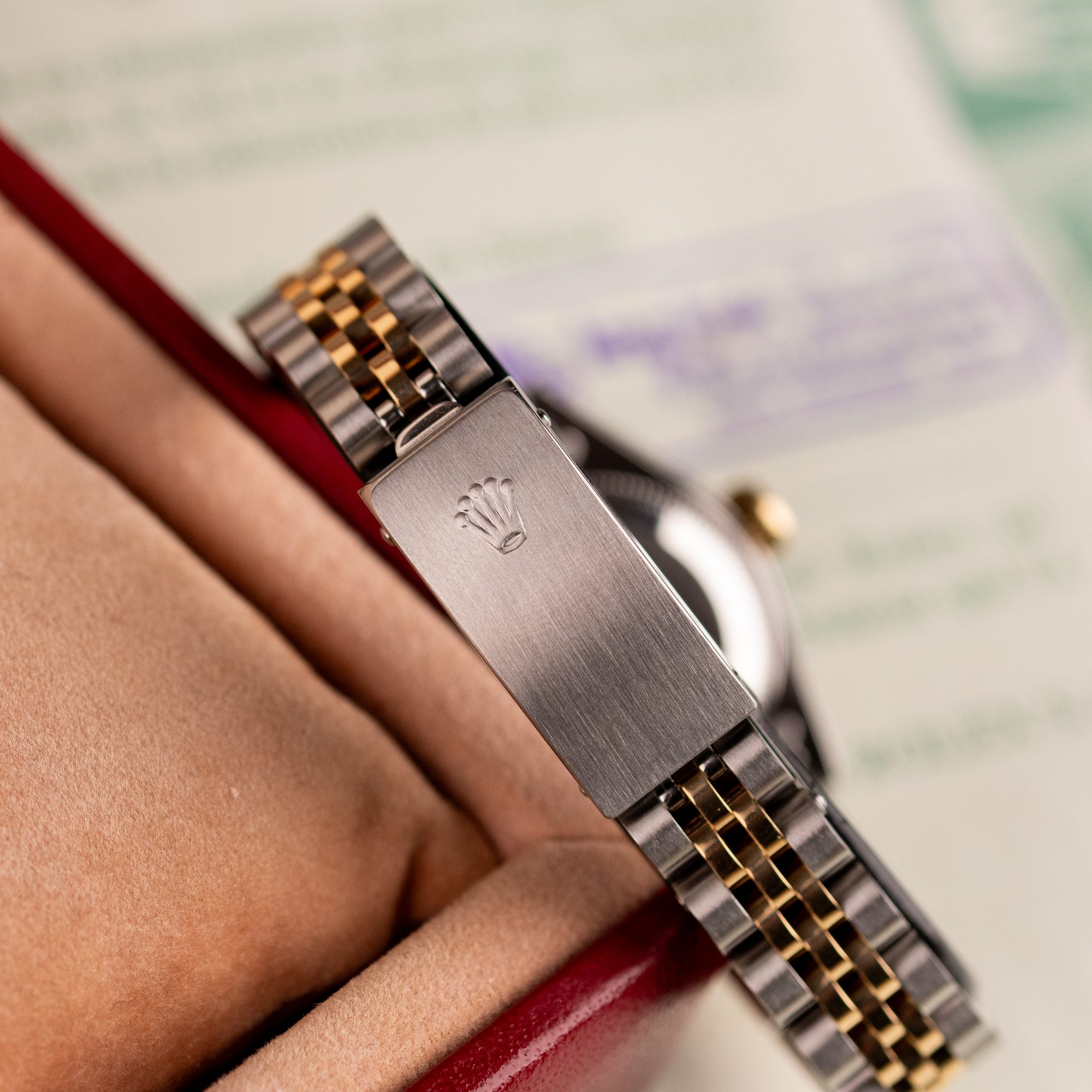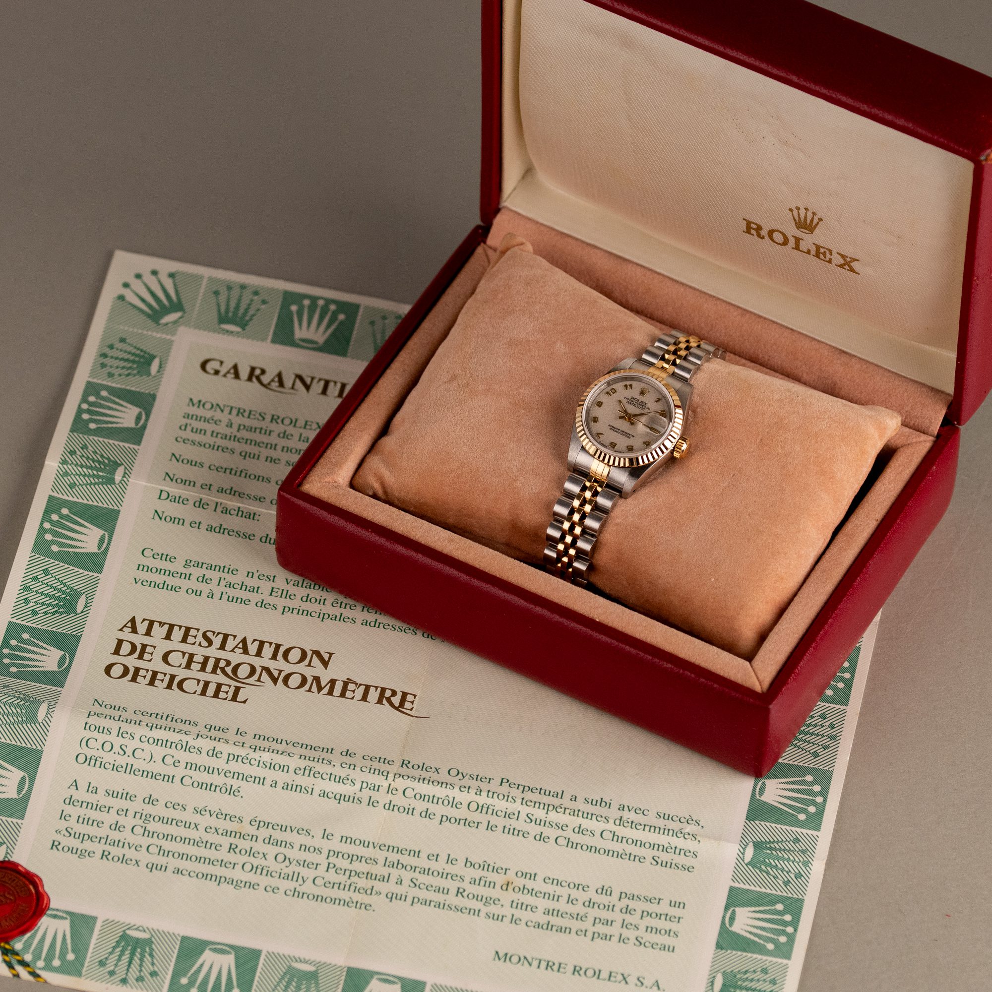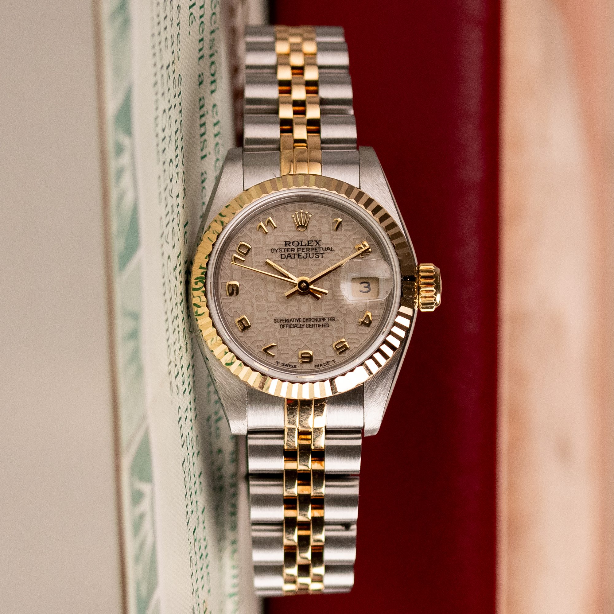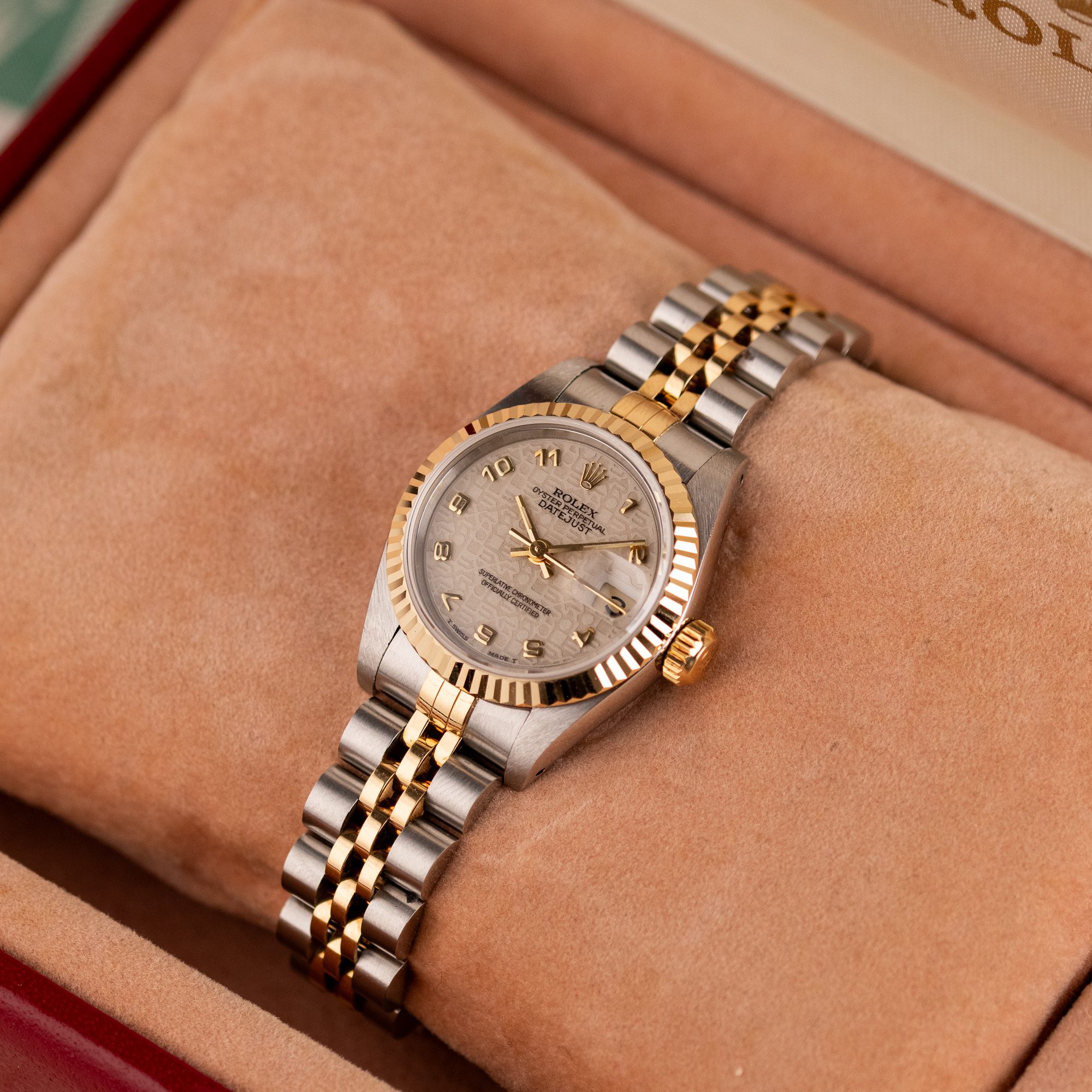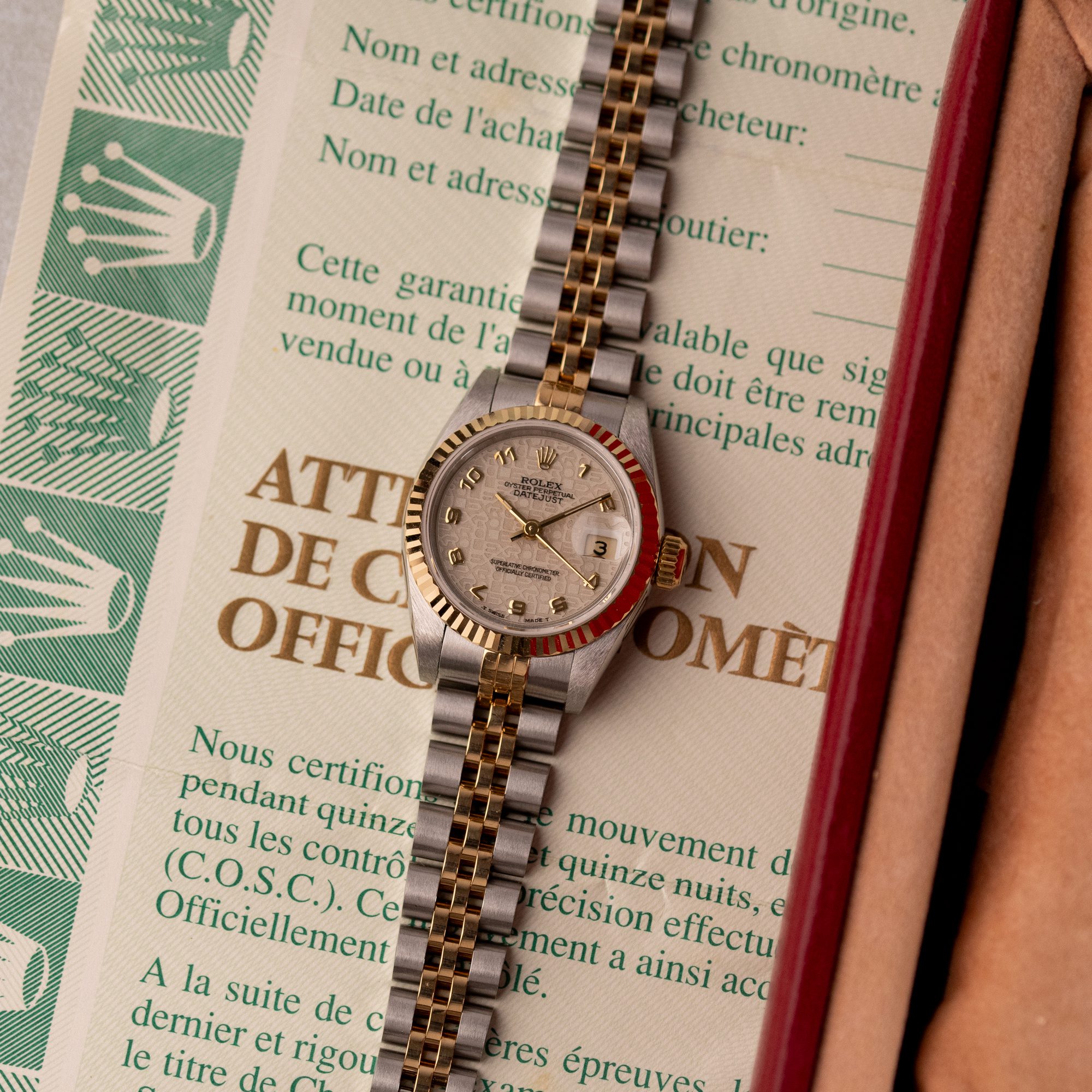 This example, originally sold in 1991, showcases a Ivory Jubilee dial with a distinctive textured pattern, offering a refined and unique aesthetic. The watch remains in very good condition, with a fully functional automatic movement and a stretch-free Jubilee bracelet sized for wrists up to 16 cm. Accompanied by its original Rolex box and papers, this complete set represents a well-preserved vintage piece suitable for collectors or daily wear.