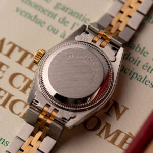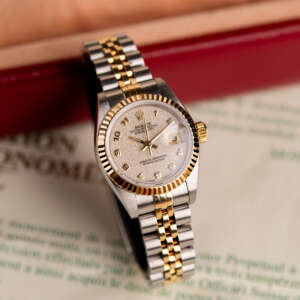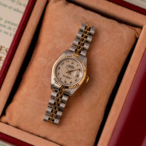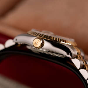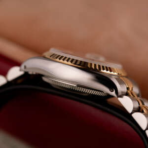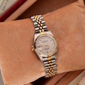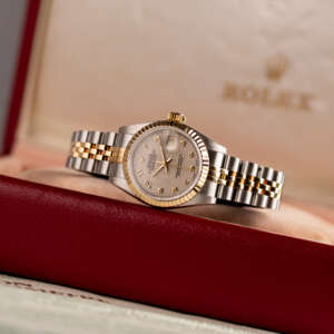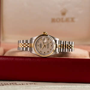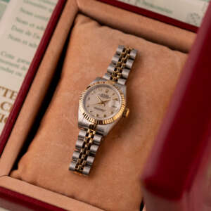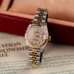 The Rolex Datejust 26, ref. 69173, combines stainless steel and yellow gold in a two-tone construction, featuring a fluted bezel and a compact 26mm case that balances classic proportions with versatile wearability for any occasion.